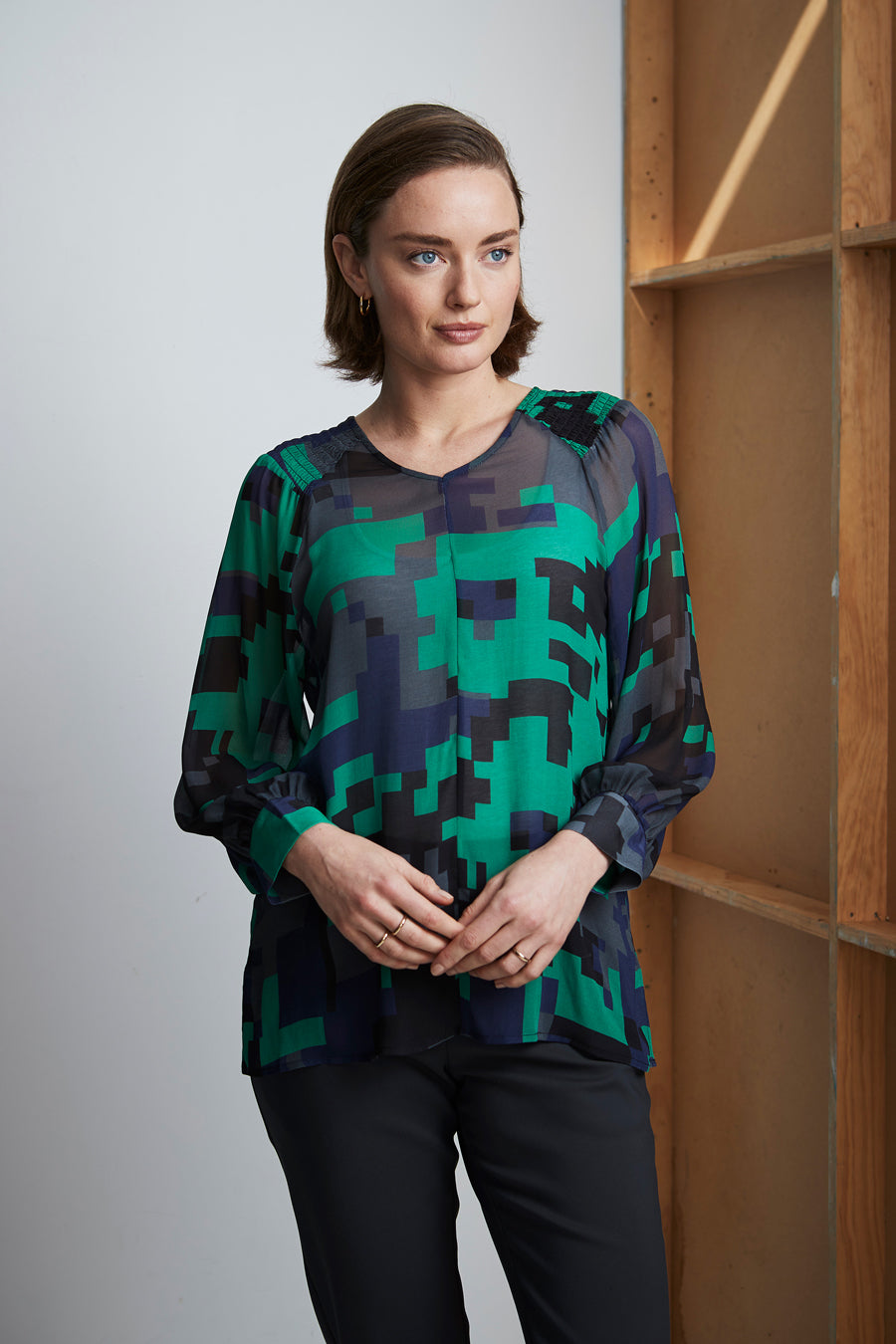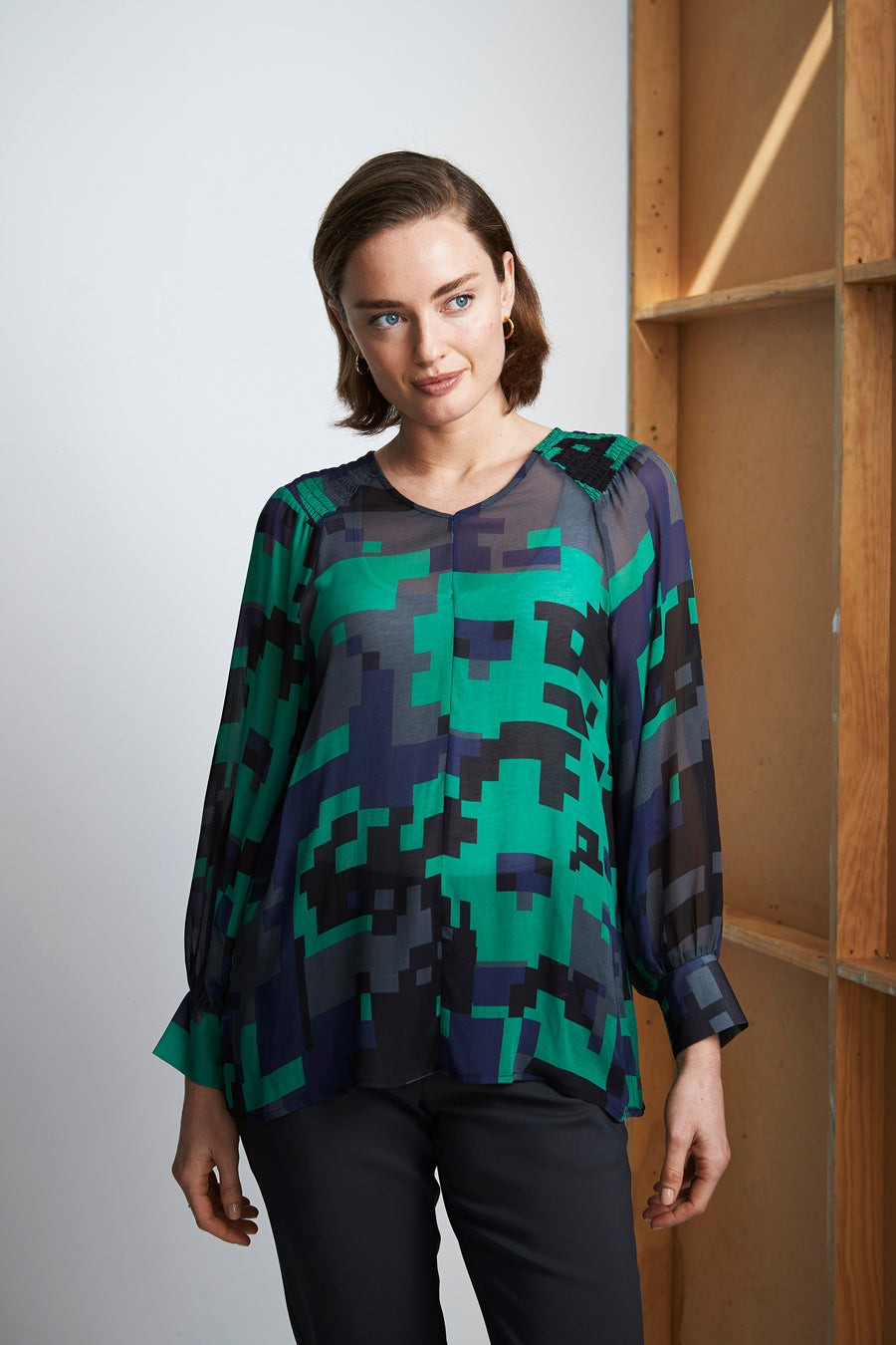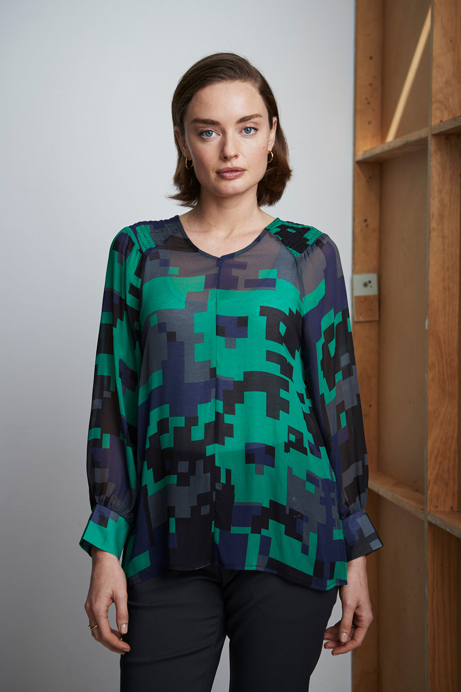 Data sheer top; designed to be a relaxed floaty fit, with long sleeves. Featuring elasticated gather detailing at shoulder and soft gathered sleeves with a wide cuff.