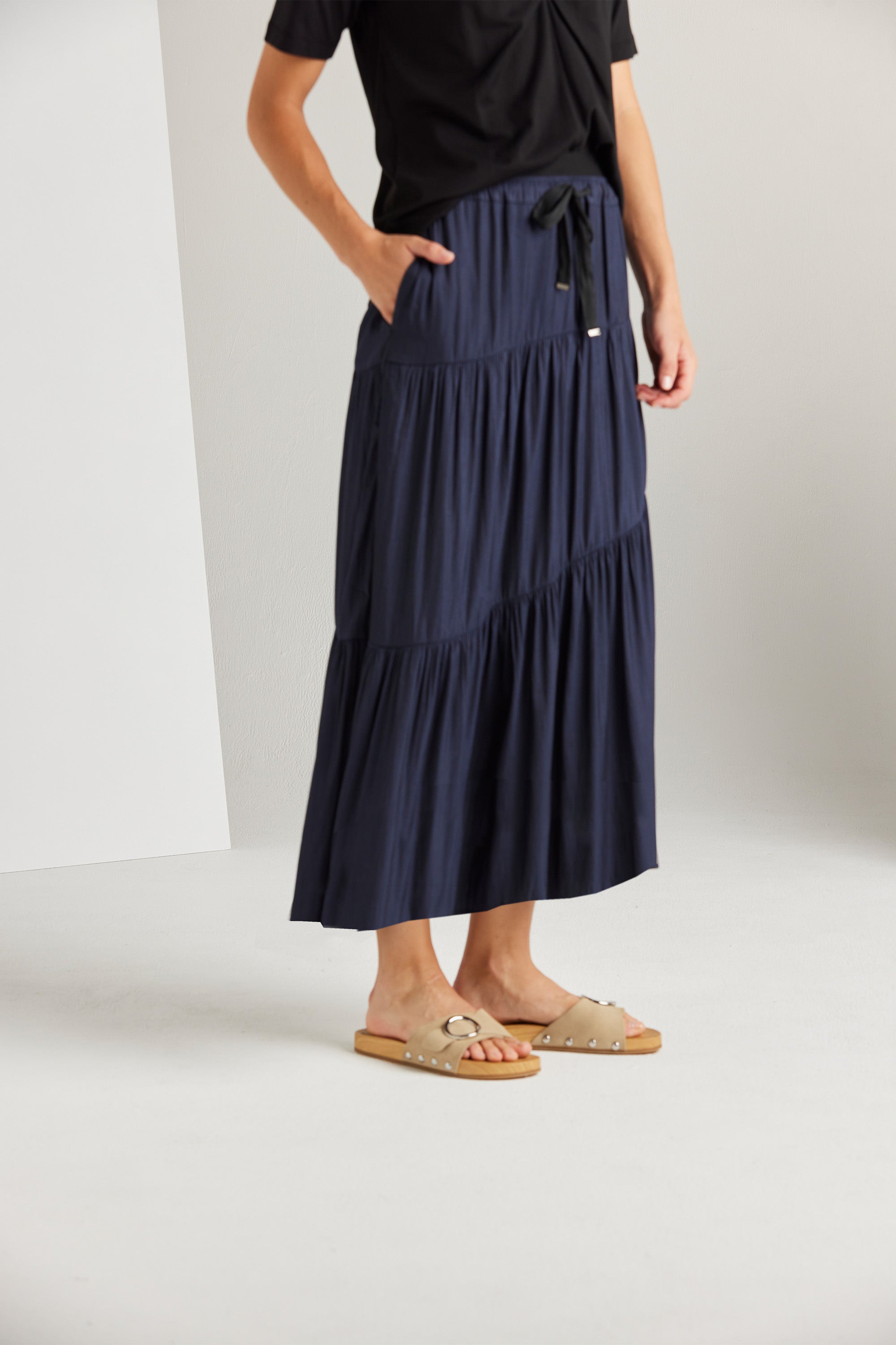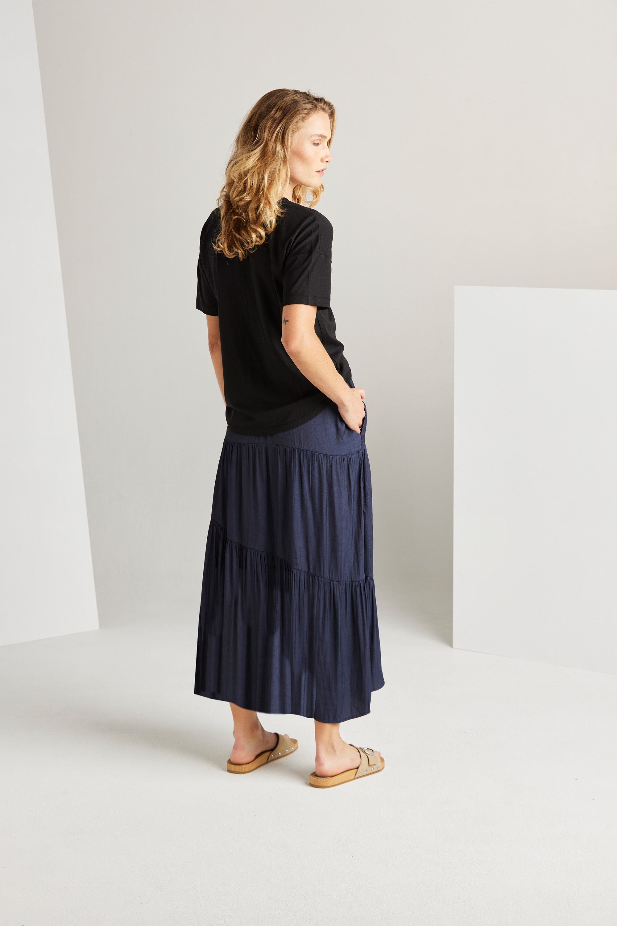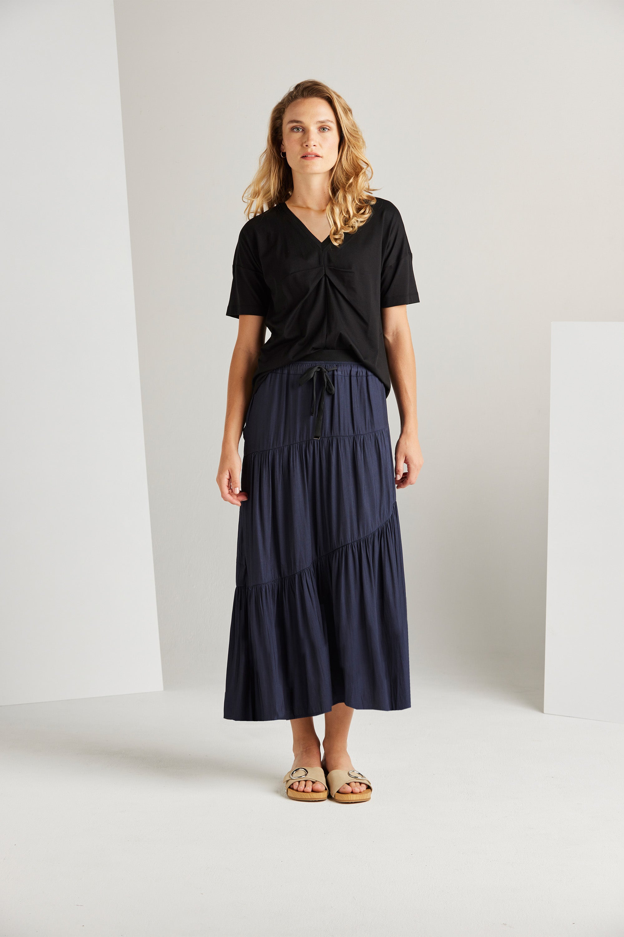 A tiered skirt with soft gathers through panel seams and an elasticated waist. This versatile wardrobe staple can be worn with heels or sneakers to suit your occasion.