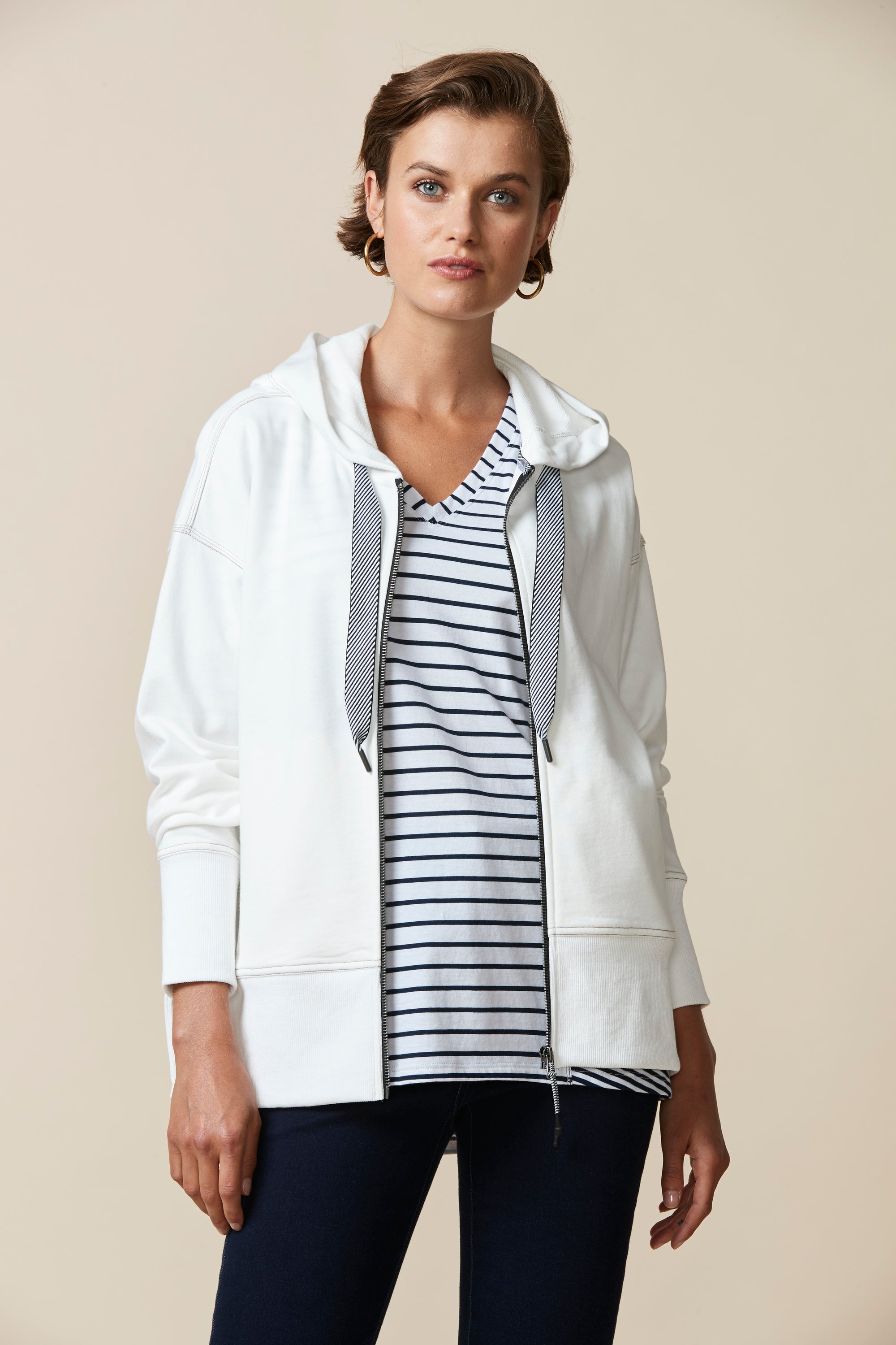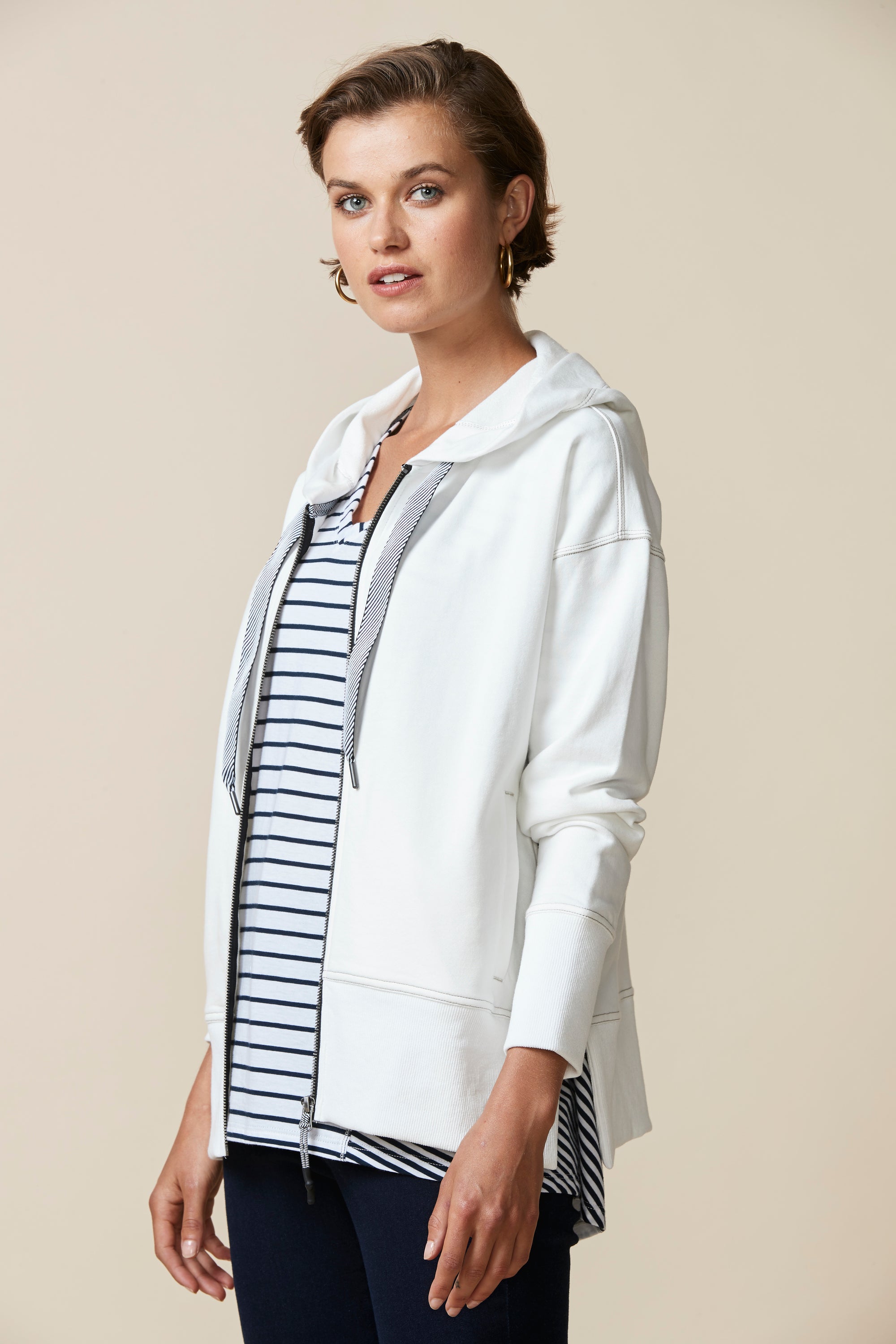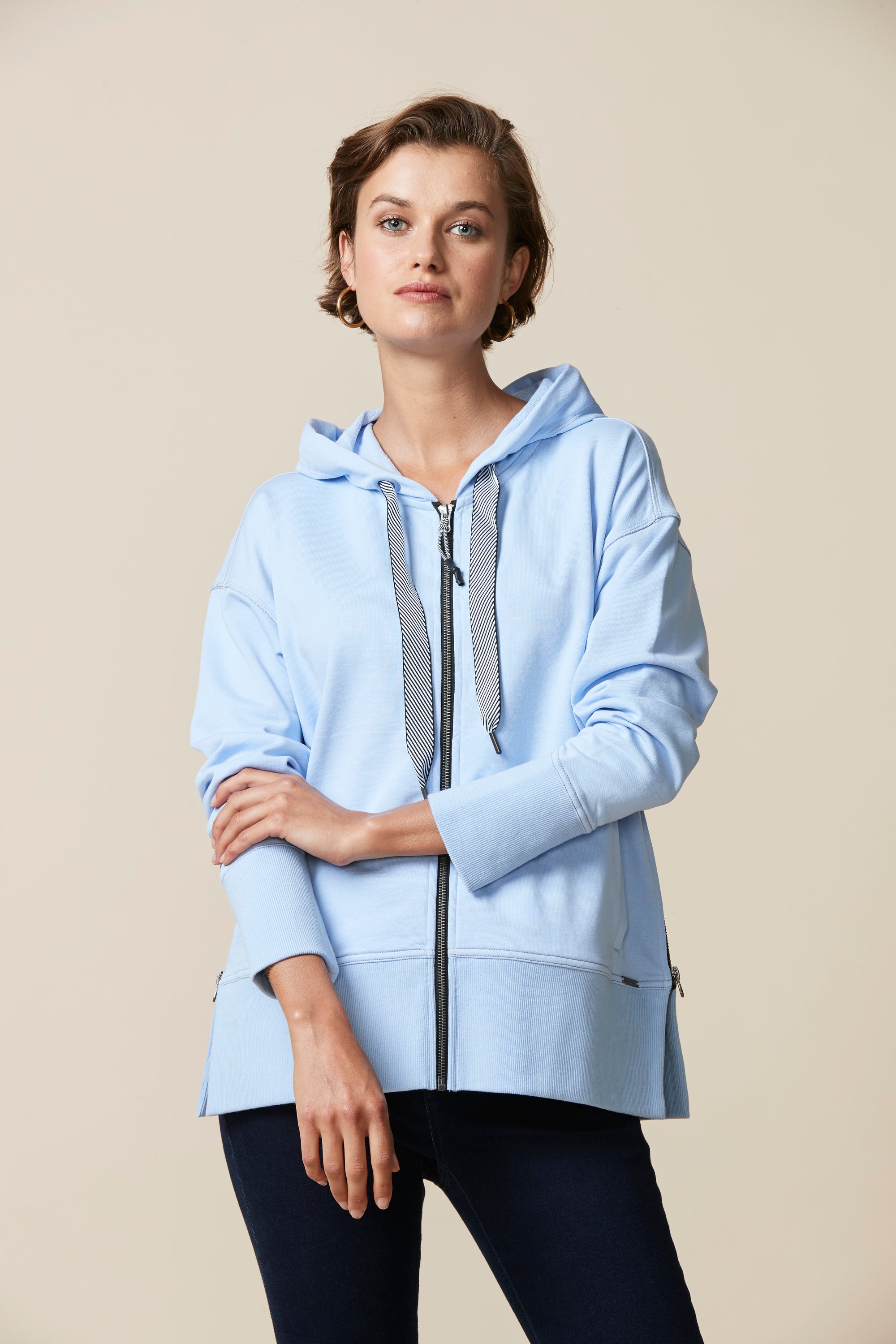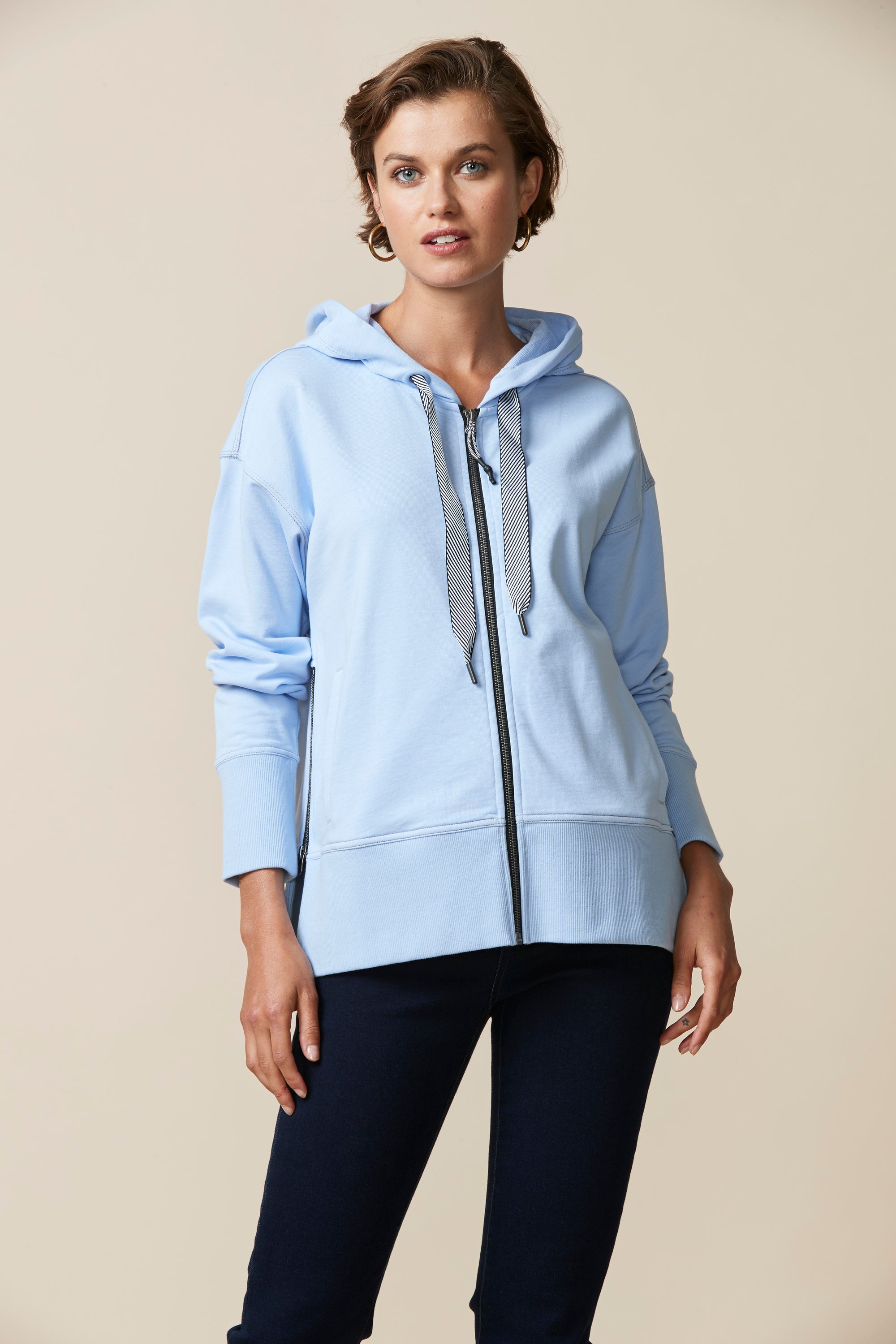 A smart & sporty long sleeve cotton jersey jacket with zip front, hood, and stripe tape drawcord detail. Featuring a deep rib cuff and hem band, welt pockets and zips at side body for added versatility.