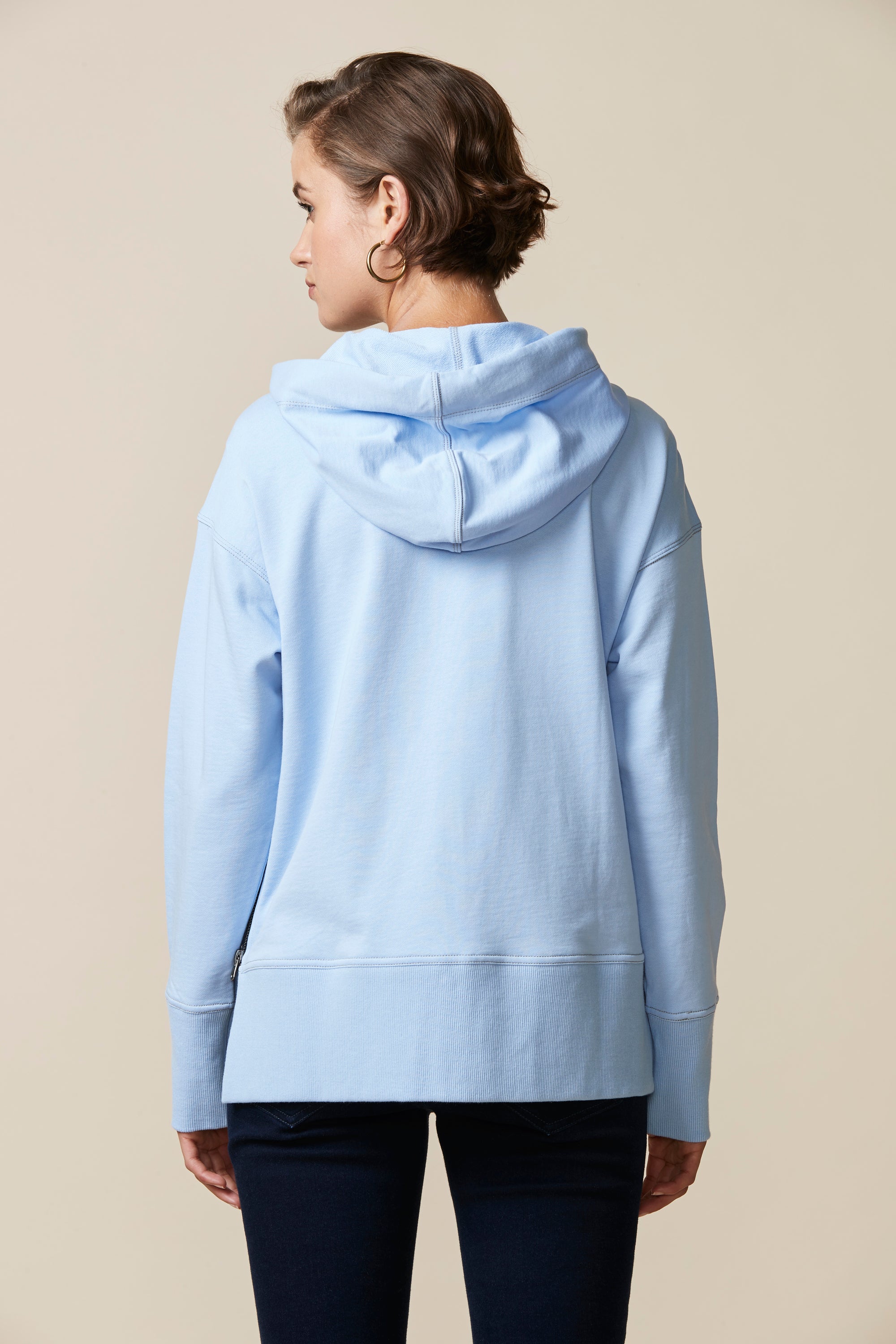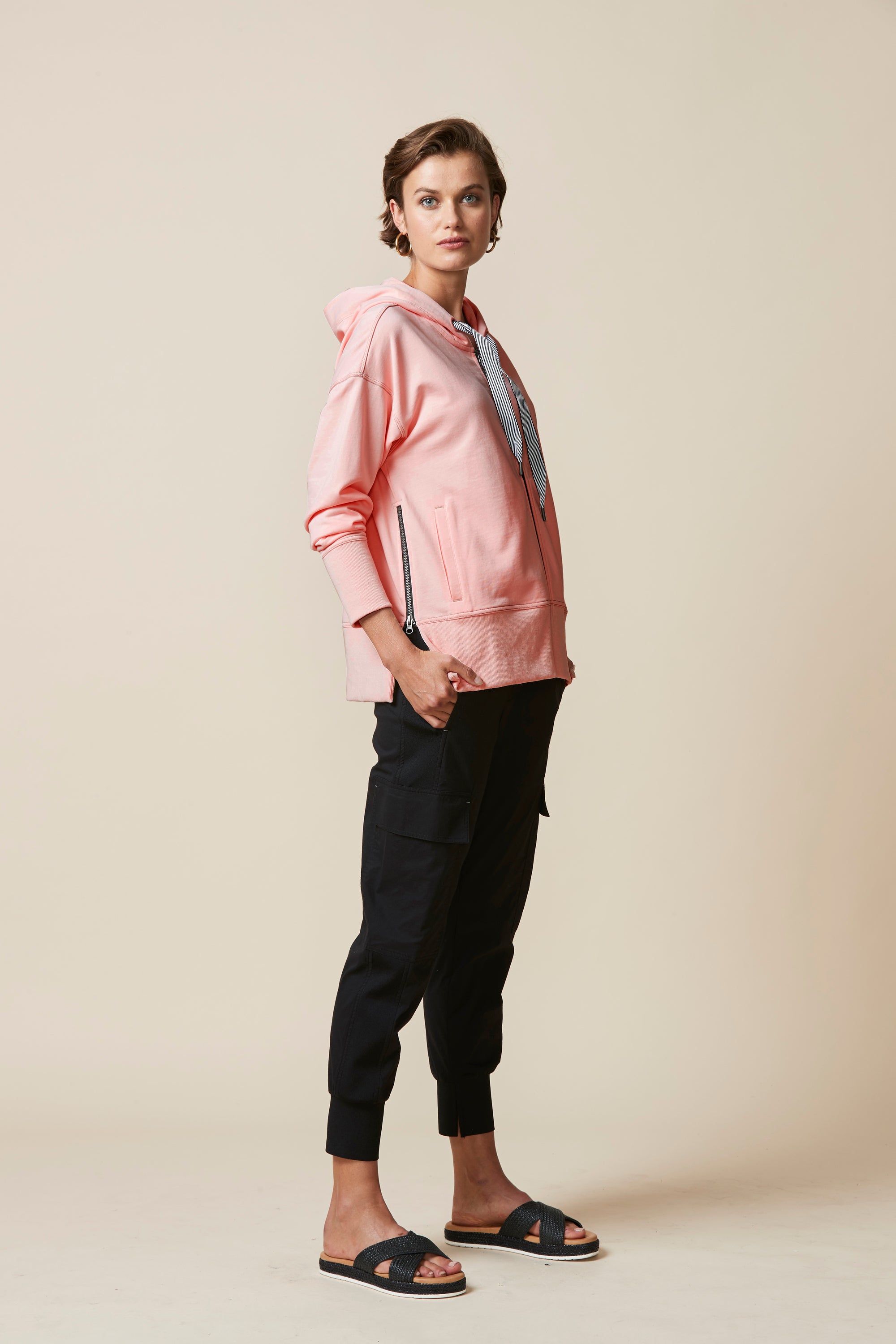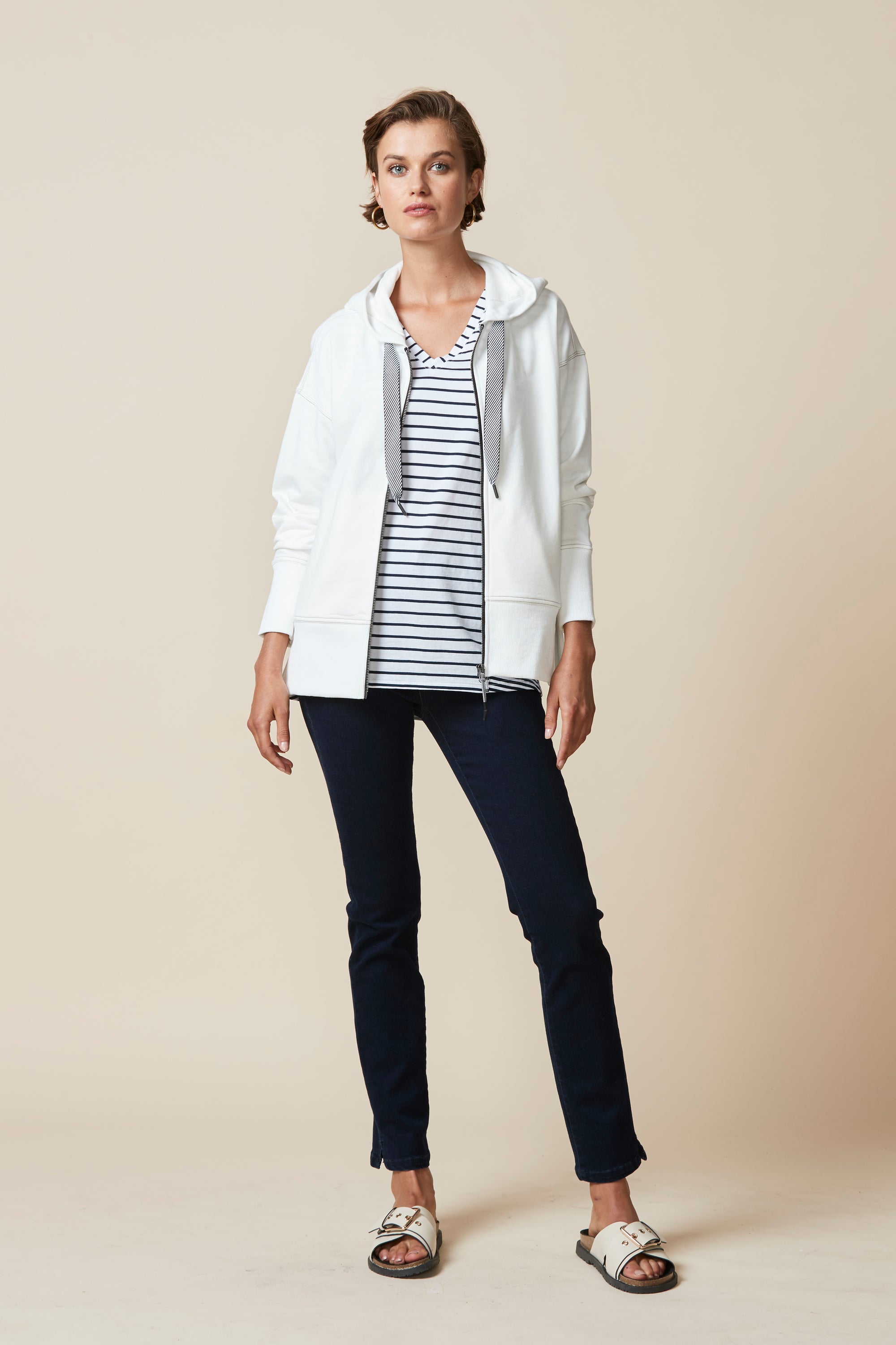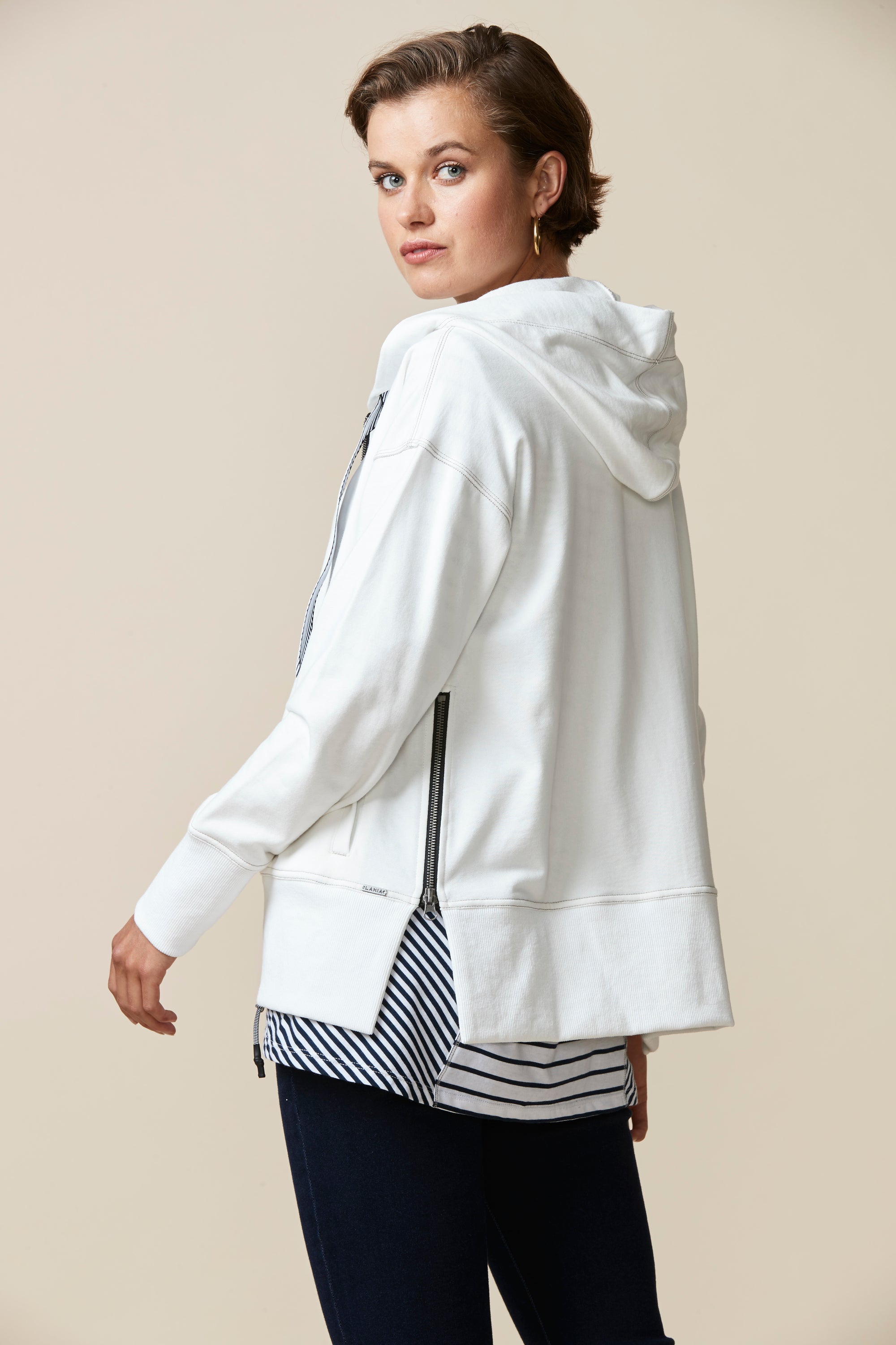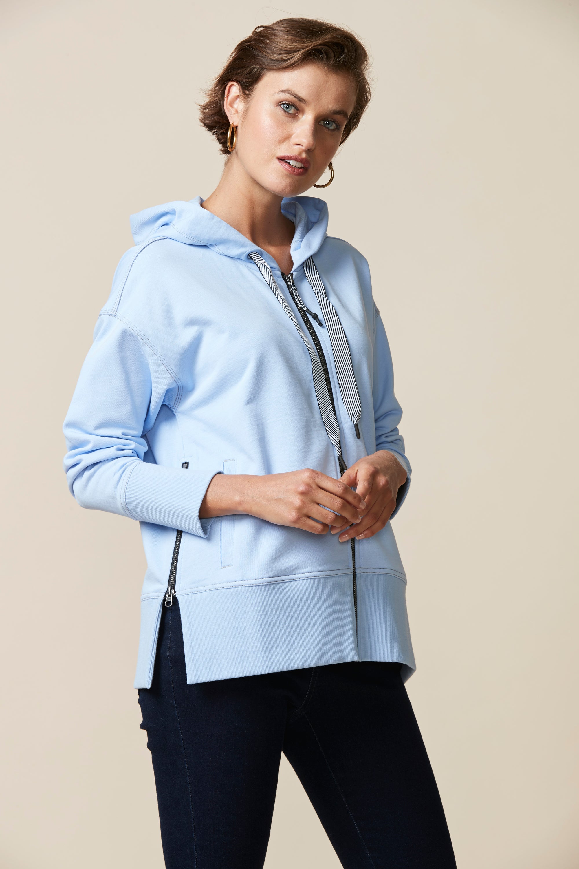A smart & sporty long sleeve cotton jersey jacket with zip front, hood, and stripe tape drawcord detail. Featuring a deep rib cuff and hem band, welt pockets and zips at side body for added versatility.