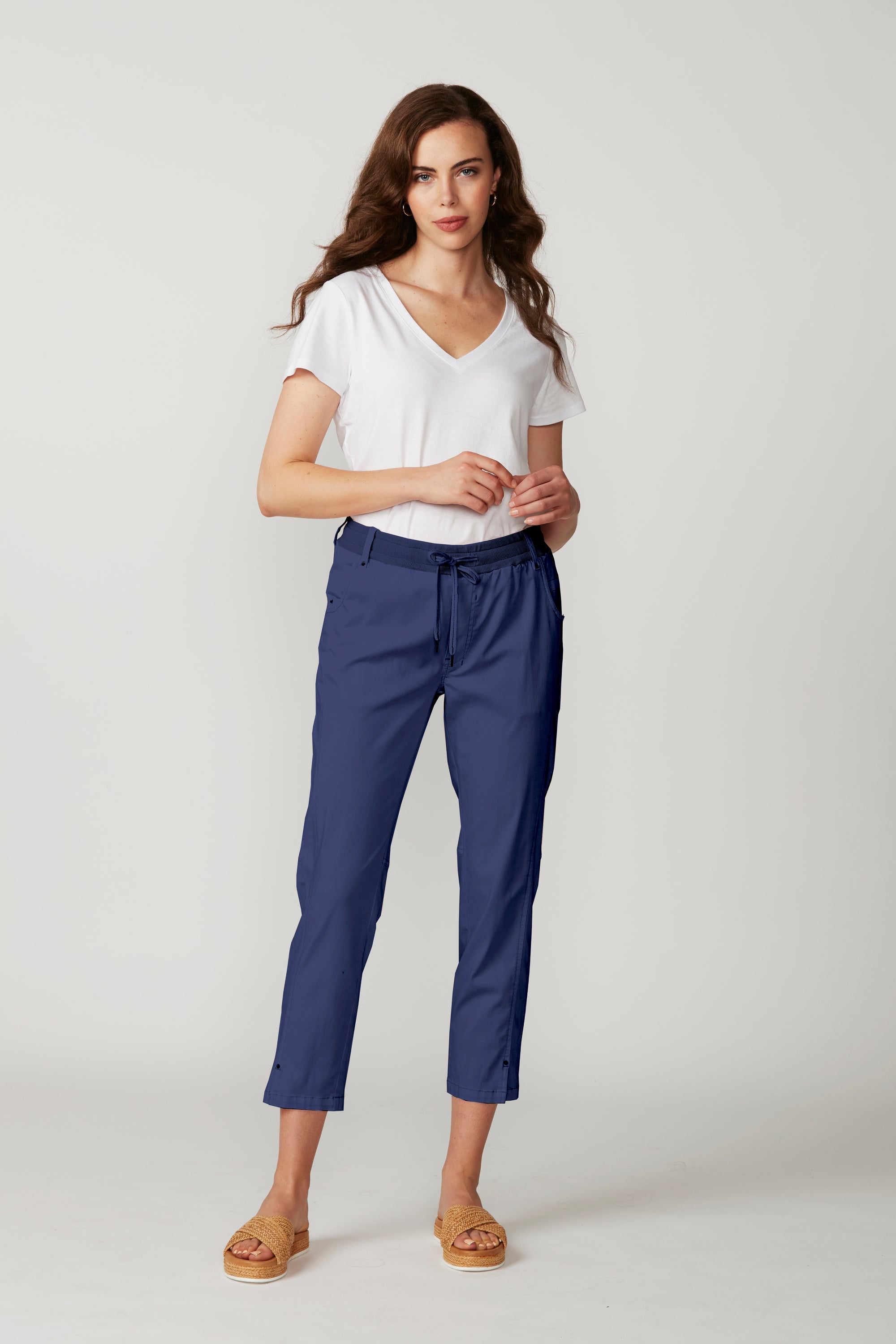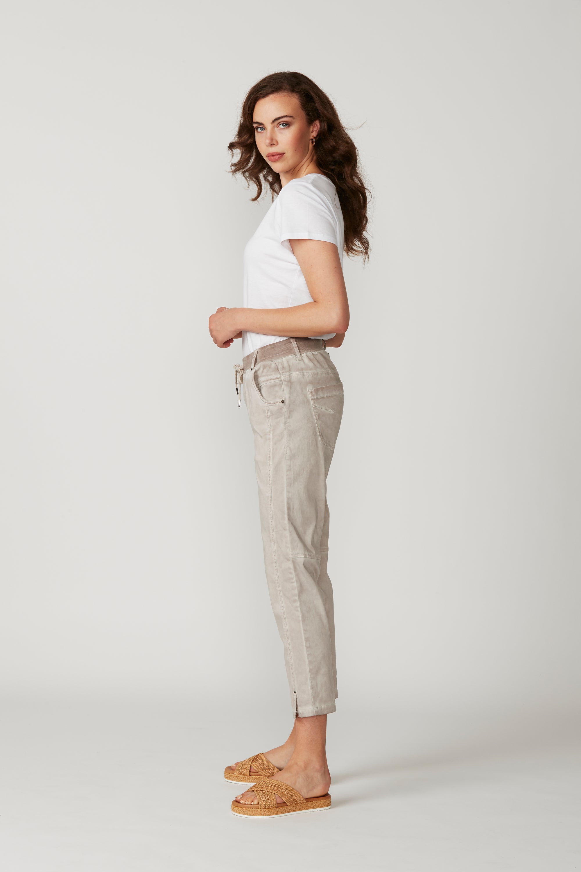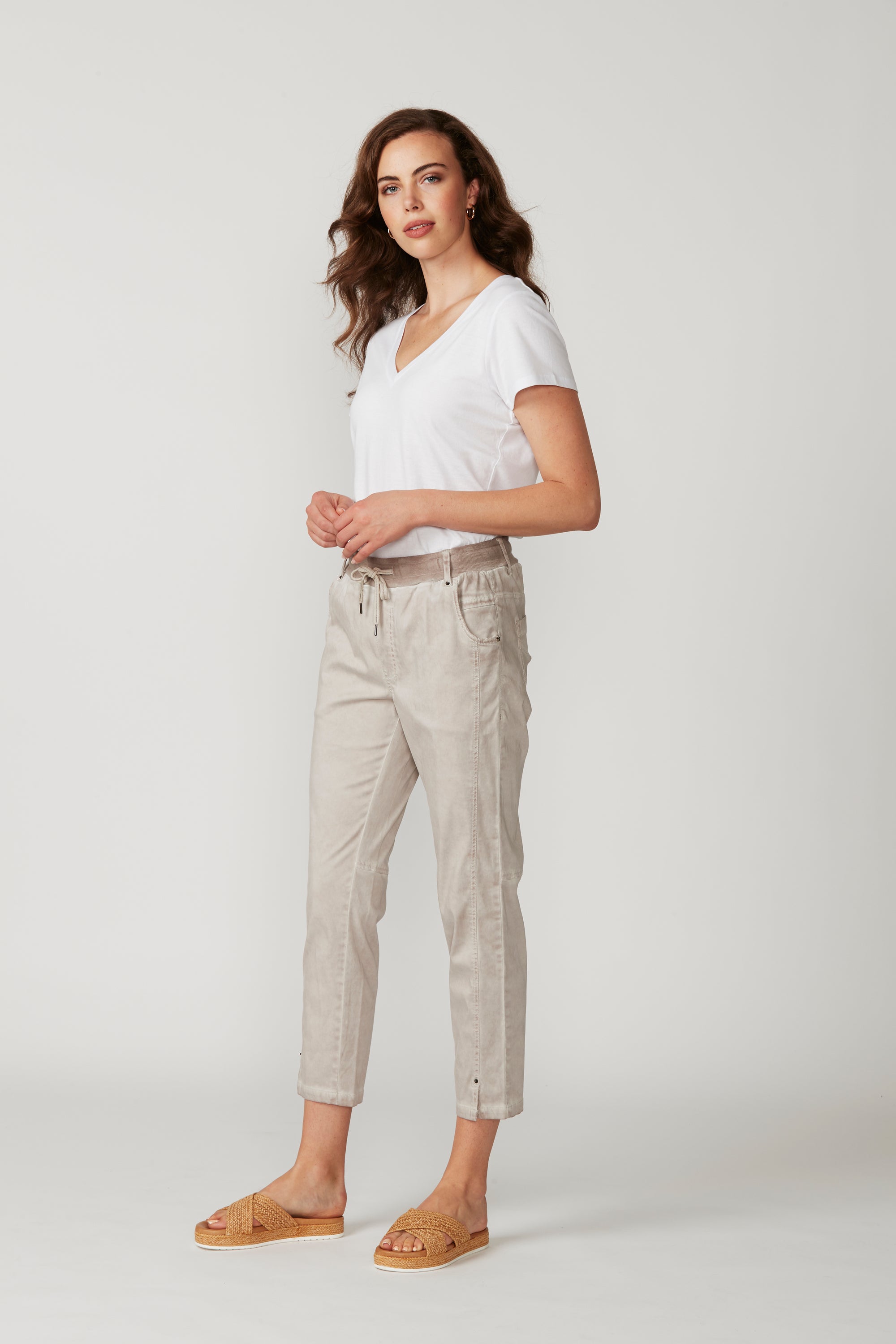 A cool casual 7/8 pant, rib waistband with drawcord, mock fly and front pockets. The soft handle and slightly distressed finish is achieved by special garment wash.