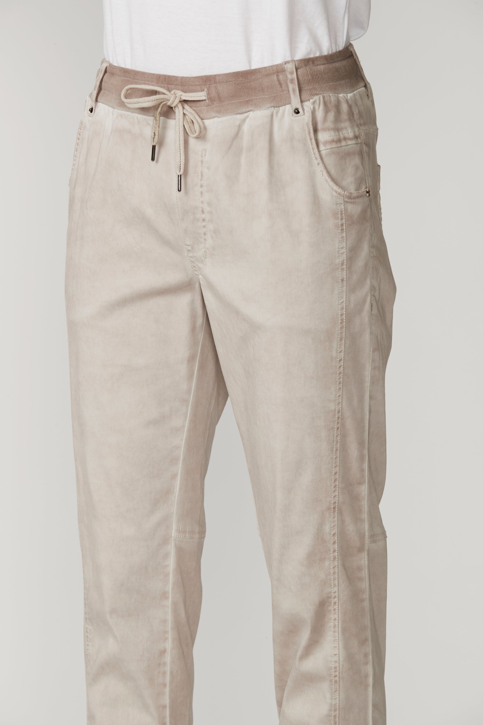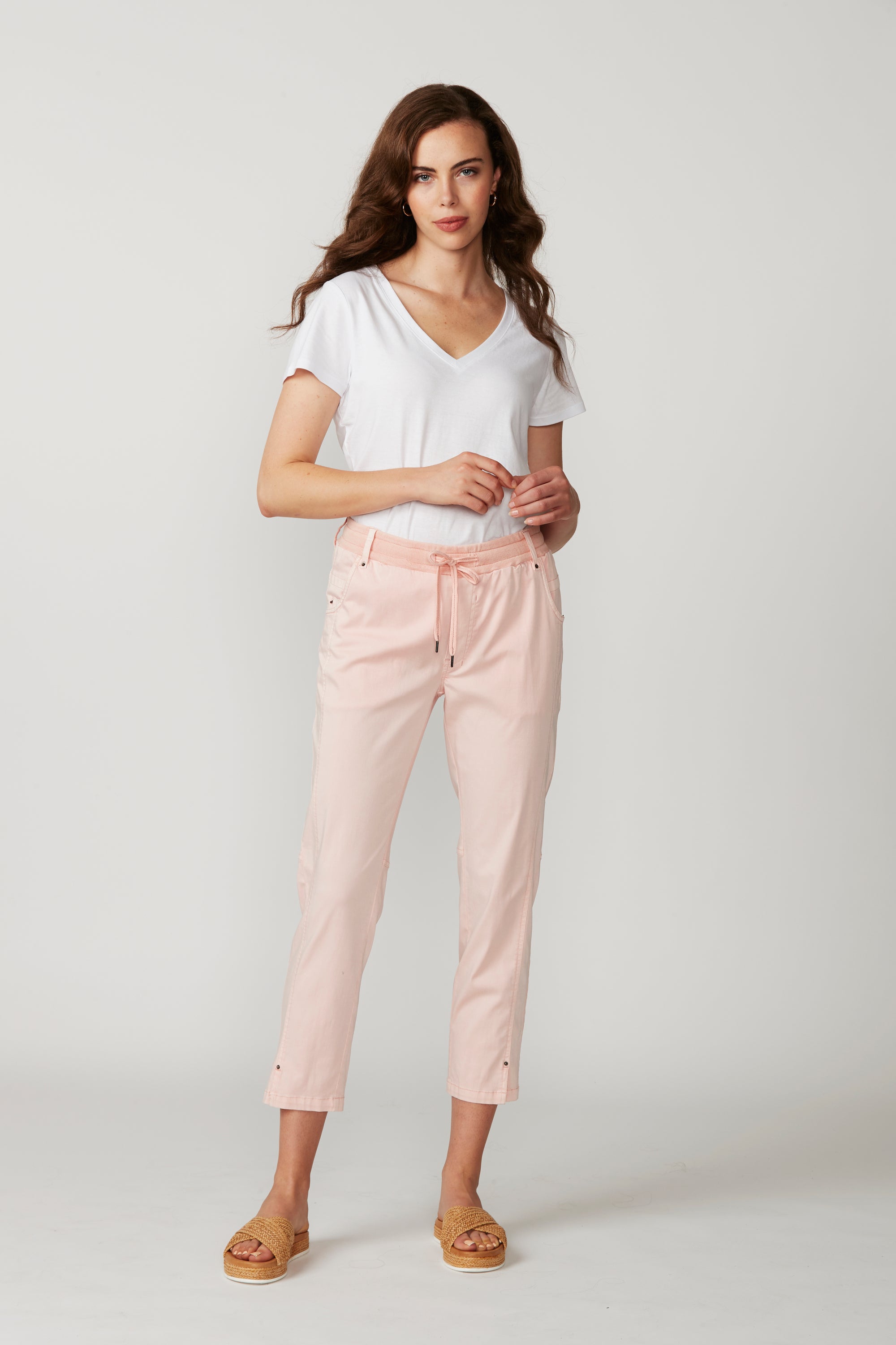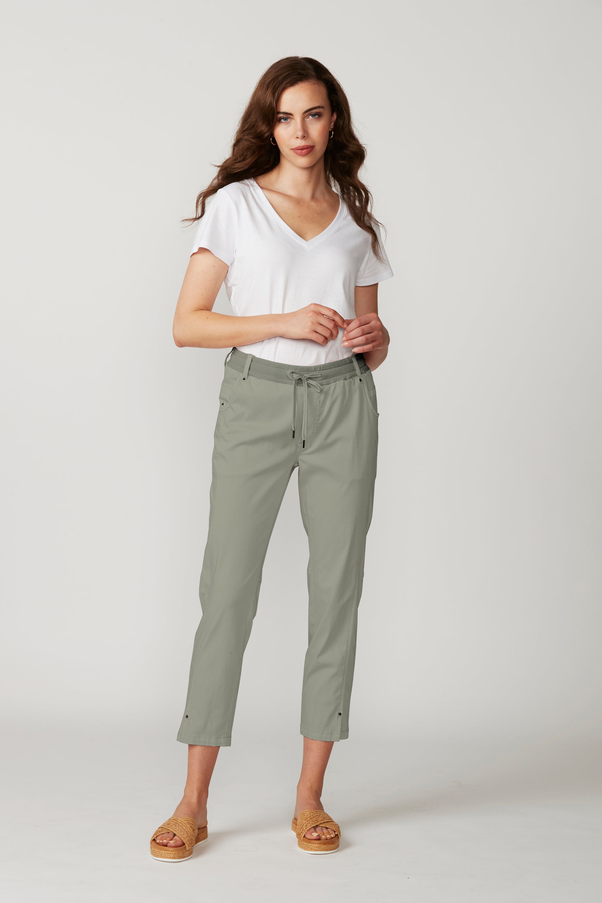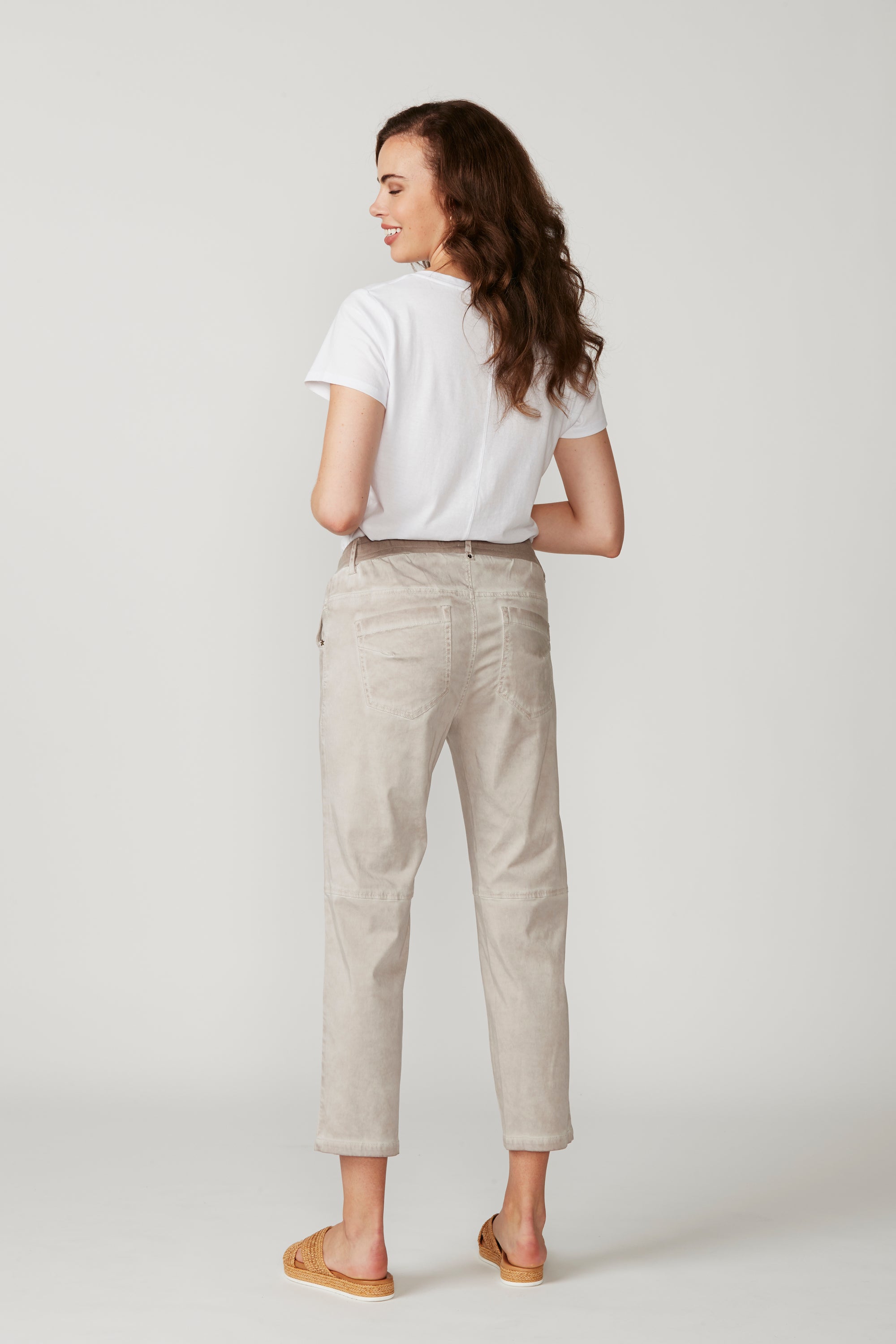 A cool casual 7/8 pant, rib waistband with drawcord, mock fly and front pockets. The soft handle and slightly distressed finish is achieved by special garment wash.