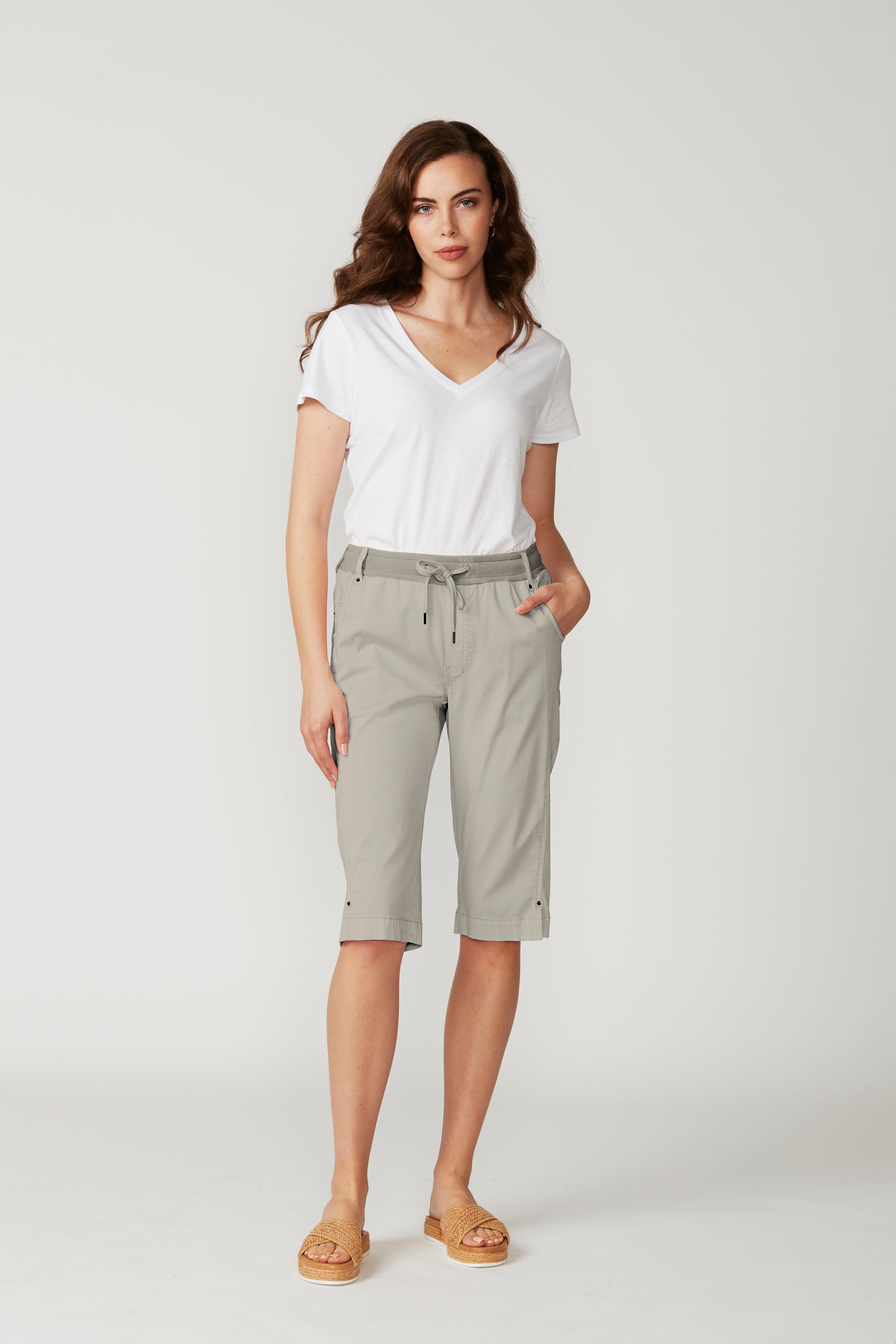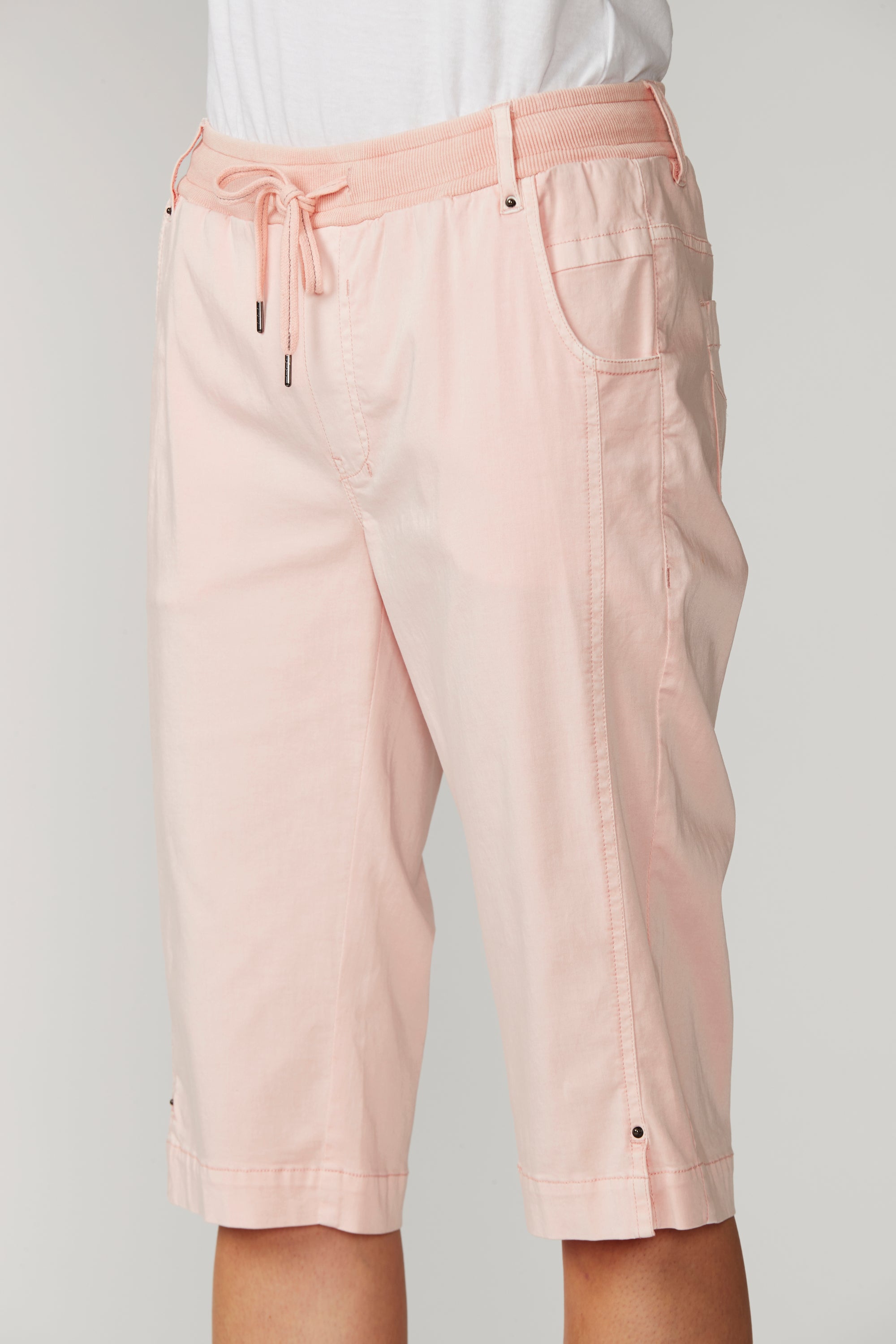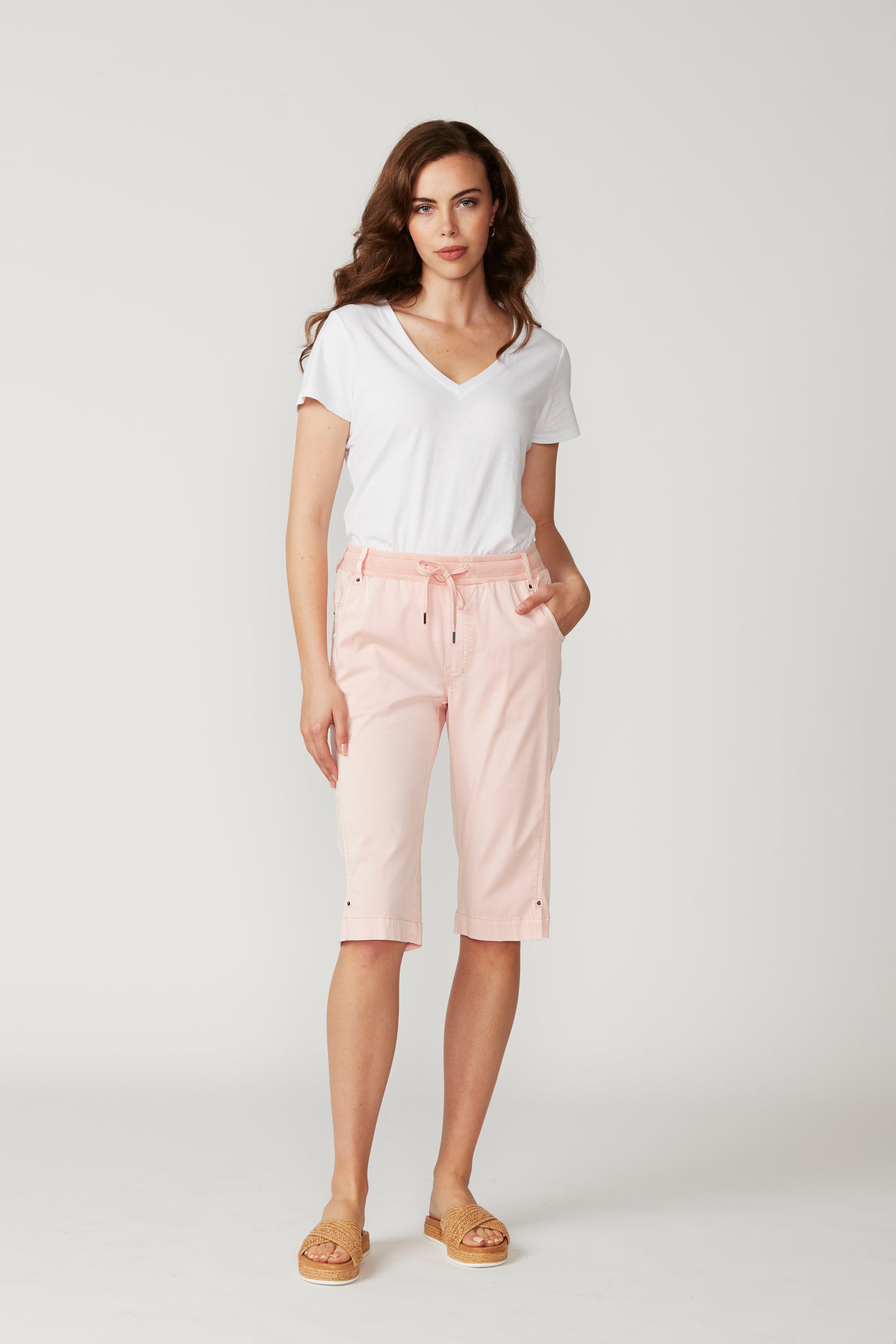 A cool casual knee length short, rib waistband with drawcord, mock fly and front pockets. The soft handle and slightly distressed finish is achieved by special garment wash.