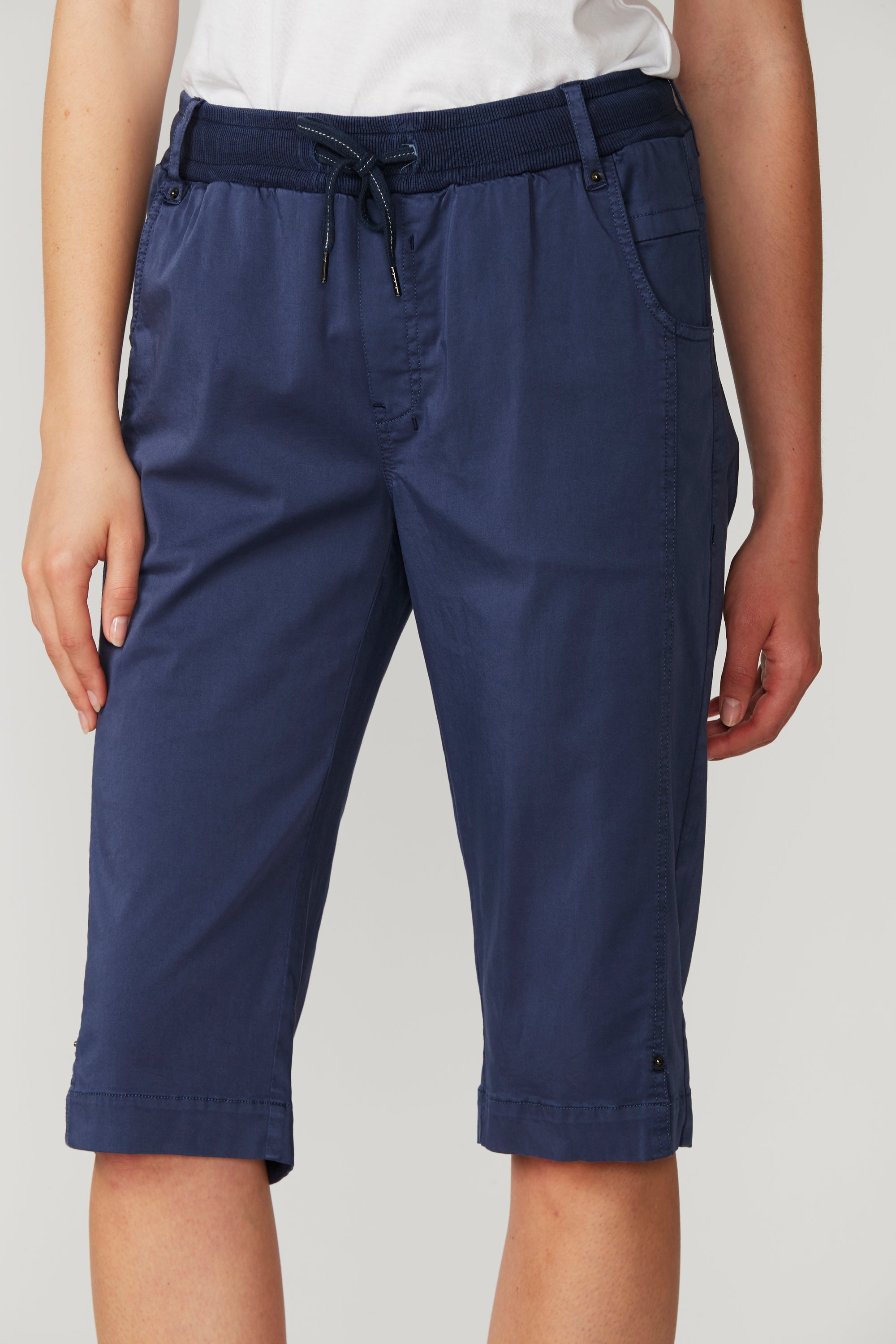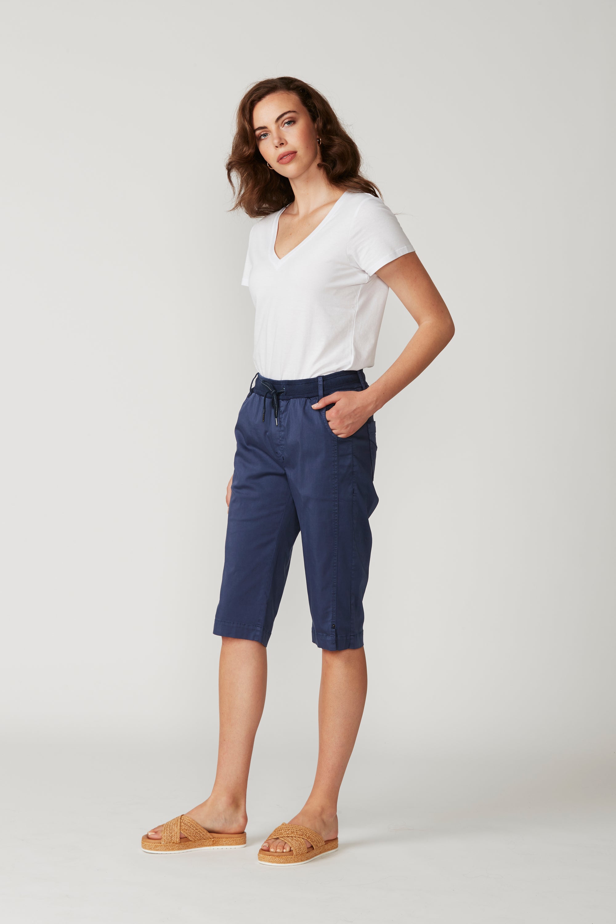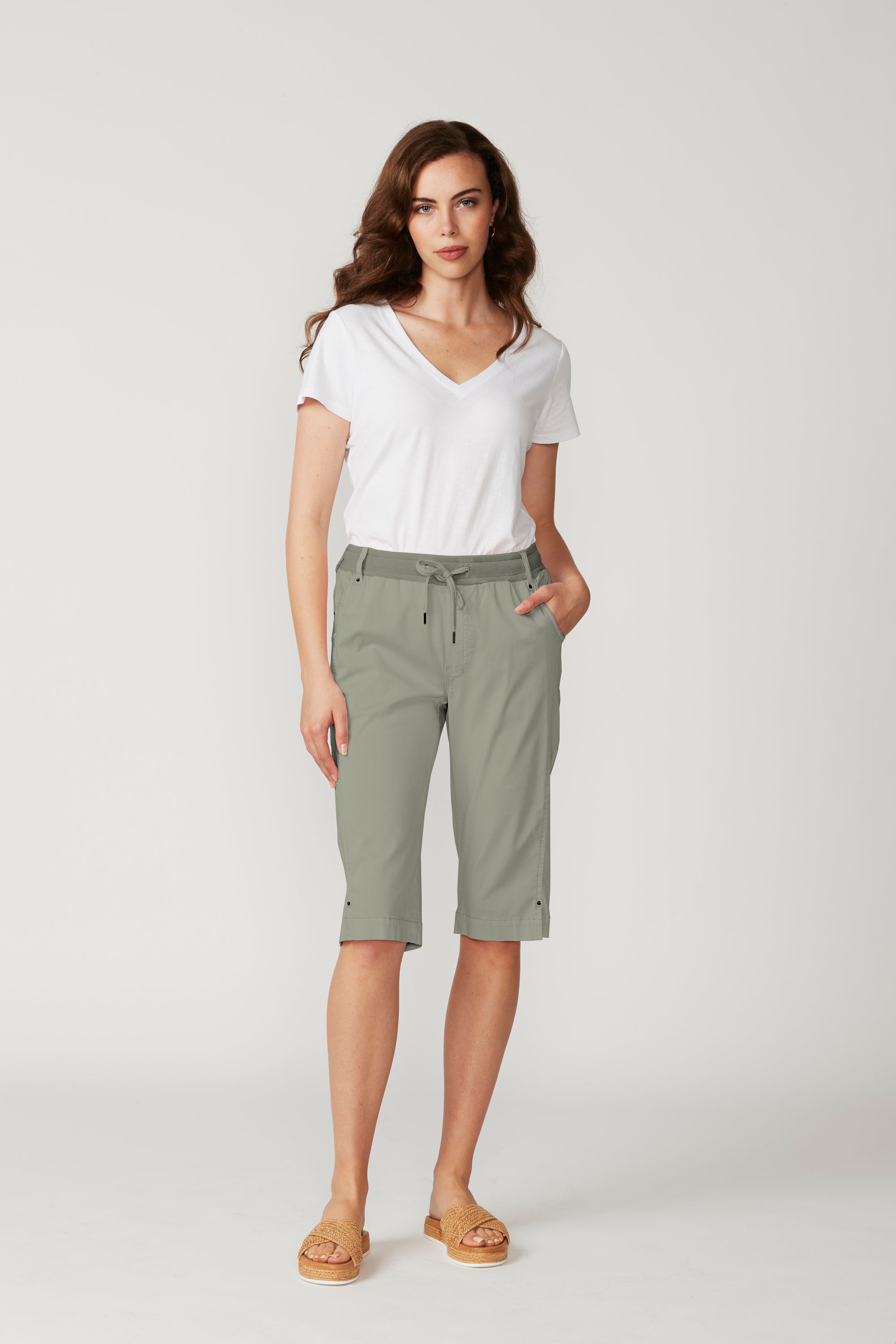 A cool casual knee length short, rib waistband with drawcord, mock fly and front pockets. The soft handle and slightly distressed finish is achieved by special garment wash.