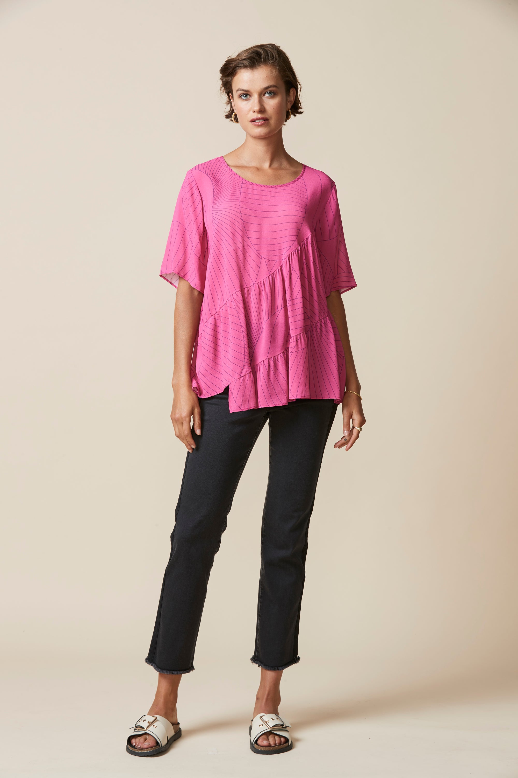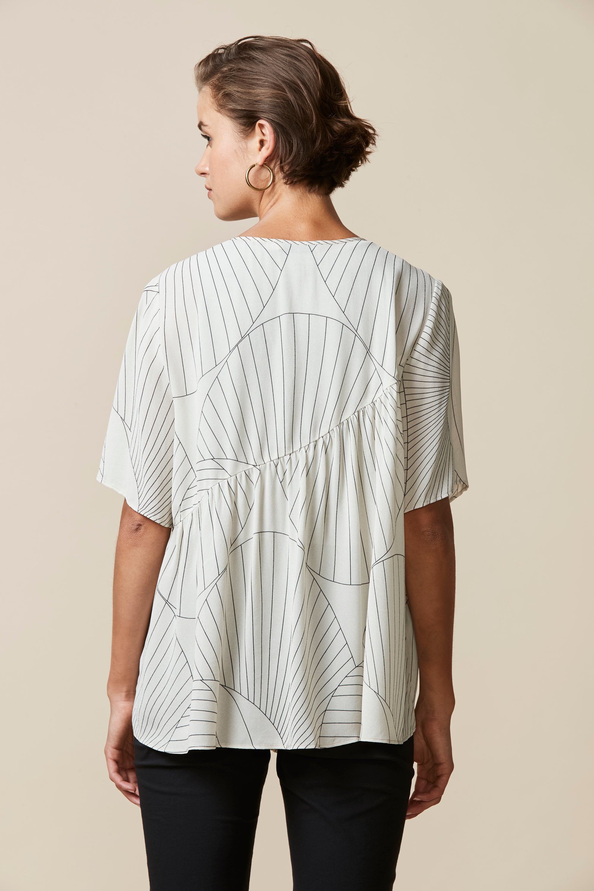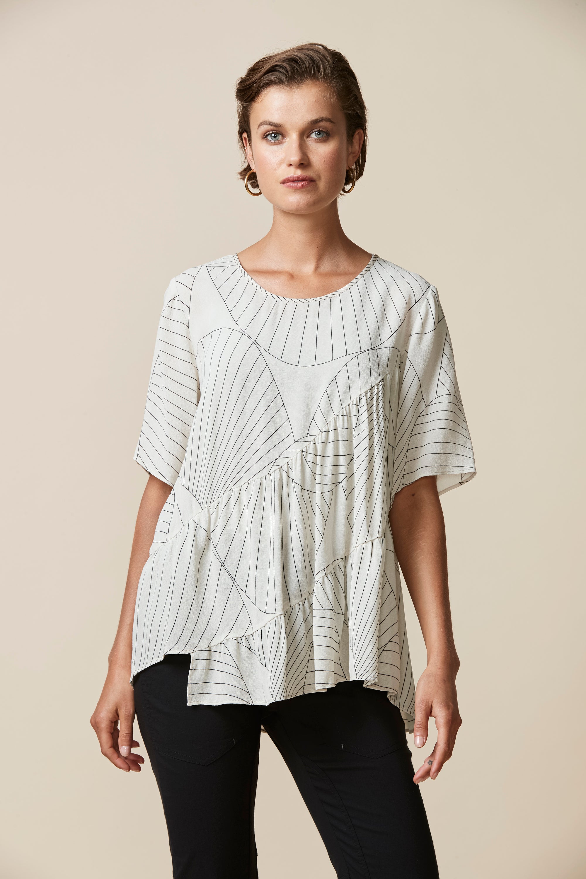 Bold linear print broken up by soft gathering through diagonal panel seams. Asymmetric stepped hem at front.