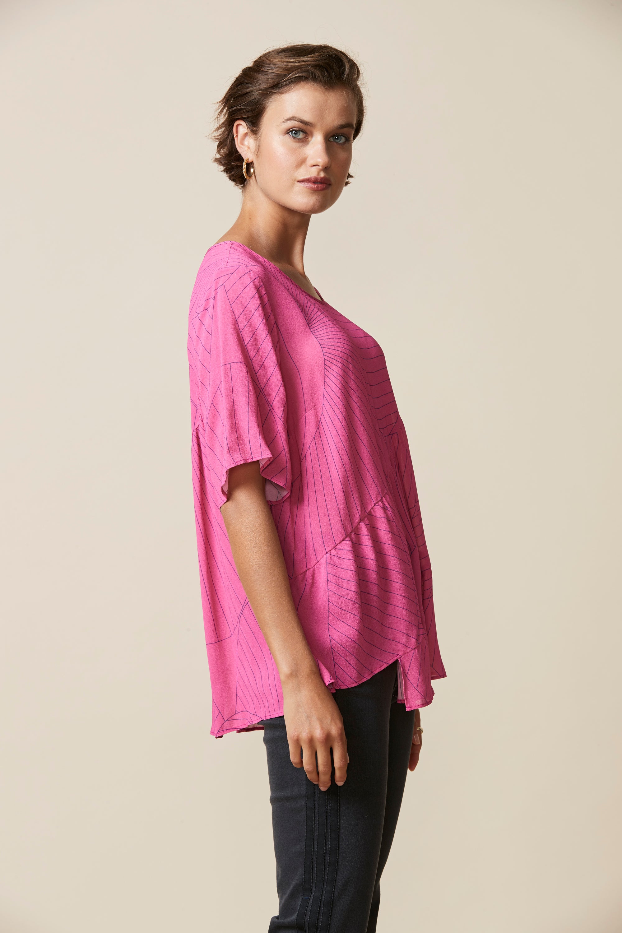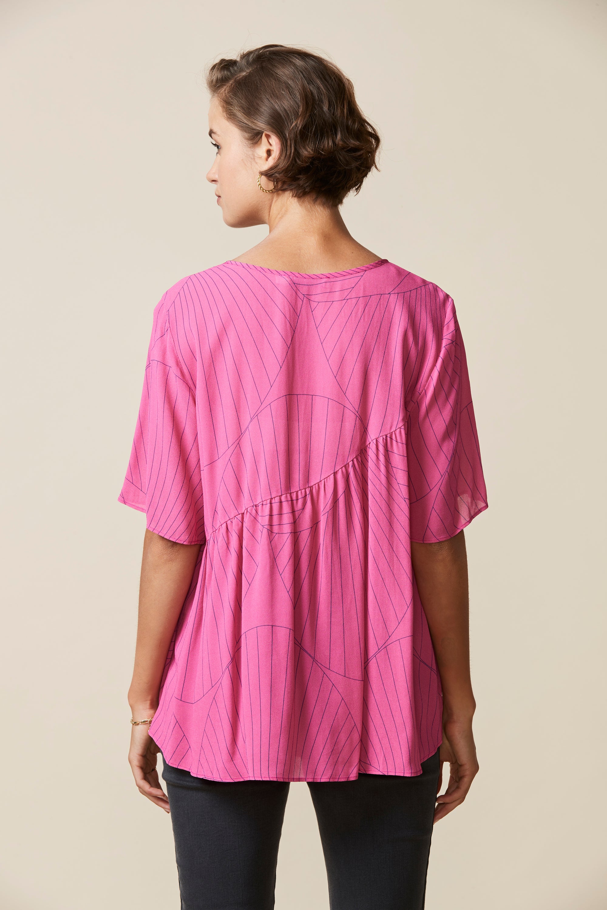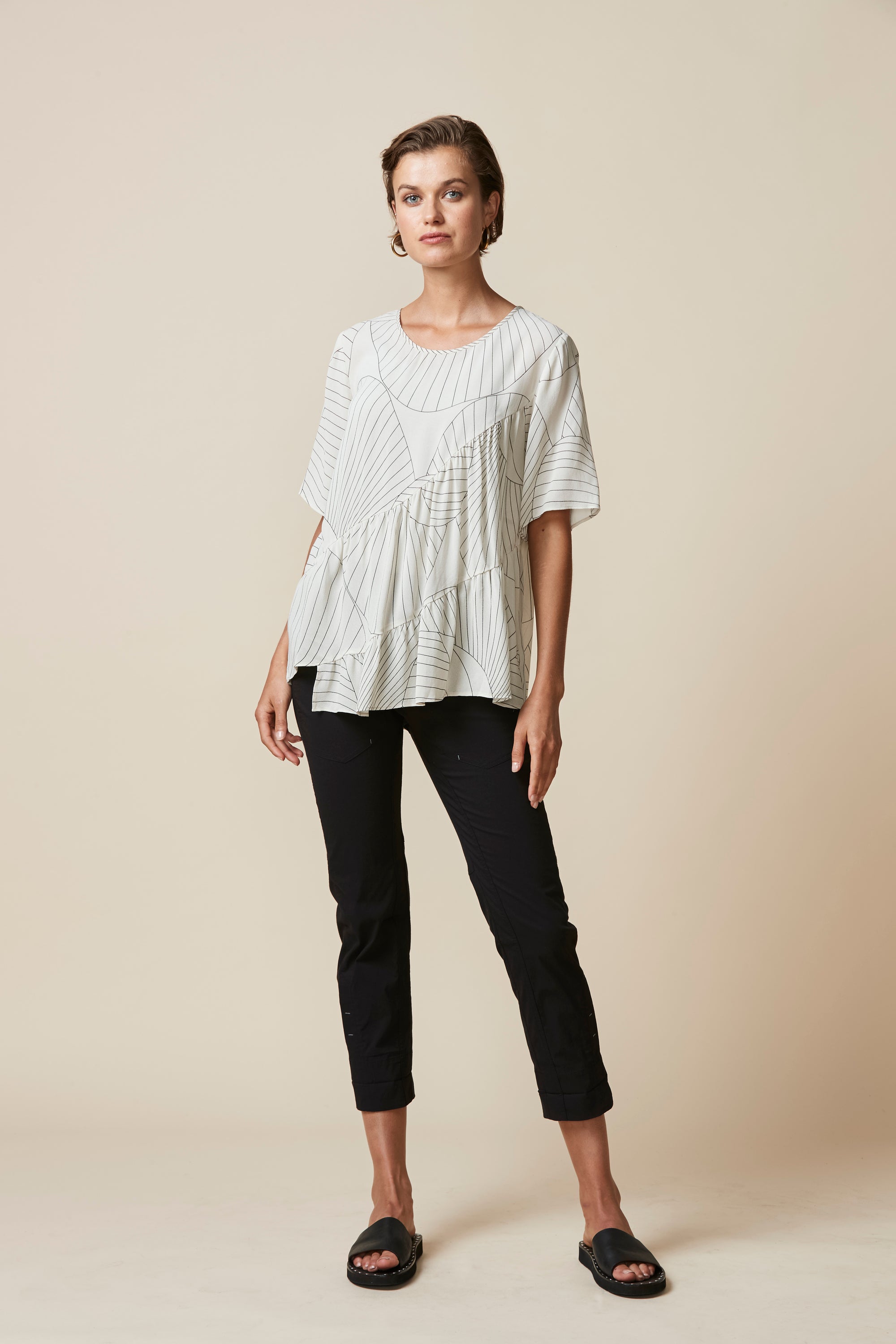 Bold linear print broken up by soft gathering through diagonal panel seams. Asymmetric stepped hem at front.