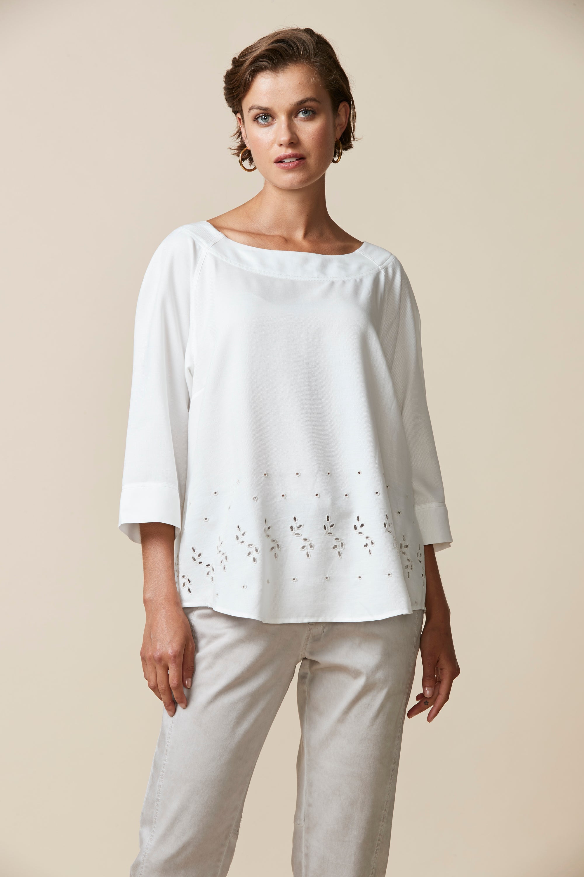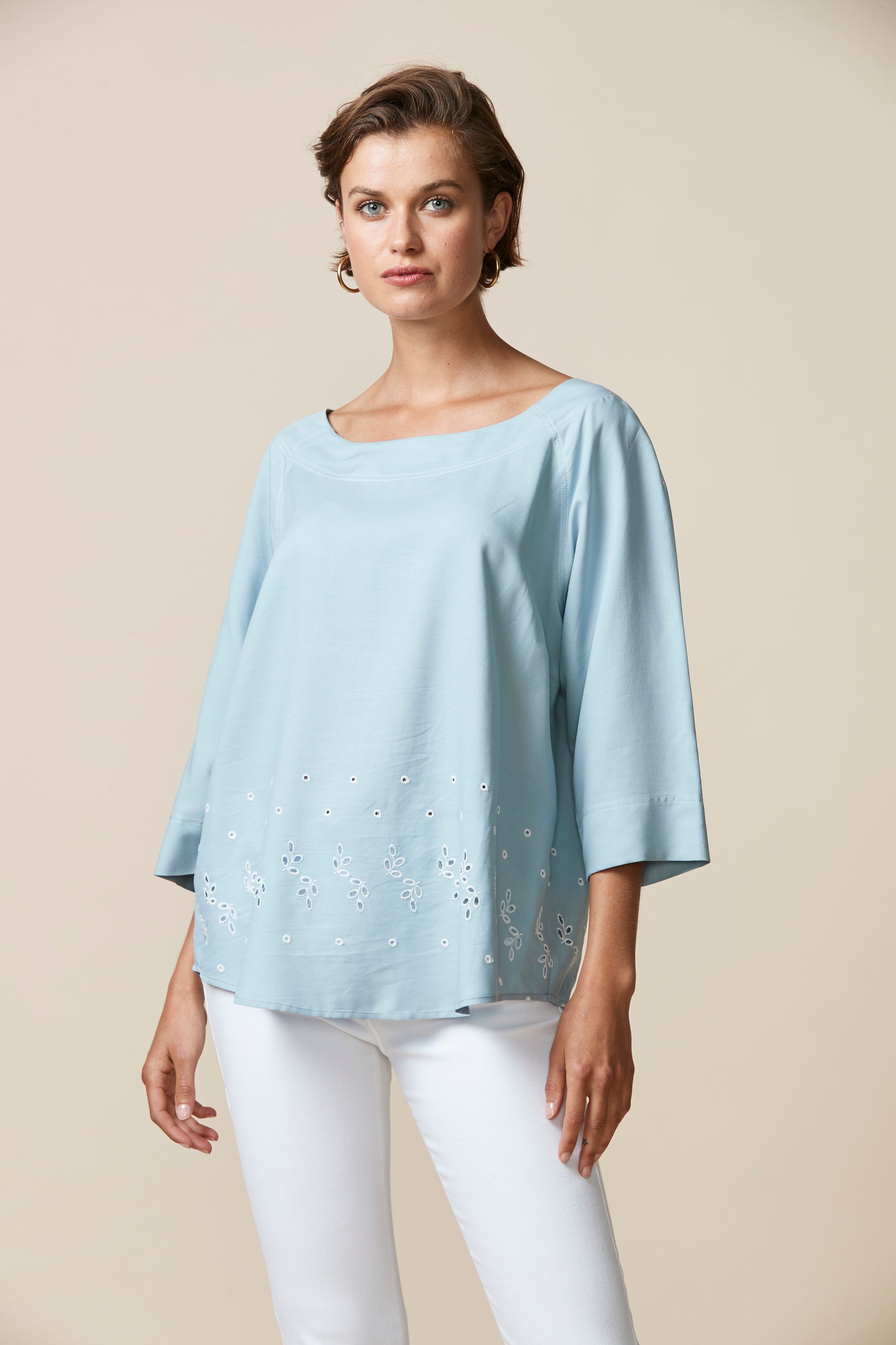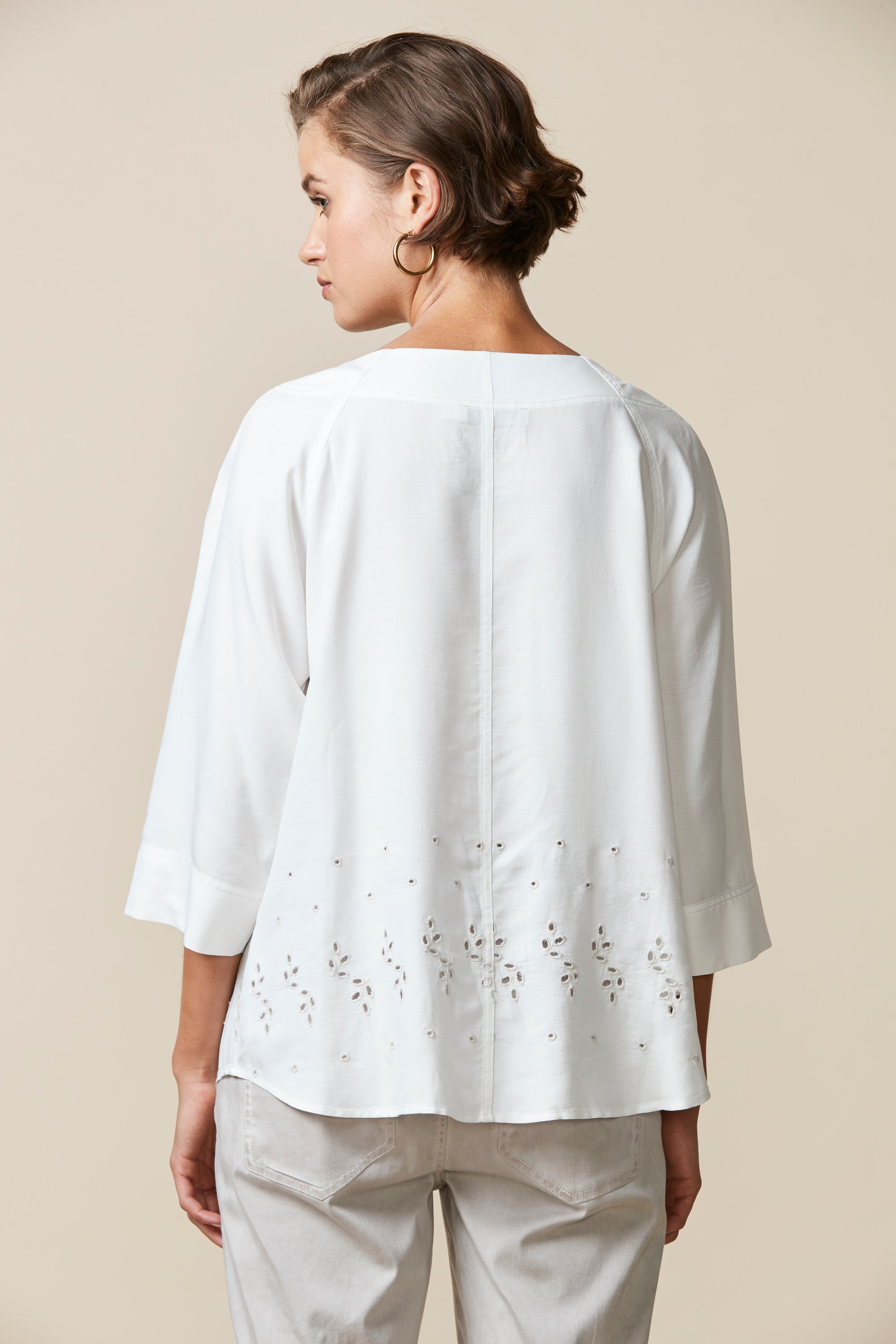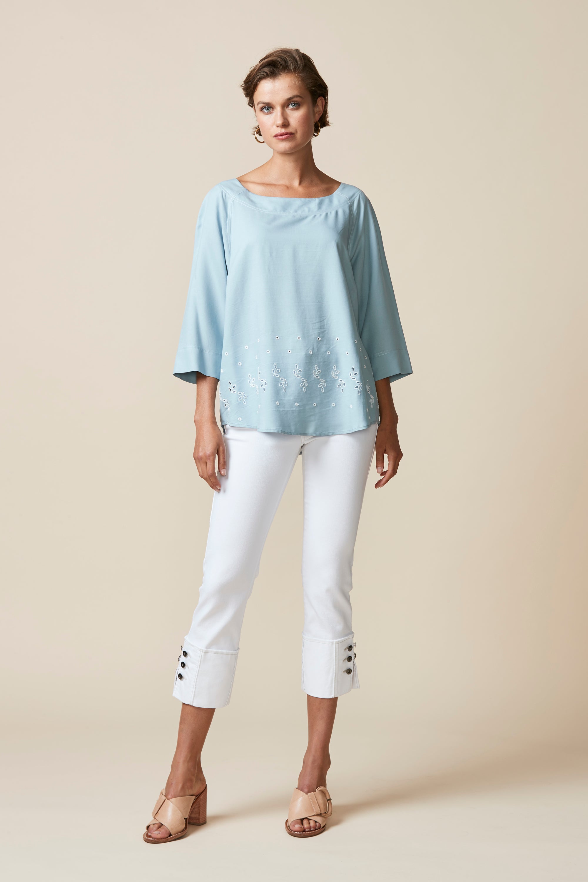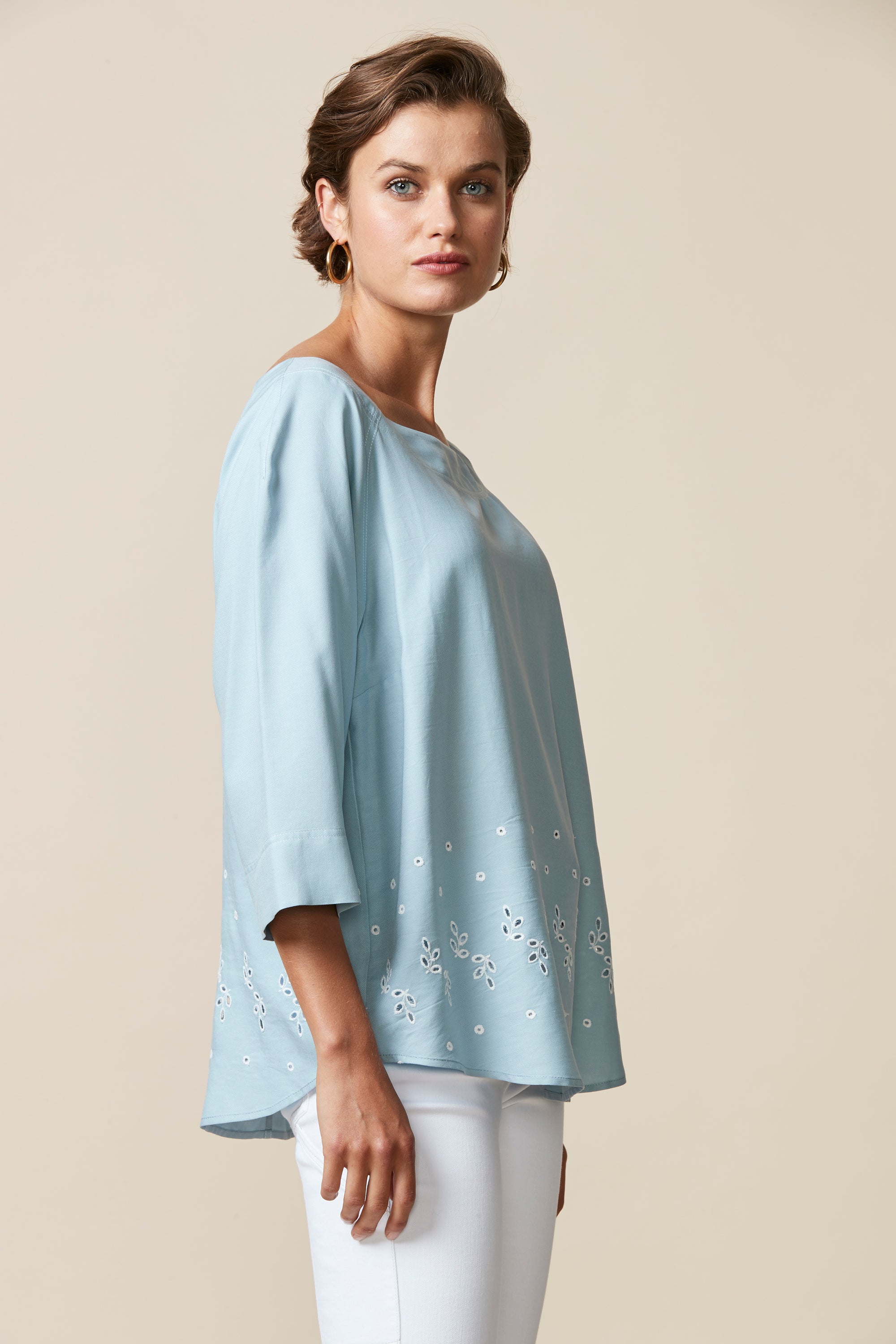 This scoop neck raglan sleeve top with broderie detail around the hem is perfect for pairing with jeans for an elevated look.