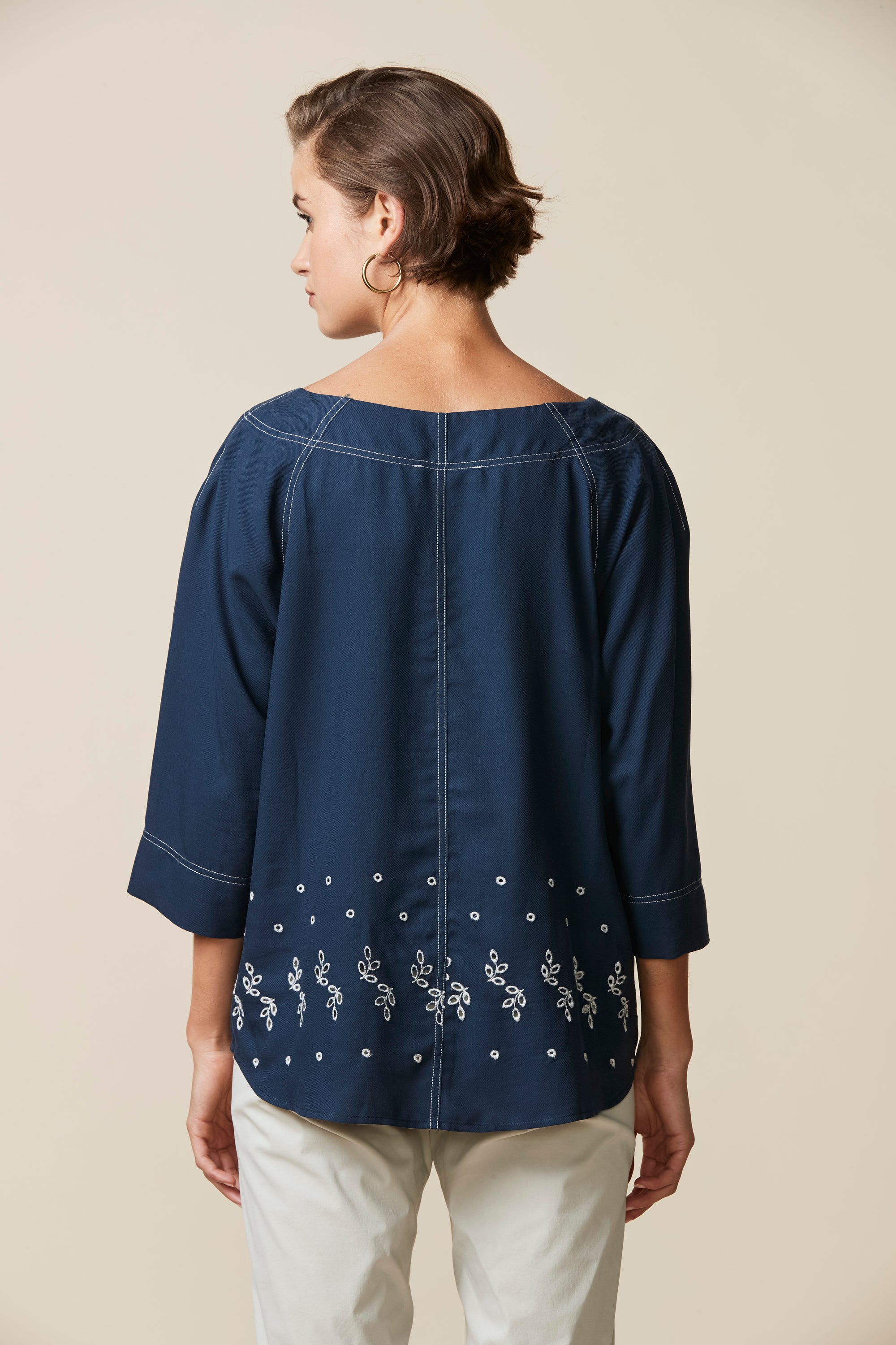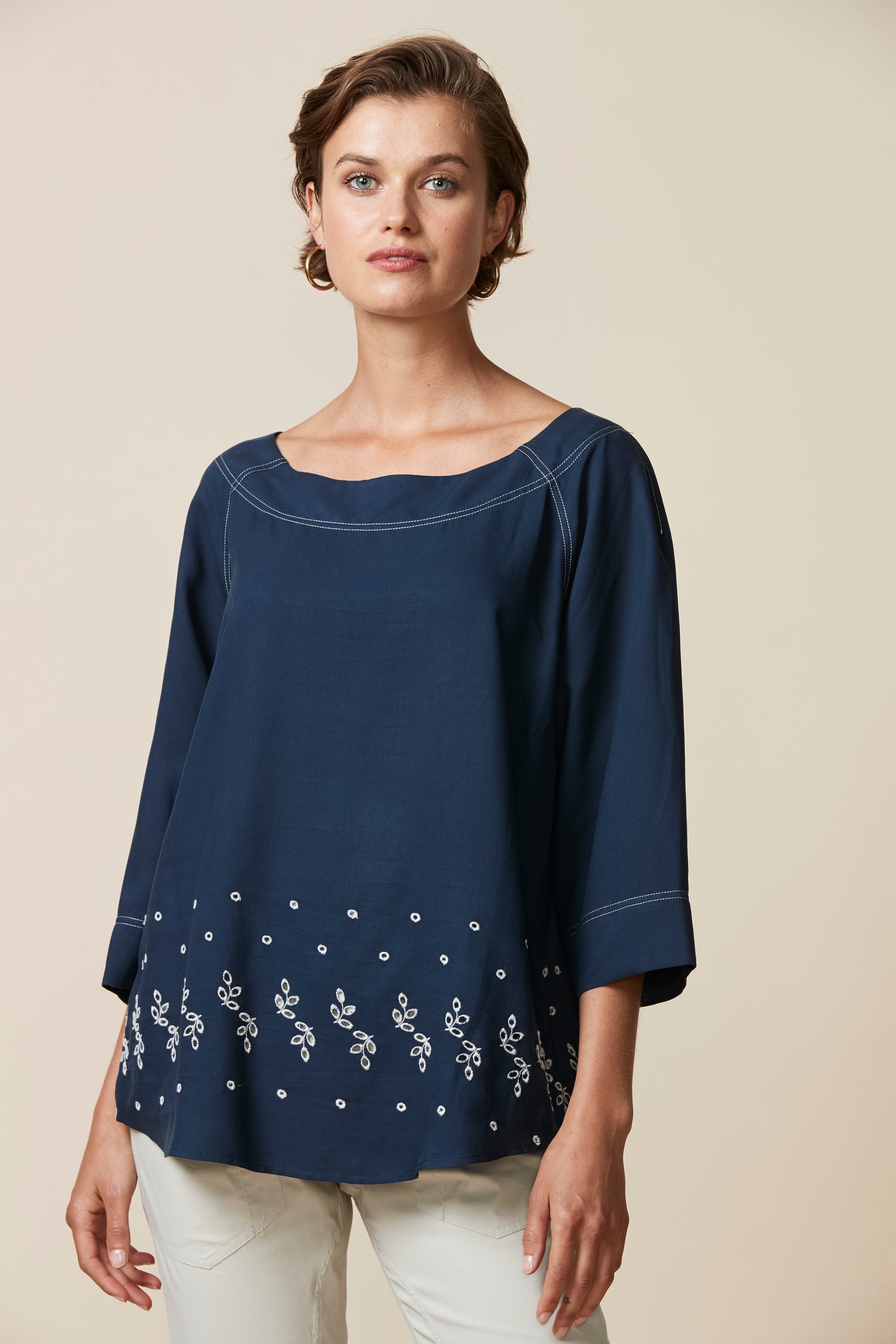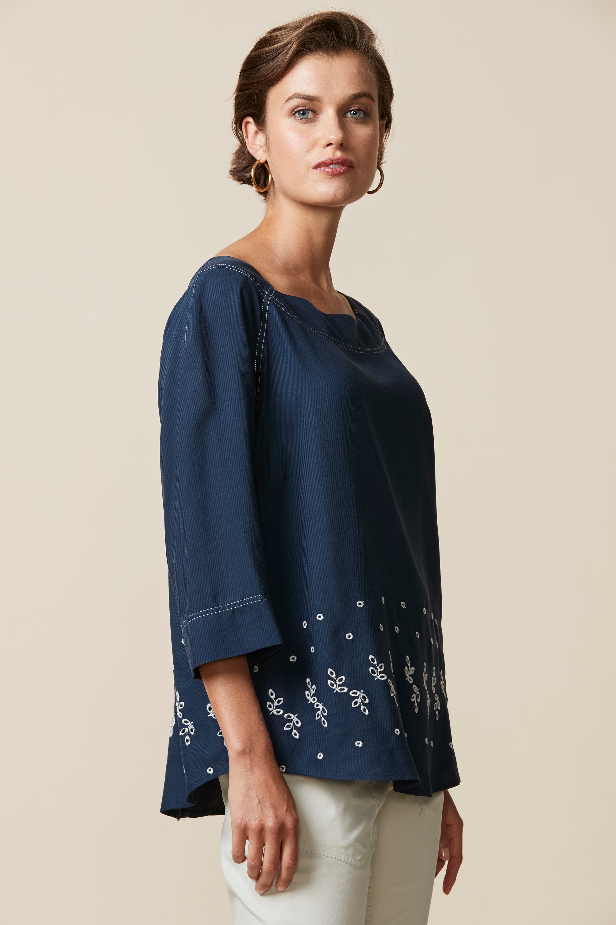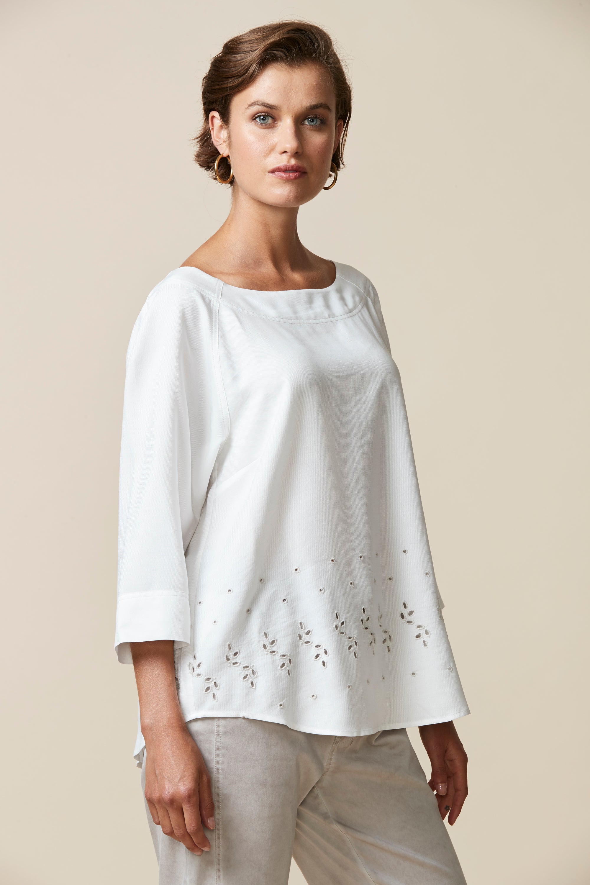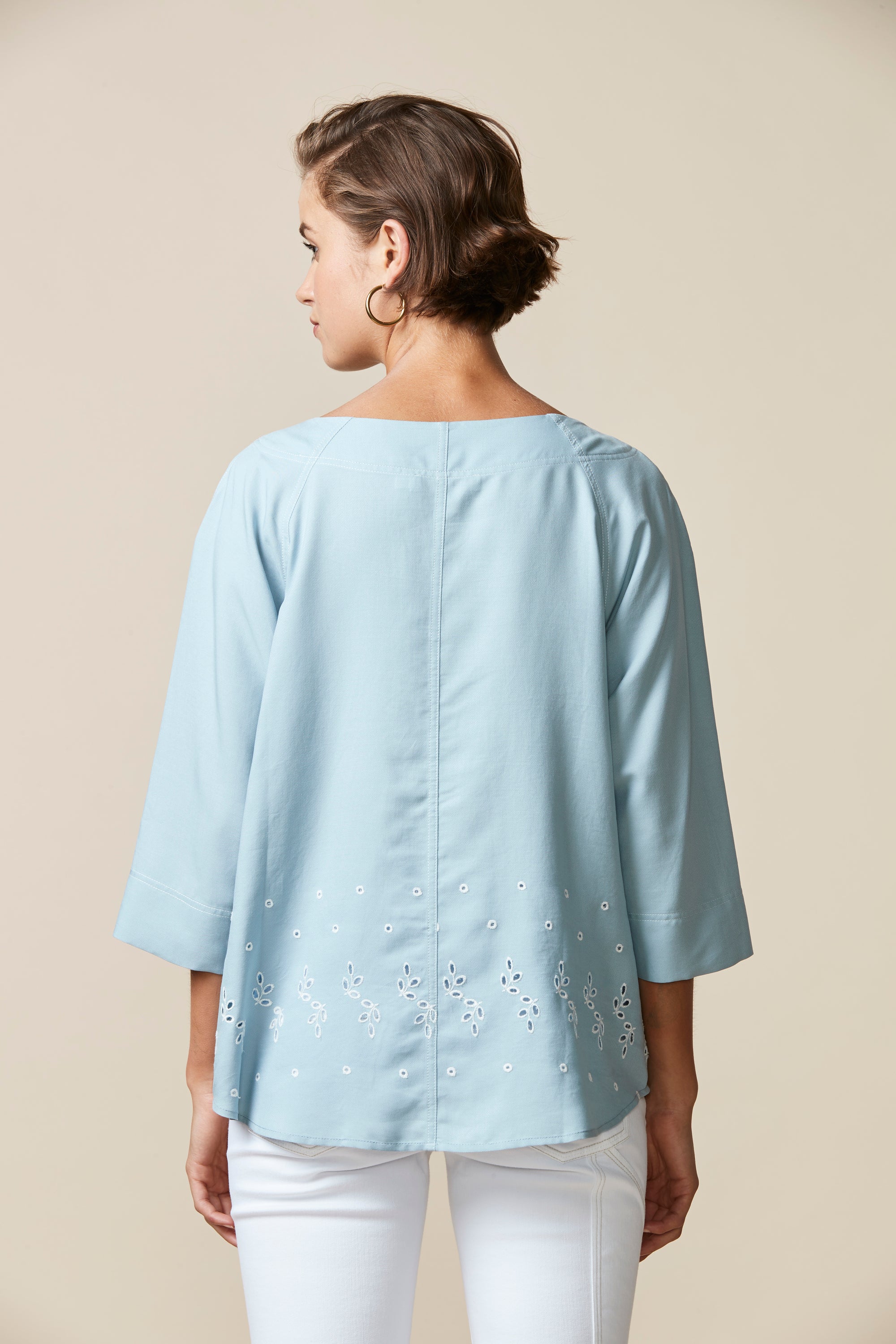 This scoop neck raglan sleeve top with broderie detail around the hem is perfect for pairing with jeans for an elevated look.