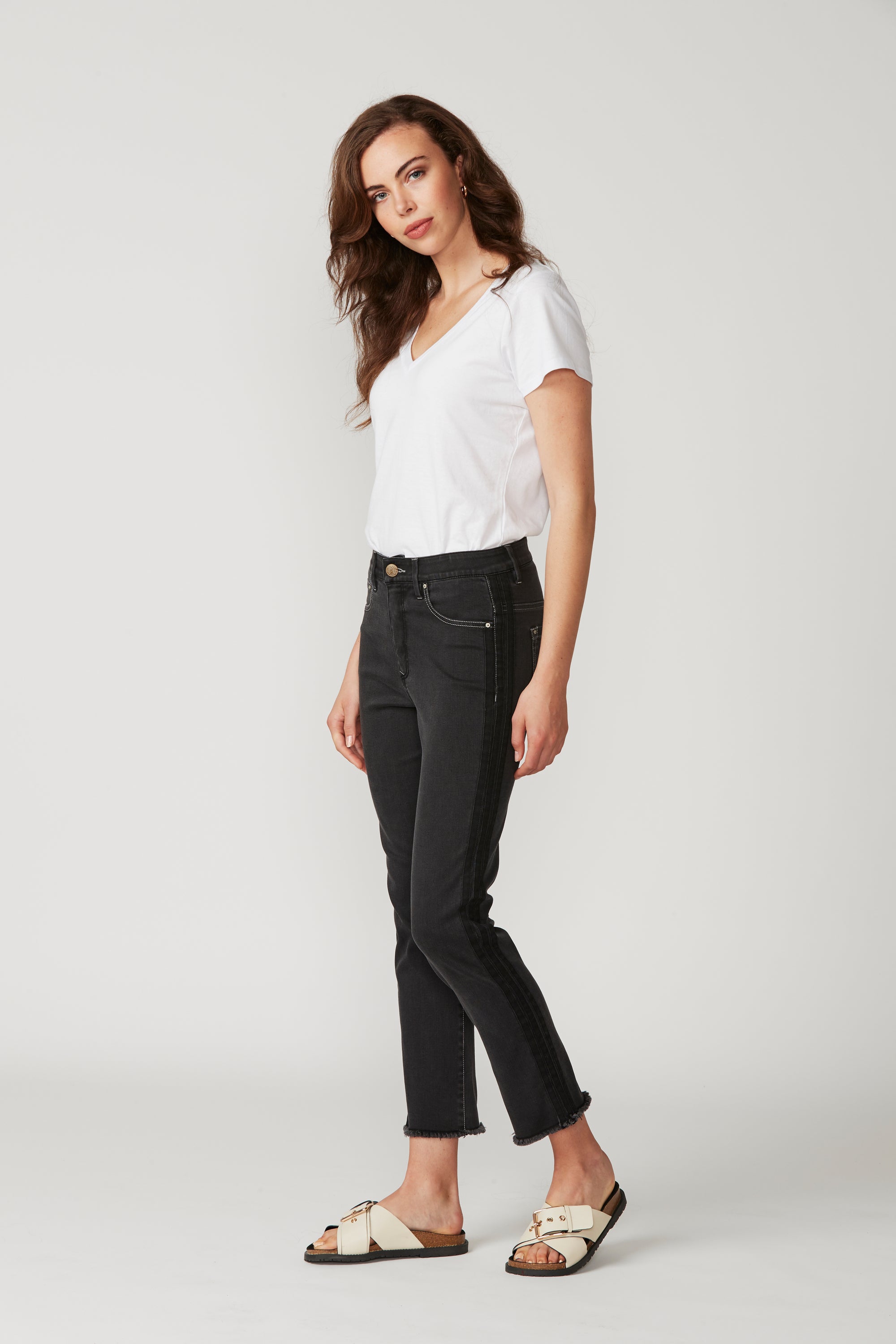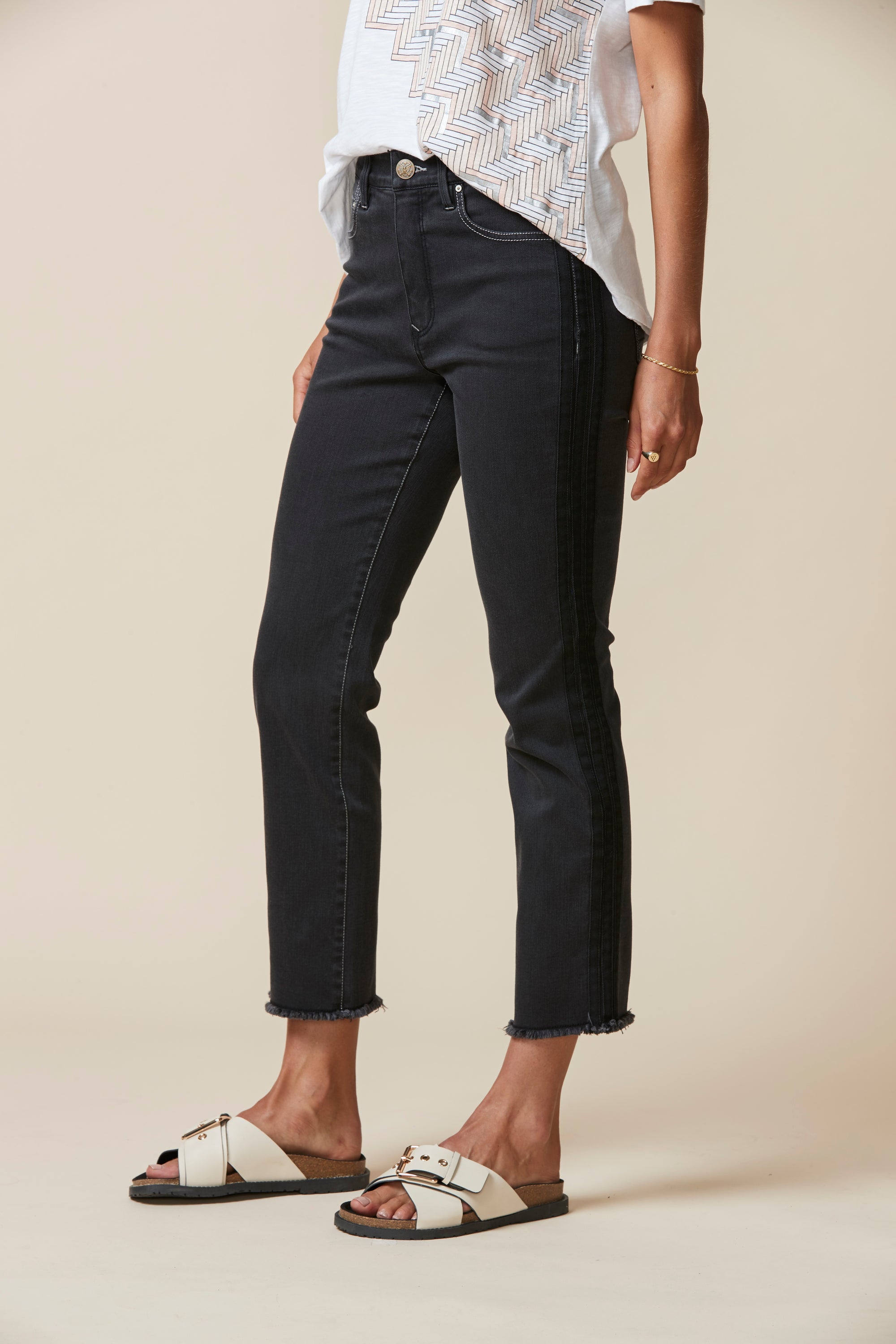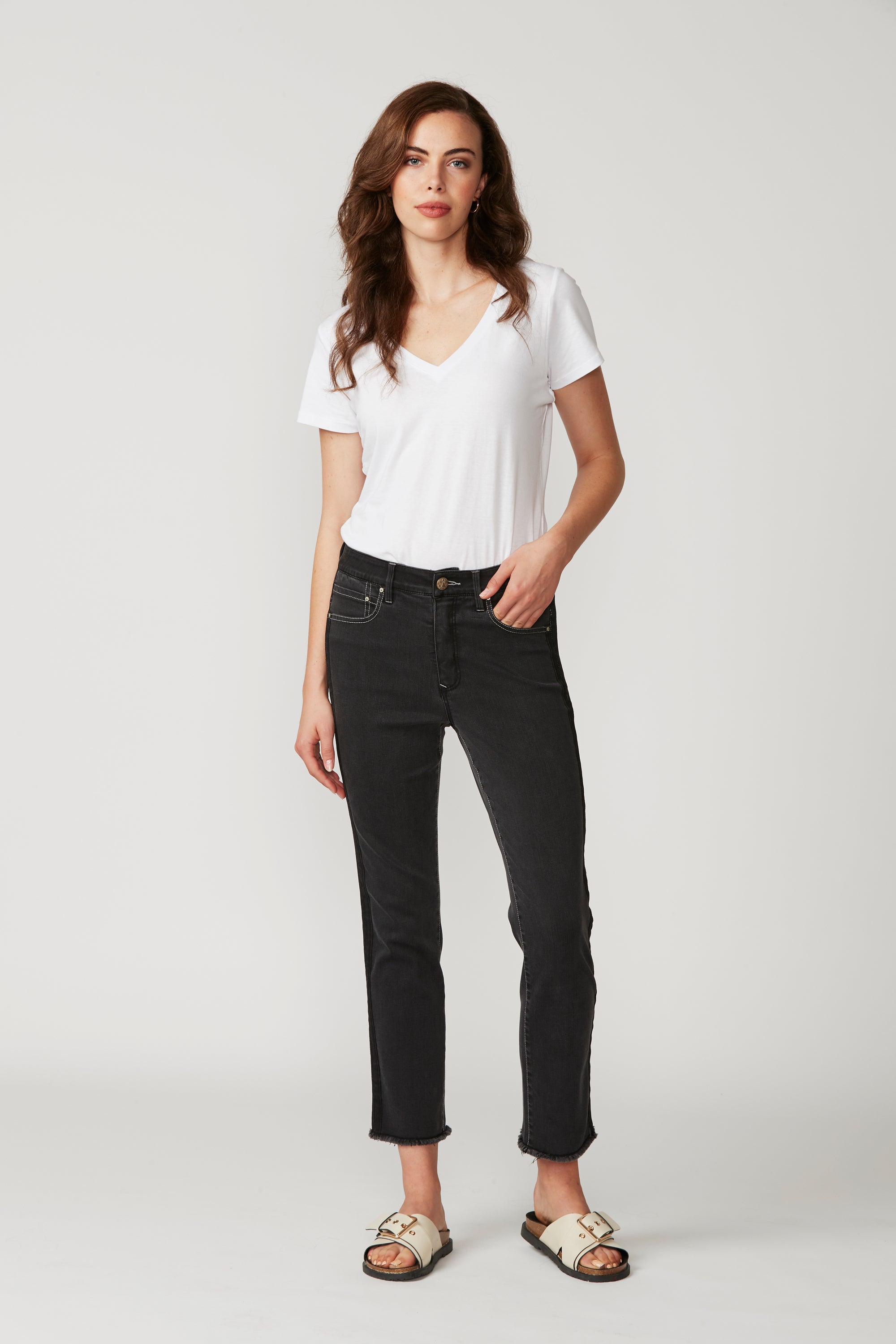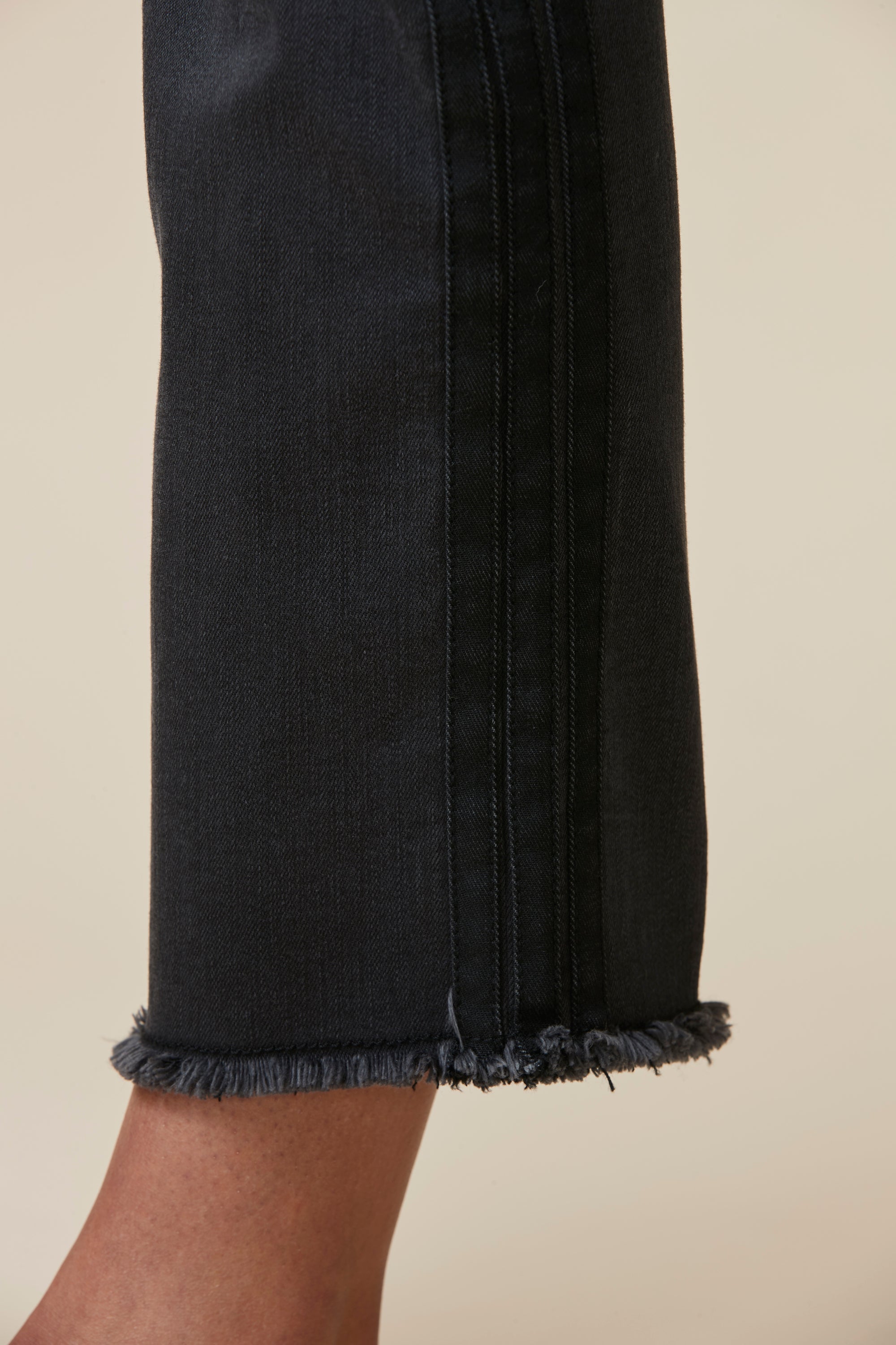 Straight fit mid rise jeans in a super stretchy denim, featuring a frayed hem and self stripe detail at outside leg. Our signature stretch waist construction is so comfortable you can wear these jeans day in day out.