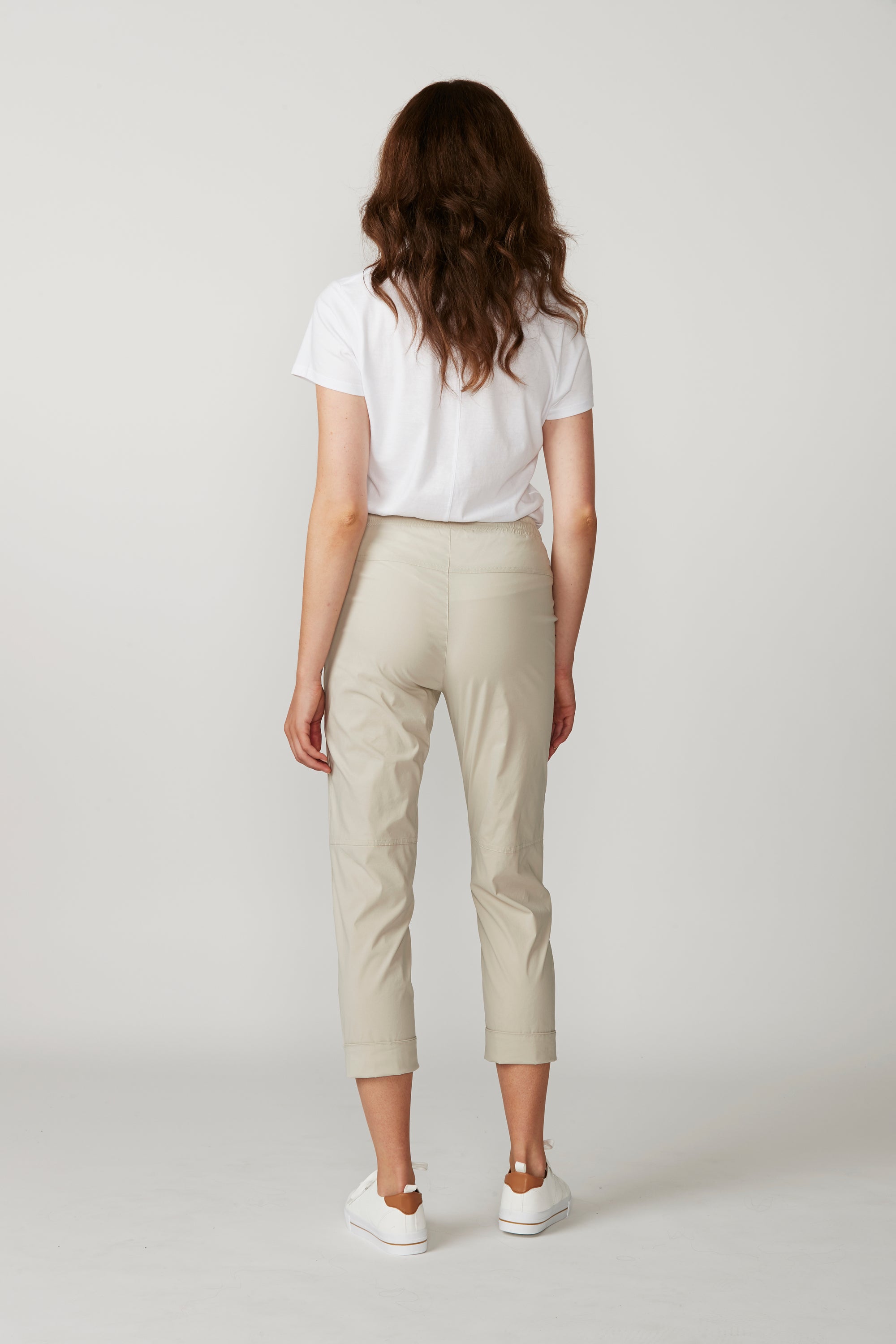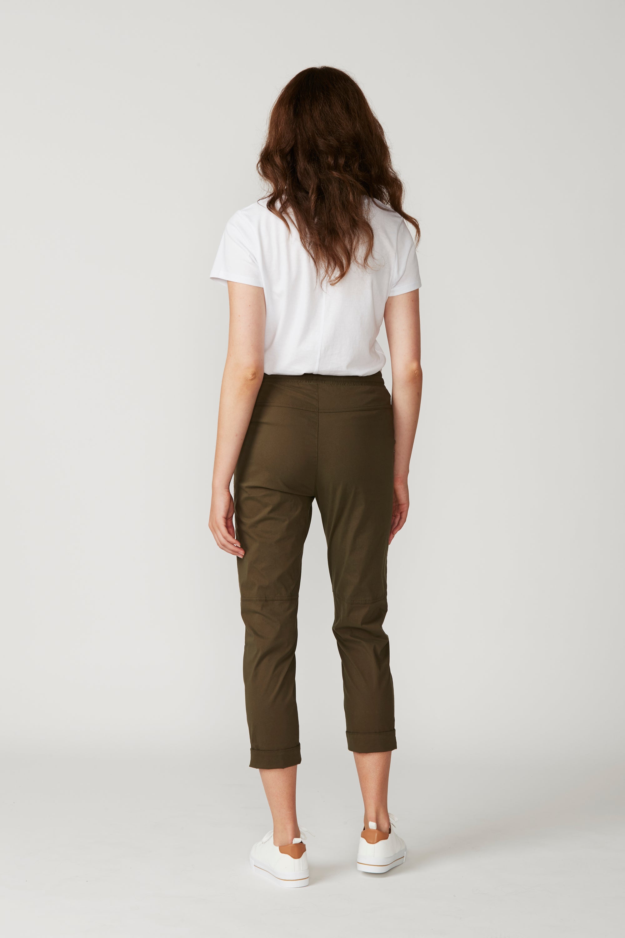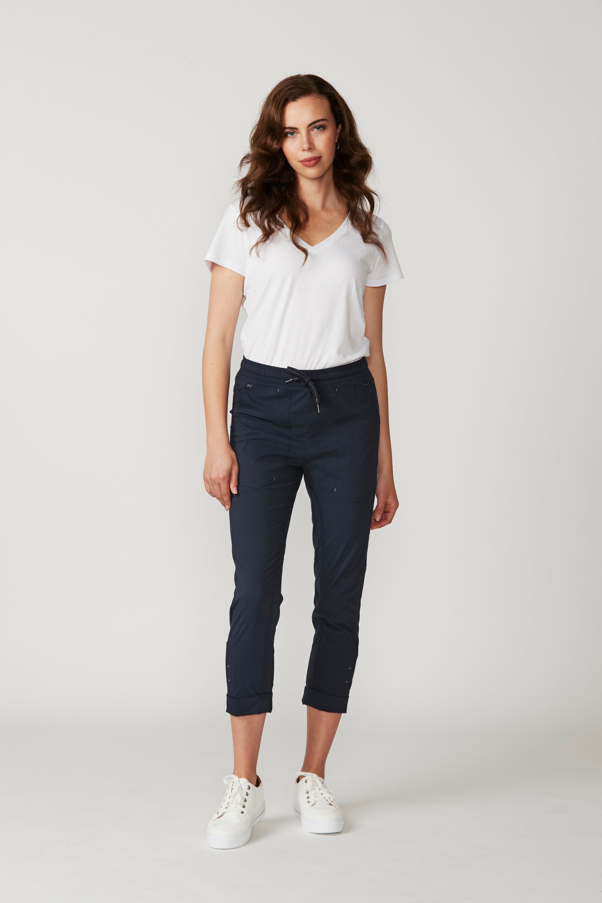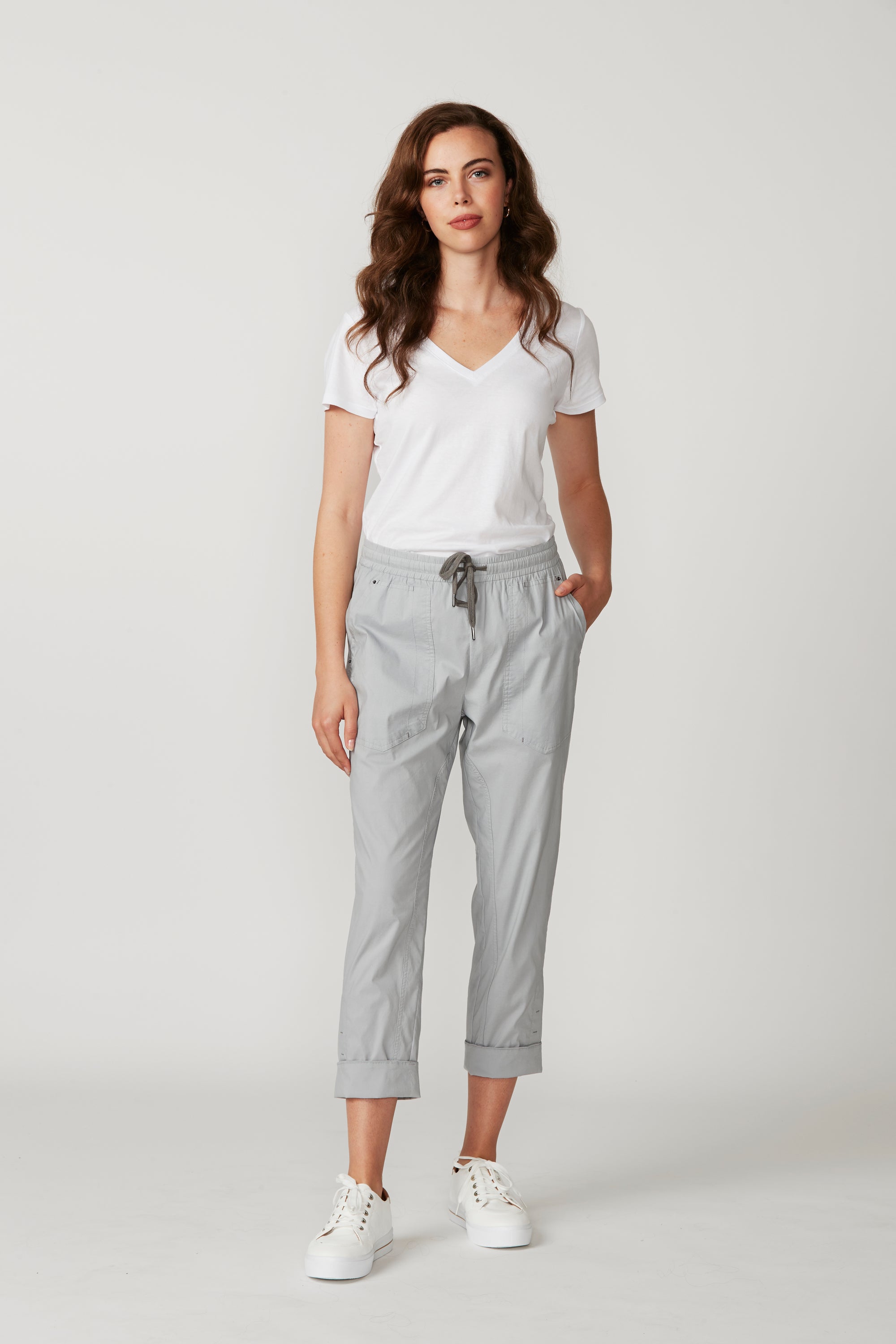 The LTL port 7/8 pant – features elasticated waist with adjustable drawcord, front pocket with antique nickel hardware & relaxed leg with optional turn up cuff. Perfect lightweight cotton rich stretch pant for everyday.