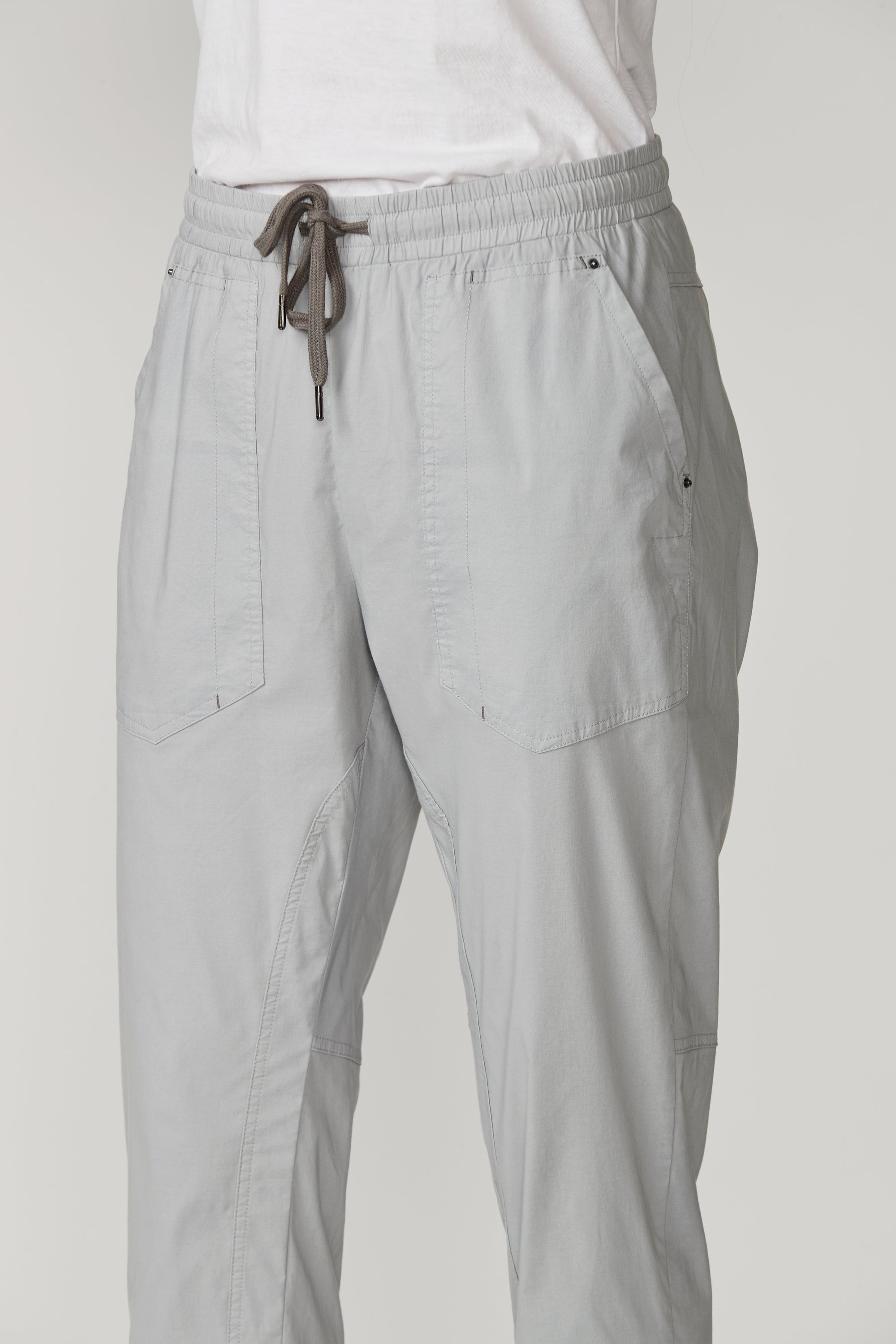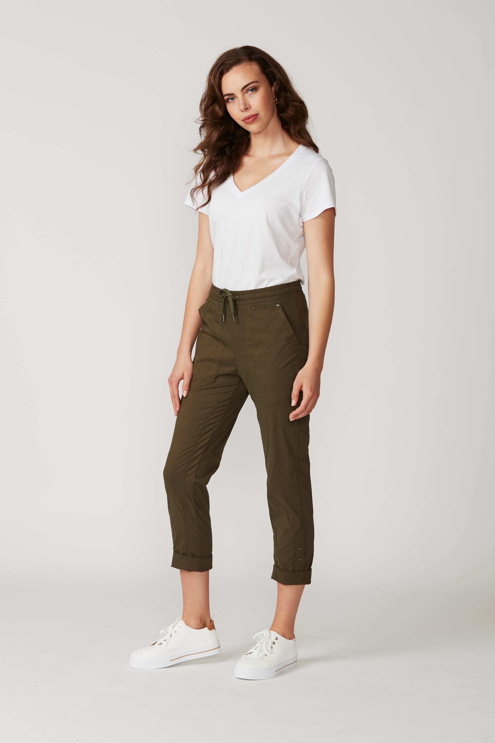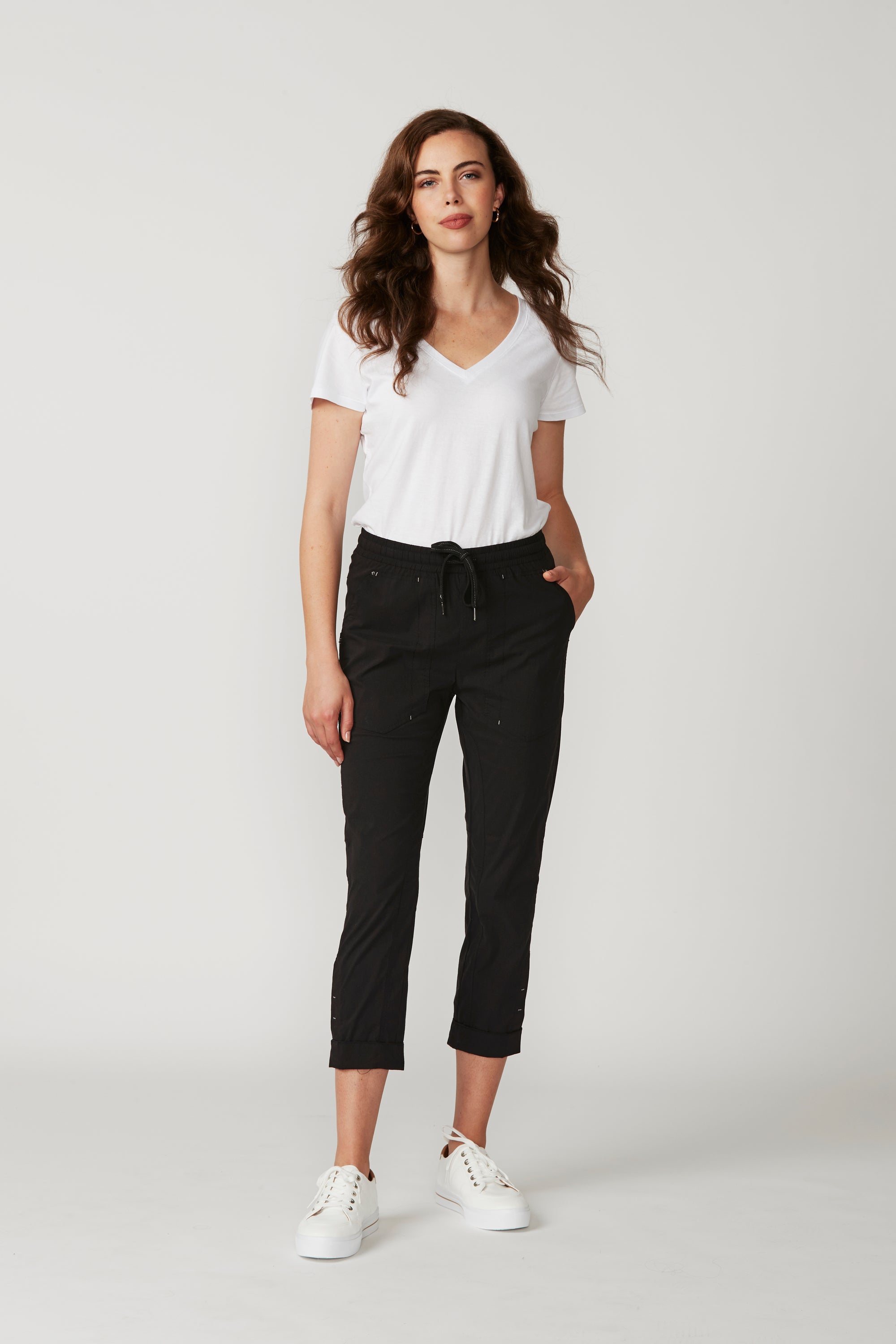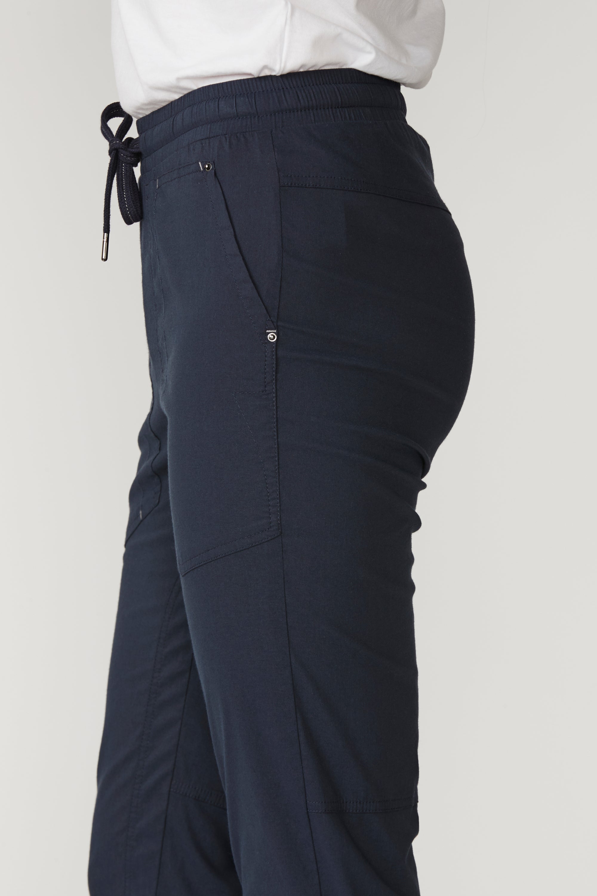 The LTL port 7/8 pant – features elasticated waist with adjustable drawcord, front pocket with antique nickel hardware & relaxed leg with optional turn up cuff. Perfect lightweight cotton rich stretch pant for everyday.