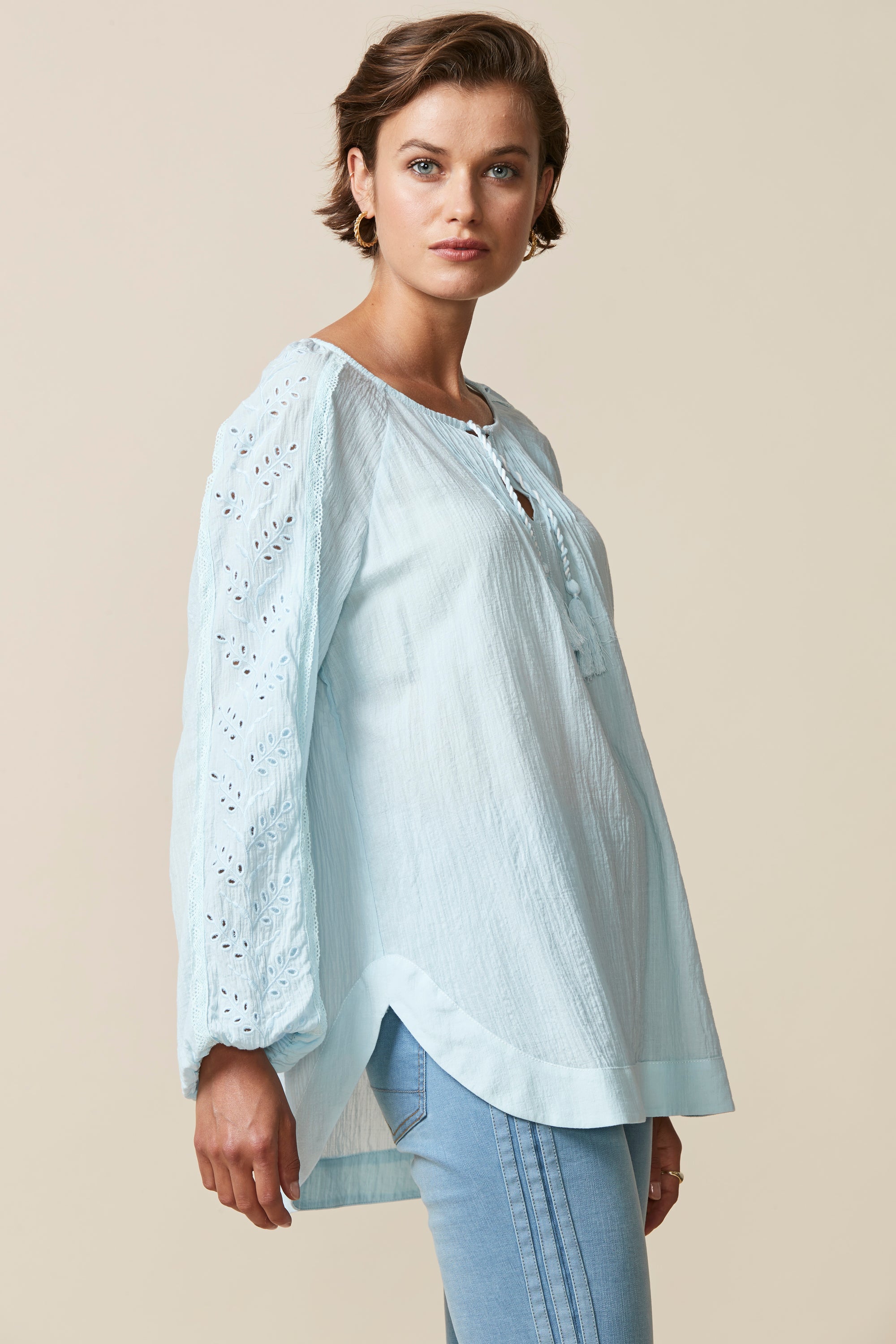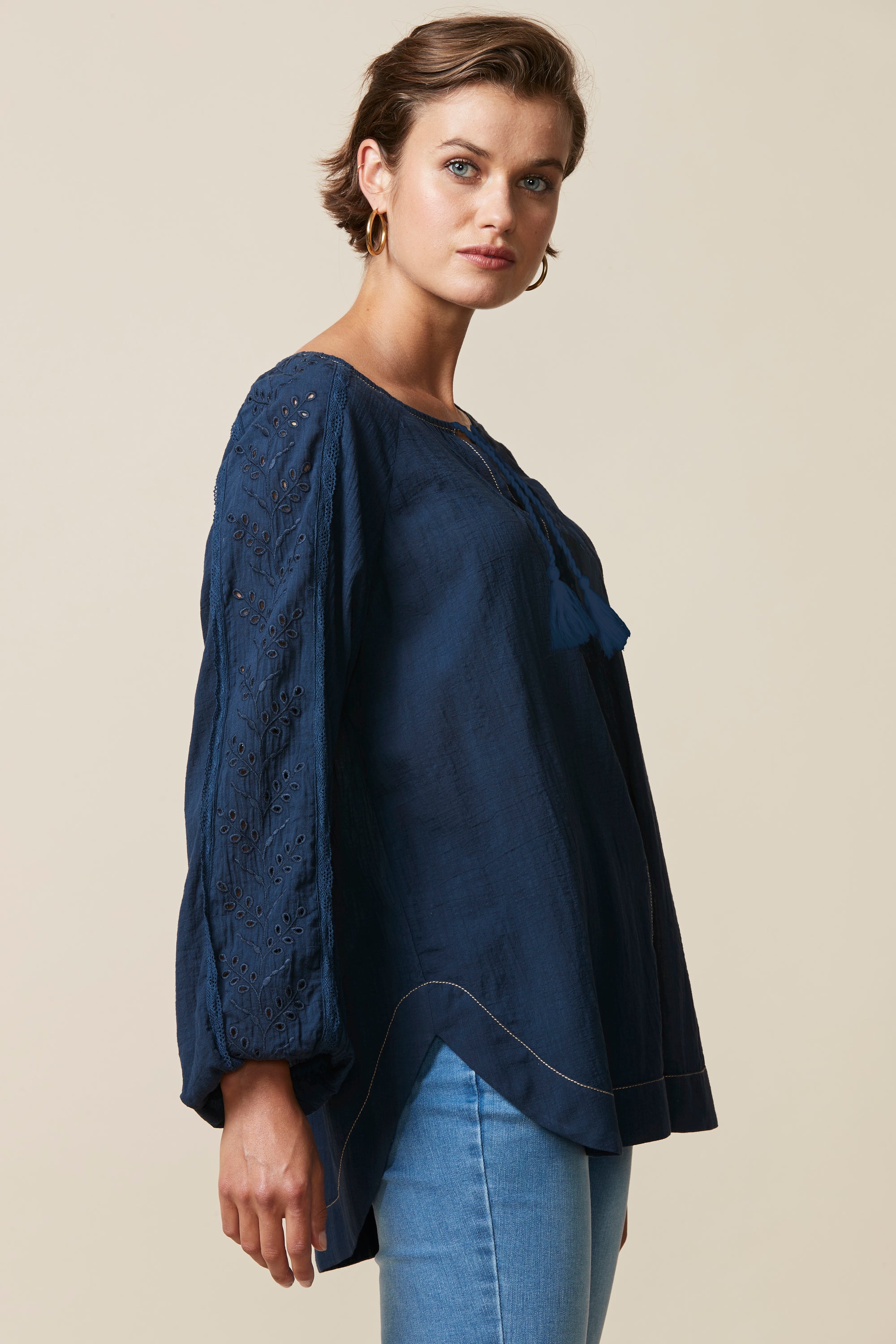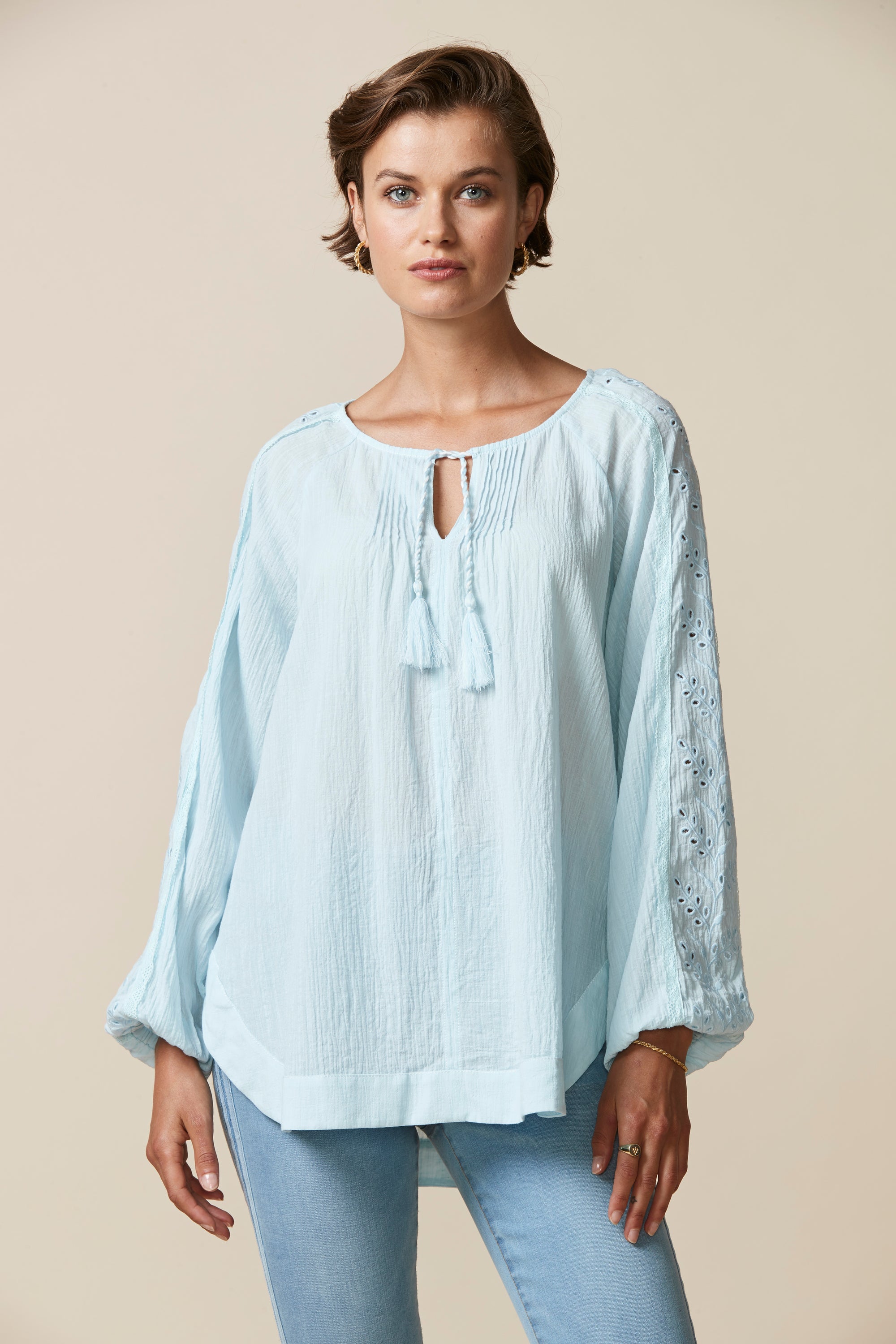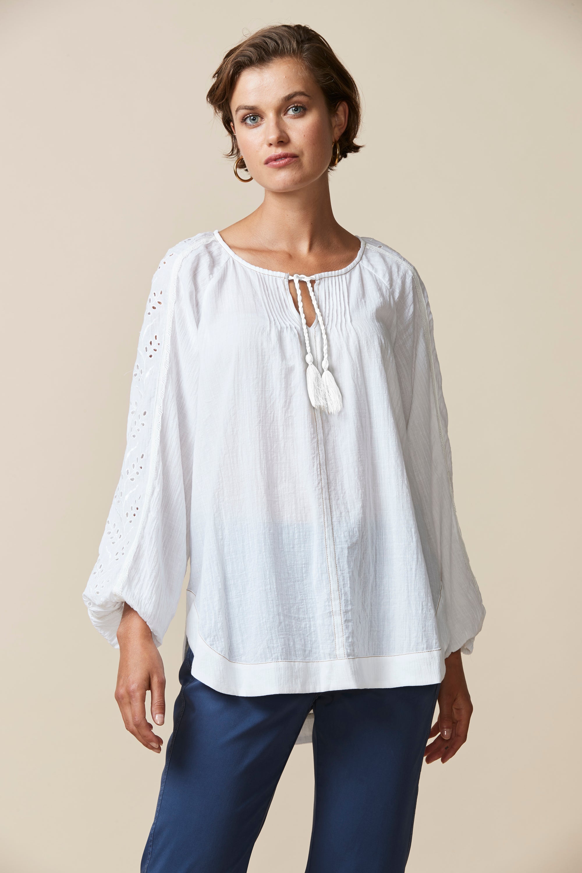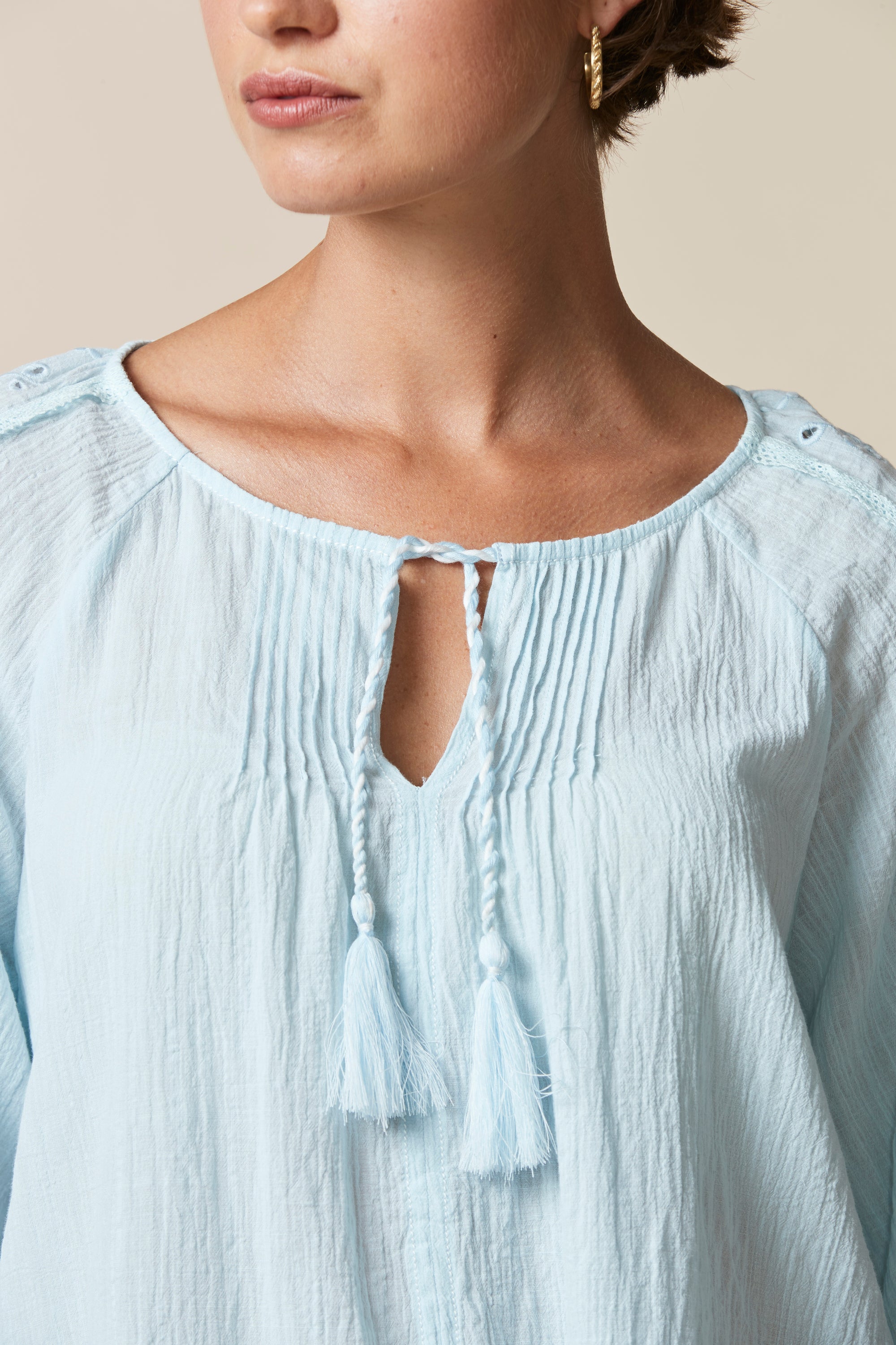 This top is perfect for those spring/summer evenings. The relaxed fit & crinkle cotton fabric ensure comfort whilst the broderie and lace detailing, pintucks and tassels bring an element soft femininity.