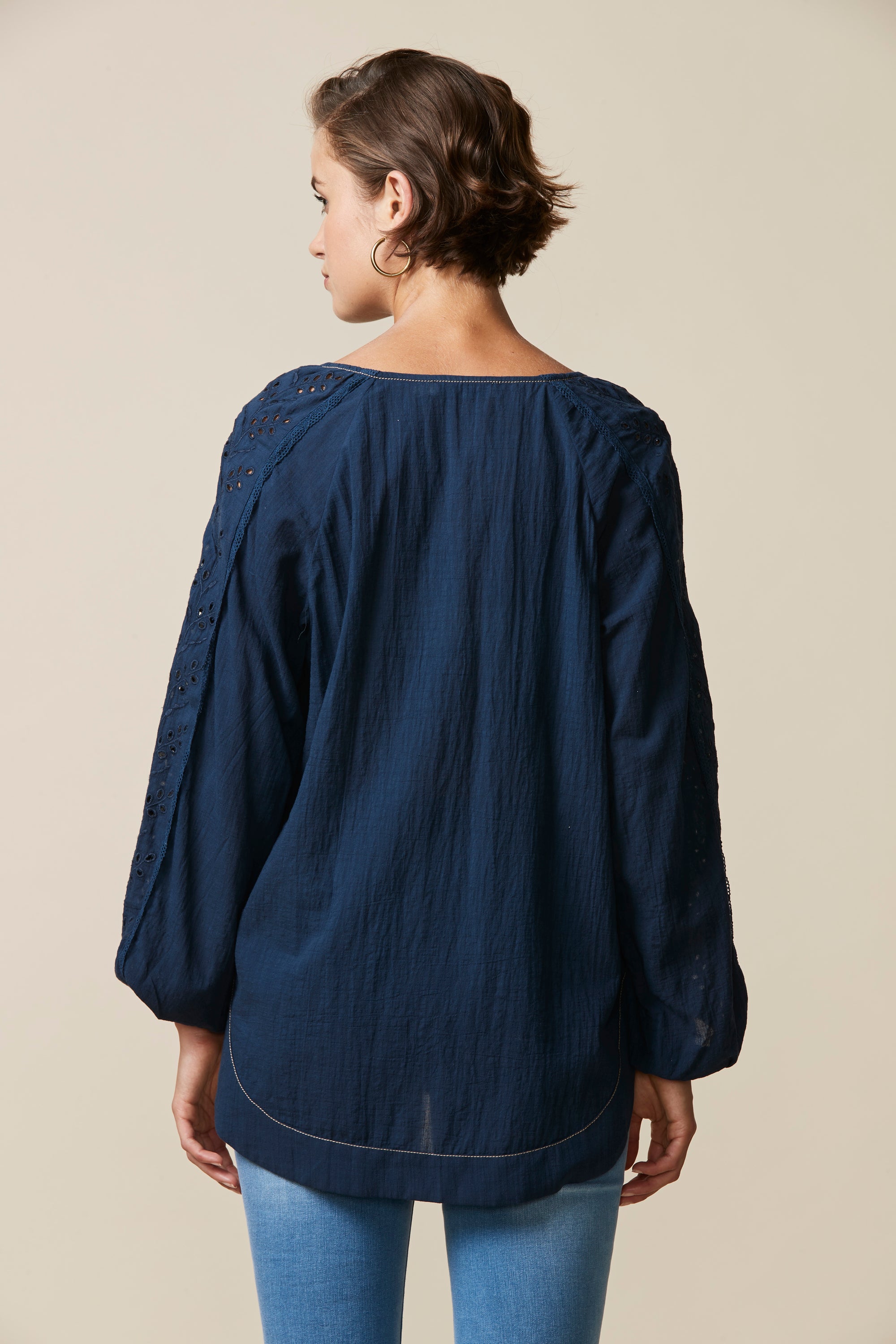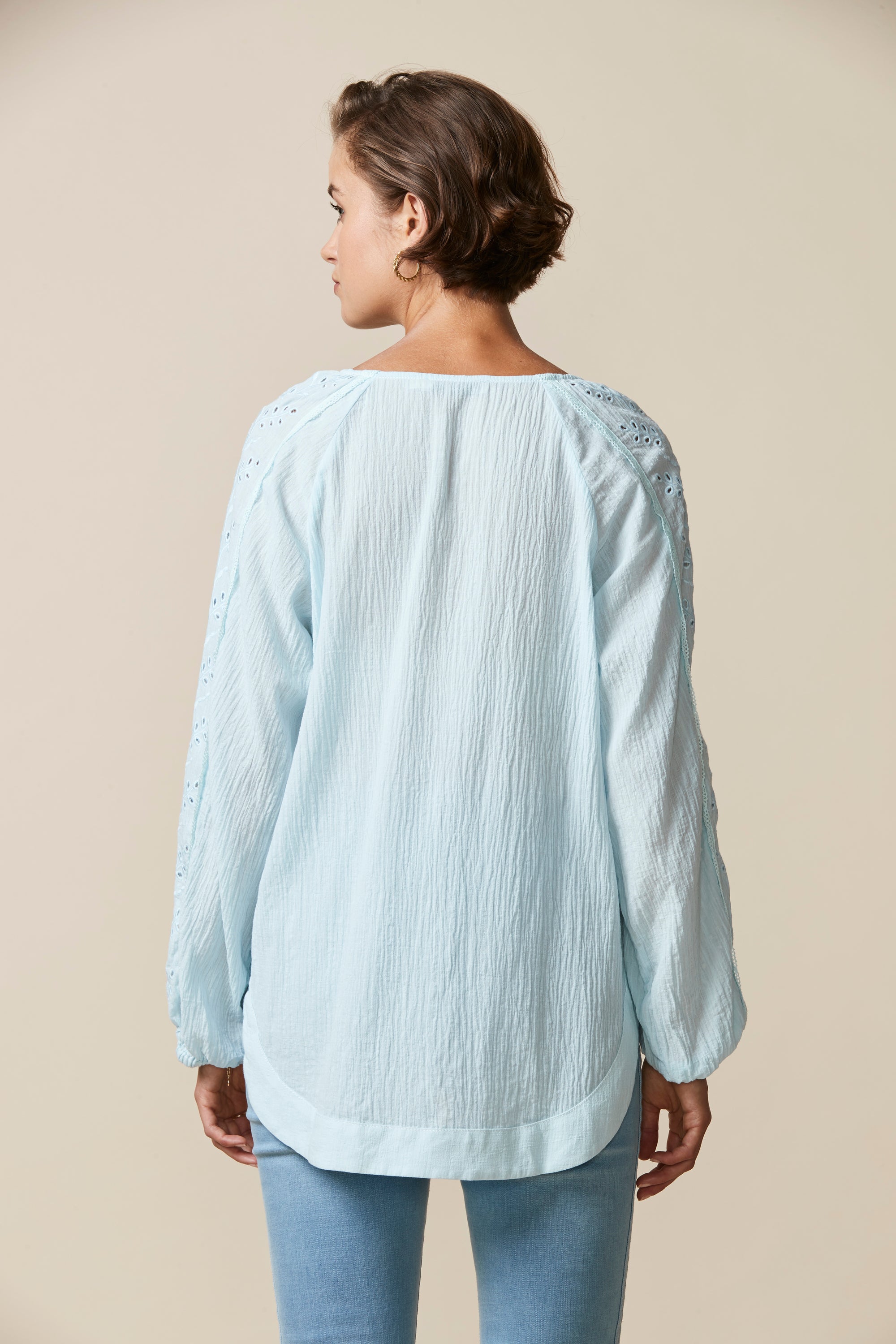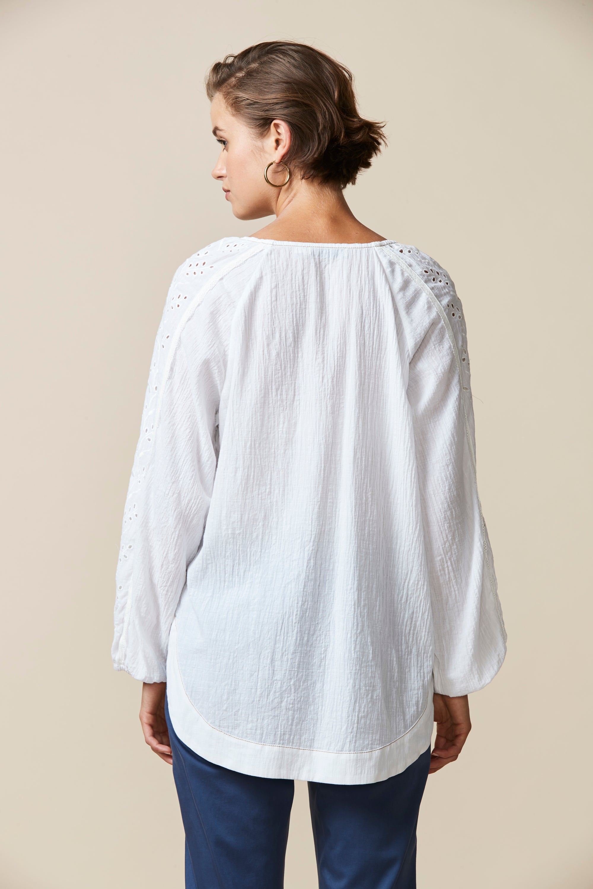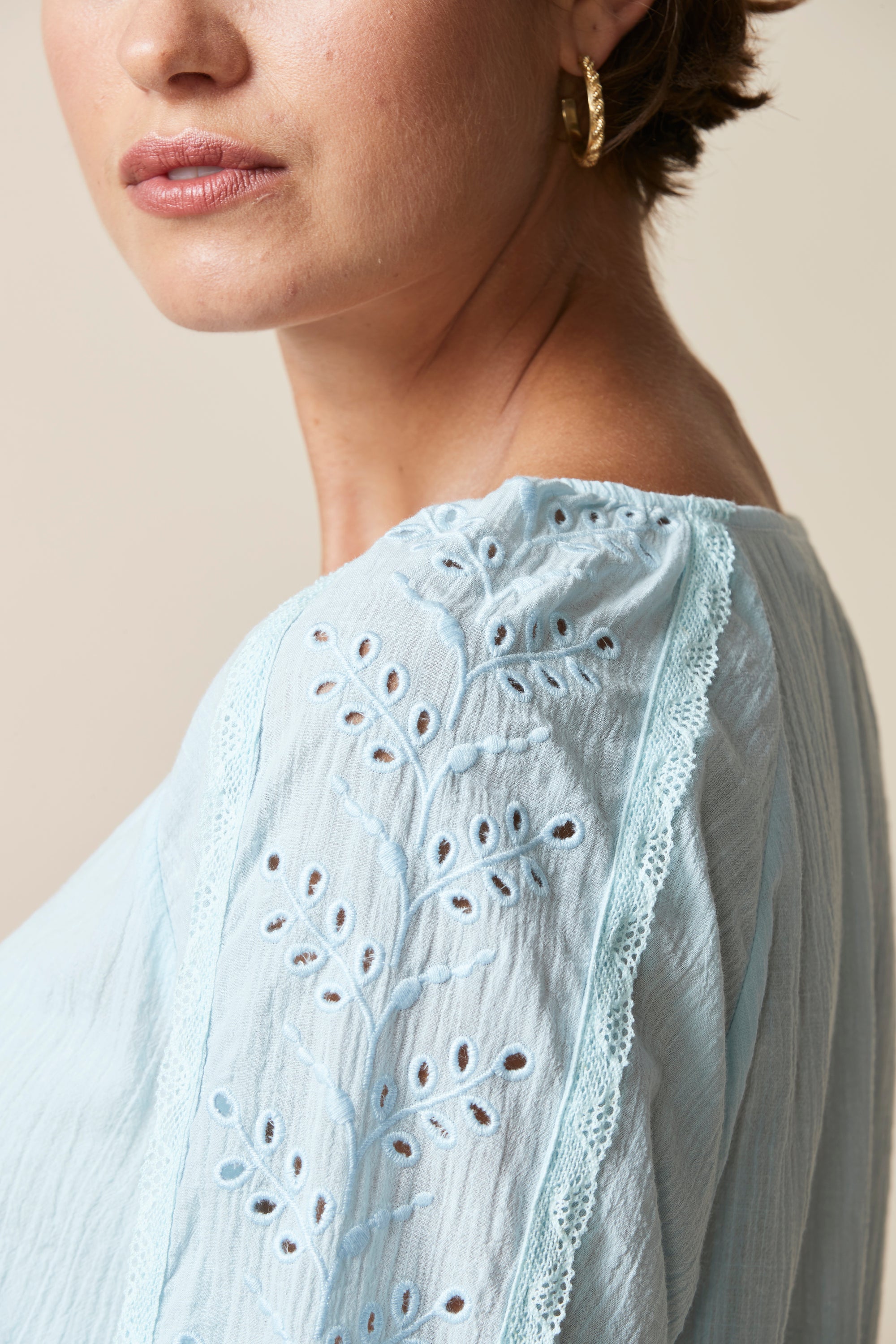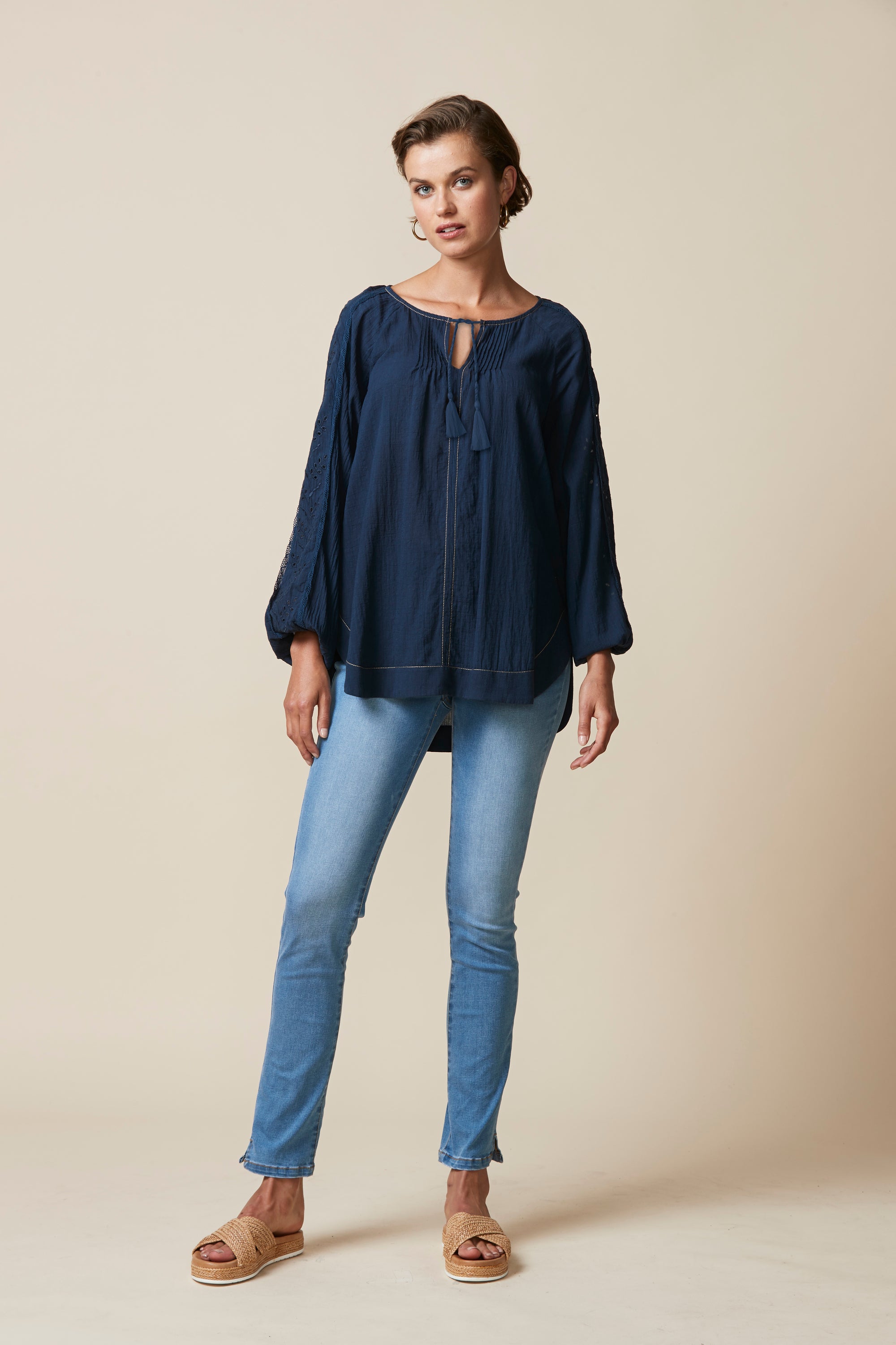 This top is perfect for those spring/summer evenings. The relaxed fit & crinkle cotton fabric ensure comfort whilst the broderie and lace detailing, pintucks and tassels bring an element soft femininity.