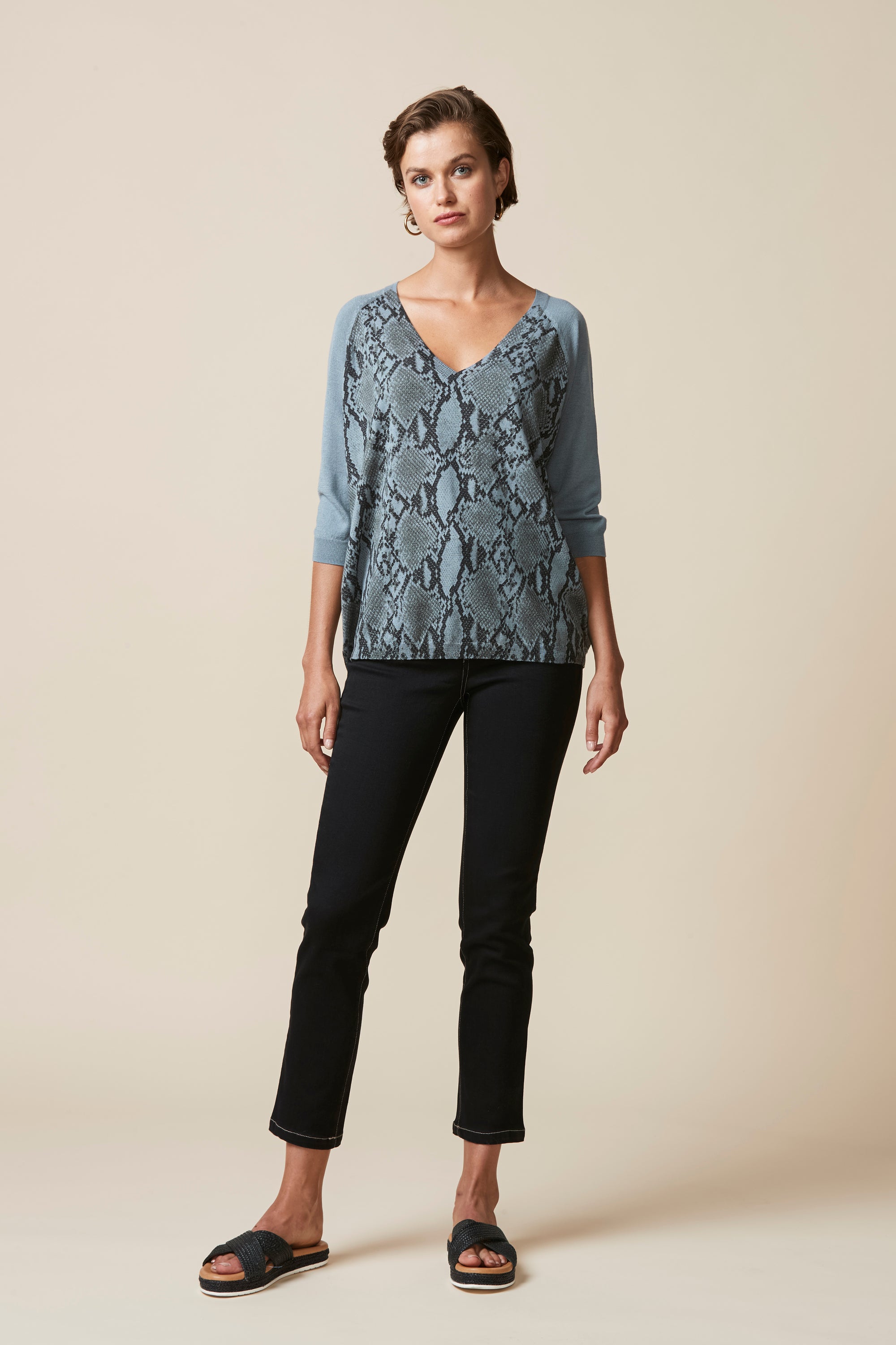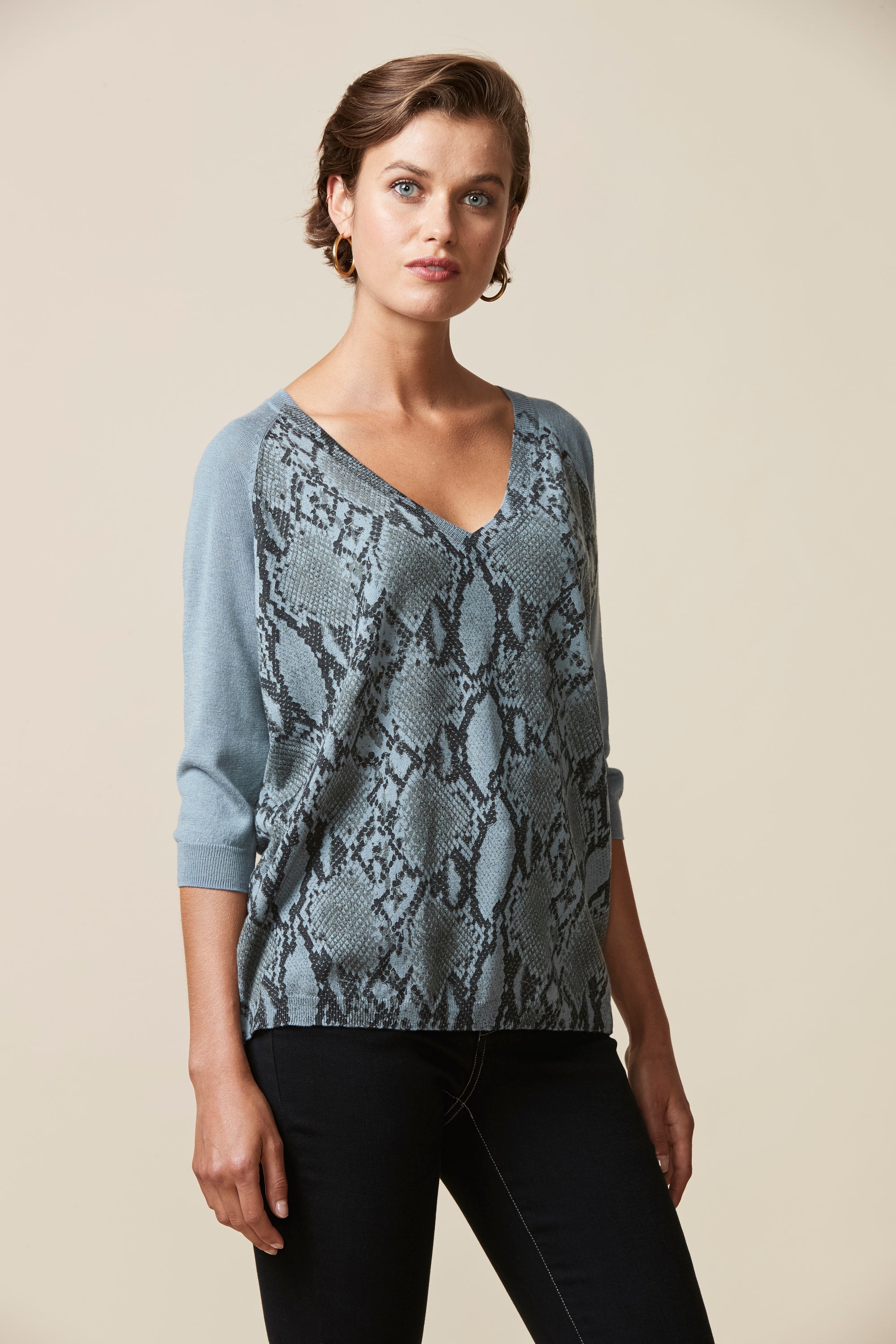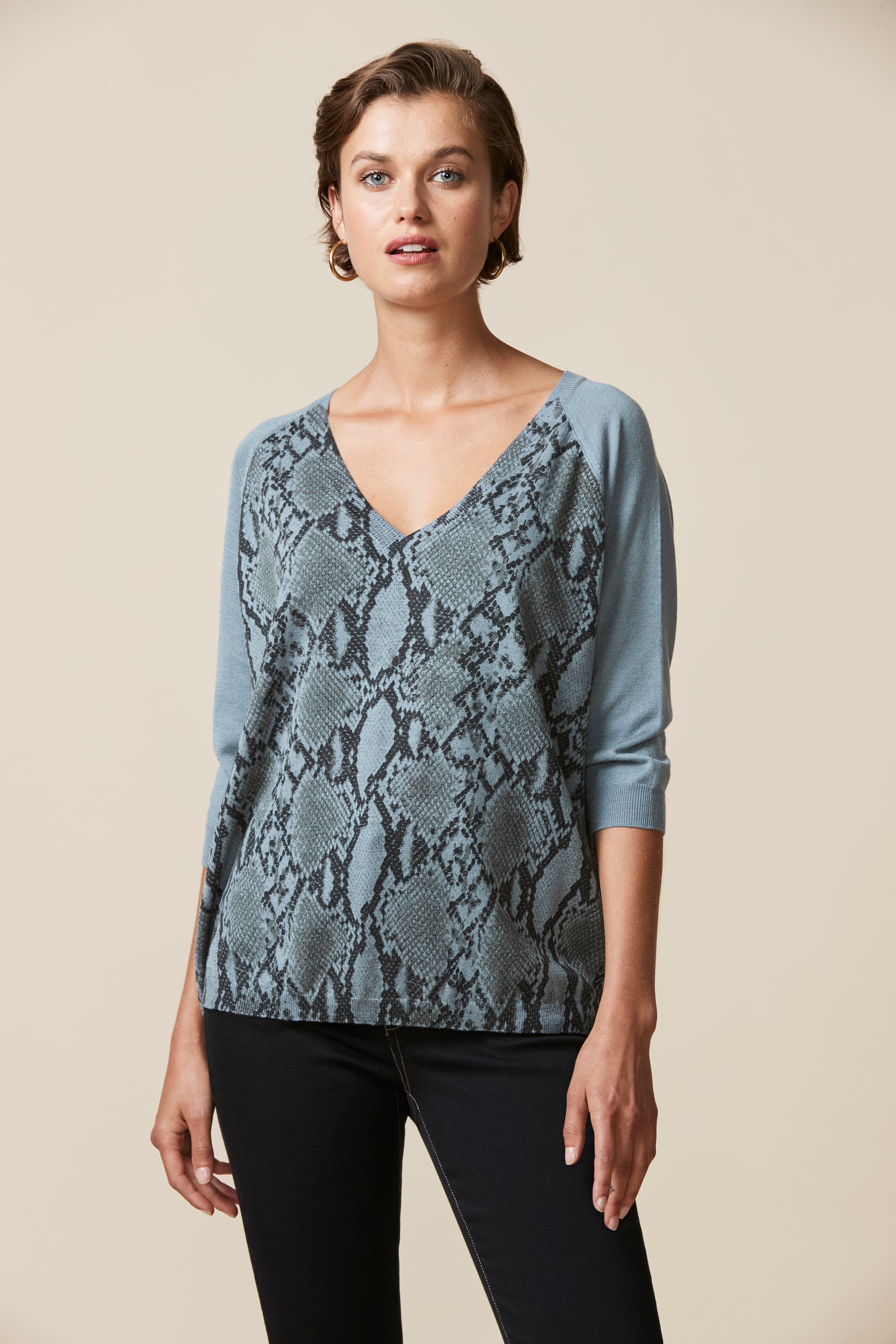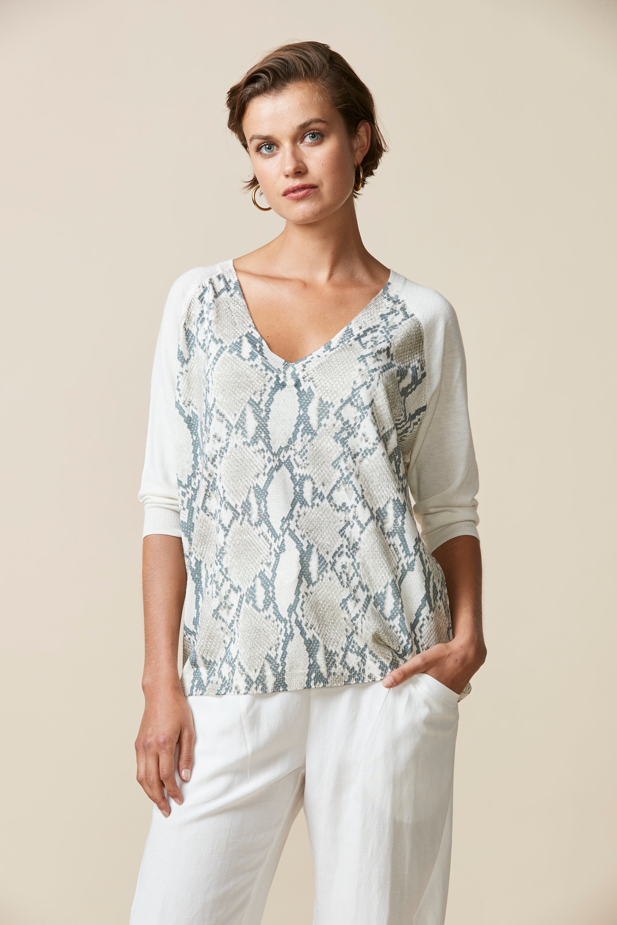 Deep V sweater with relaxed raglan sleeve in a beautifully soft viscose knit, blended with wool, silk & cashmere. The snakeskin print on the front & back body adds a modern touch to this summer staple.