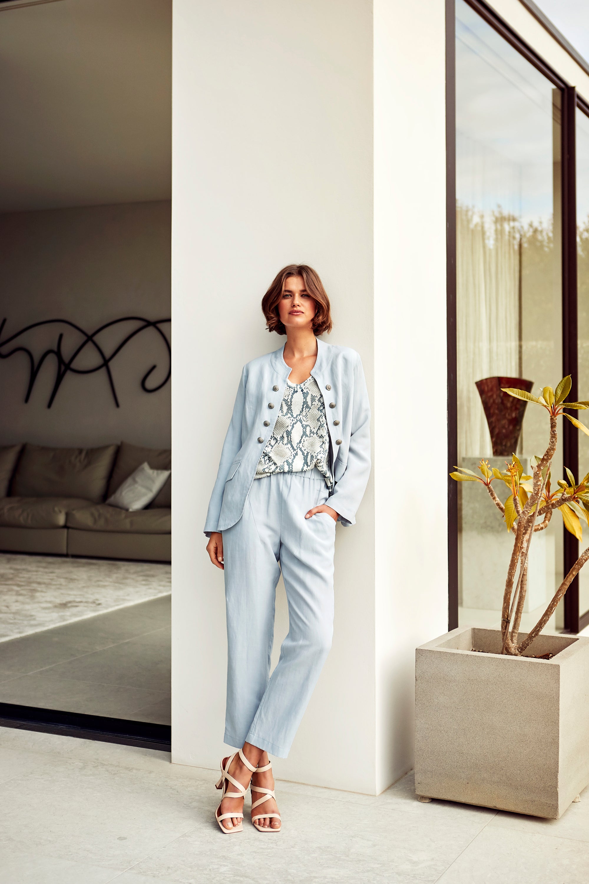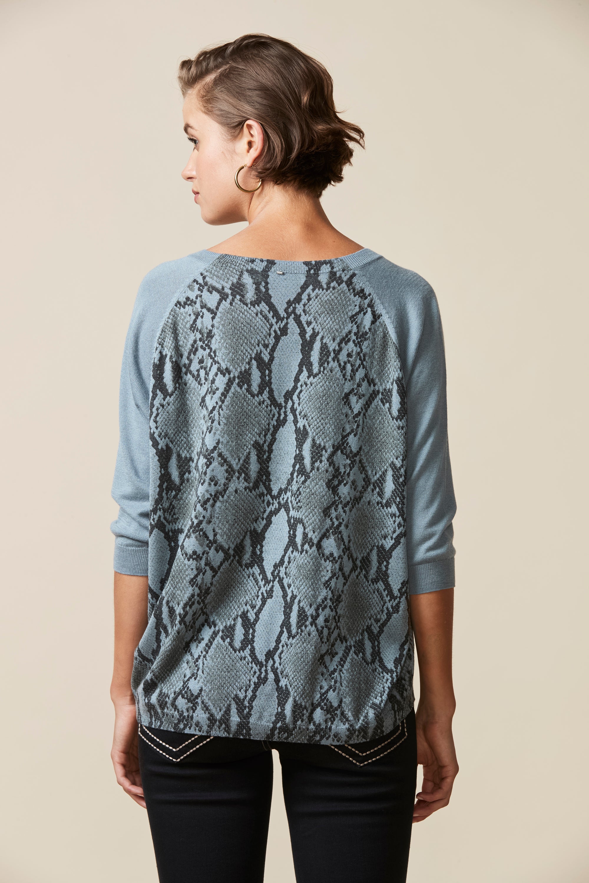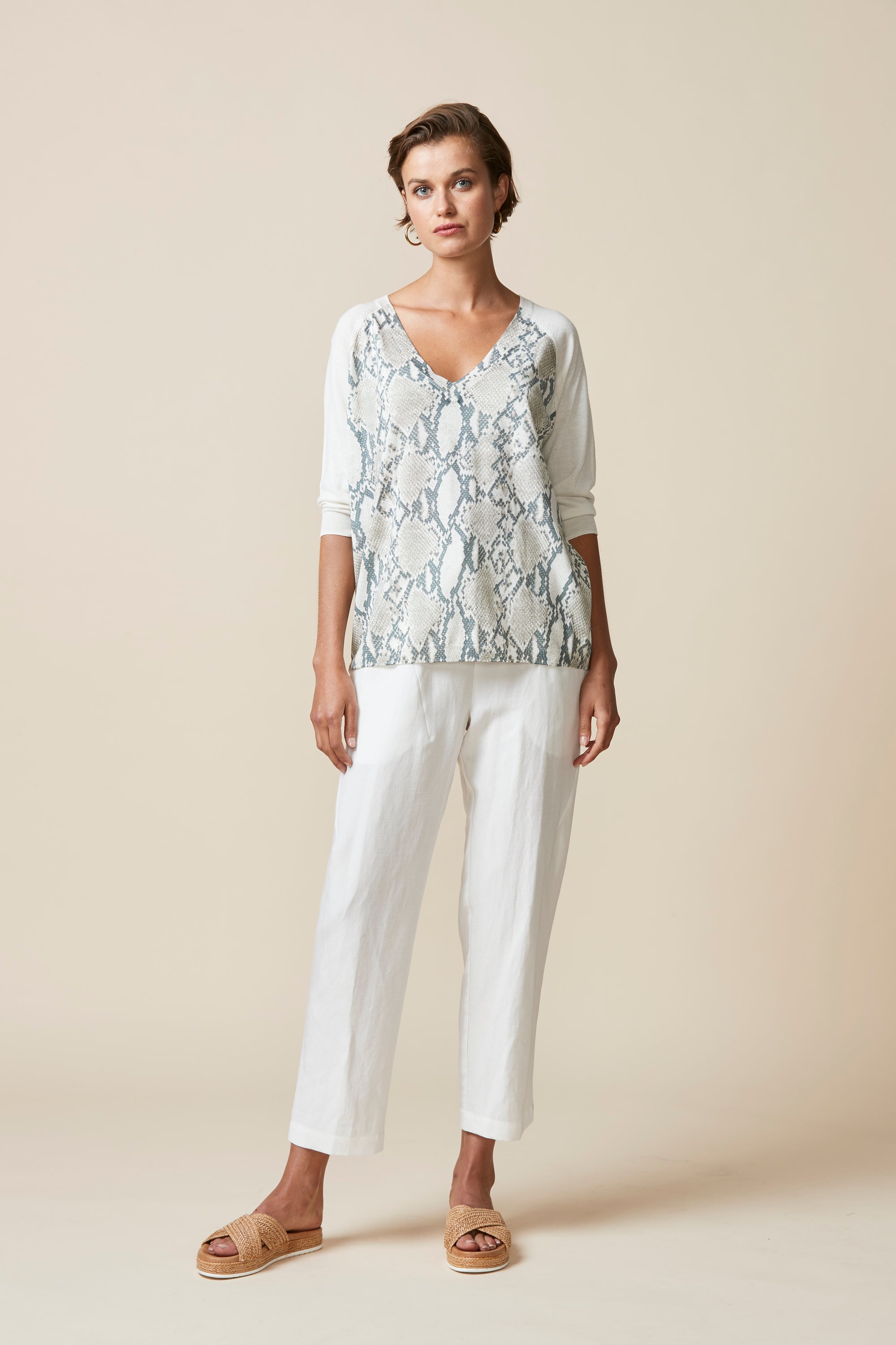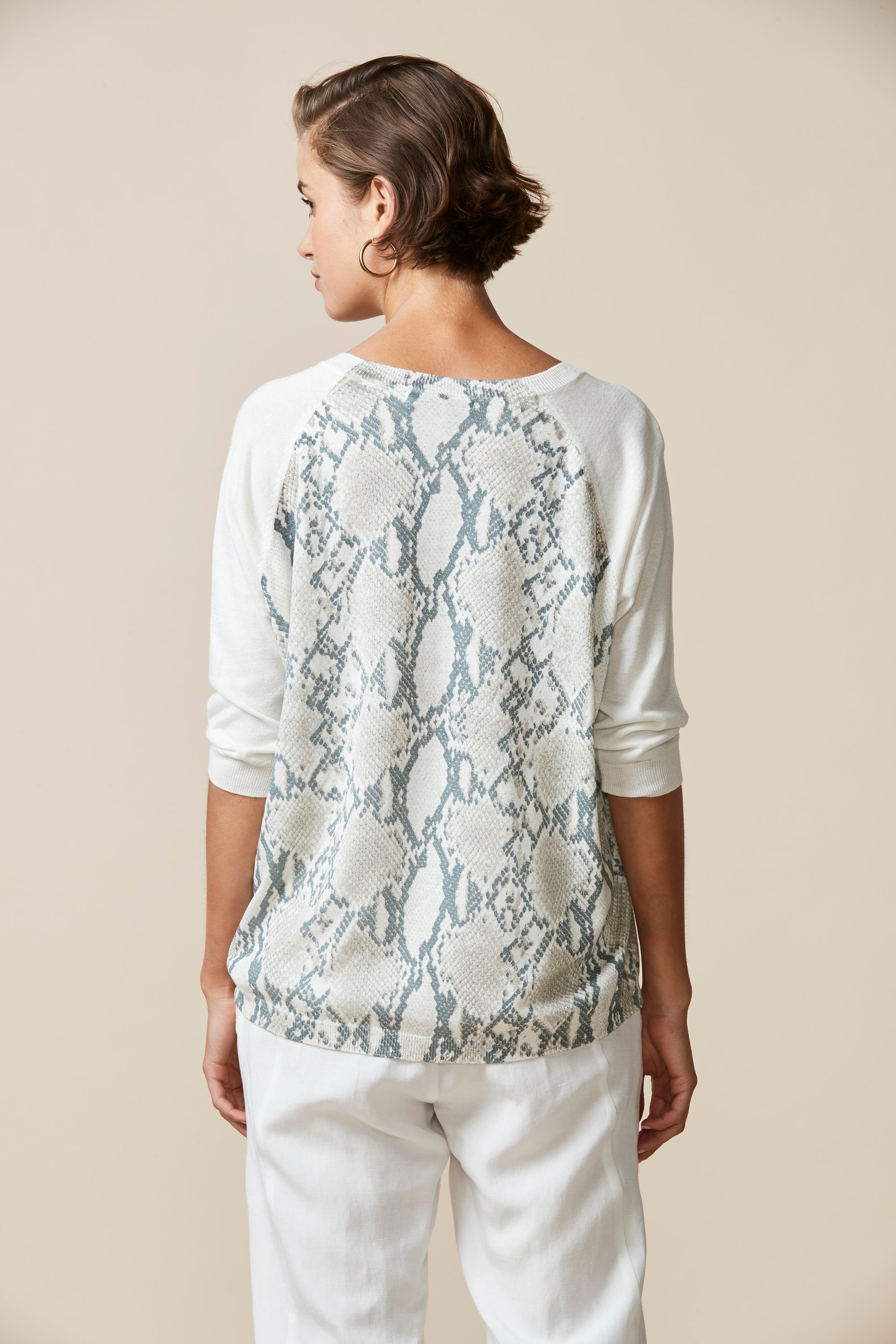 Deep V sweater with relaxed raglan sleeve in a beautifully soft viscose knit, blended with wool, silk & cashmere. The snakeskin print on the front & back body adds a modern touch to this summer staple.