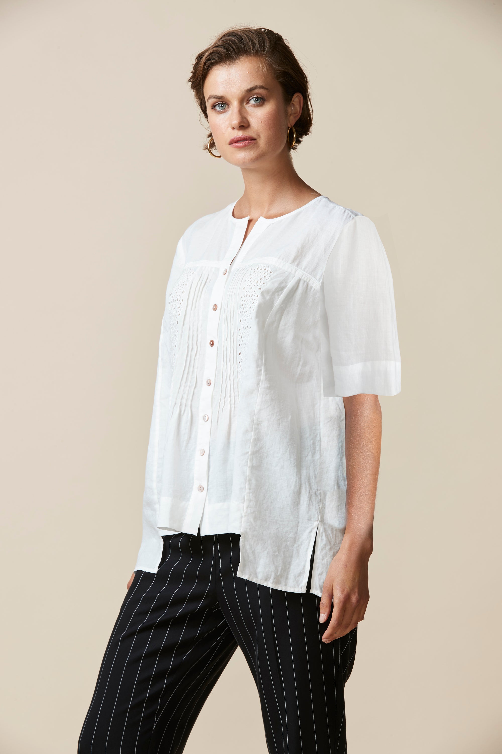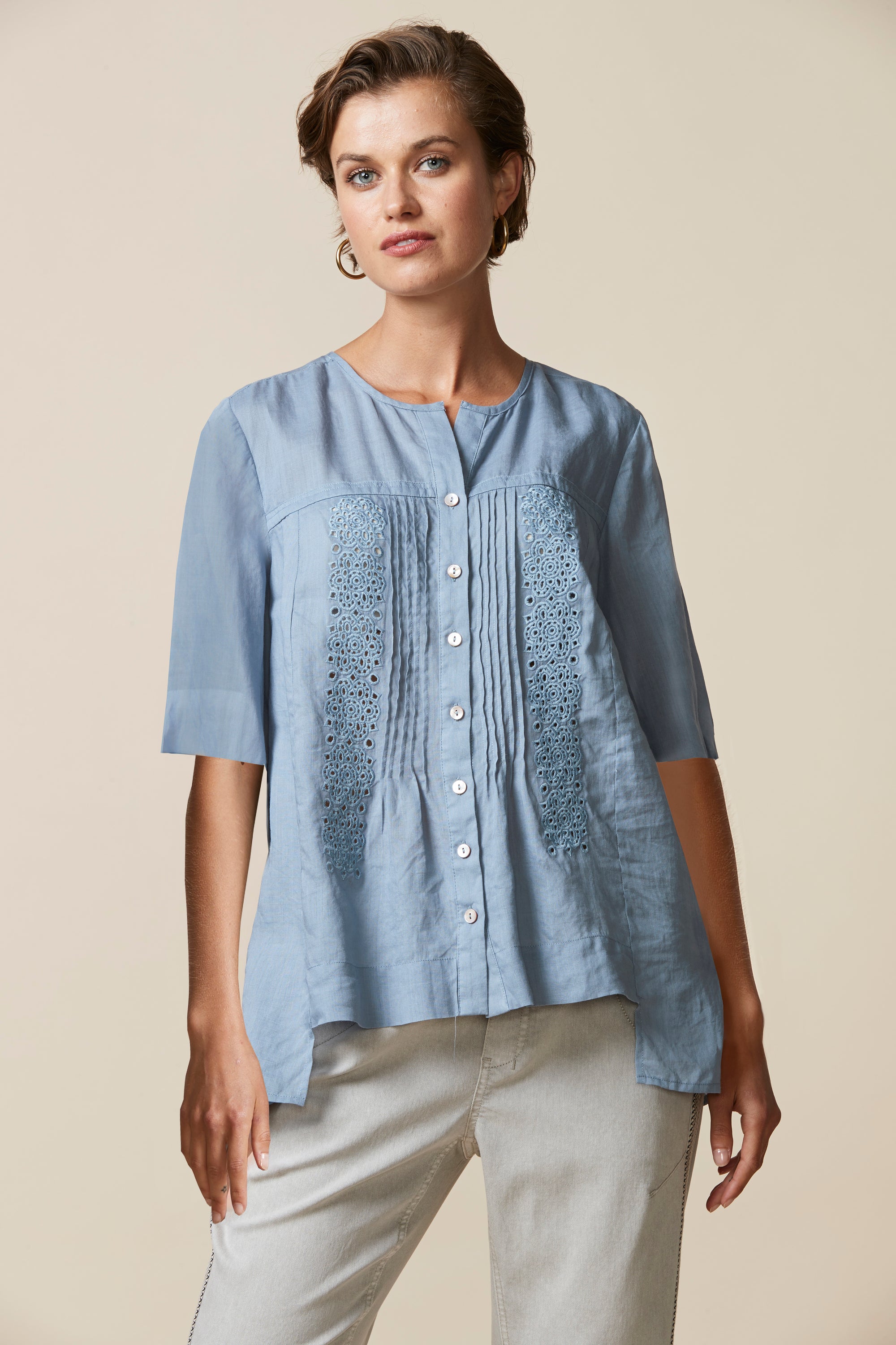 This lightweight linen shirt can be effortlessly styled with everything. The broderie and pintuck detailing and pearl buttons will add a beautifully feminine touch to any outfit.