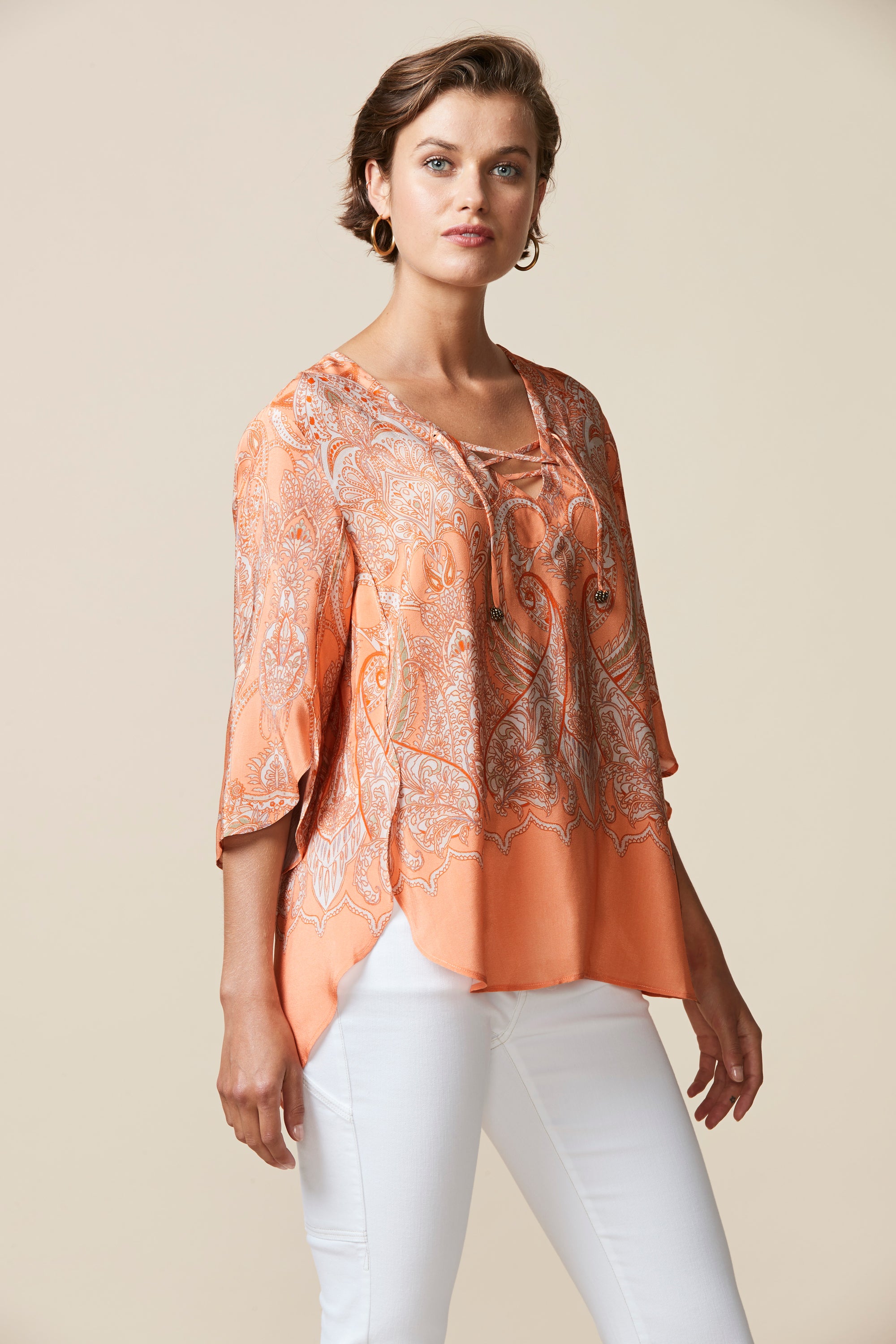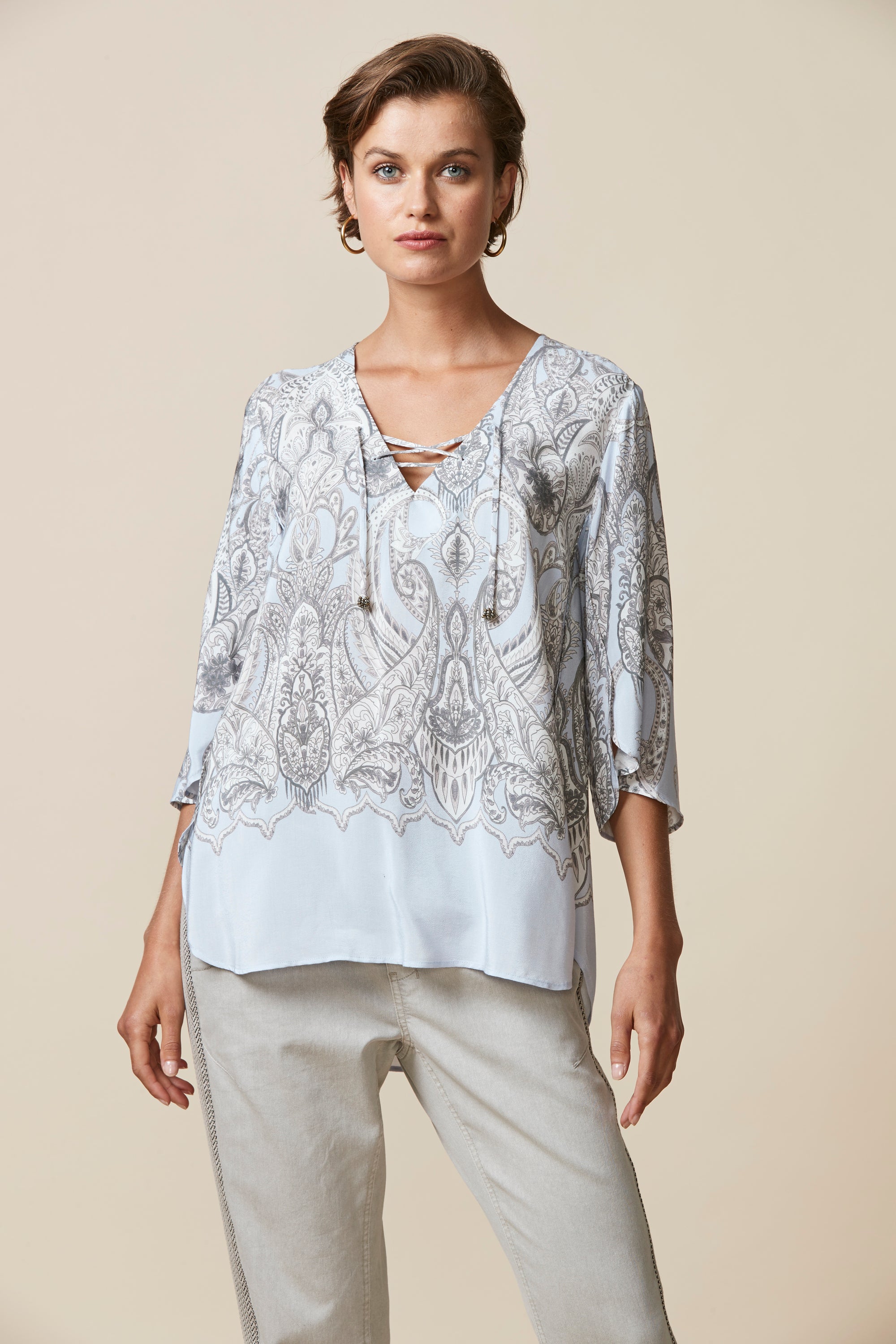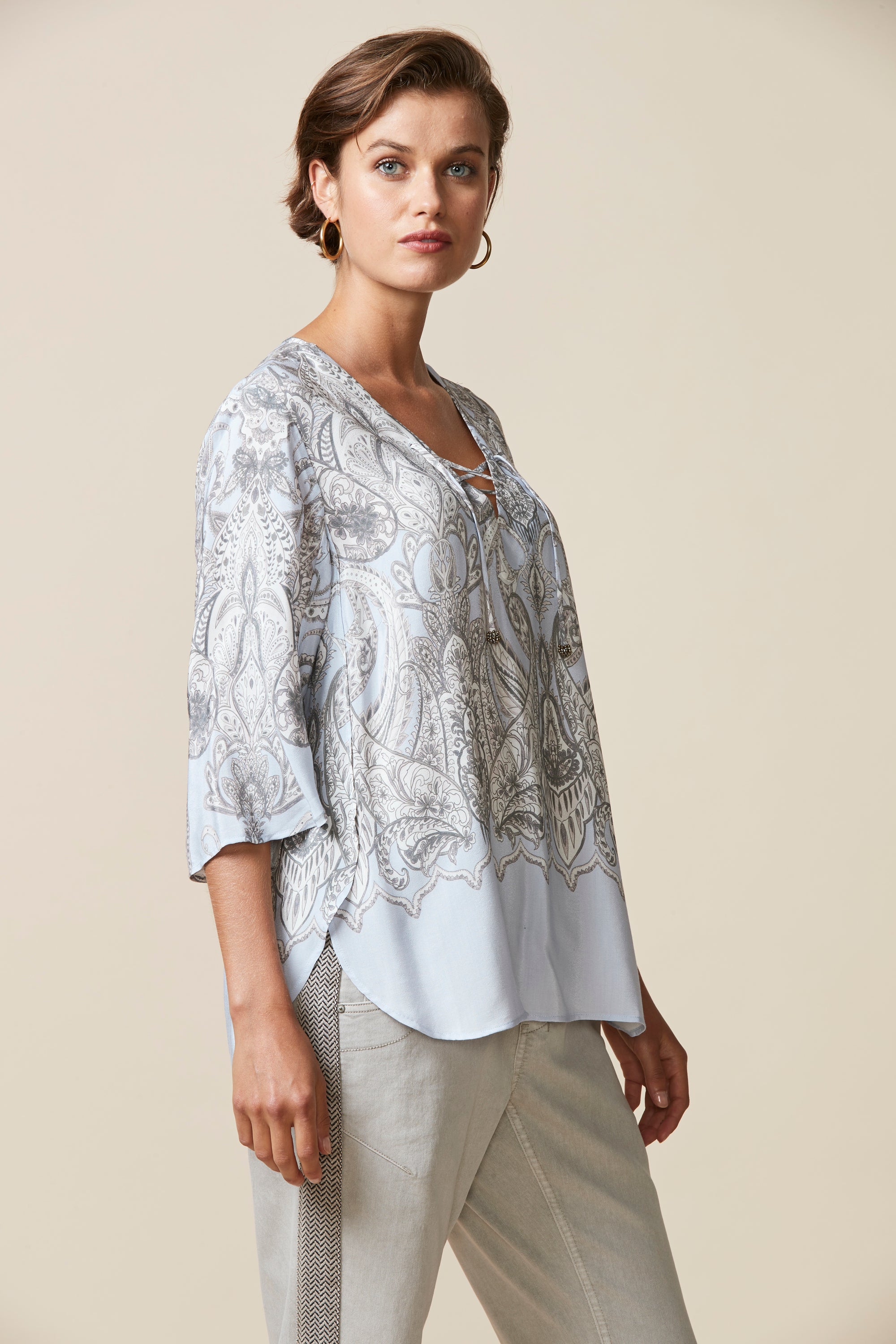 Soft paisley printed top with border at hem. Curved hemline overlaps at side body to create a petal-like effect. Lace-up neckline with beaded tie ends add a bohemian feel to this sophisticated style.