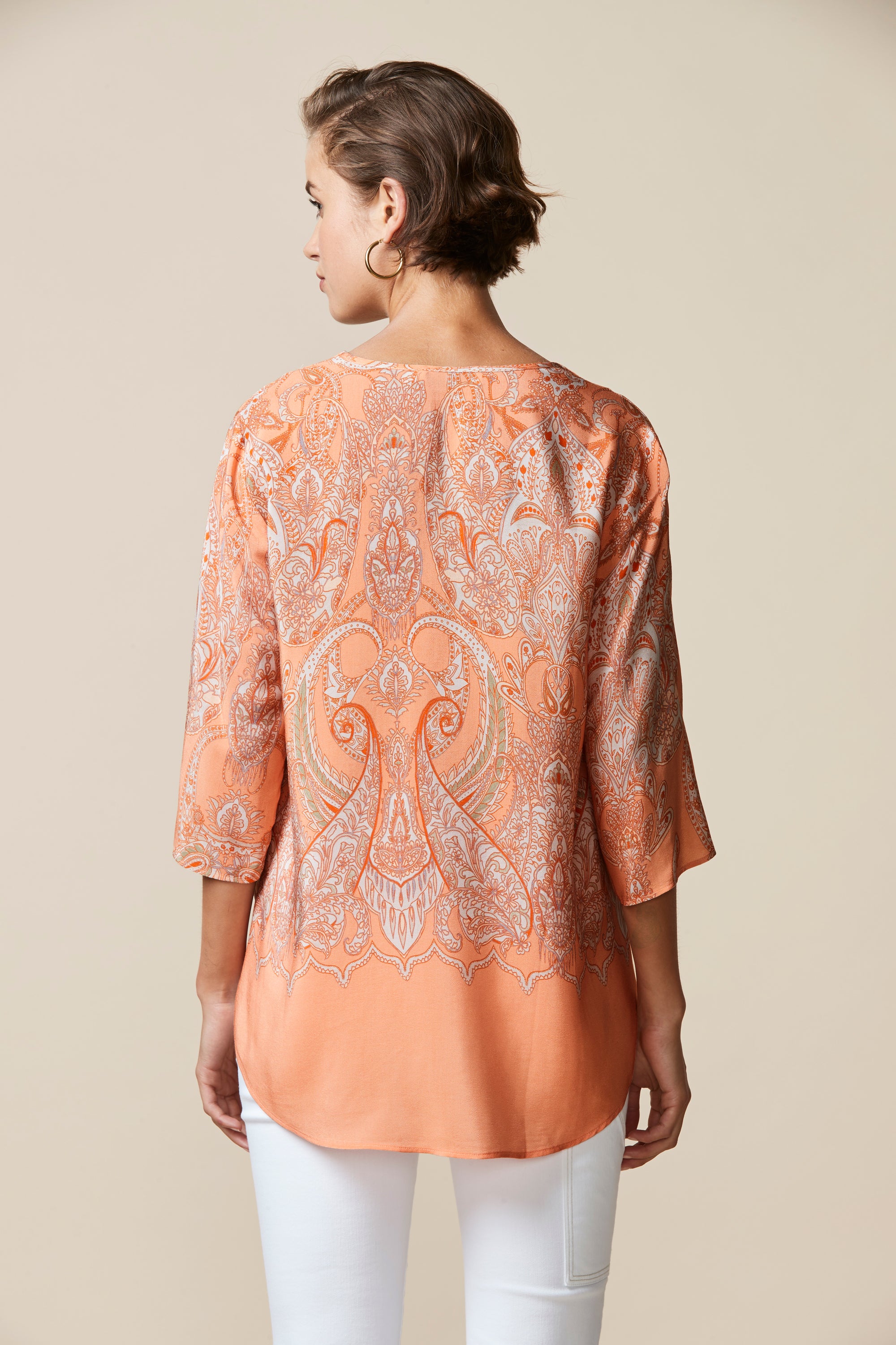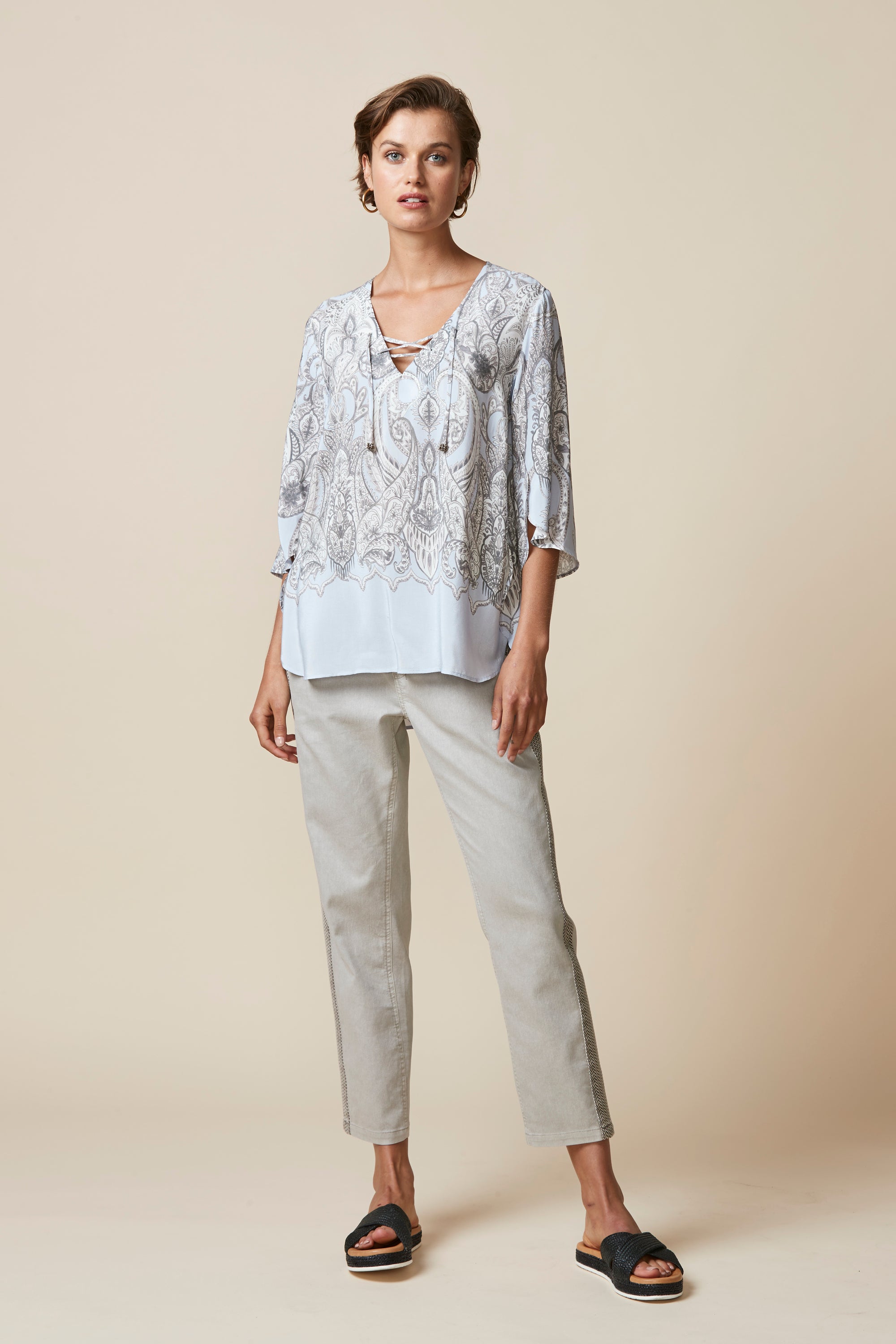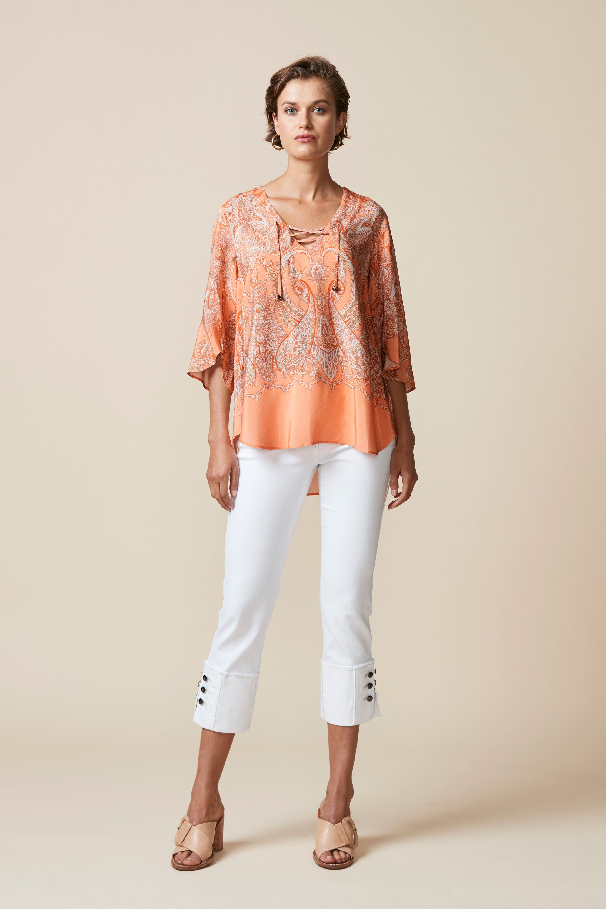 Soft paisley printed top with border at hem. Curved hemline overlaps at side body to create a petal-like effect. Lace-up neckline with beaded tie ends add a bohemian feel to this sophisticated style.