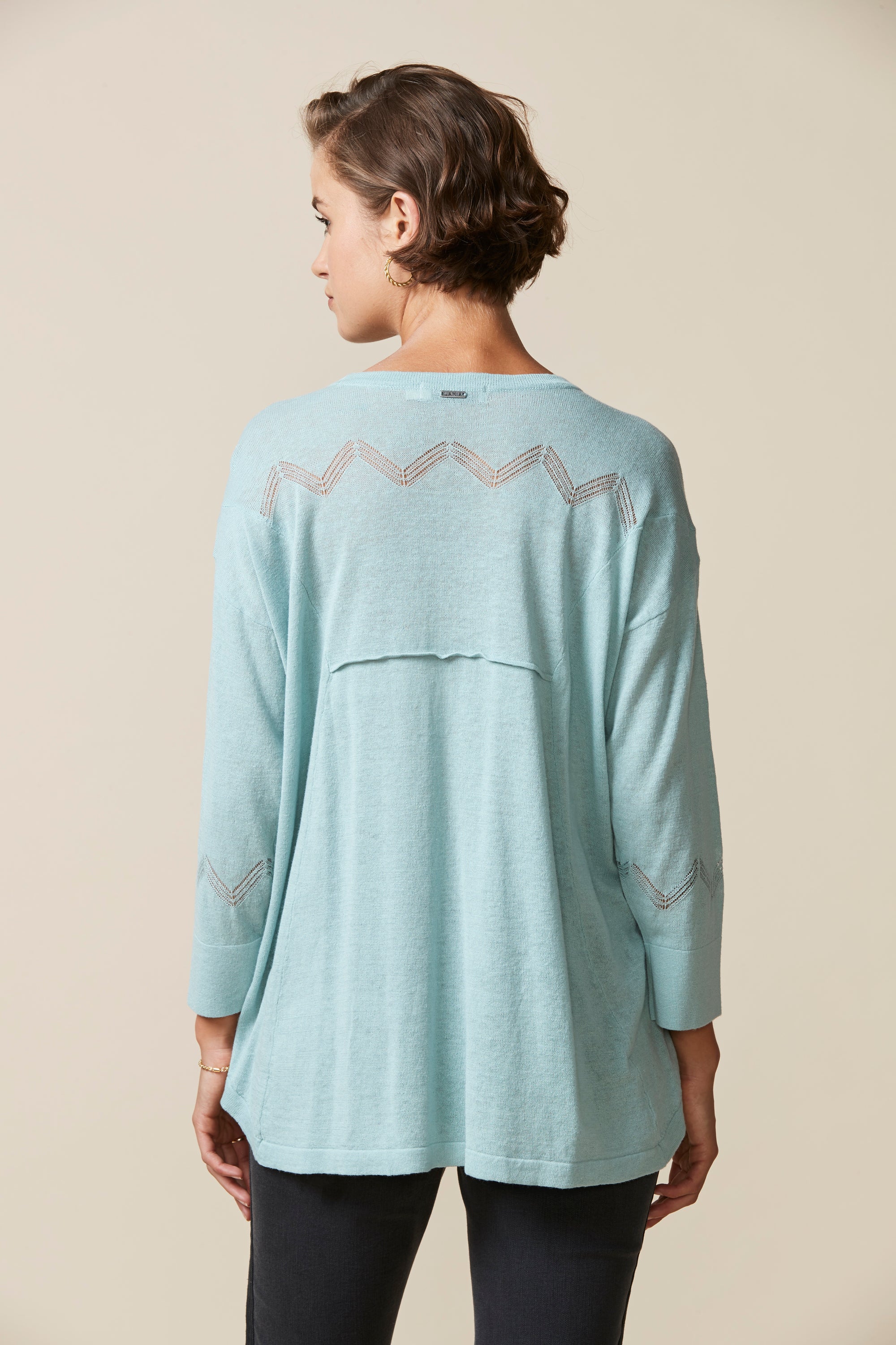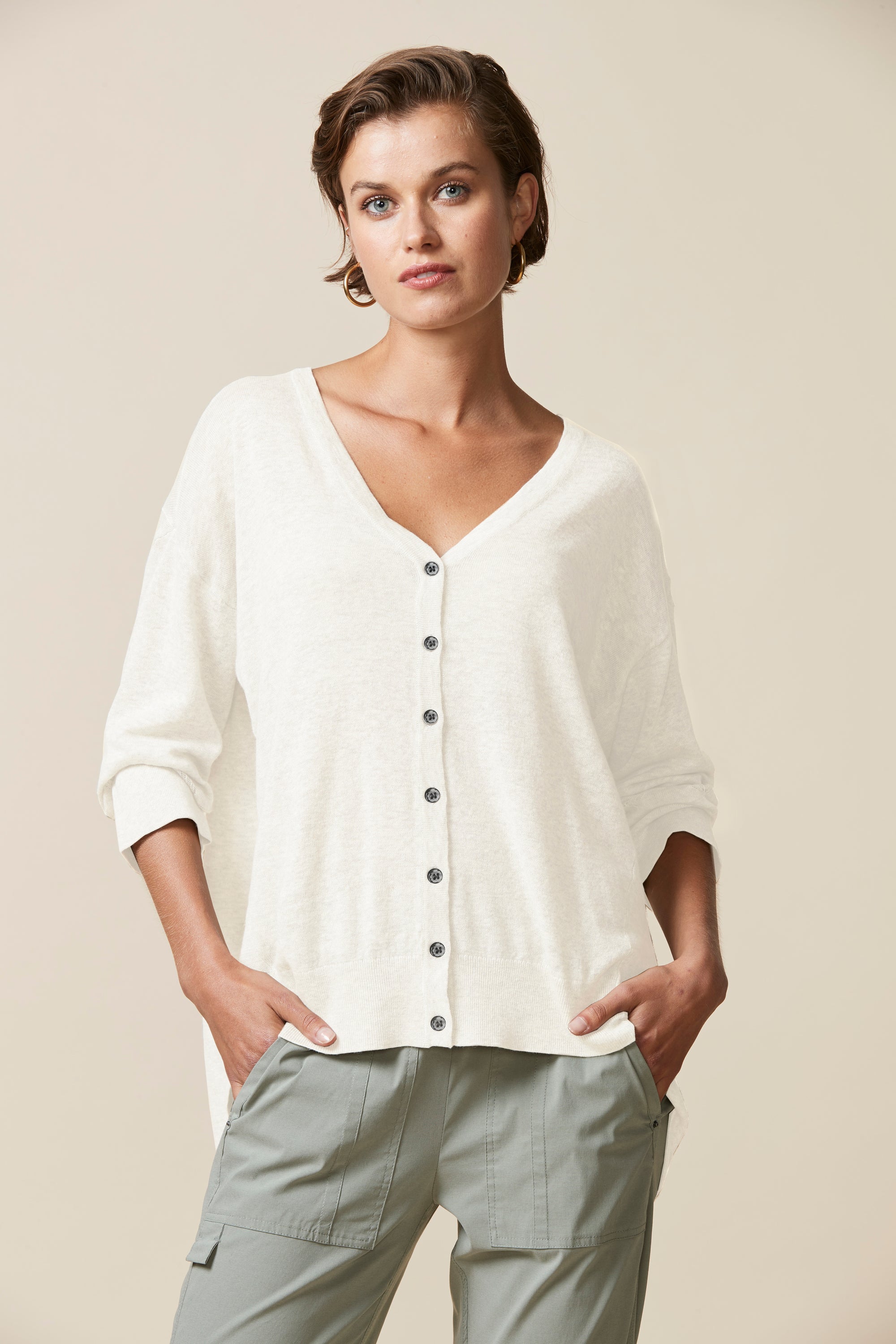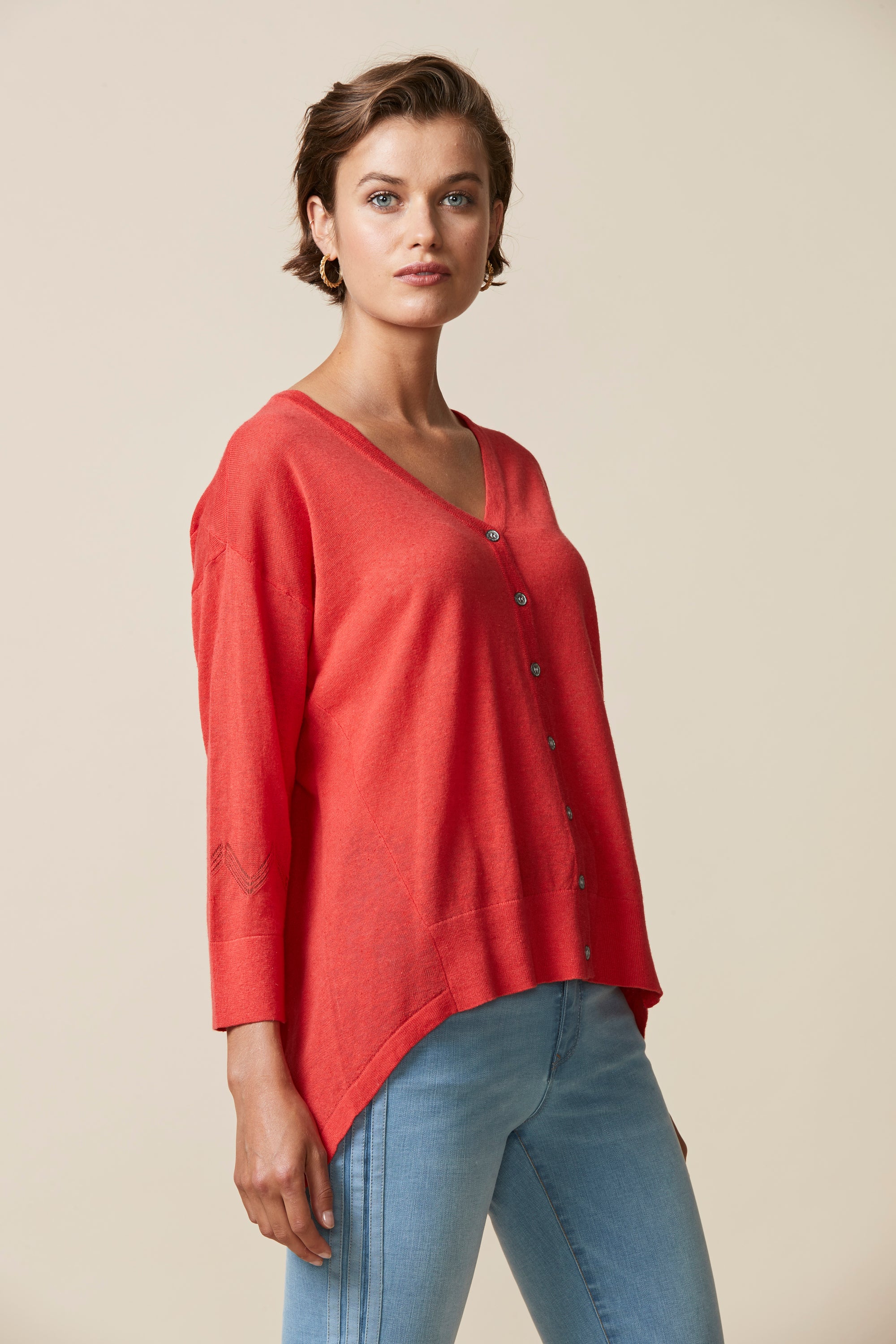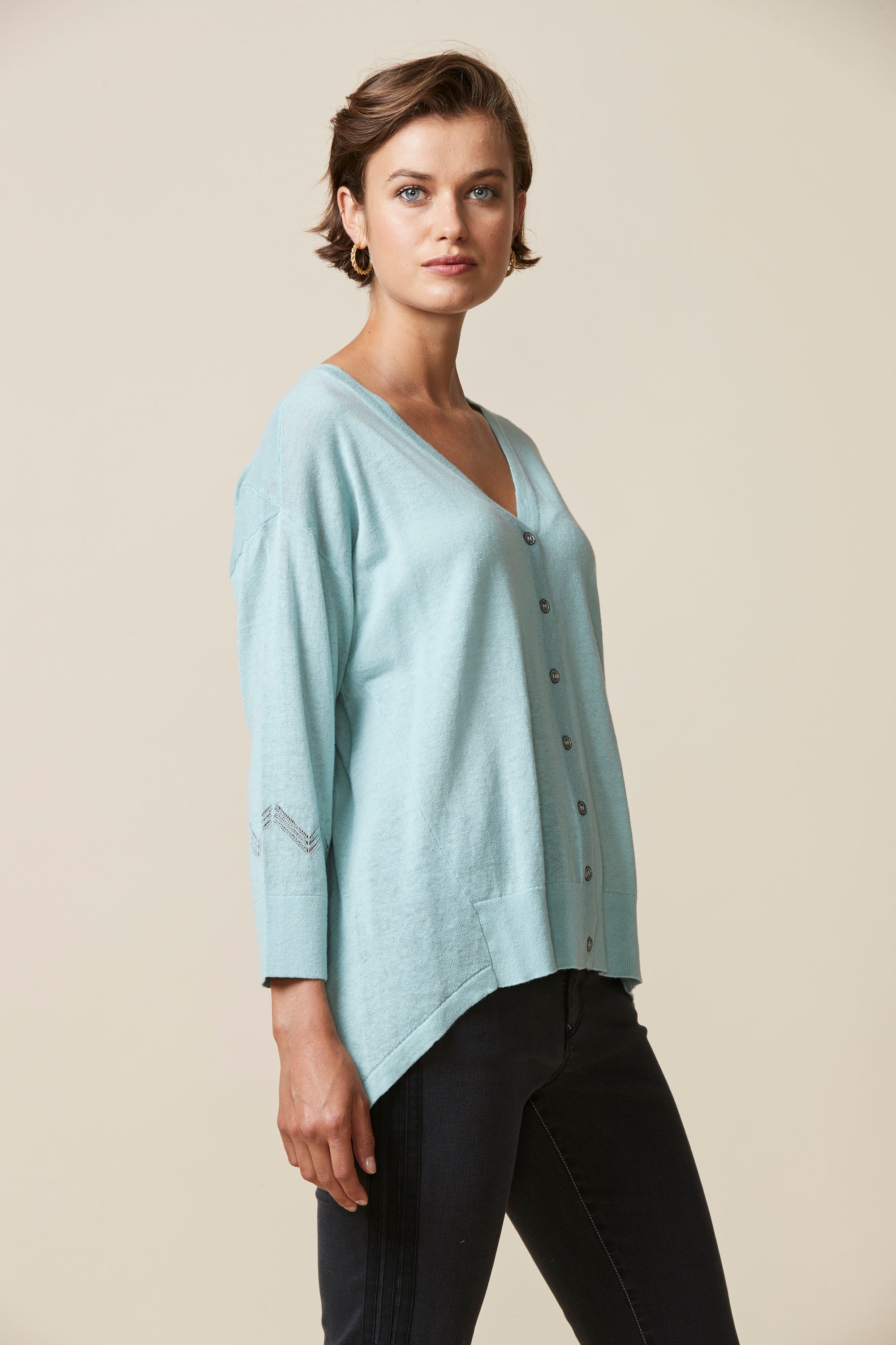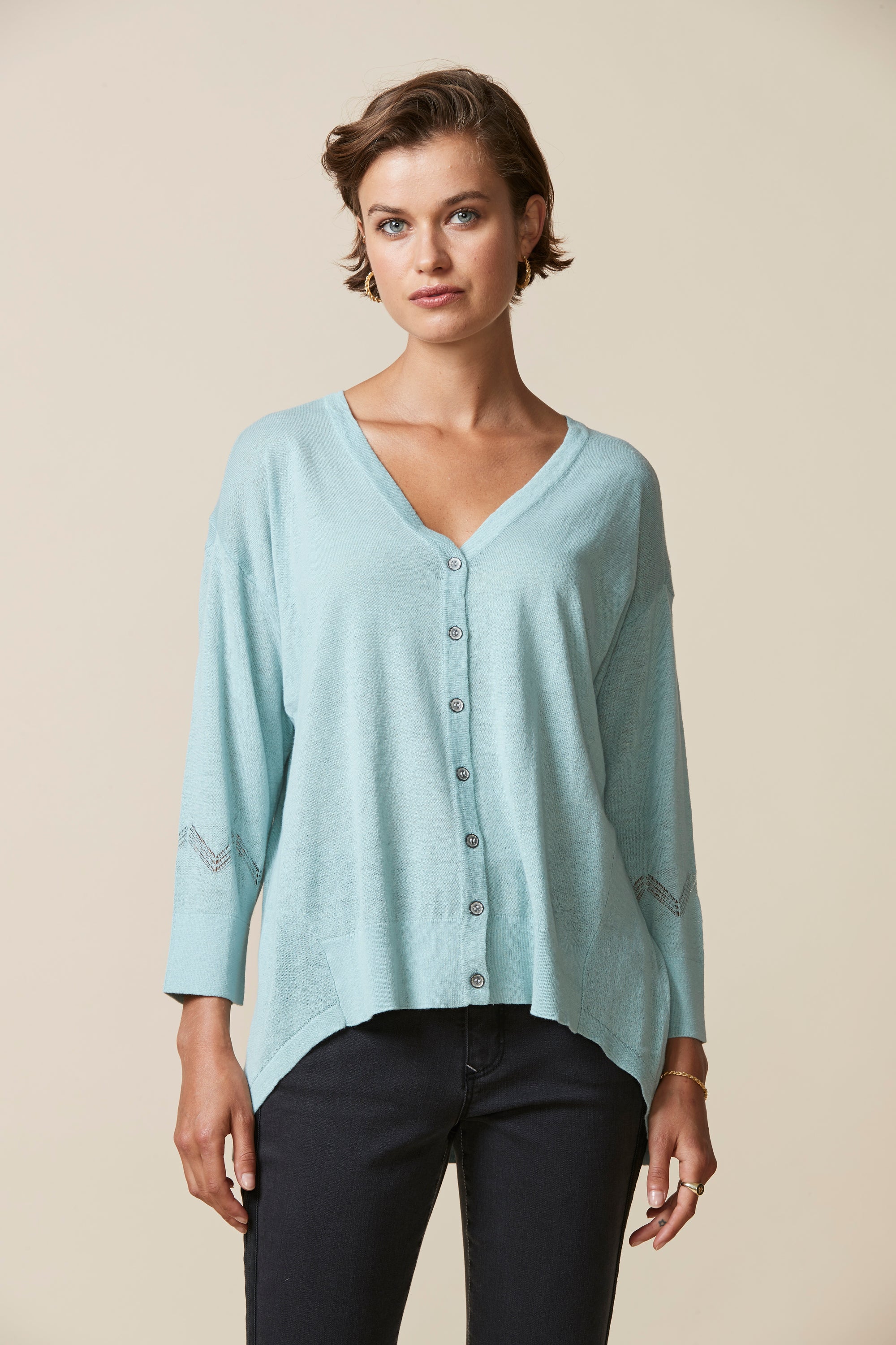 Soft and drapey linen cotton blend knit cardigan with intricate chevron open knit design and dyed to match hammered metal buttons.