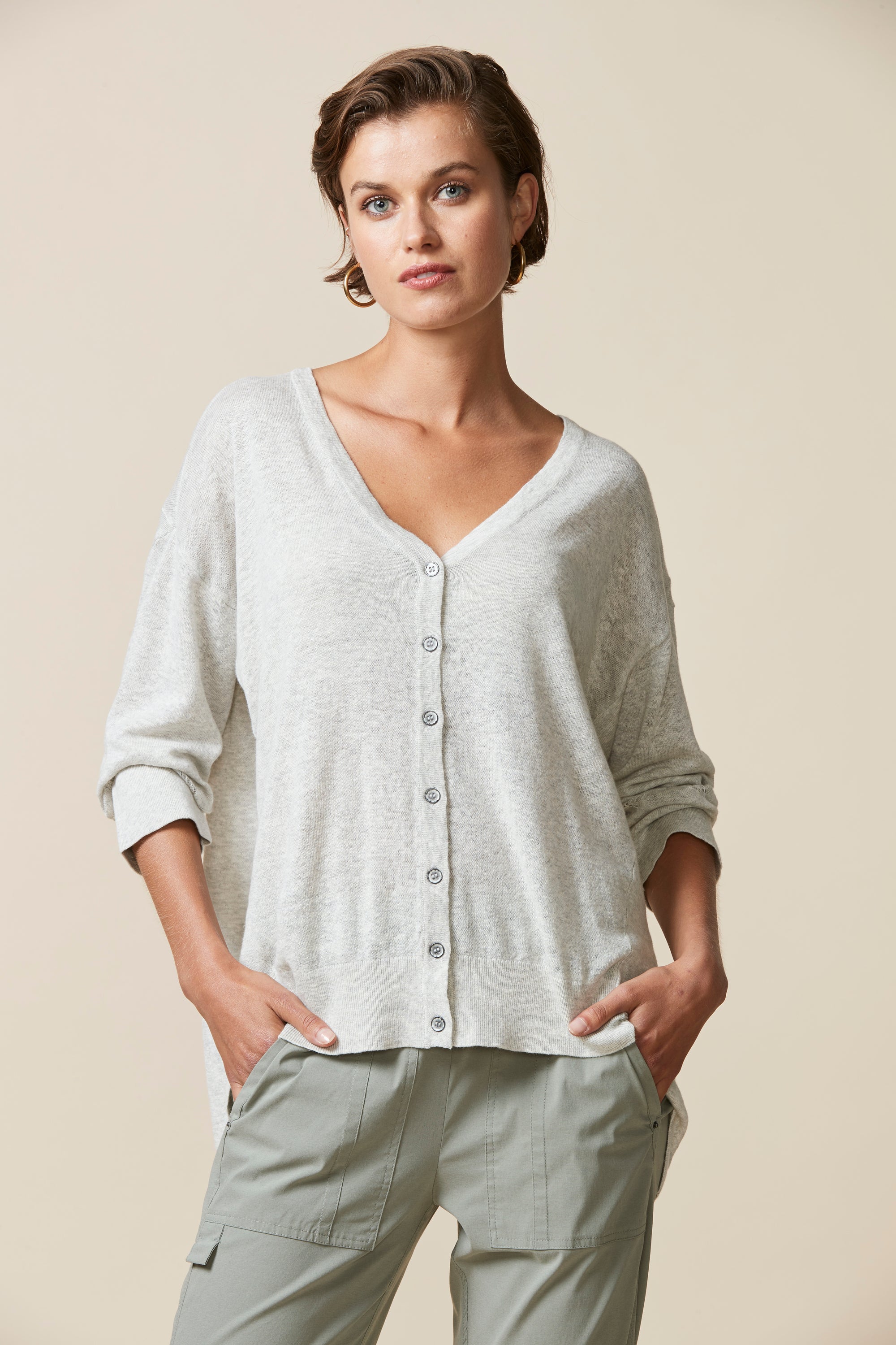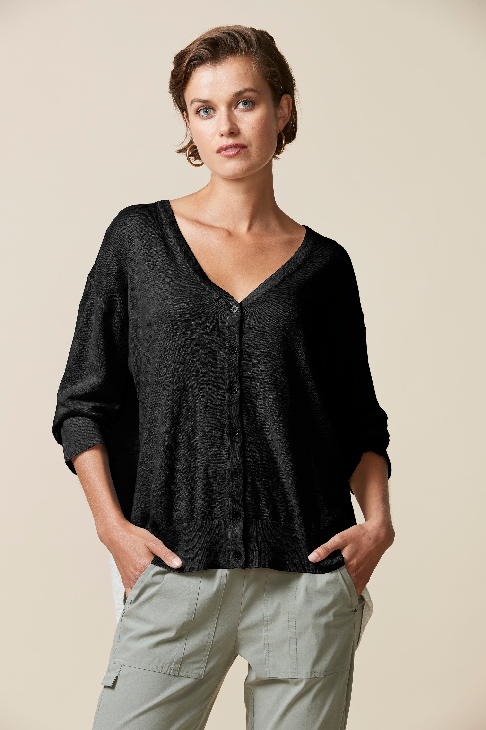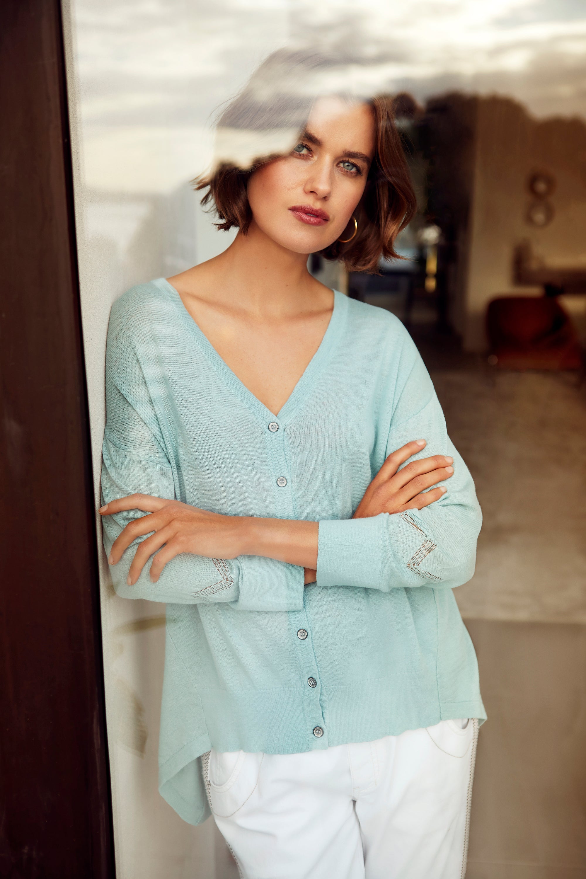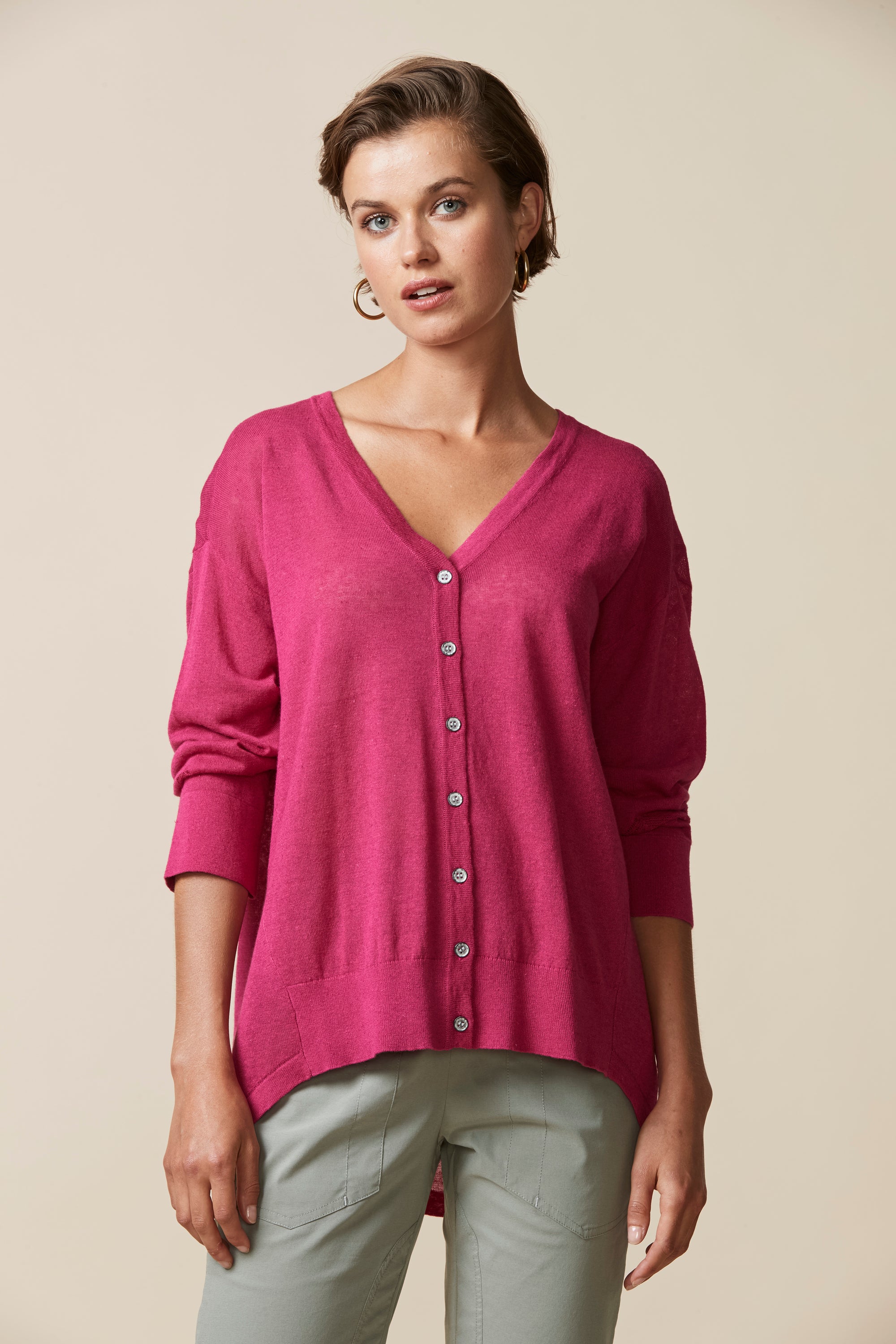 Soft and drapey linen cotton blend knit cardigan with intricate chevron open knit design and dyed to match hammered metal buttons.