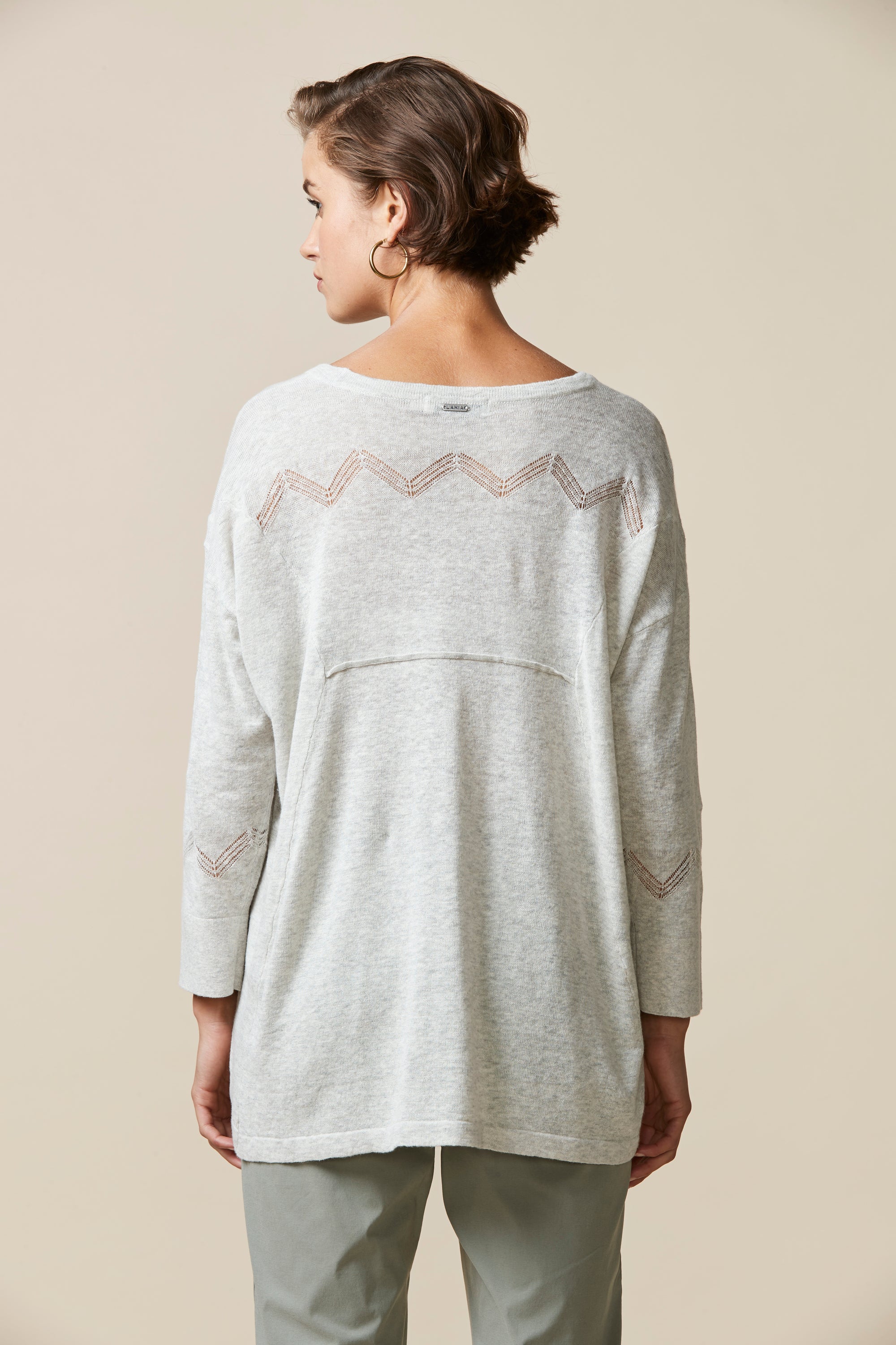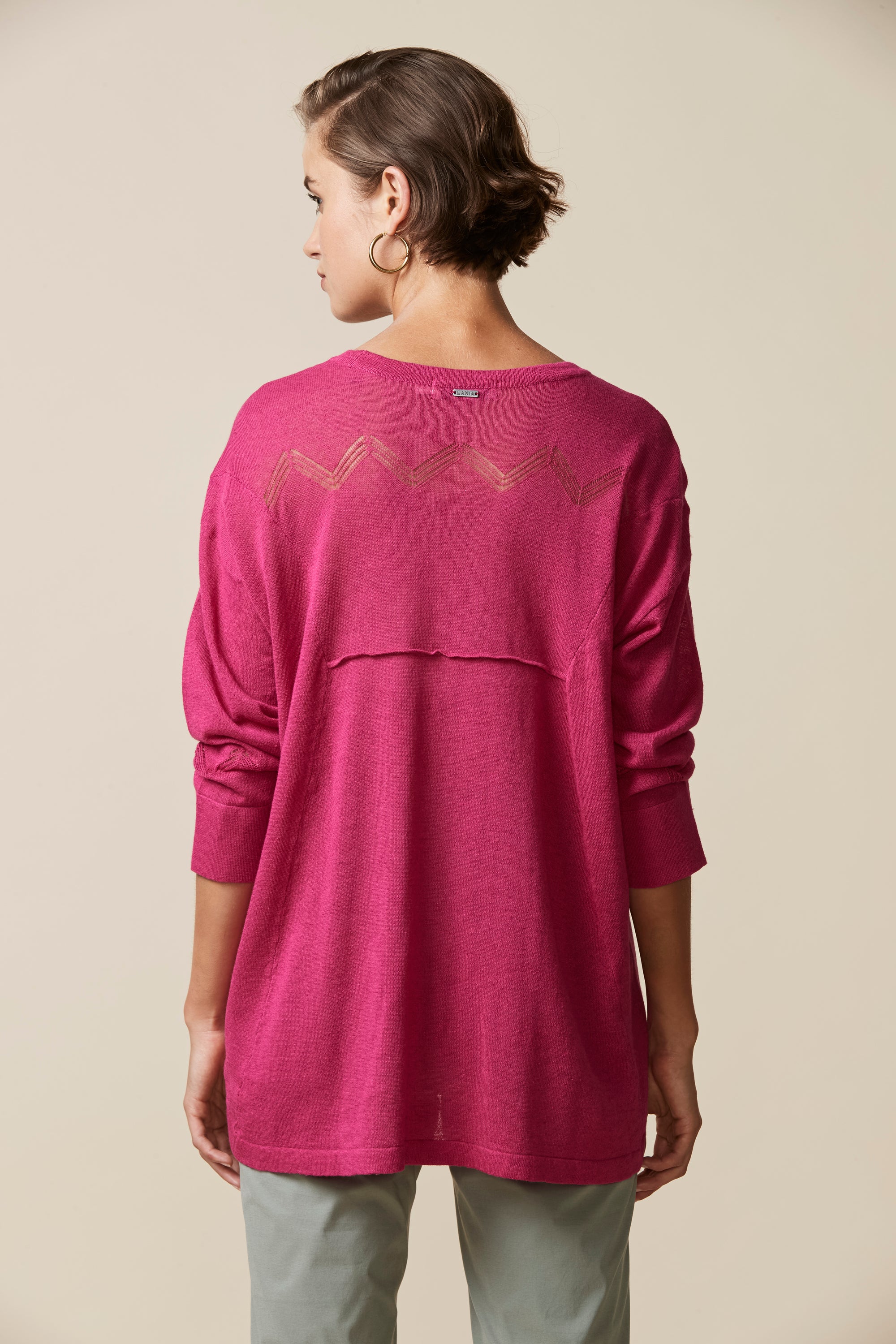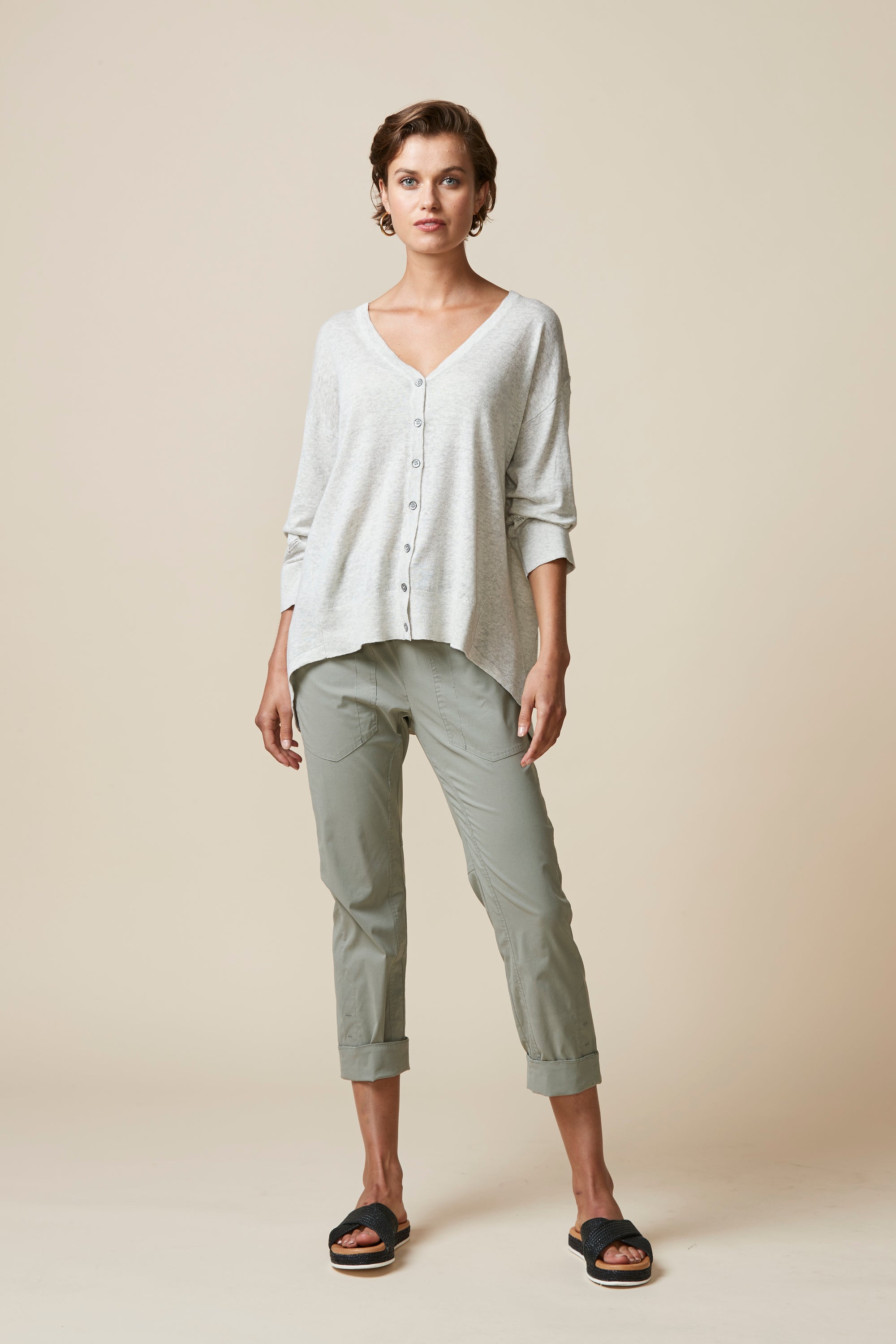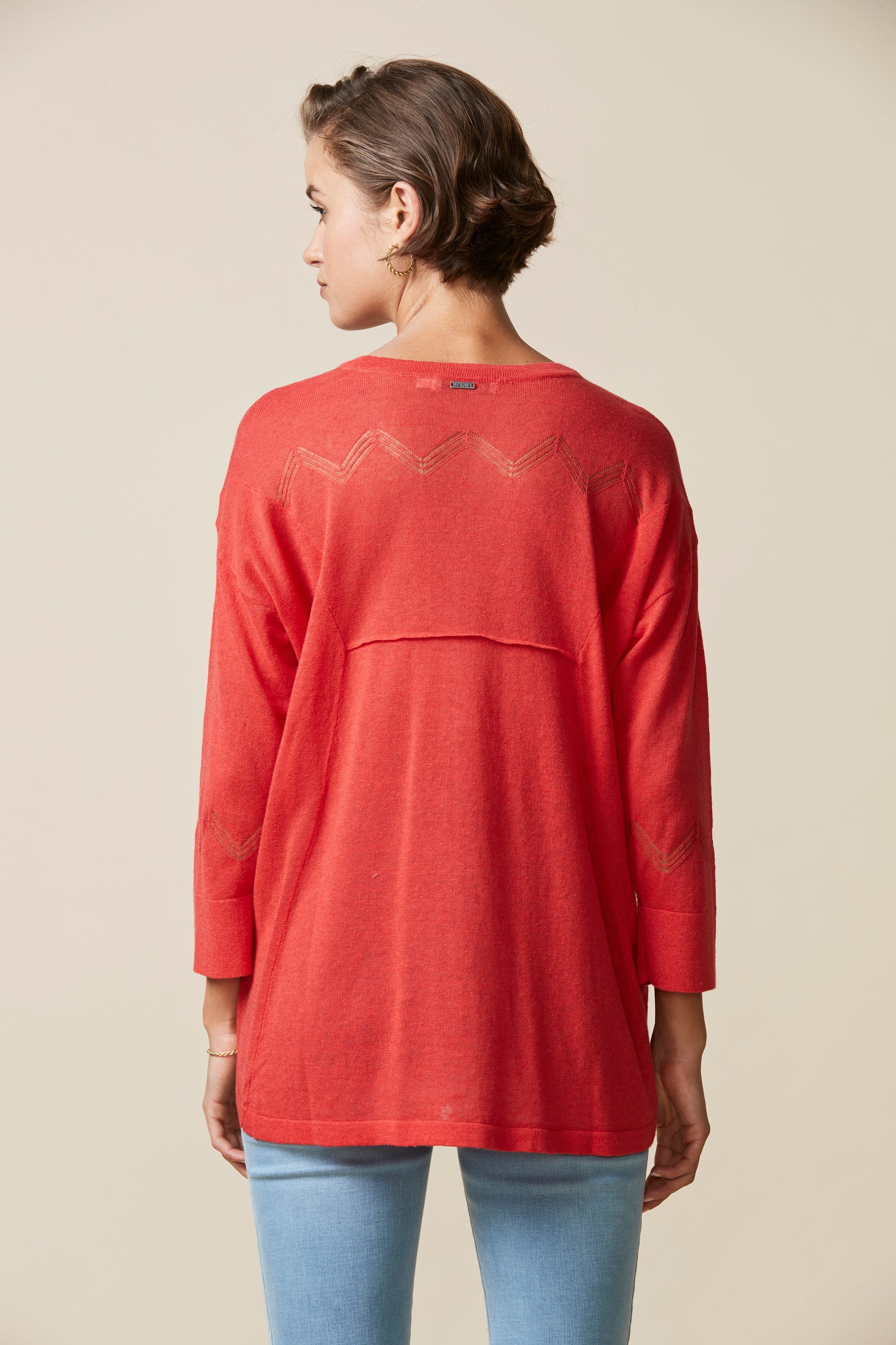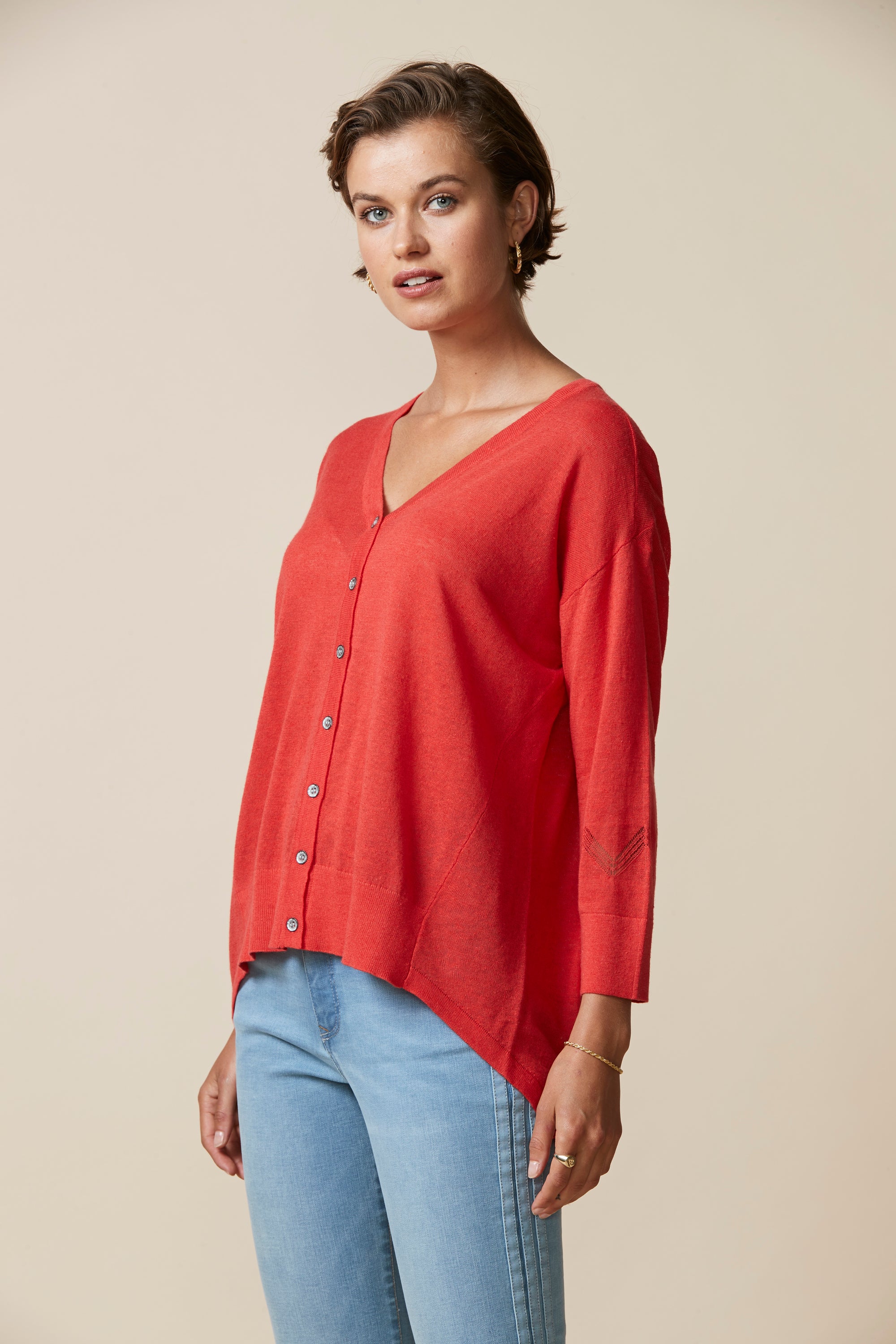 Soft and drapey linen cotton blend knit cardigan with intricate chevron open knit design and dyed to match hammered metal buttons.