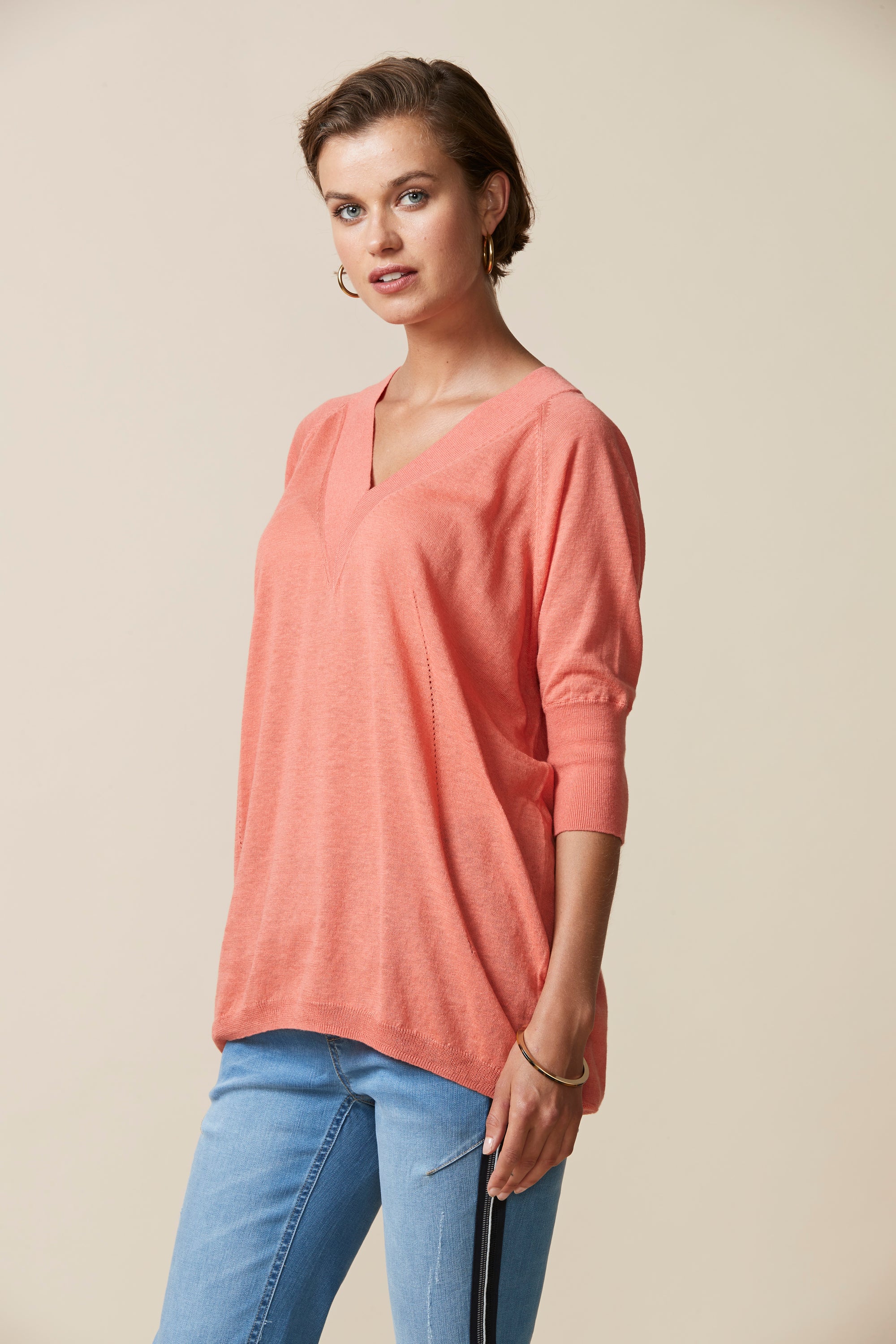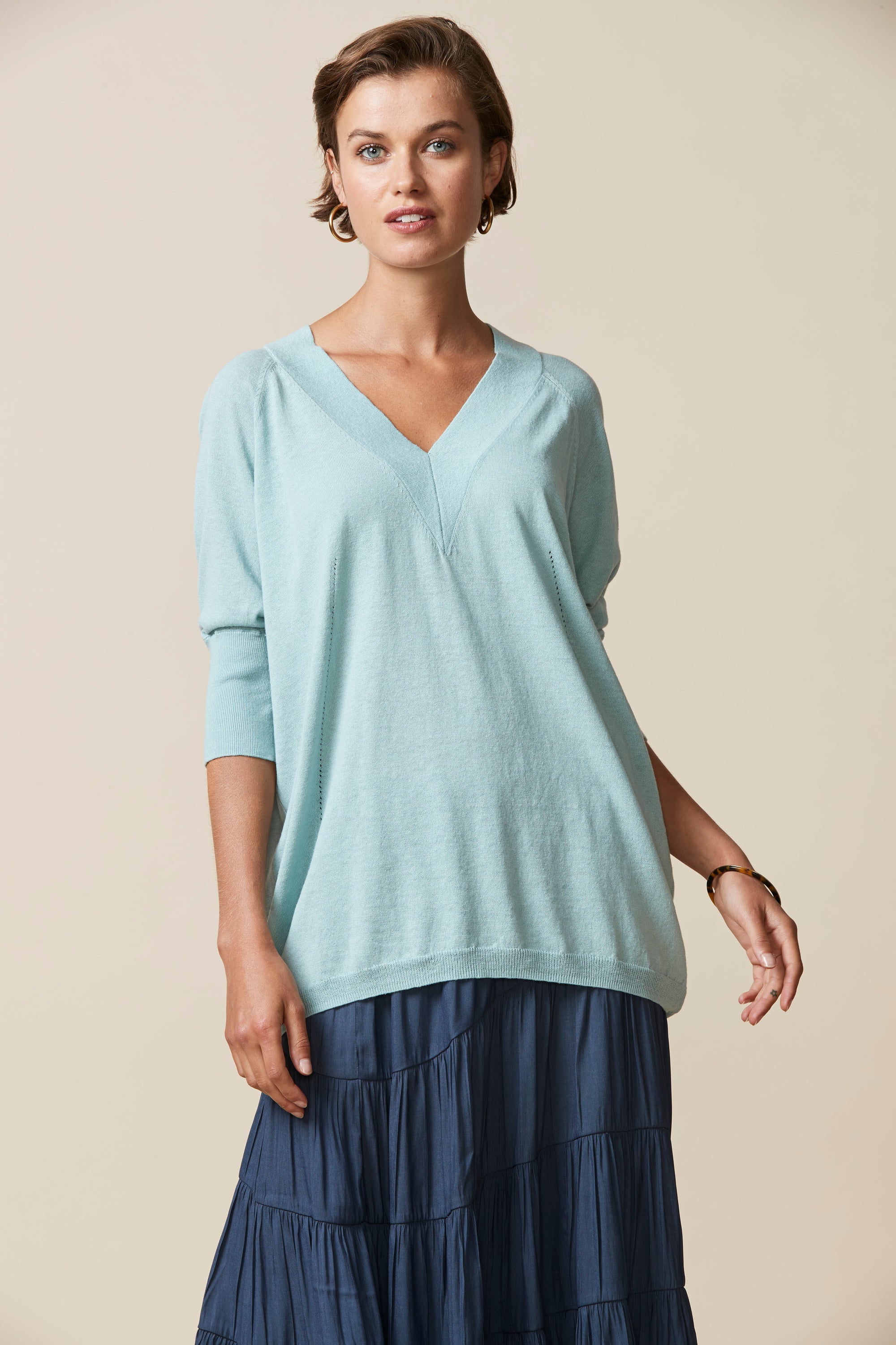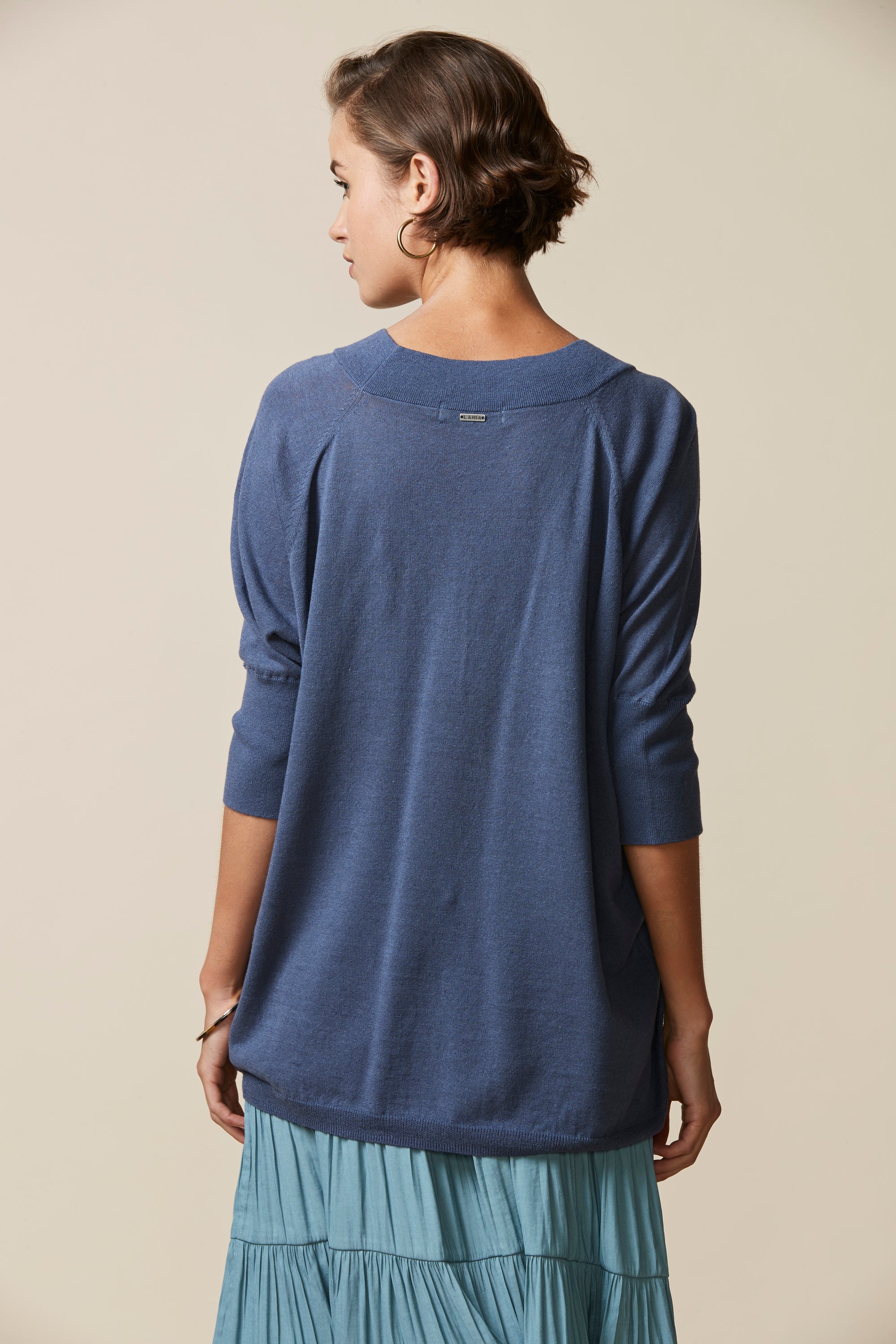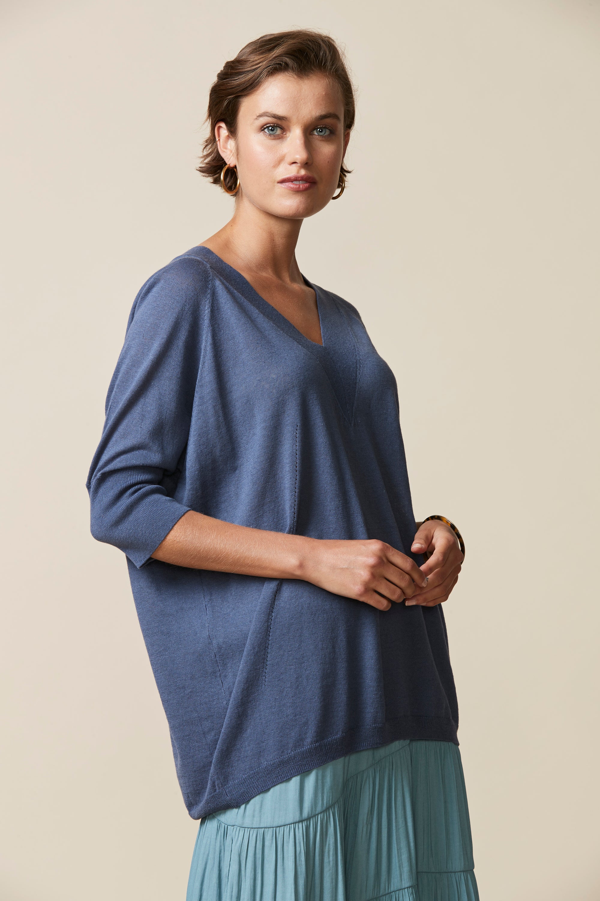 Soft and drapey linen cotton blend knit sweater with fashioning at side front body, V-neck with deep band and deep rib sleeve cuff.