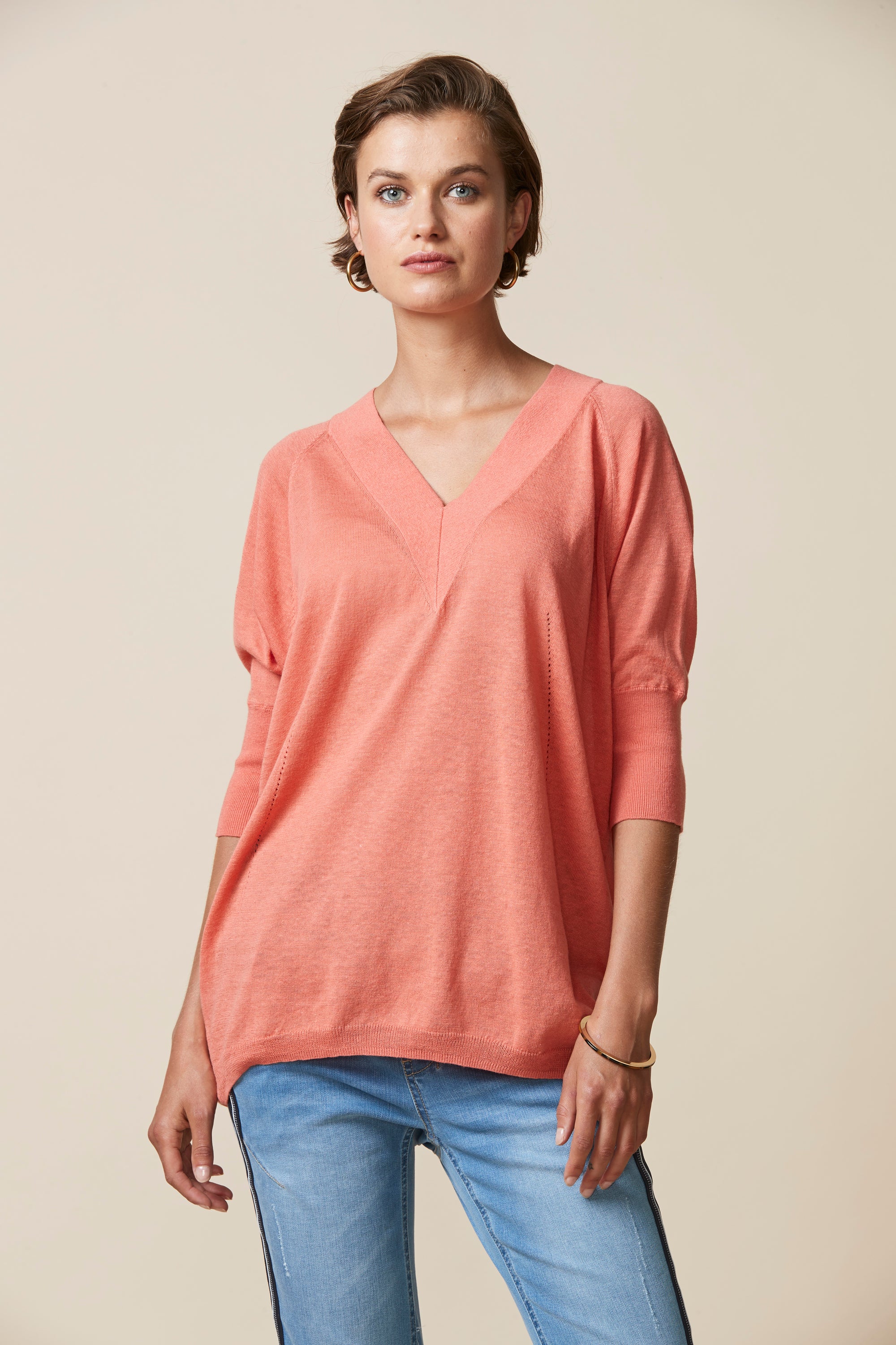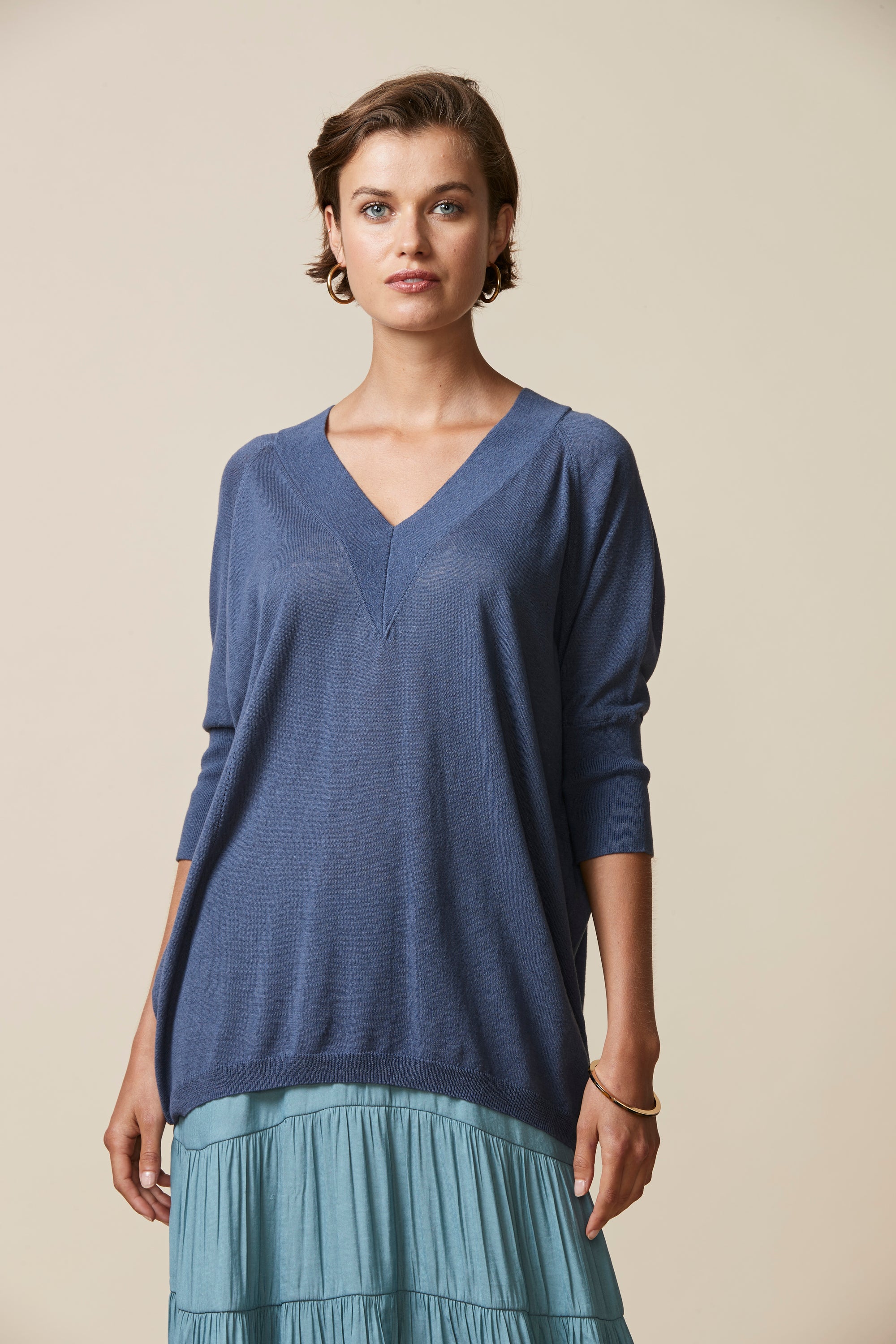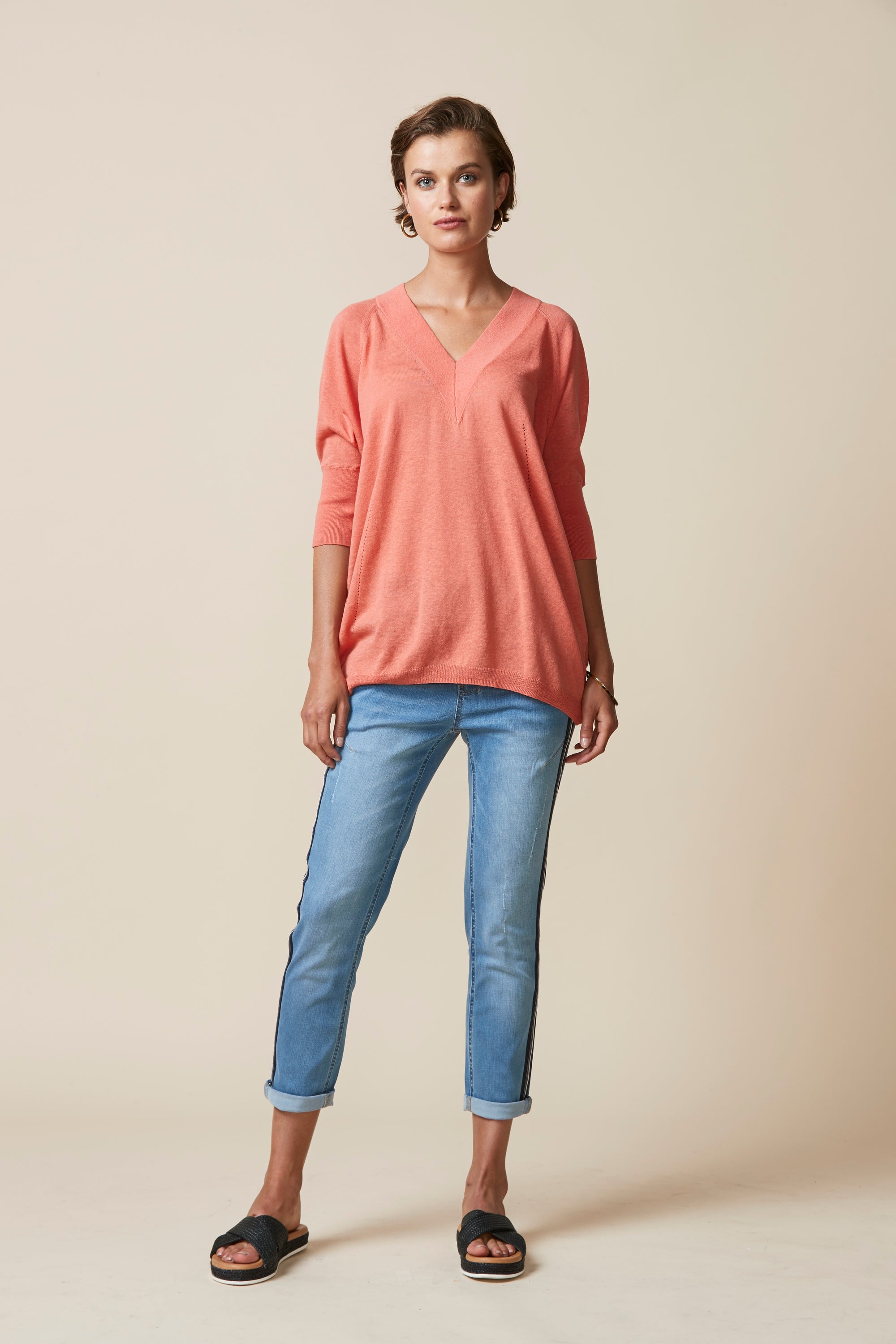 Soft and drapey linen cotton blend knit sweater with fashioning at side front body, V-neck with deep band and deep rib sleeve cuff.