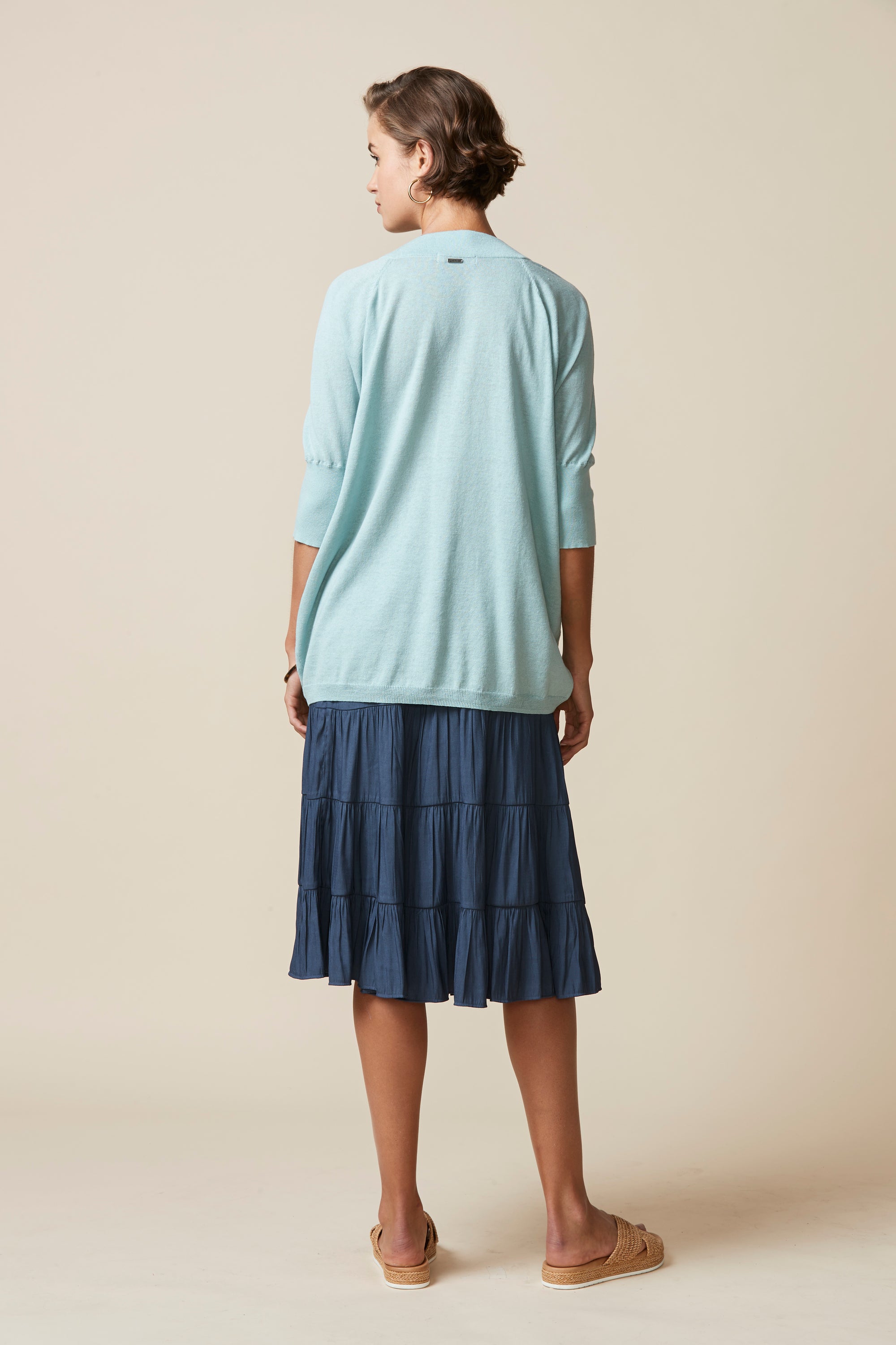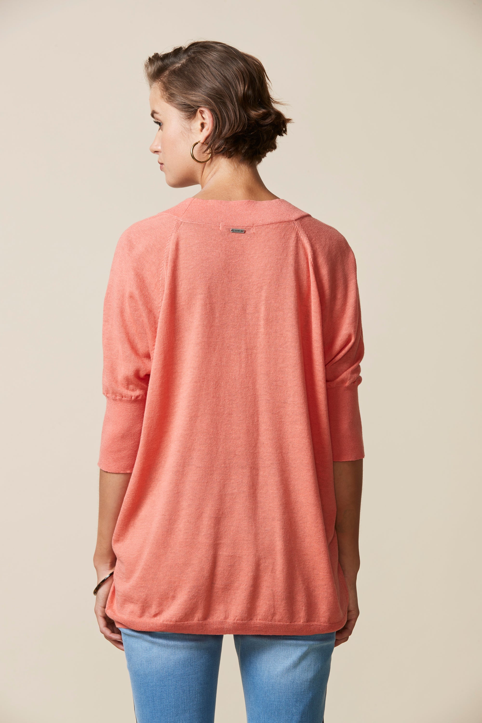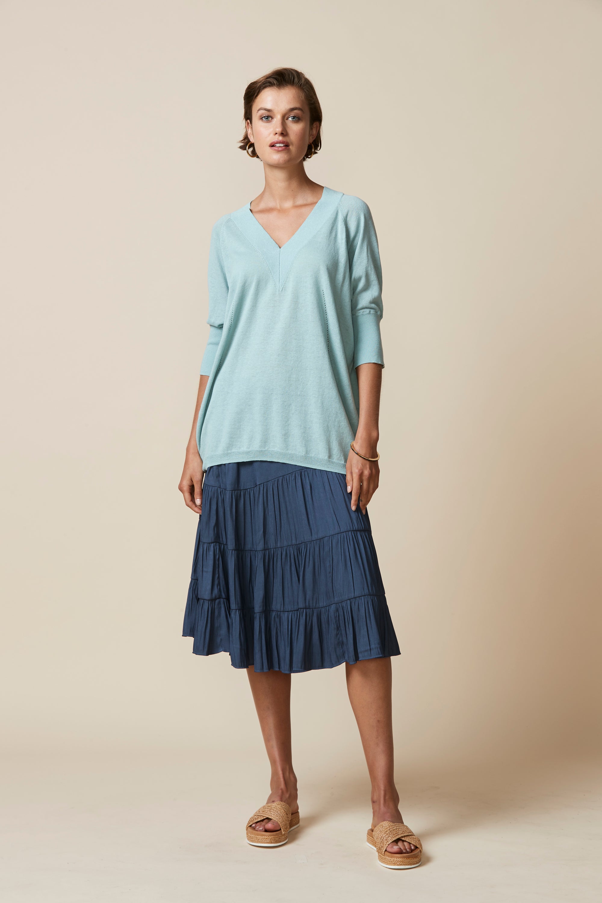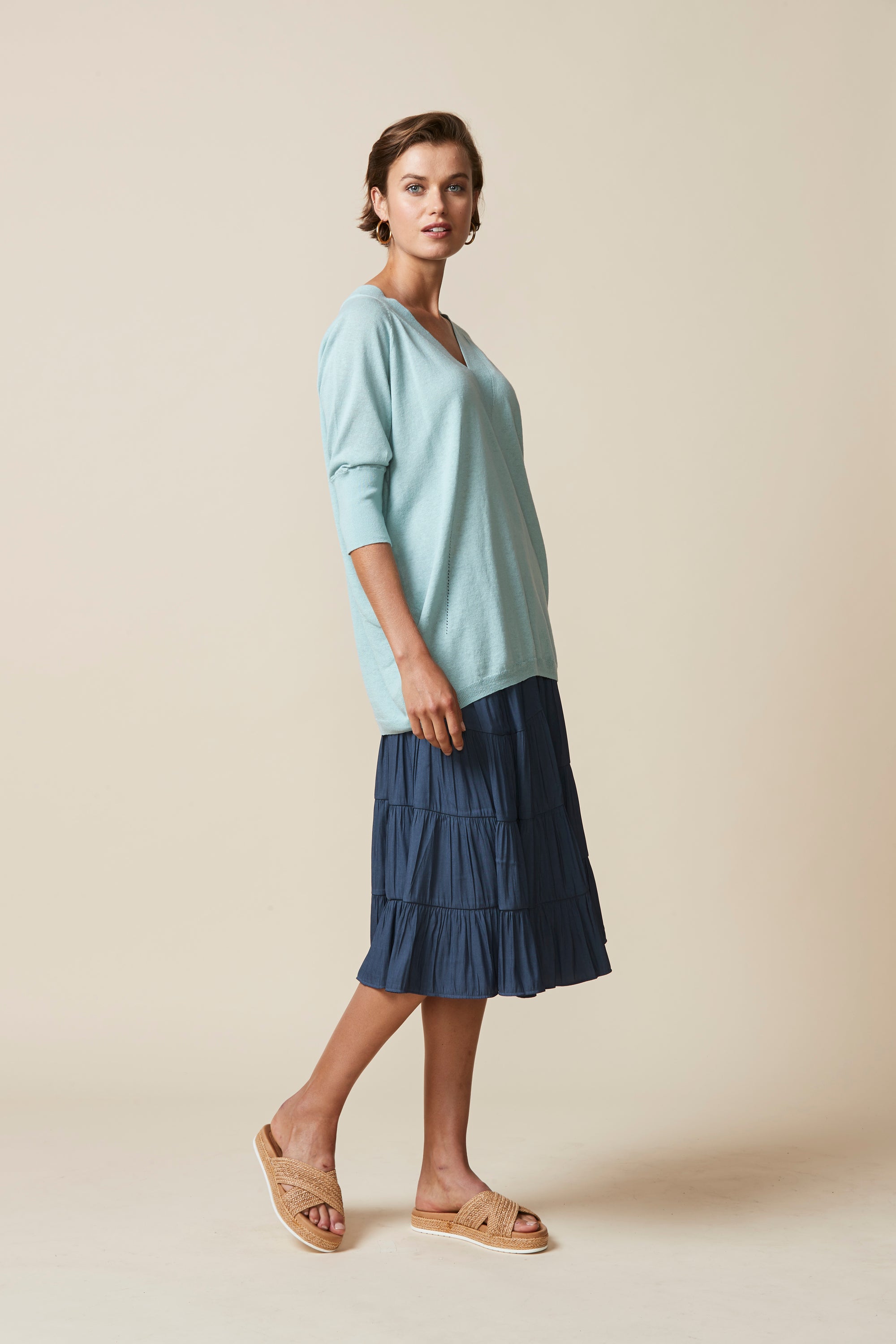 Soft and drapey linen cotton blend knit sweater with fashioning at side front body, V-neck with deep band and deep rib sleeve cuff.
