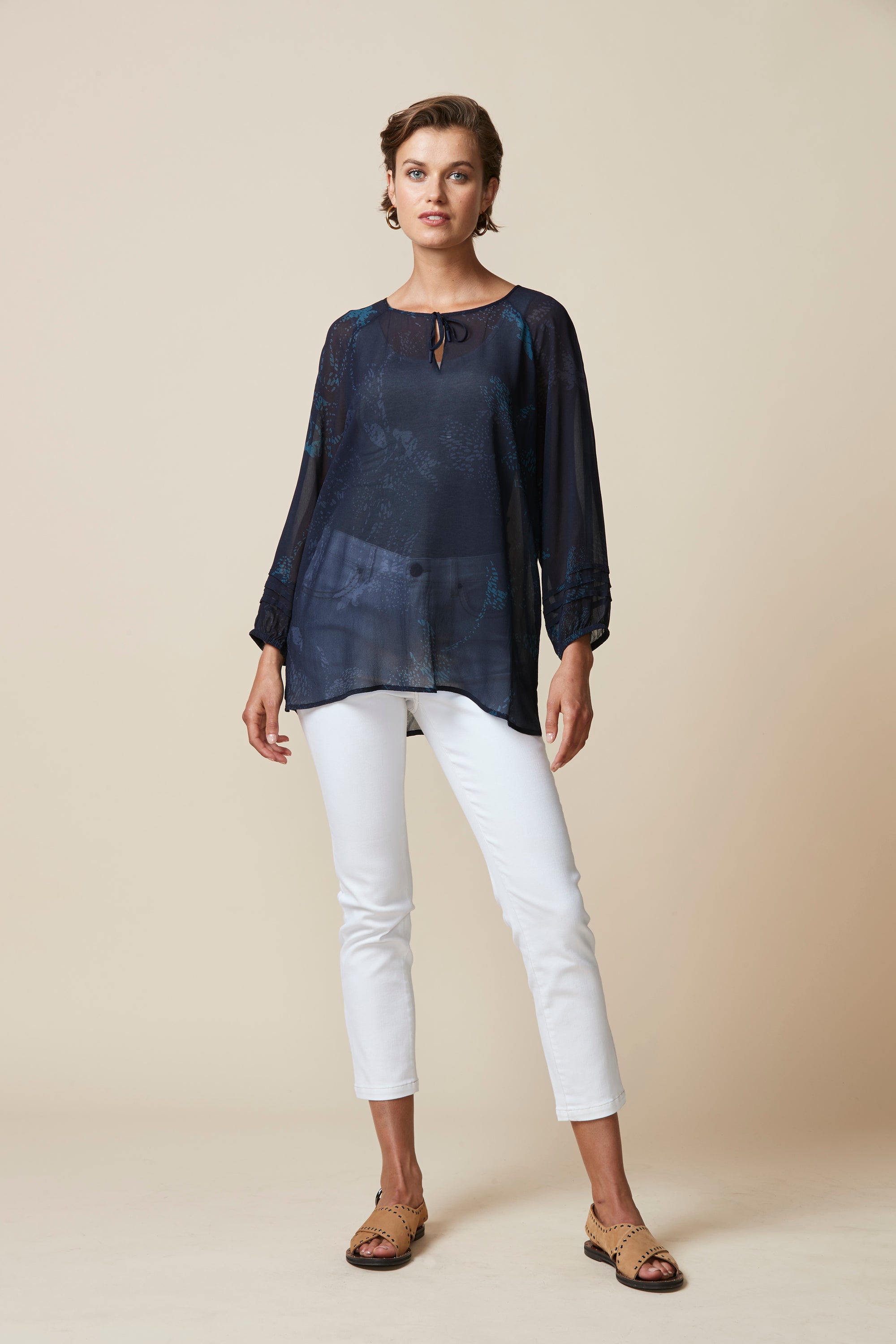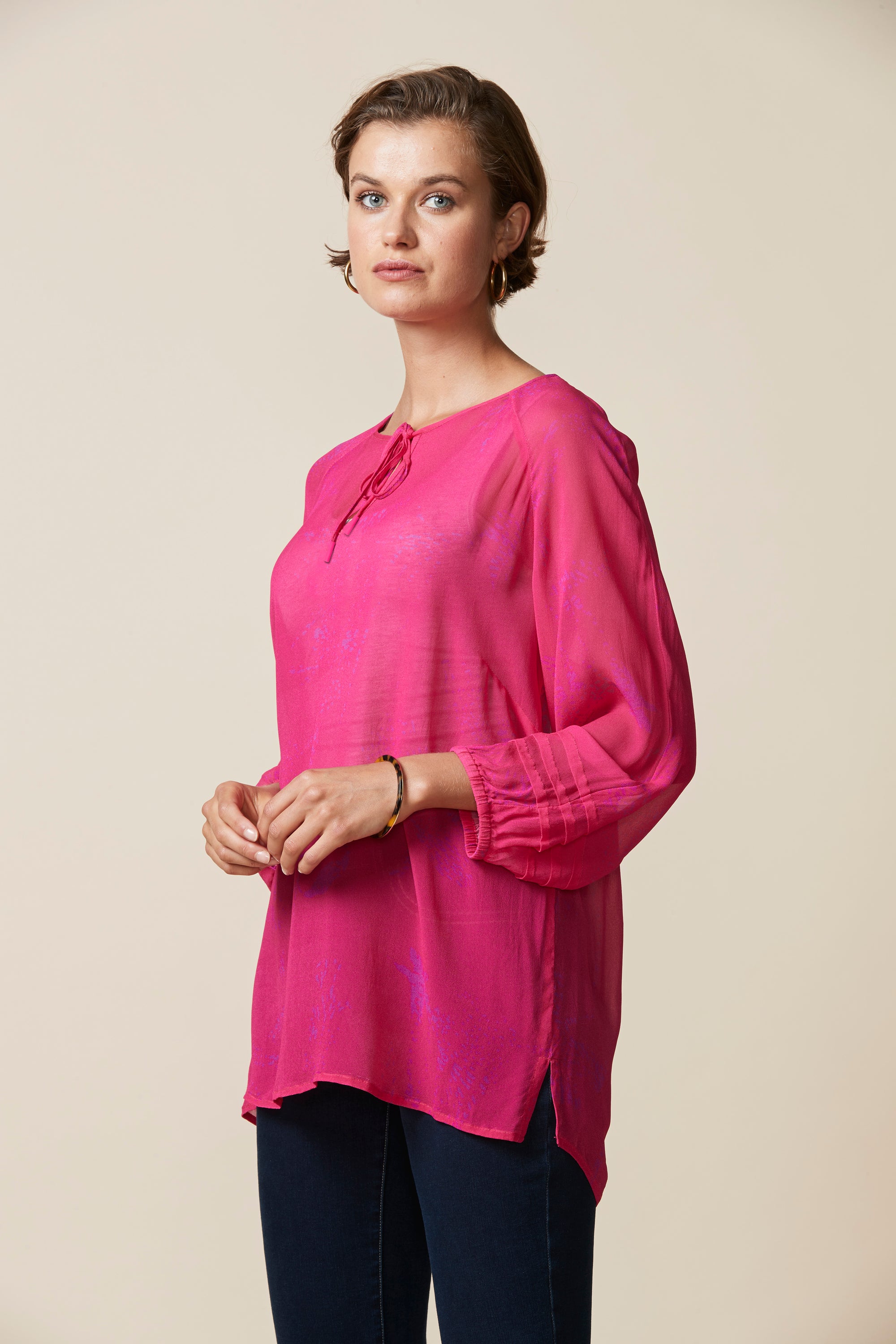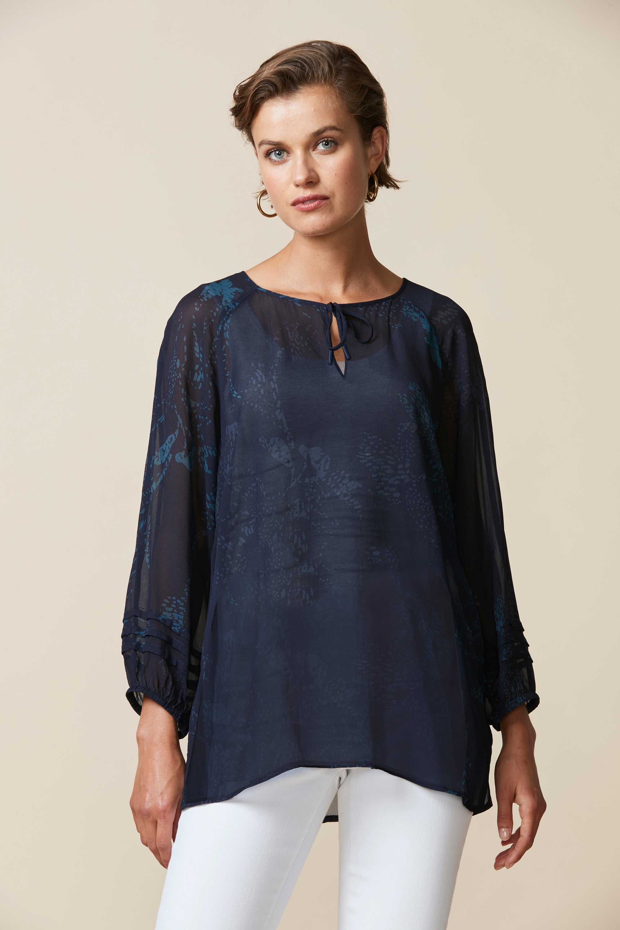 Soft printed sheer top with a scoop neckline & bound keyhole opening that fastens with self ties. The bracelet length bell sleeve features pintuck detailing around the cuff.
