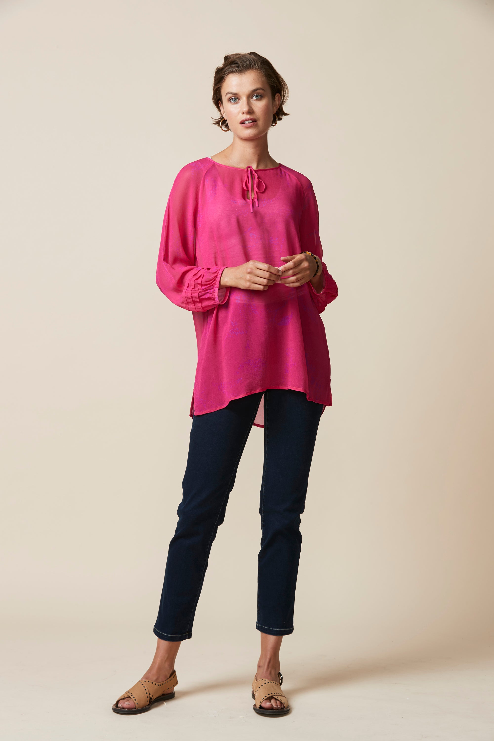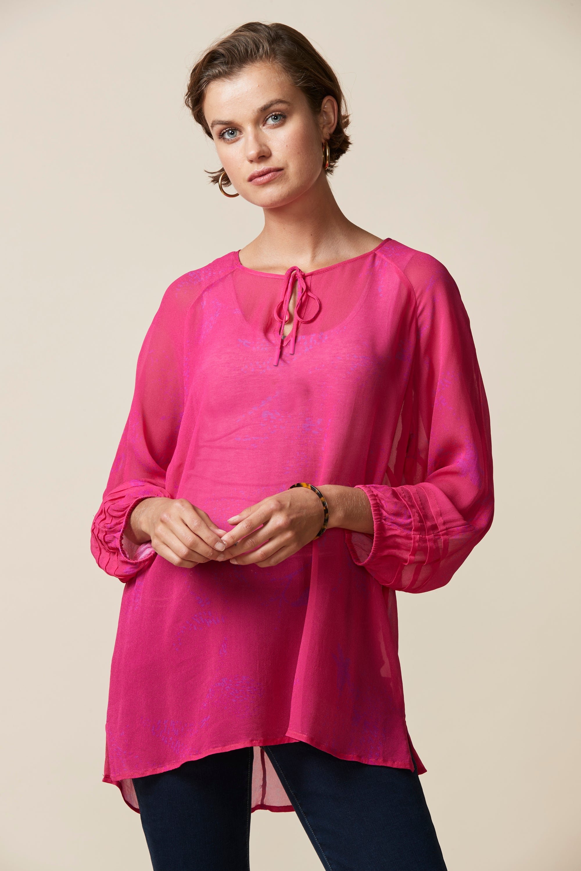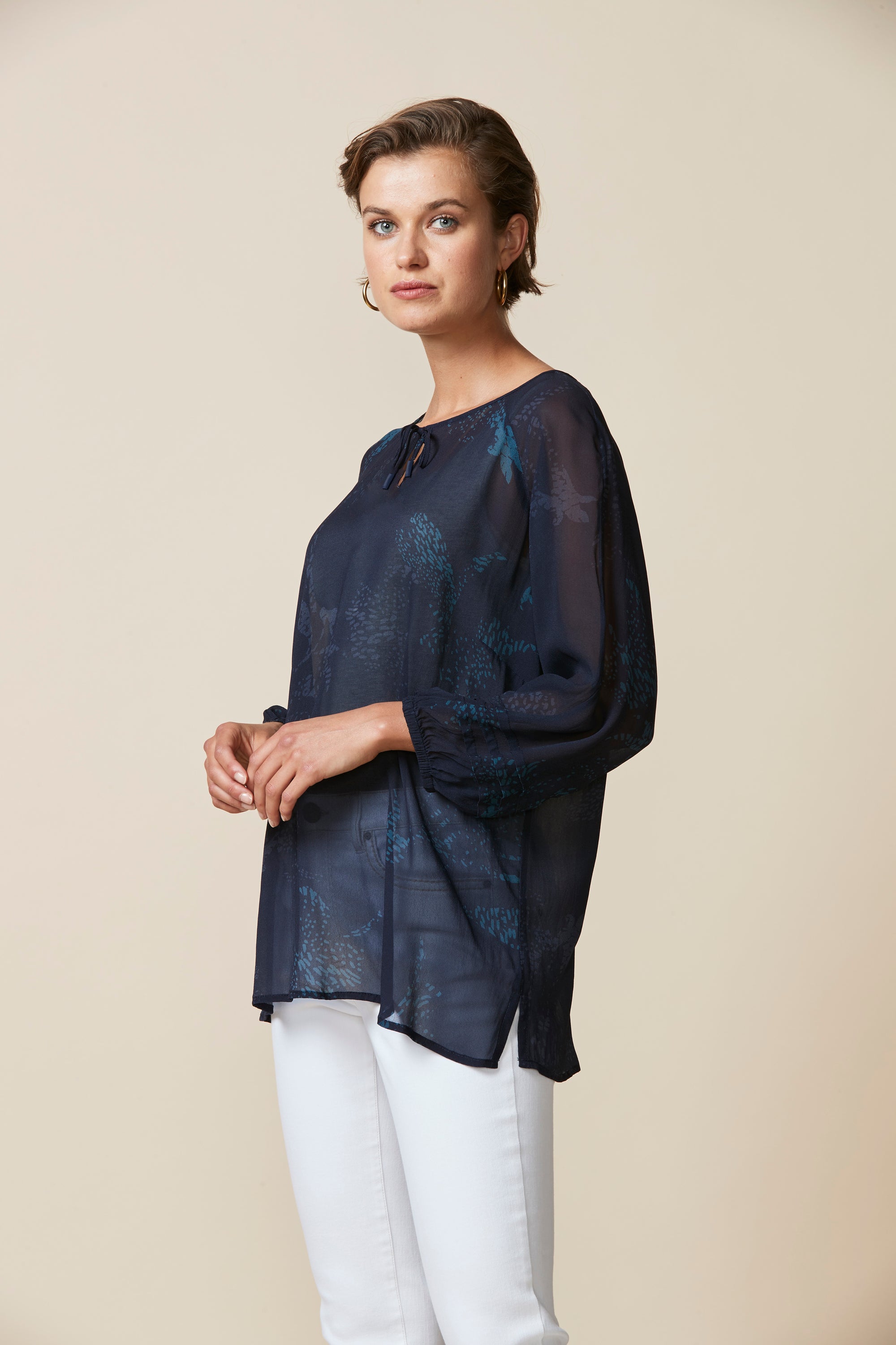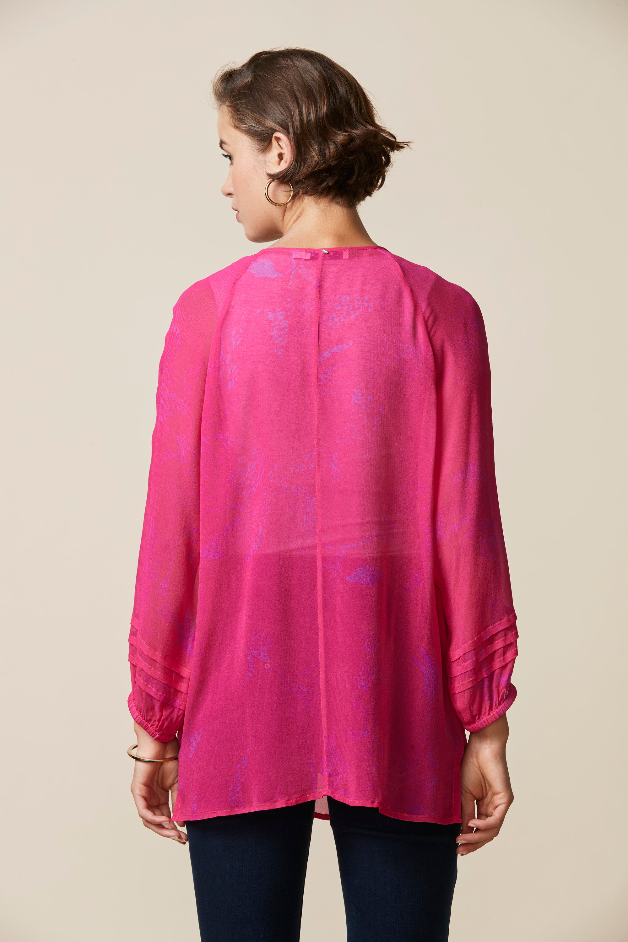 Soft printed sheer top with a scoop neckline & bound keyhole opening that fastens with self ties. The bracelet length bell sleeve features pintuck detailing around the cuff.