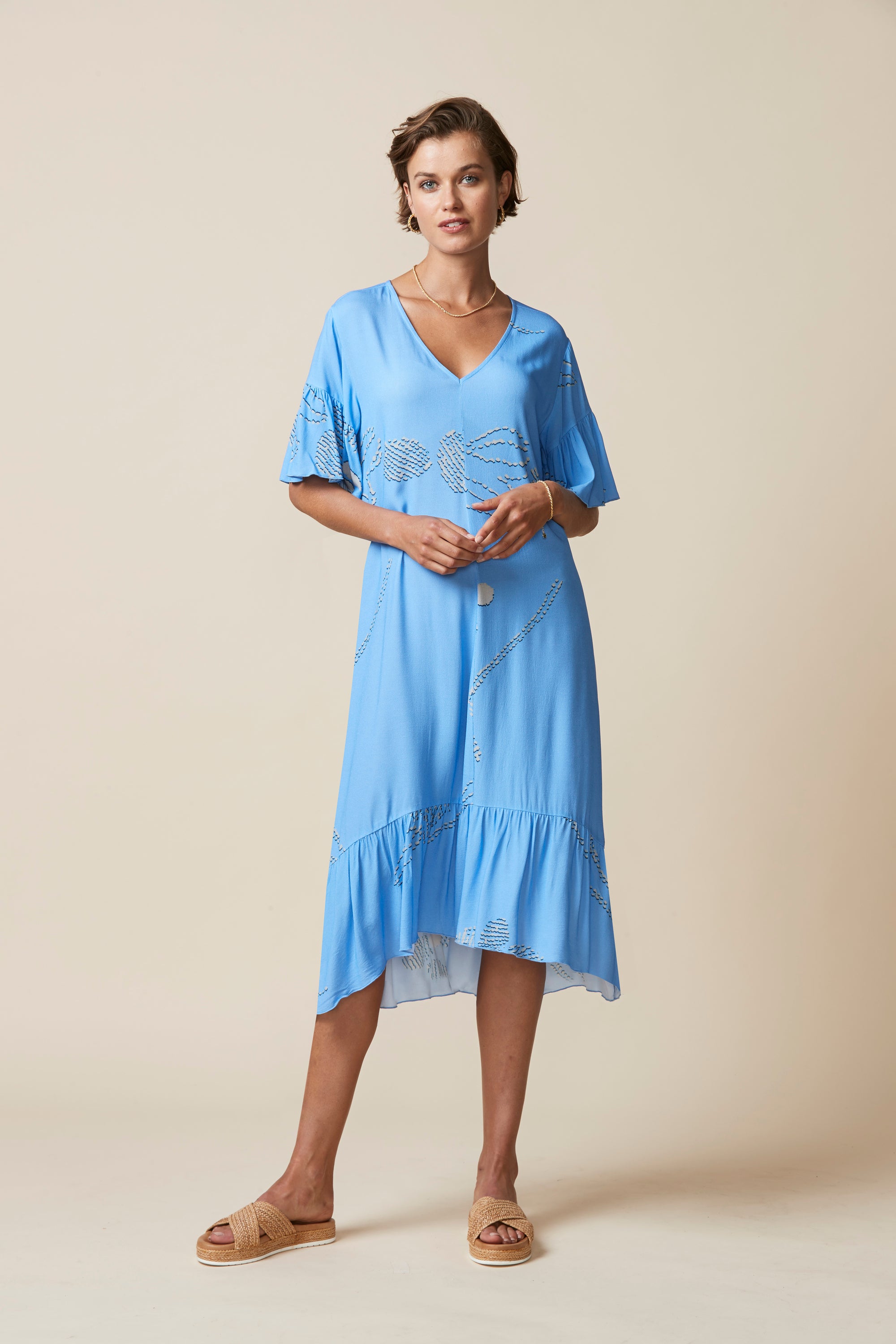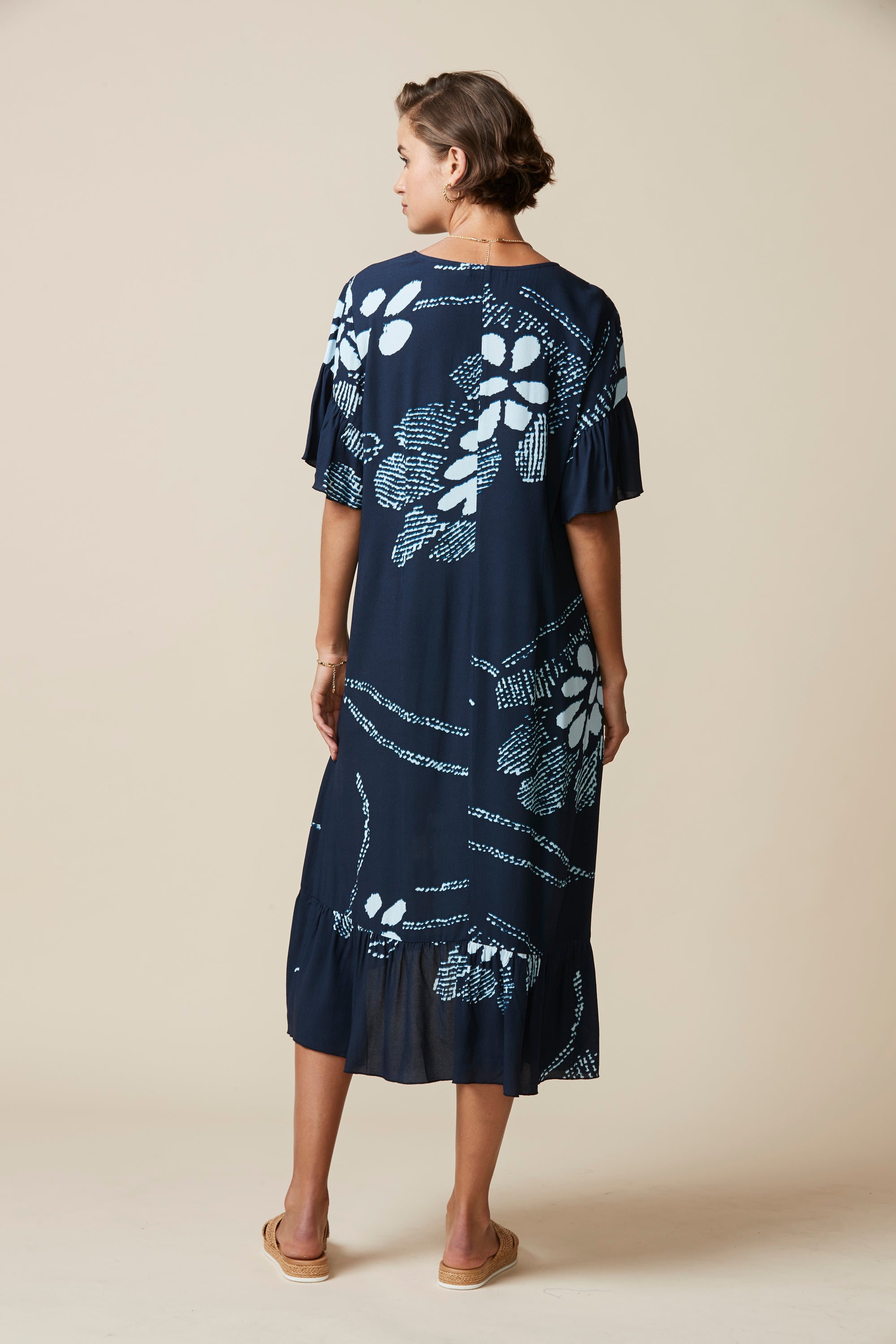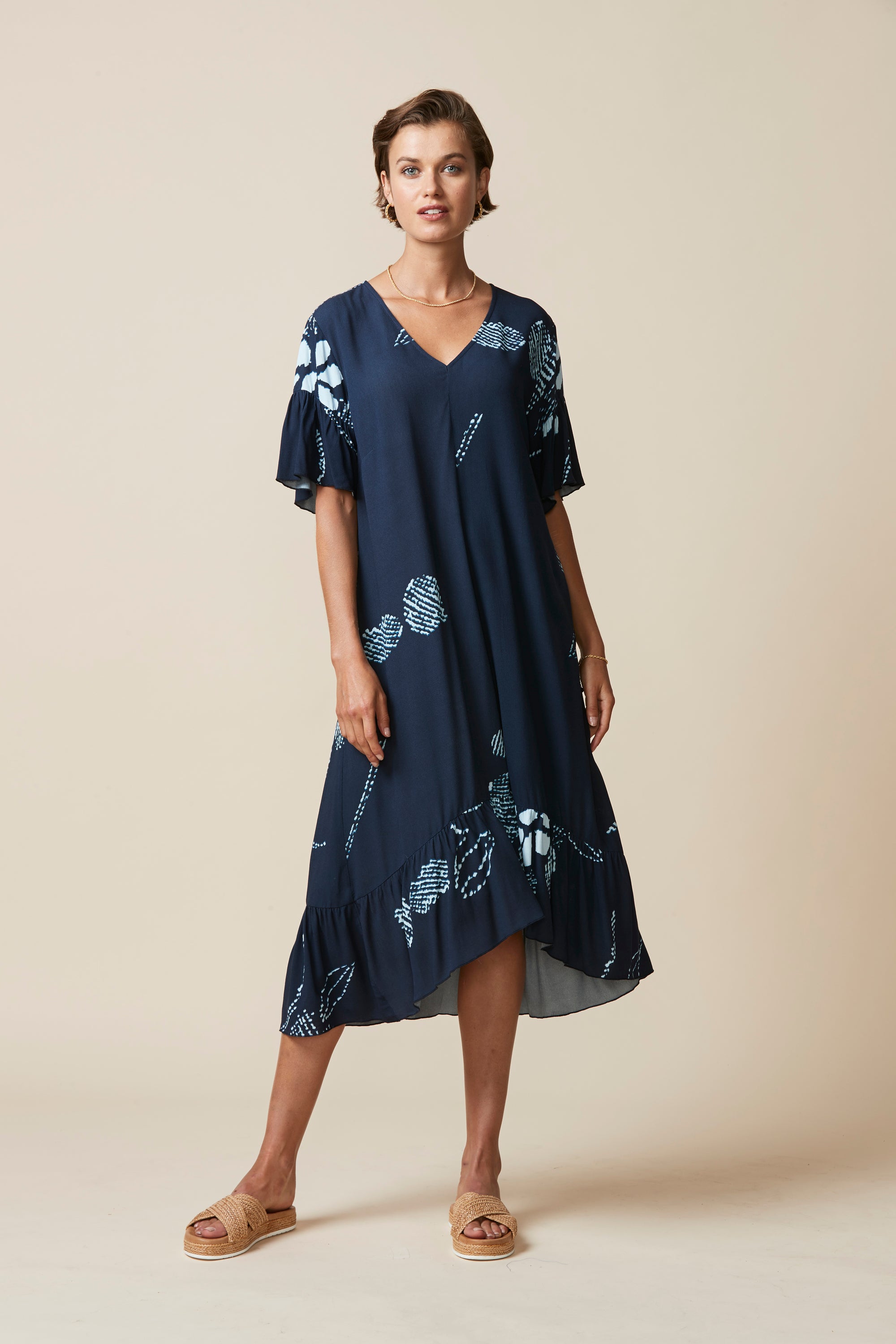 Beautiful abstract floral printed midi dress with soft drape, gathering detail on hem and sleeves, and high-low hemline.