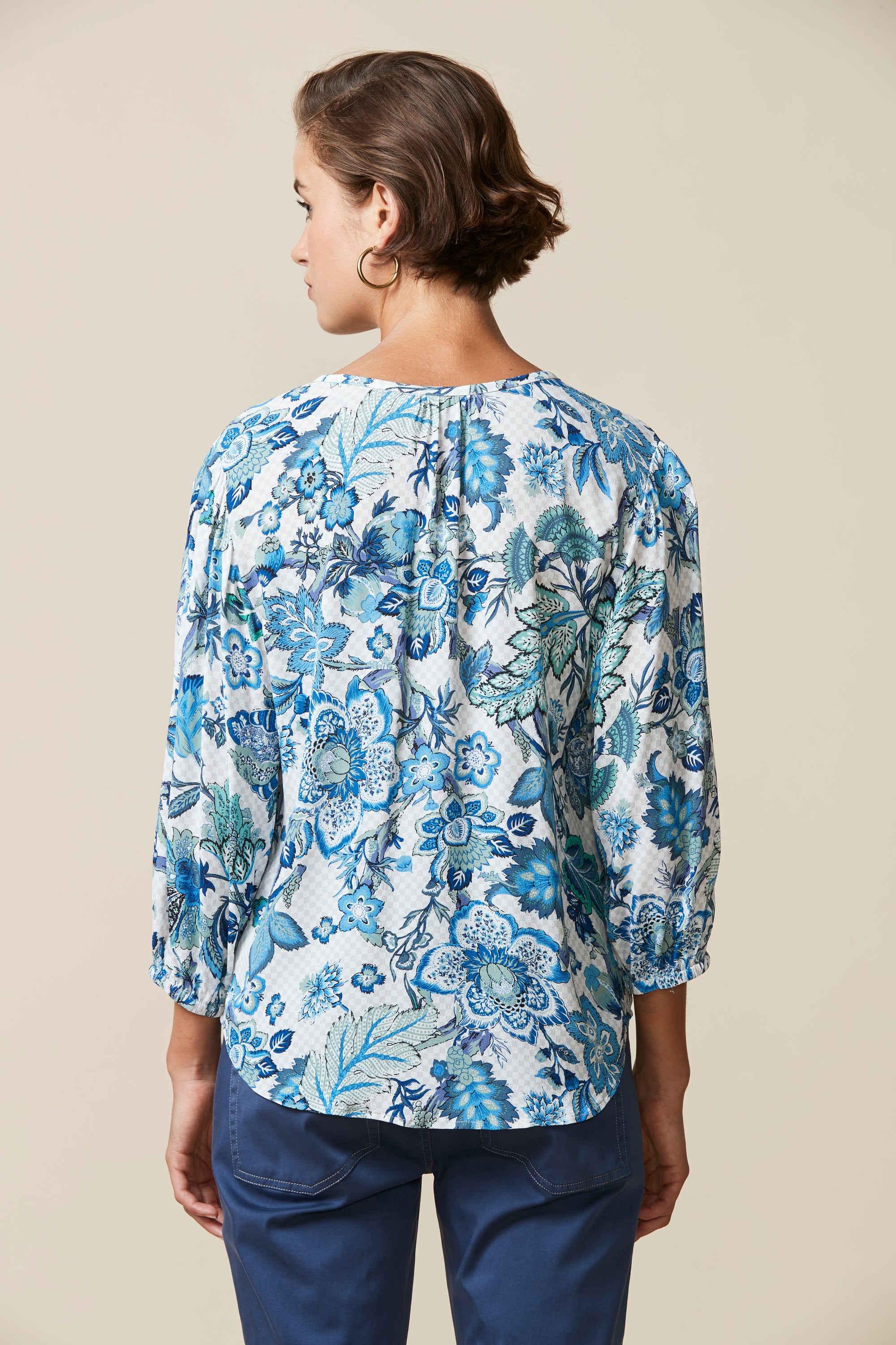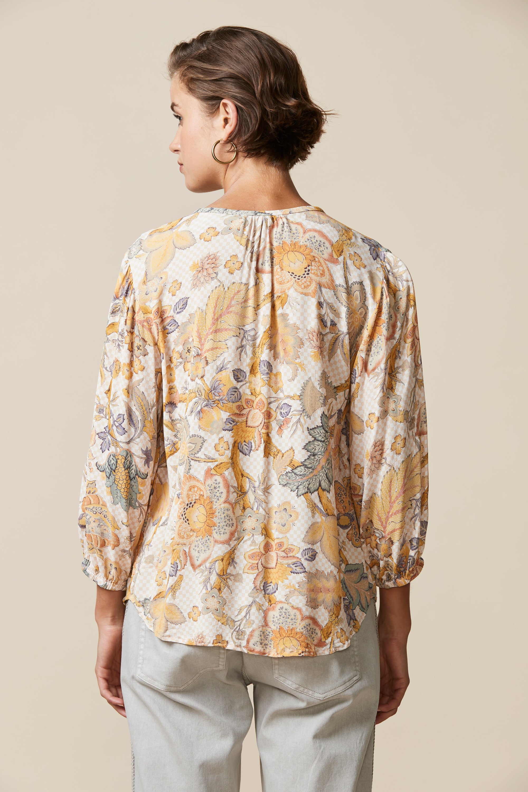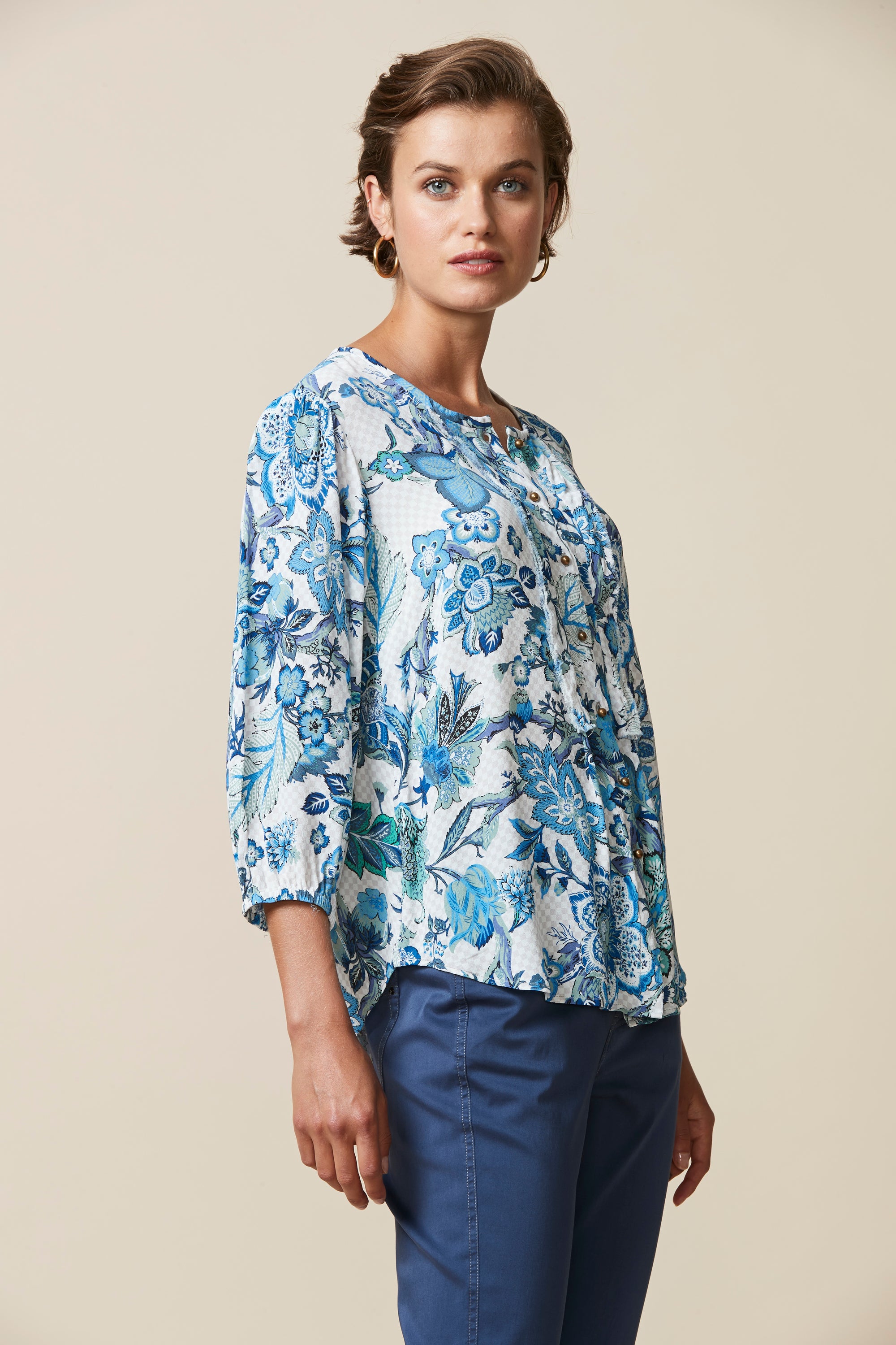 Intricate floral & checkerboard printed top with elbow length sleeves, featuring front pleat detail. Front opening with dainty antique buttons.