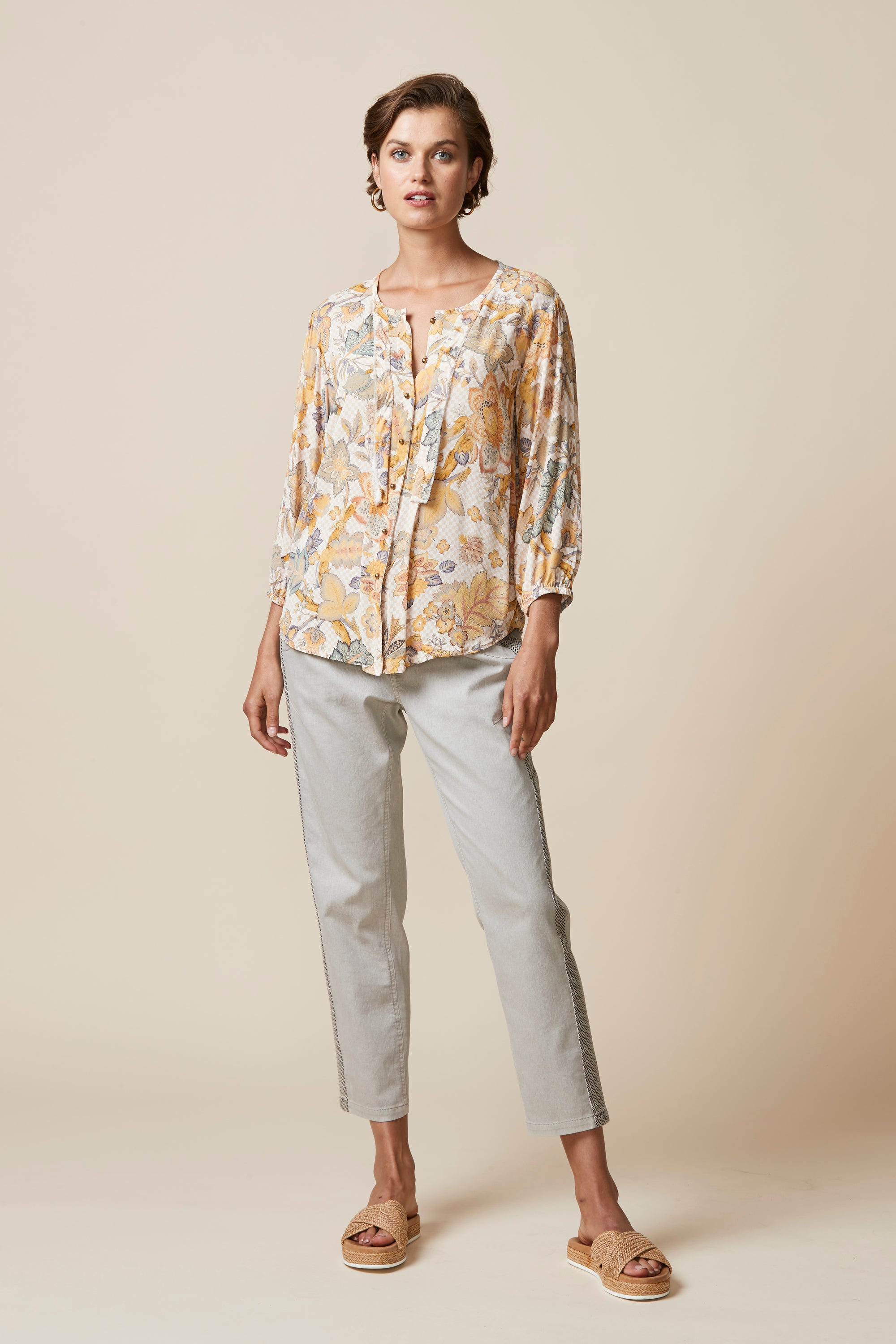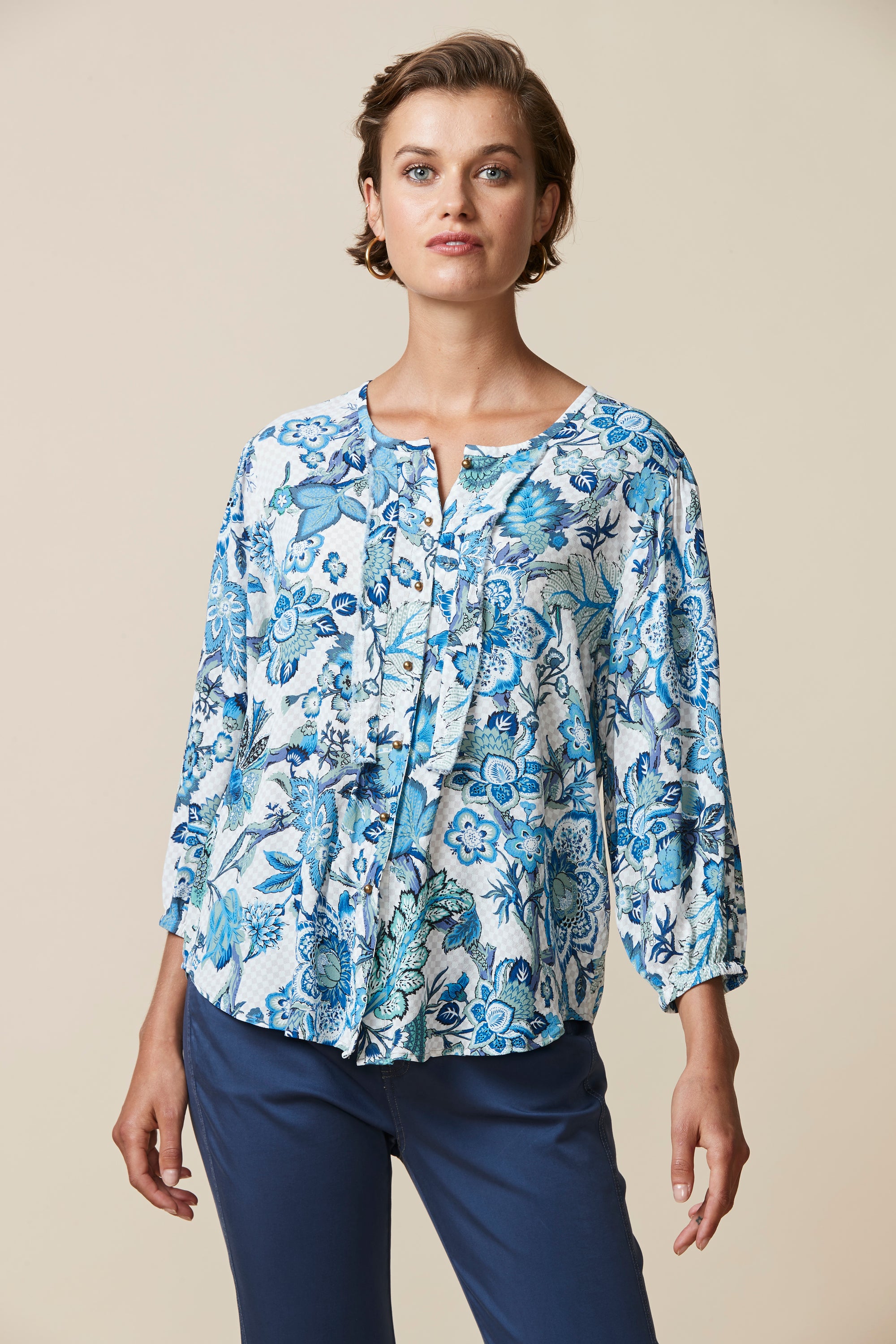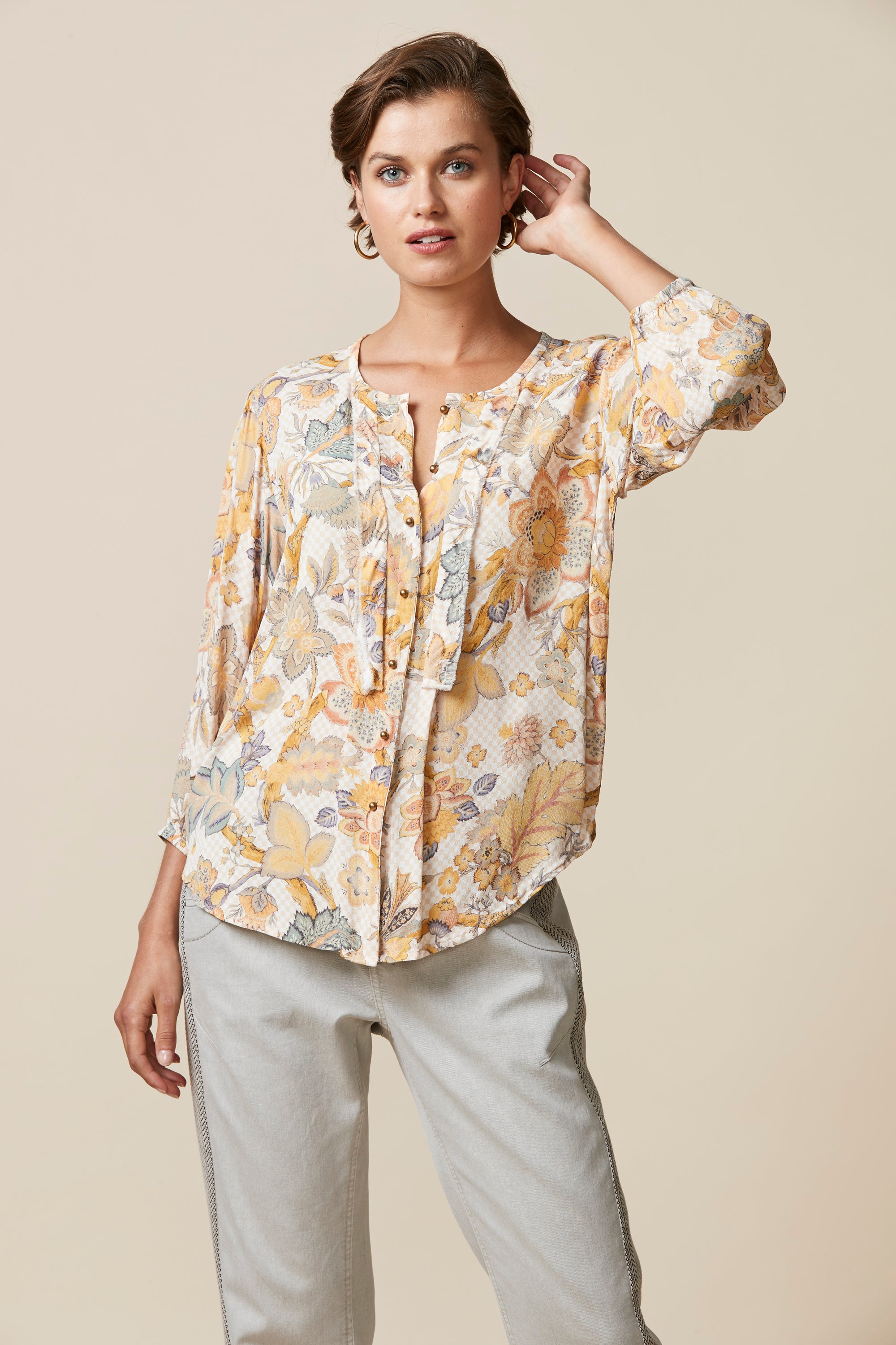Intricate floral & checkerboard printed top with elbow length sleeves, featuring front pleat detail. Front opening with dainty antique buttons.