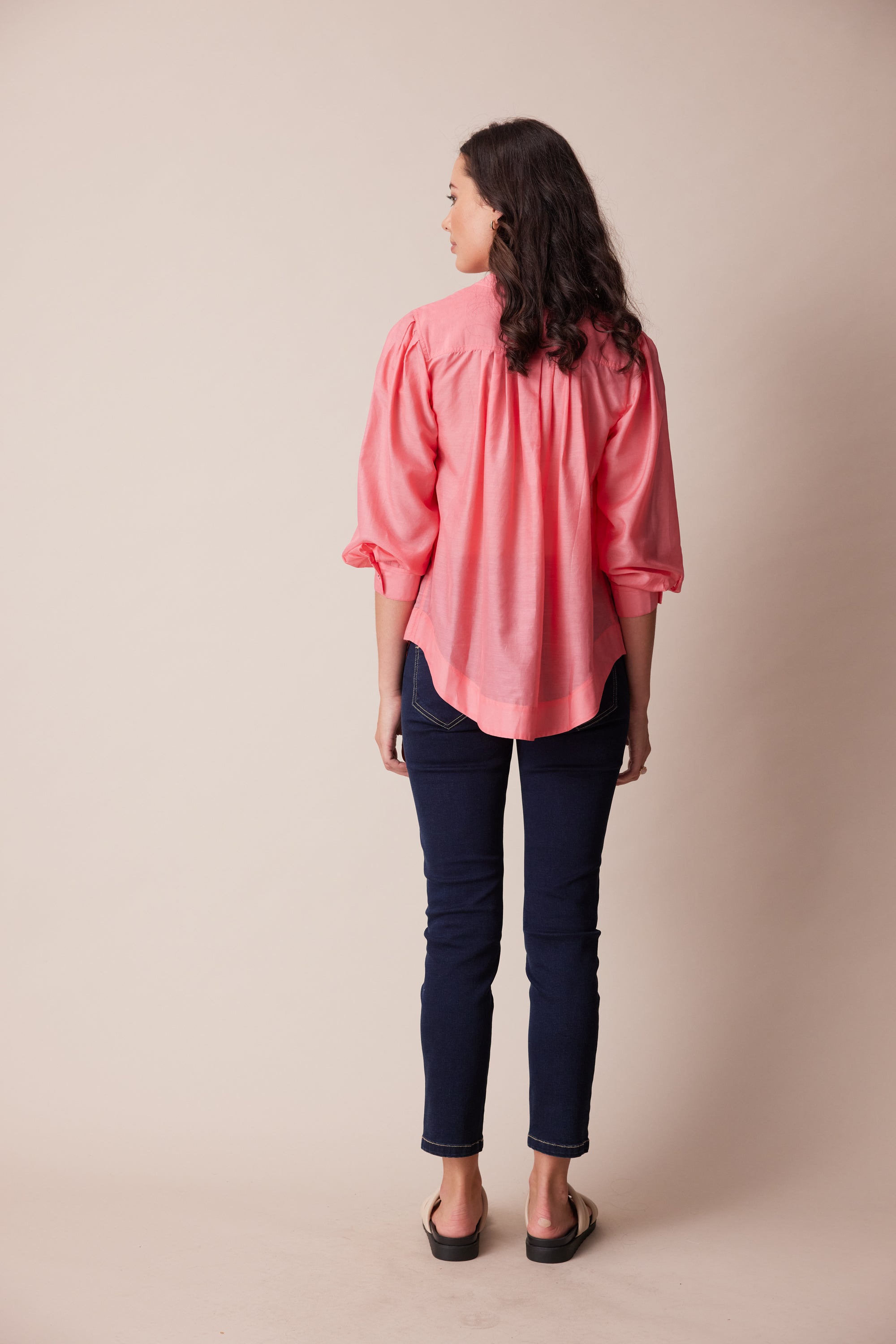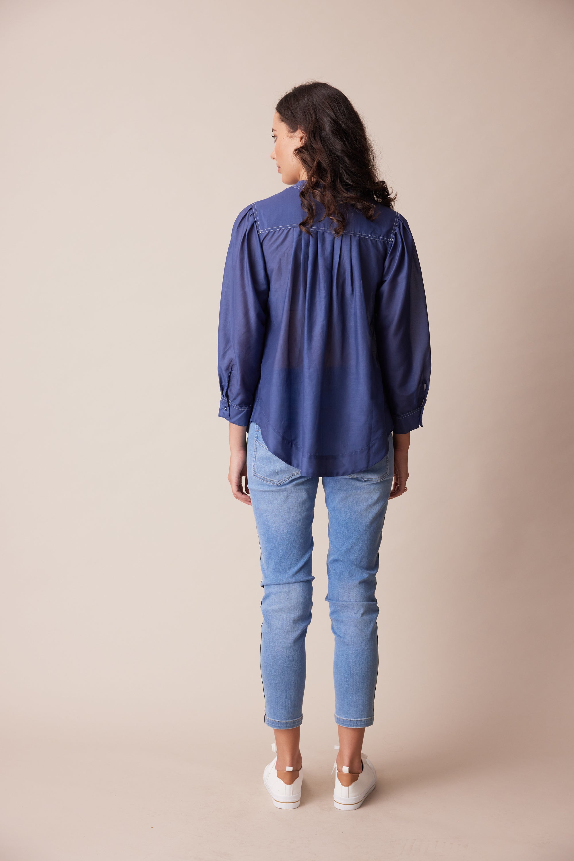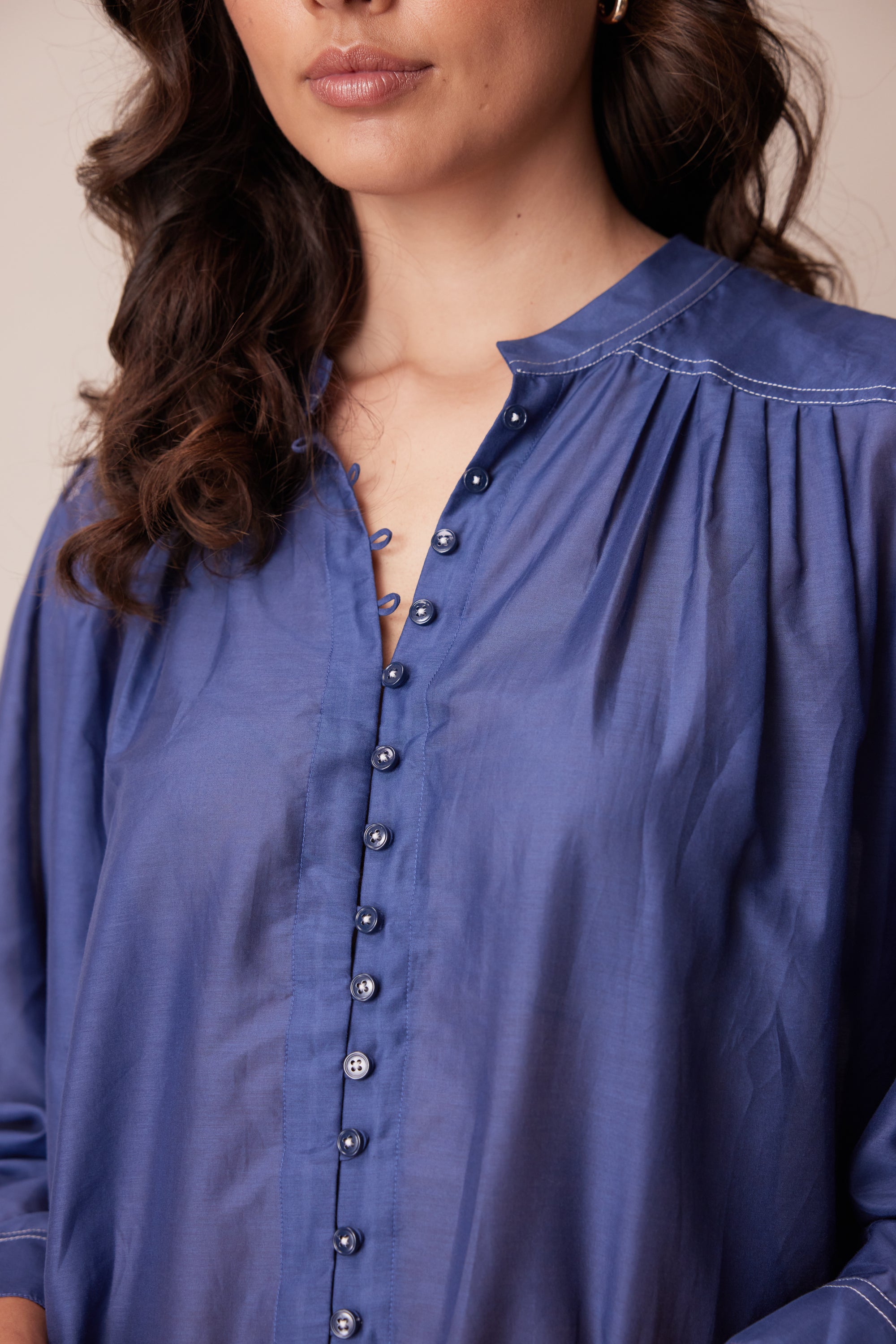 This opulent cotton silk shirt is a refined, feminine style that will elevate your day-to-day look. knife pleats through the bodice and sleeve add volume to the silhouette, anchored by a classic yoke and stand collar with twin needle topstitching. Centre front placket fastens with dyed-to match-buttons, off-set with contrast button stitching.