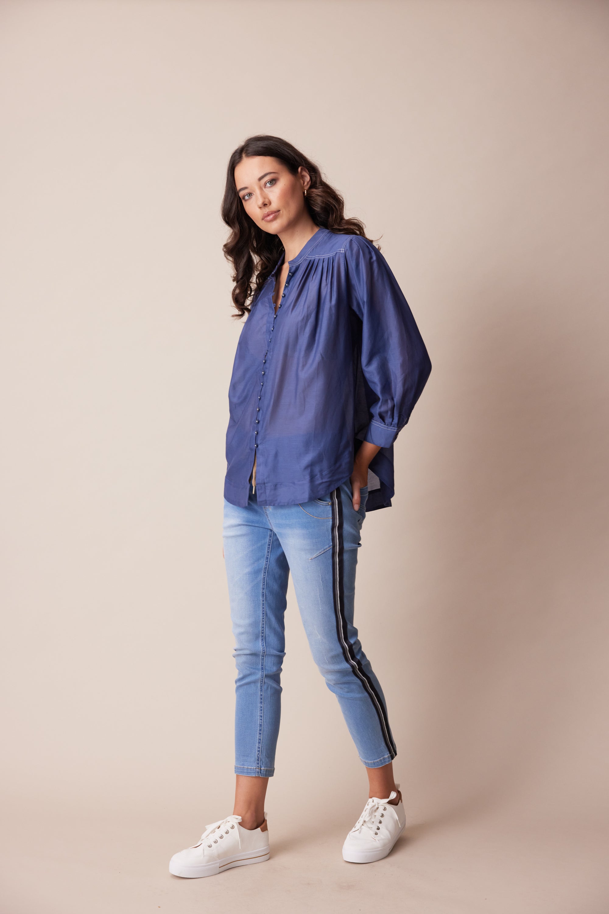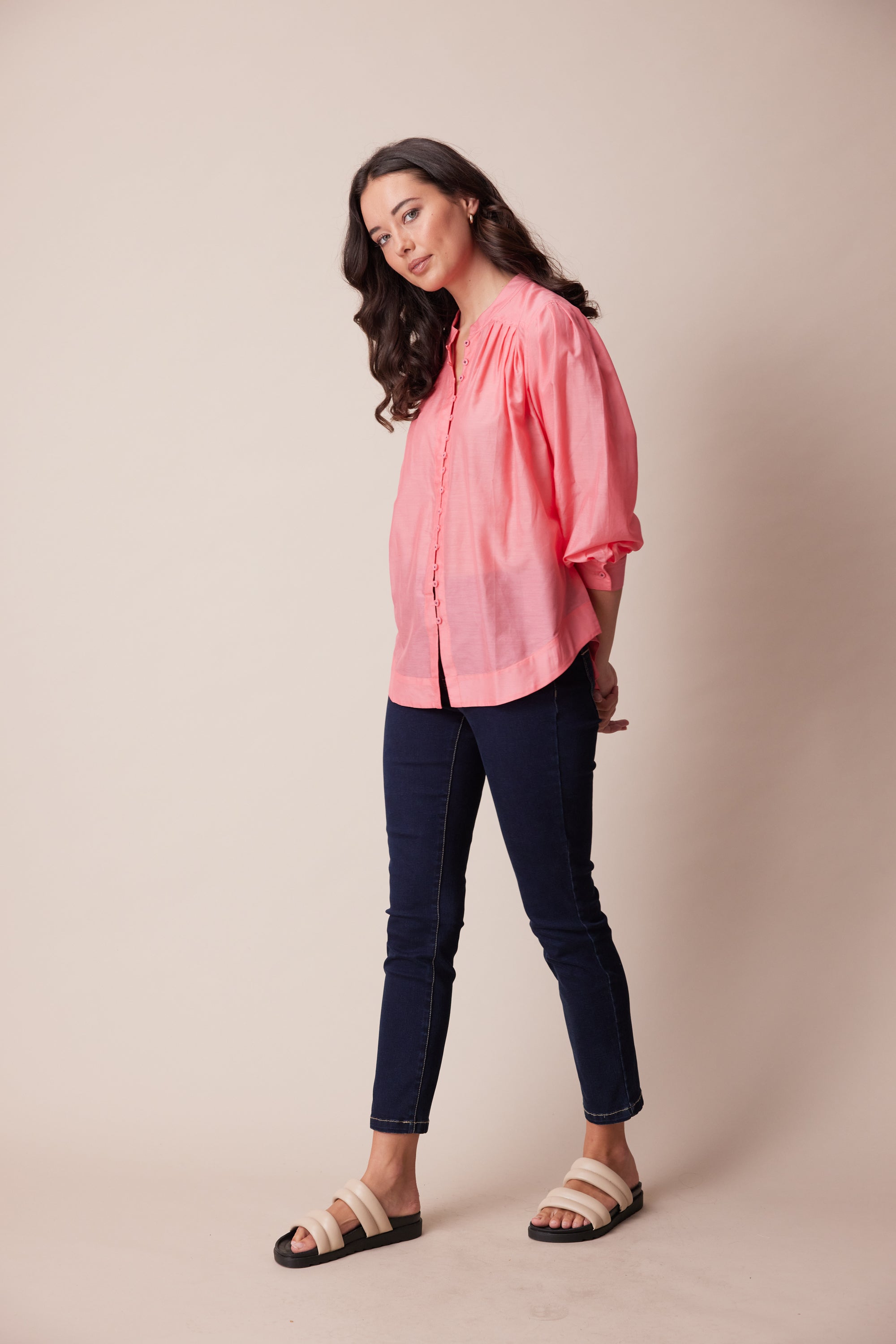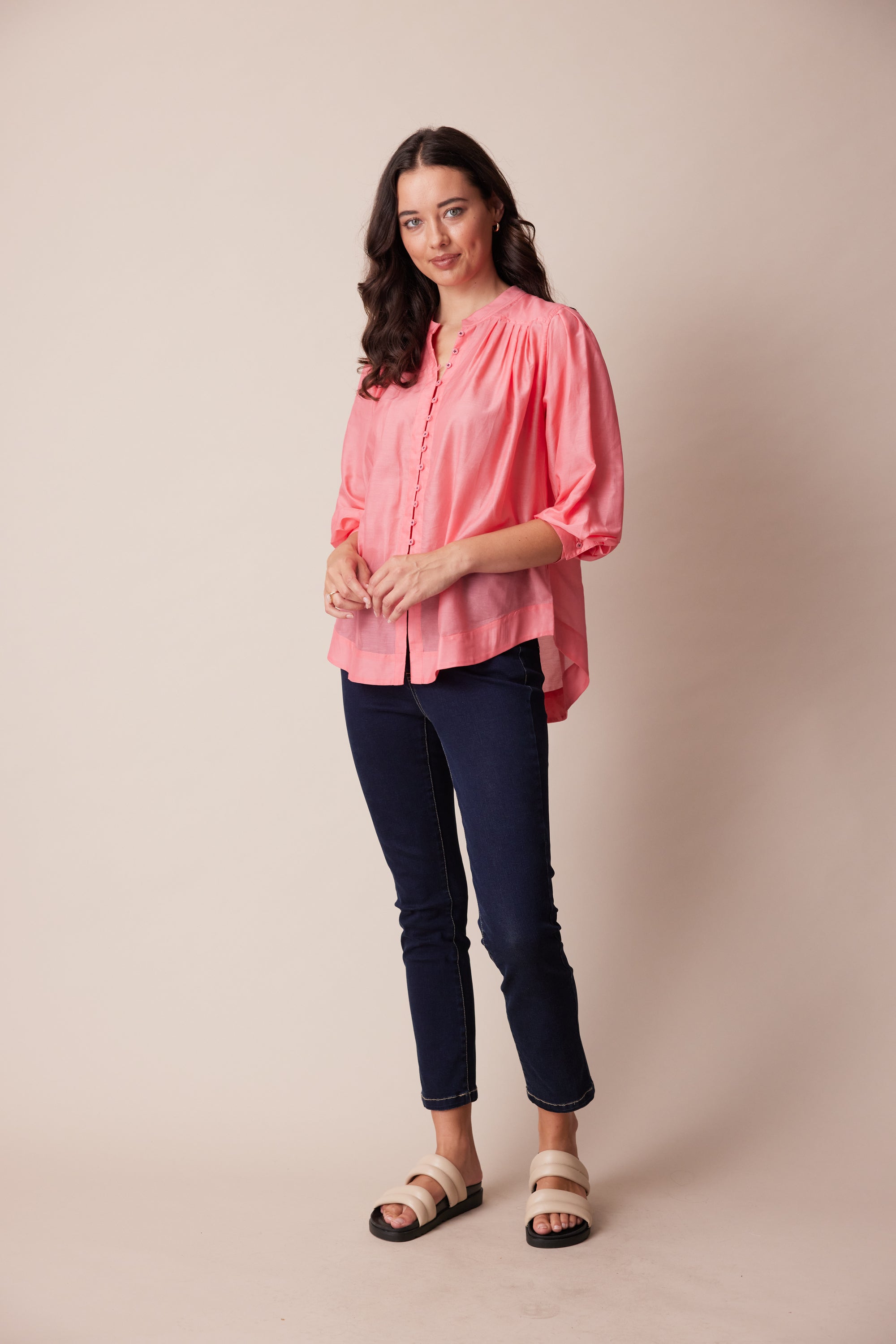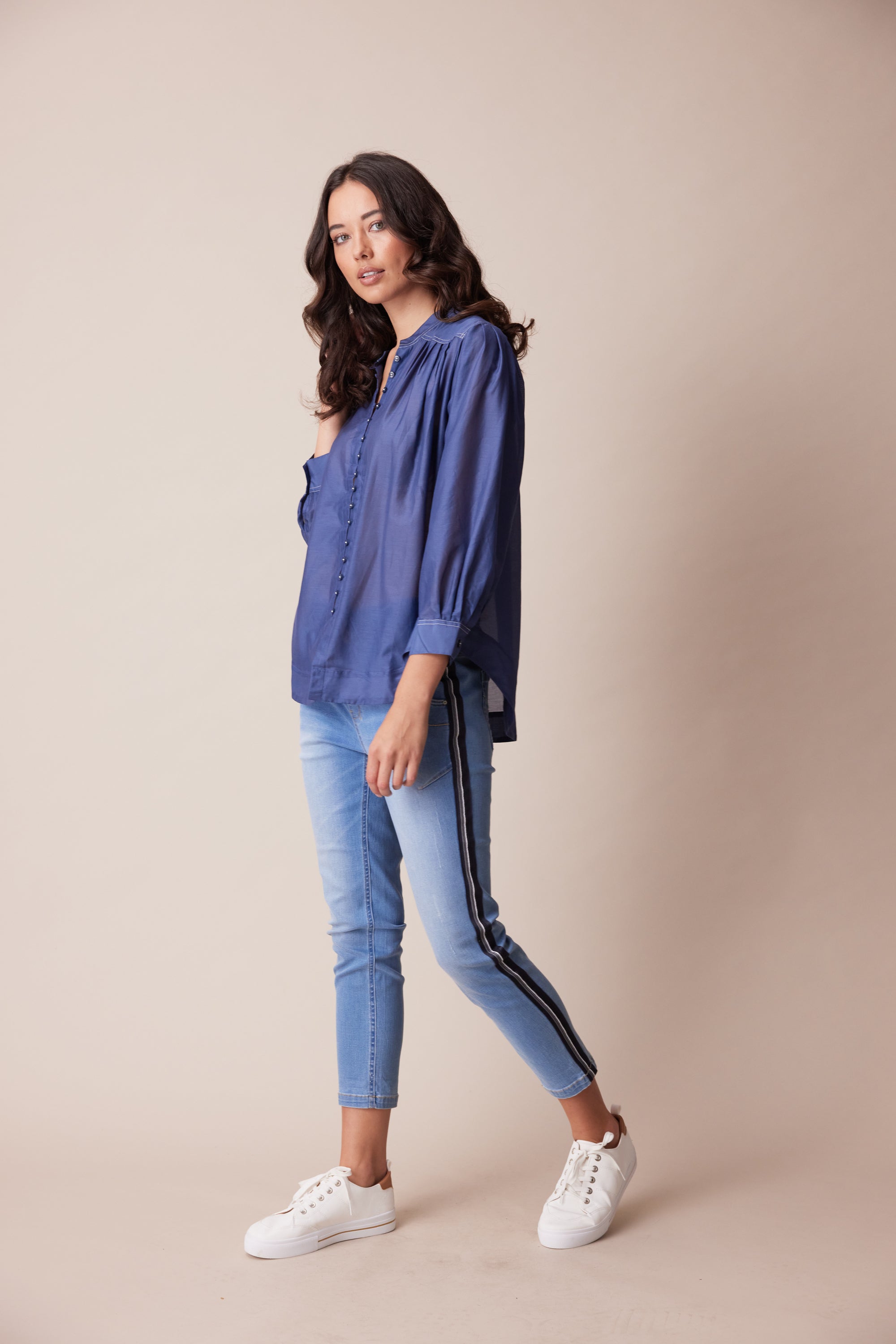 This opulent cotton silk shirt is a refined, feminine style that will elevate your day-to-day look. knife pleats through the bodice and sleeve add volume to the silhouette, anchored by a classic yoke and stand collar with twin needle topstitching. Centre front placket fastens with dyed-to match-buttons, off-set with contrast button stitching.