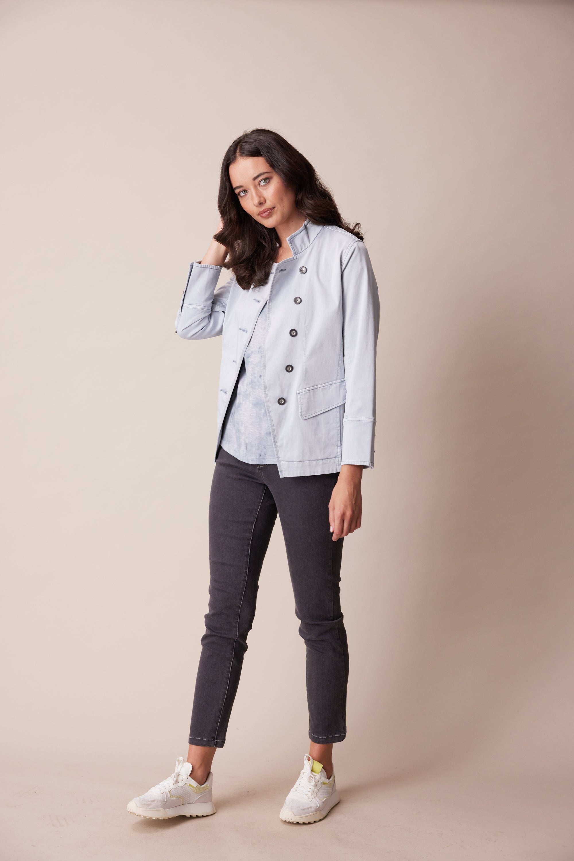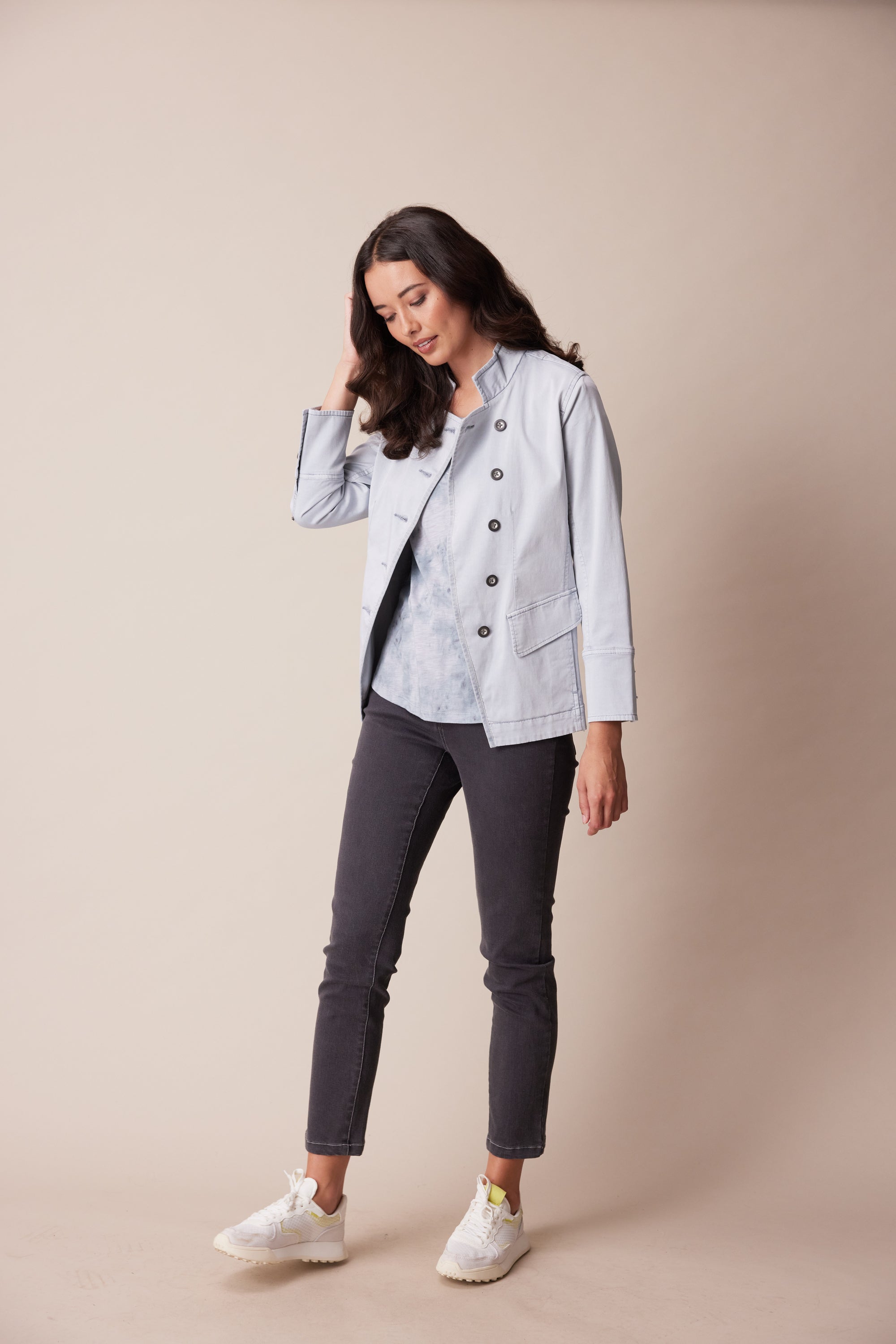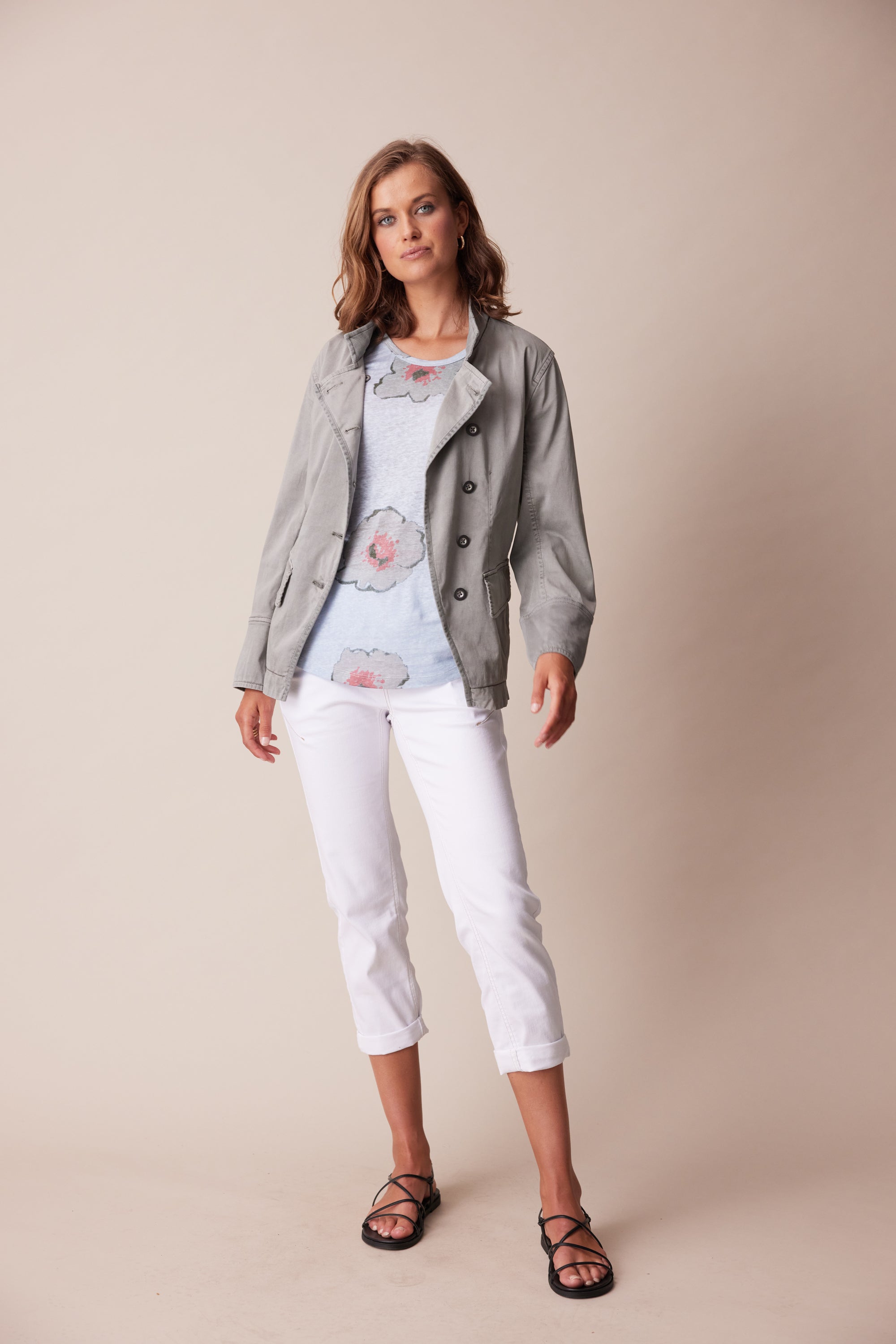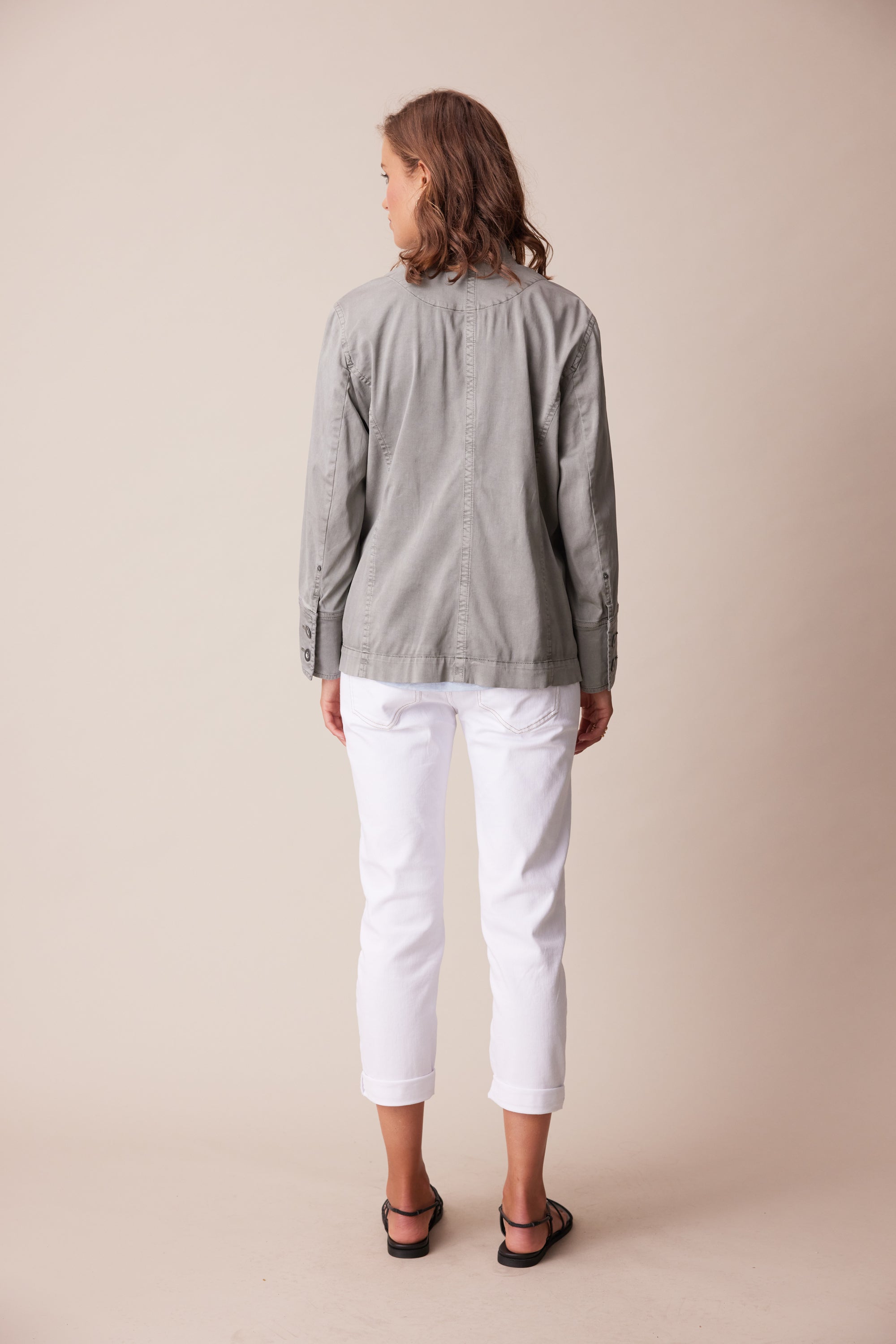 A casual weekend jacket in soft stretch cotton modal. Featuring side pockets with decorative flaps, topstitched panel seams and metal hardware. This style is garment-dyed to achieve a distressed look and soft hand feel.