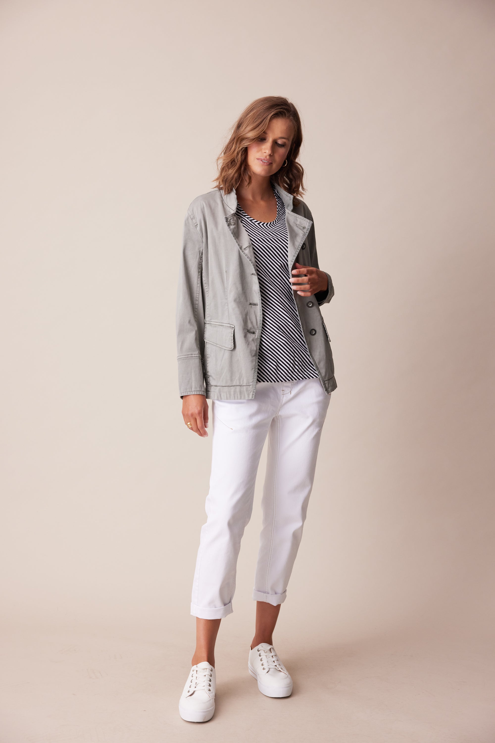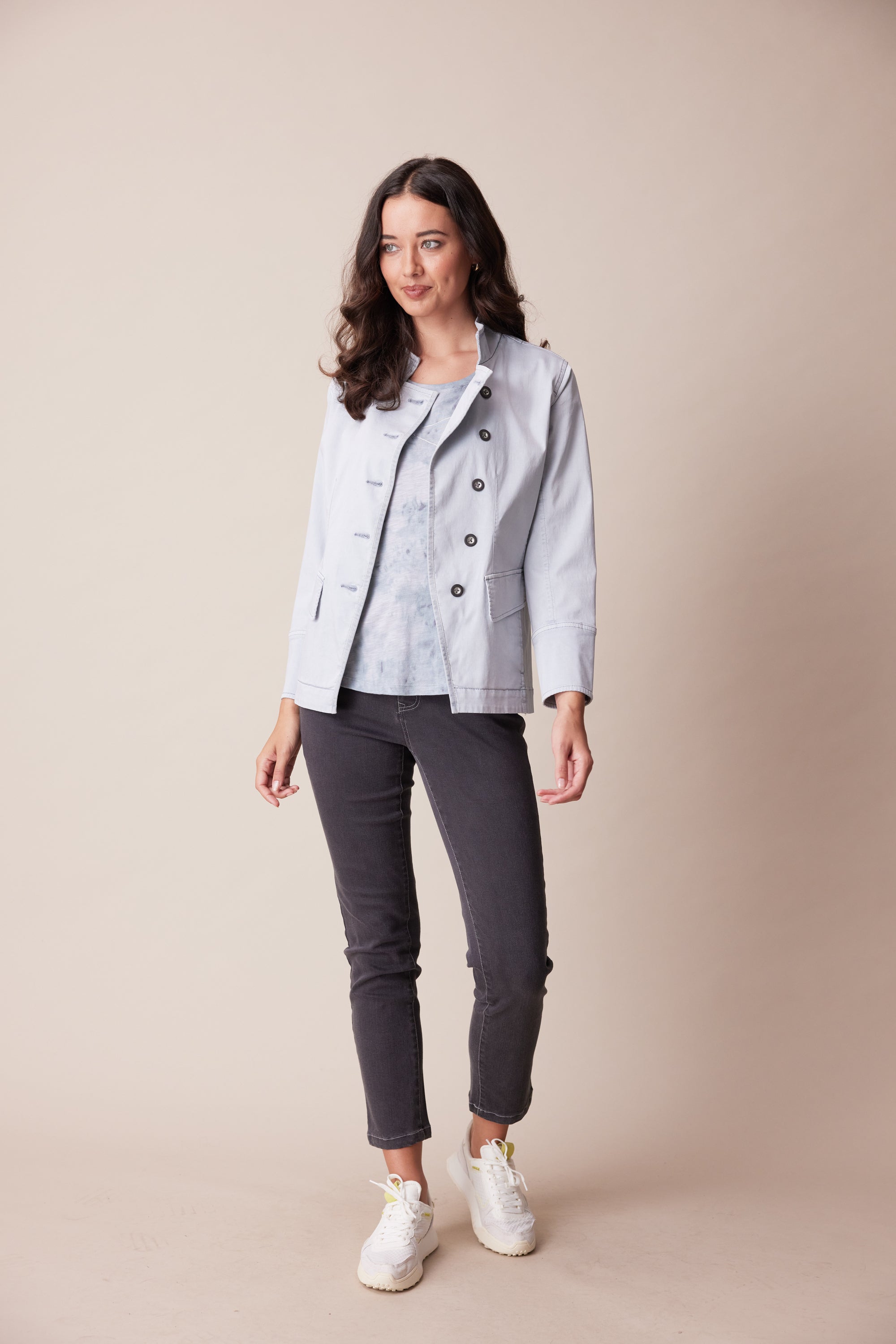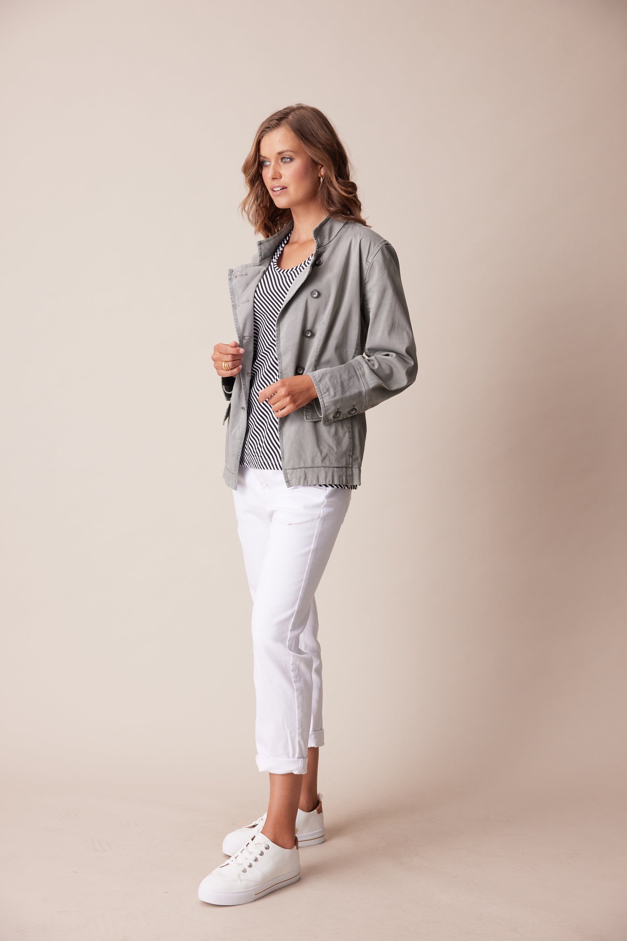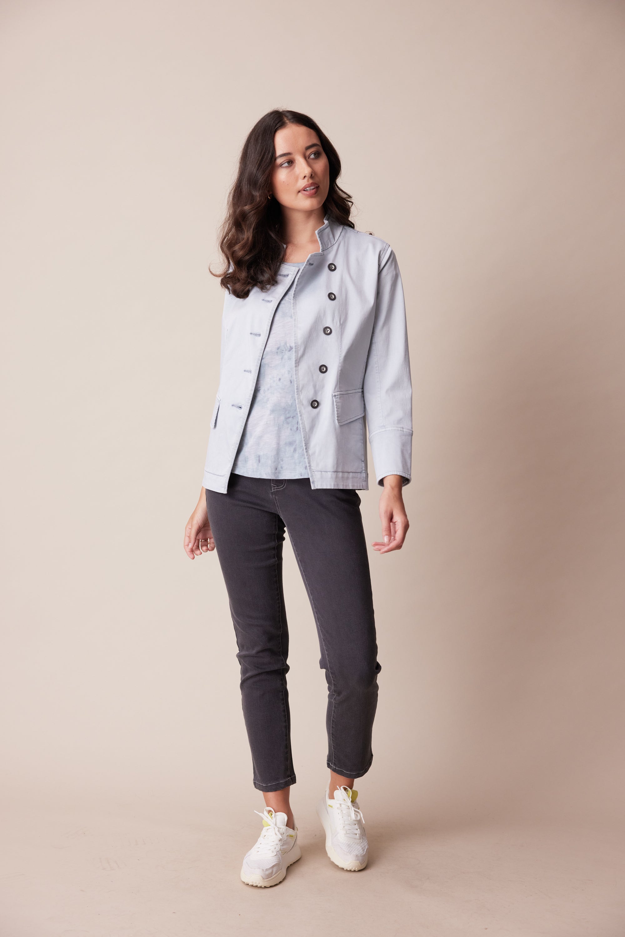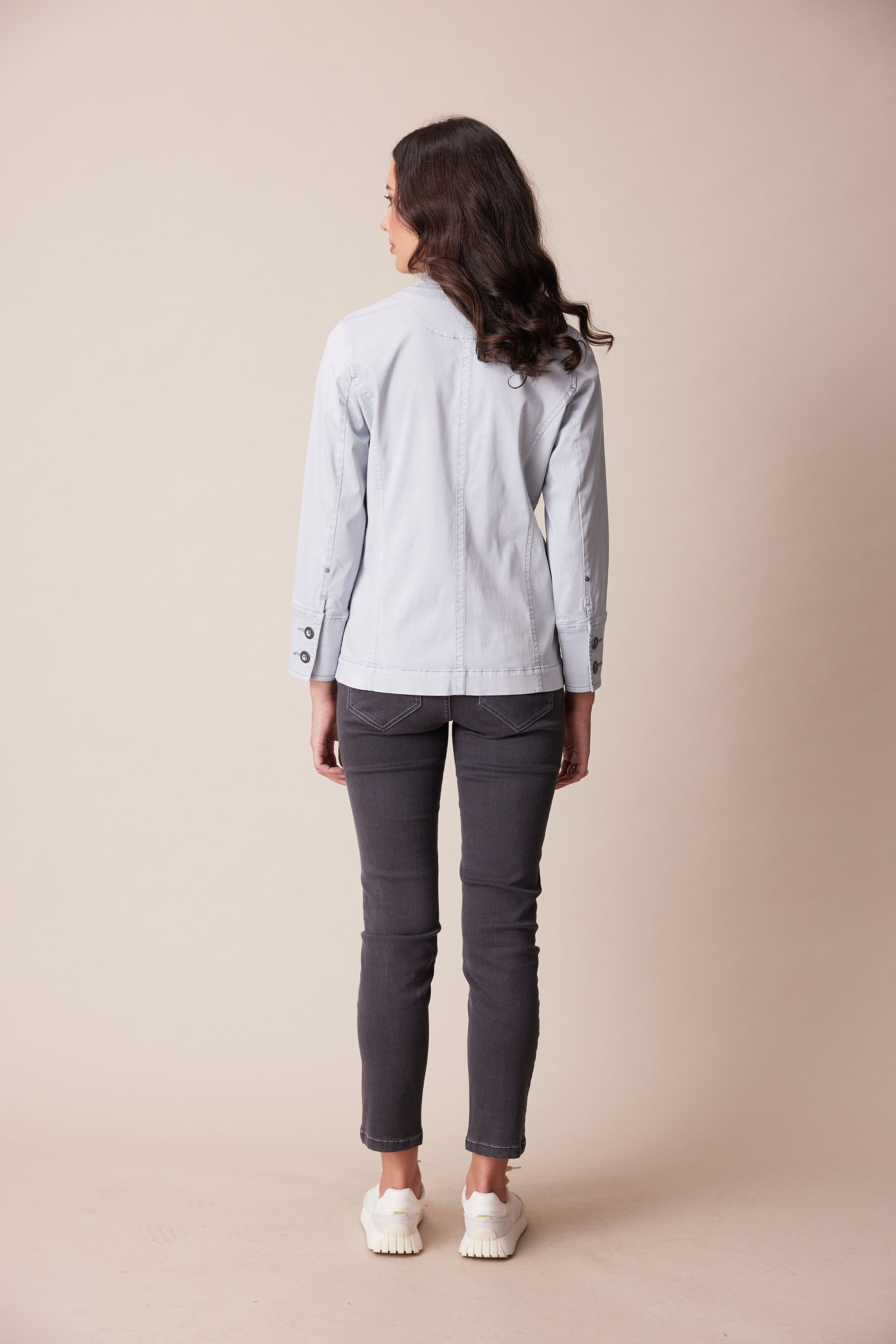 A casual weekend jacket in soft stretch cotton modal. Featuring side pockets with decorative flaps, topstitched panel seams and metal hardware. This style is garment-dyed to achieve a distressed look and soft hand feel.