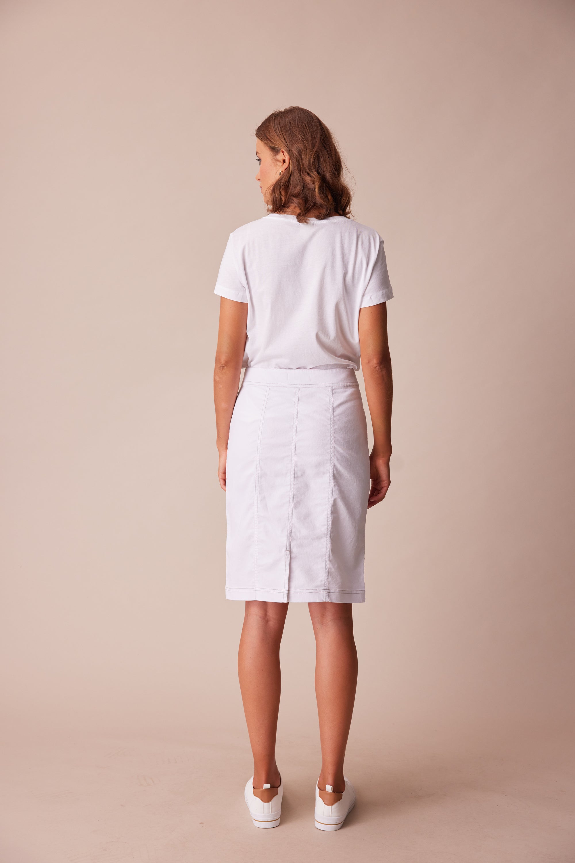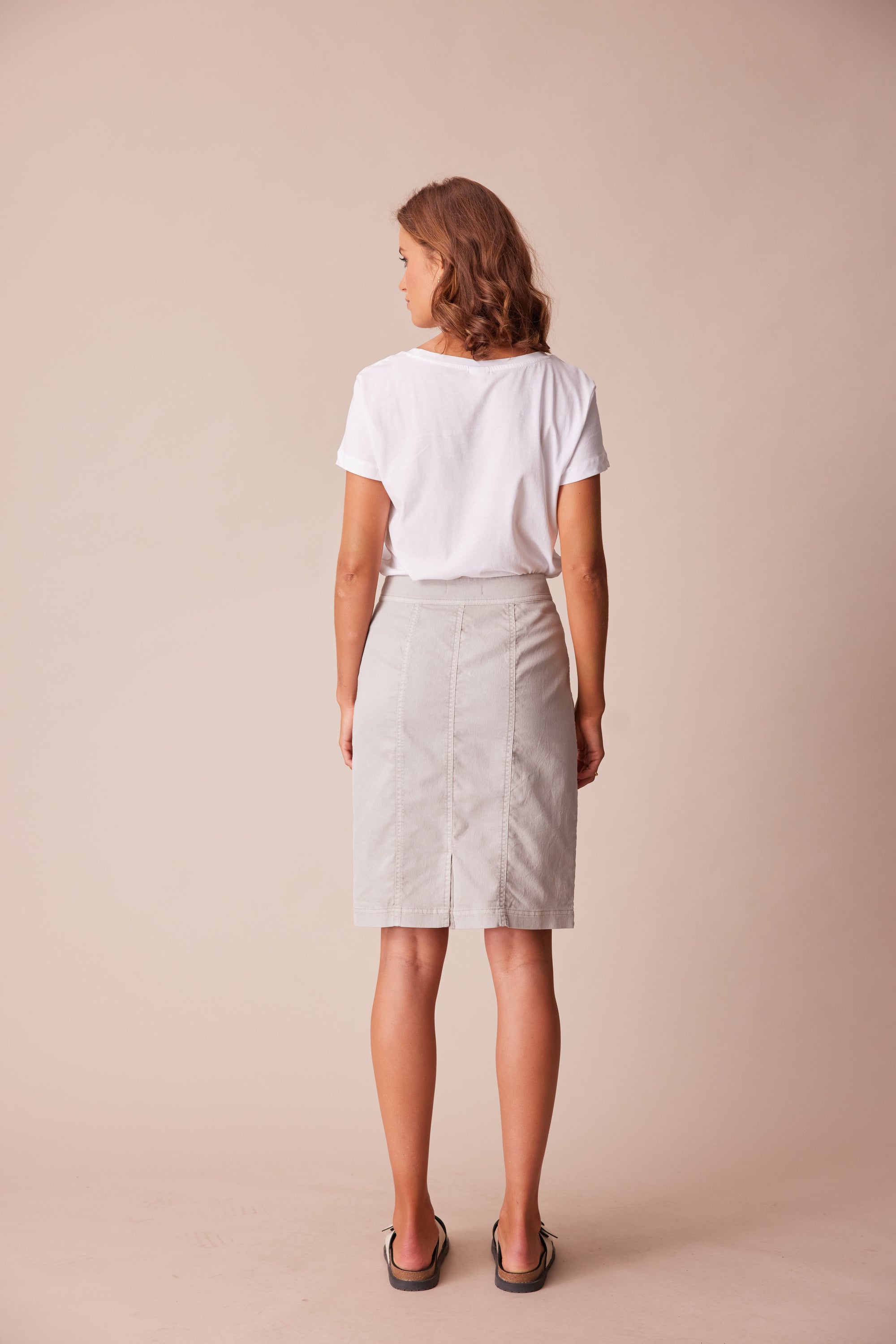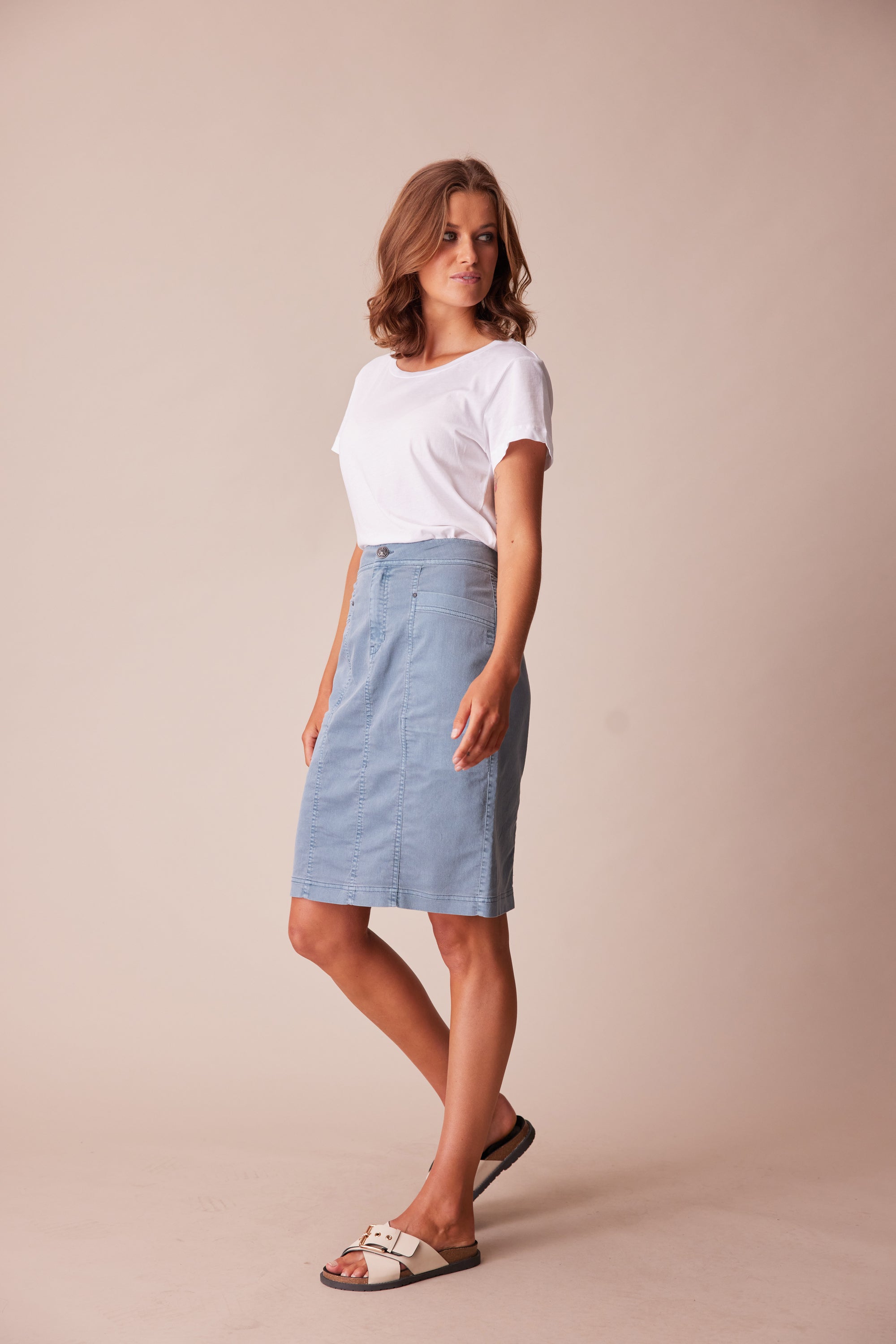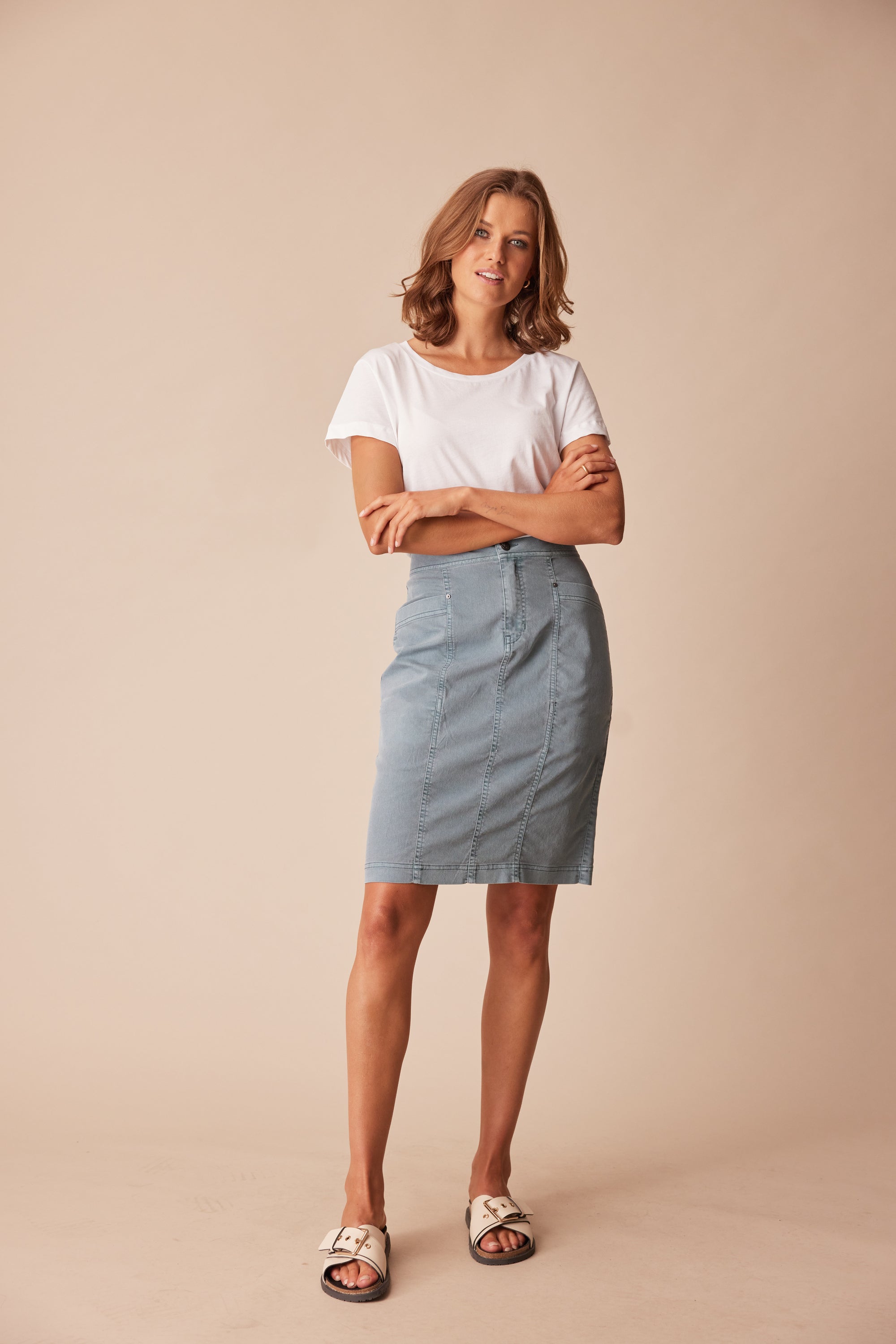 A fitted knee-length skirt with fly front opening and ultra-modern twin stitched panelling. This style is garment-dyed to achieve a distressed look and soft hand feel.