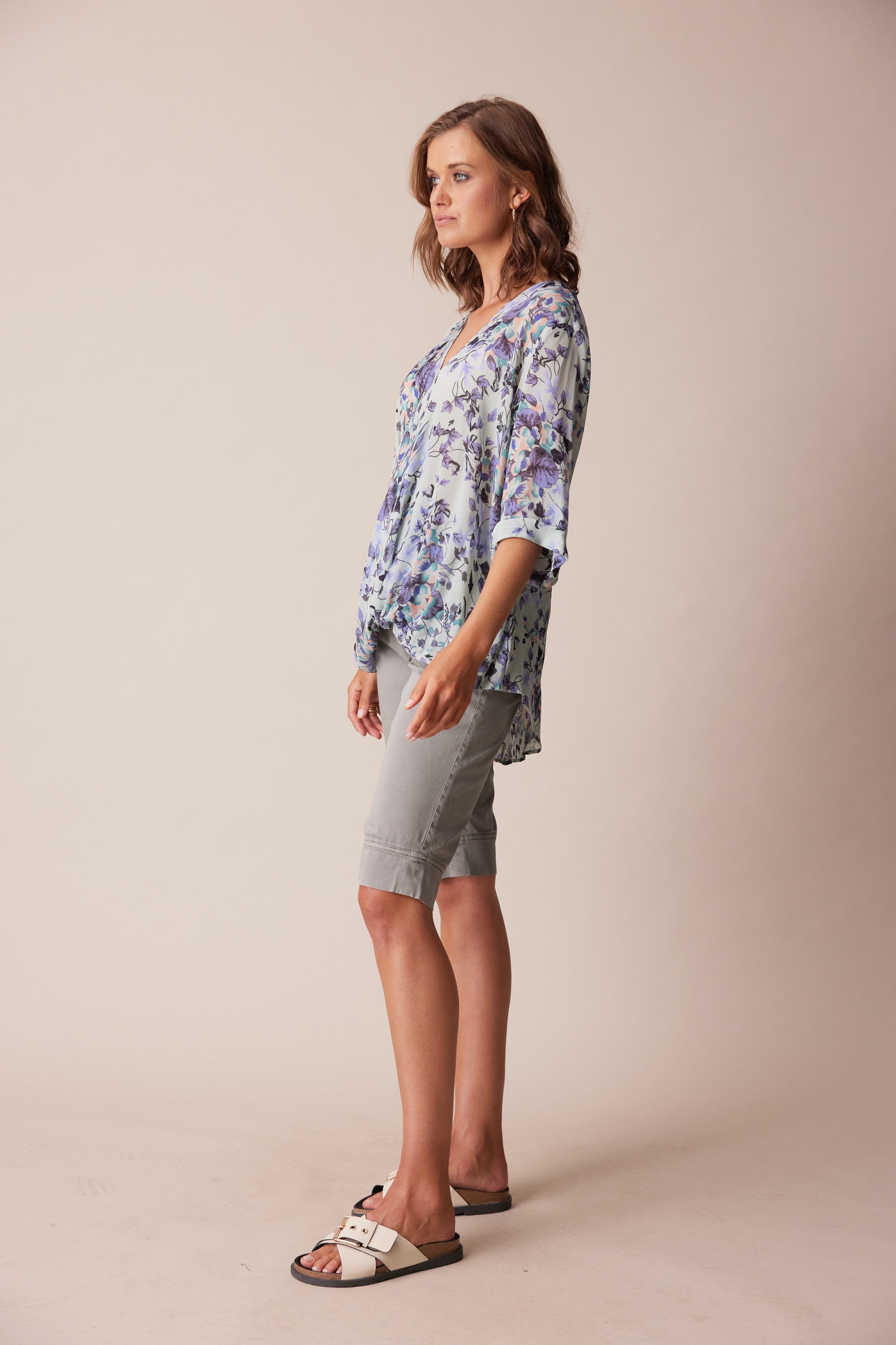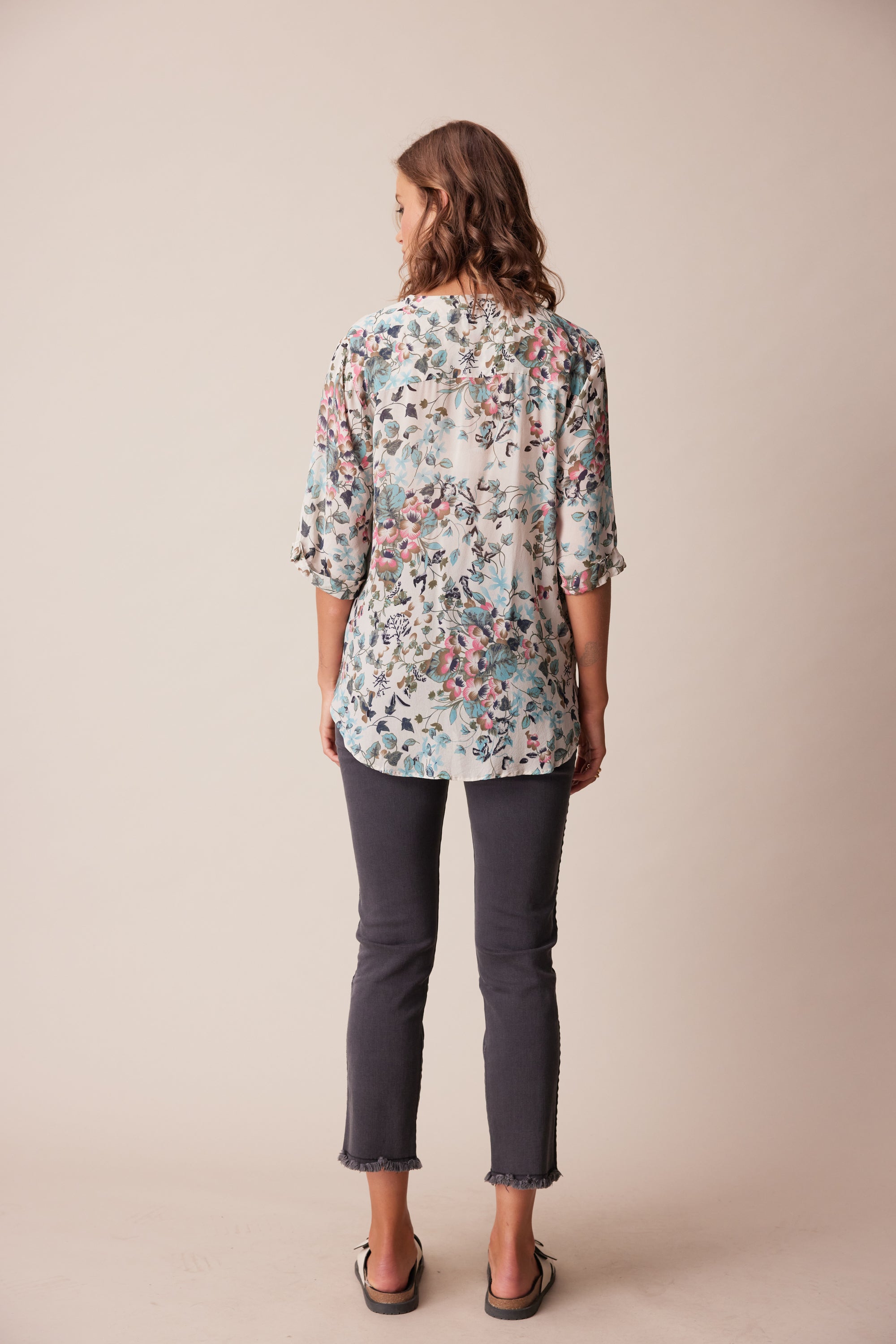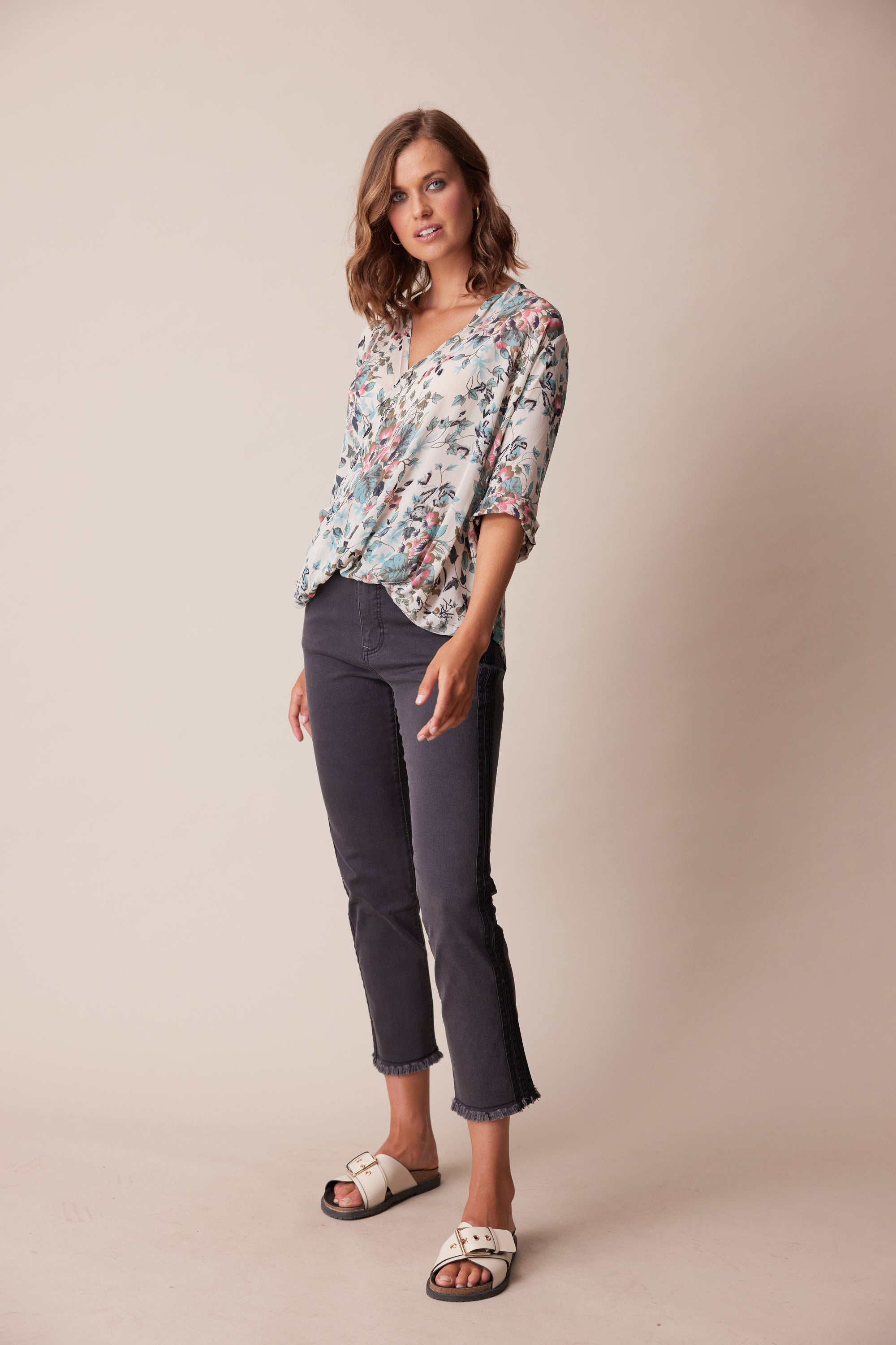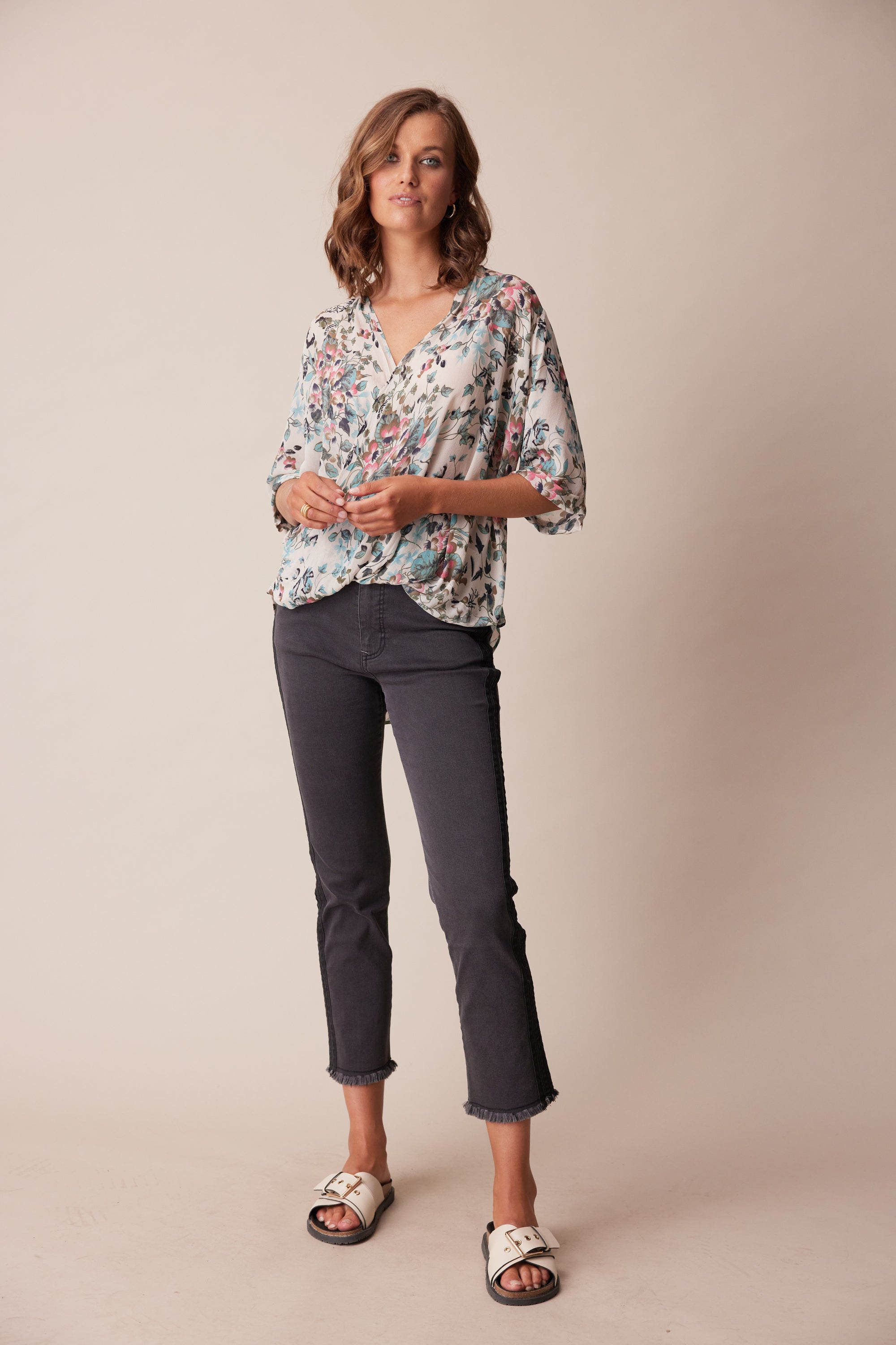 The enchanted Ivy print is imagined here in a floaty georgette, beautifully draped to form a wrap-front & deep V-neck top. Featuring a curved back hemline and elbow length sleeves with turn-up cuff.