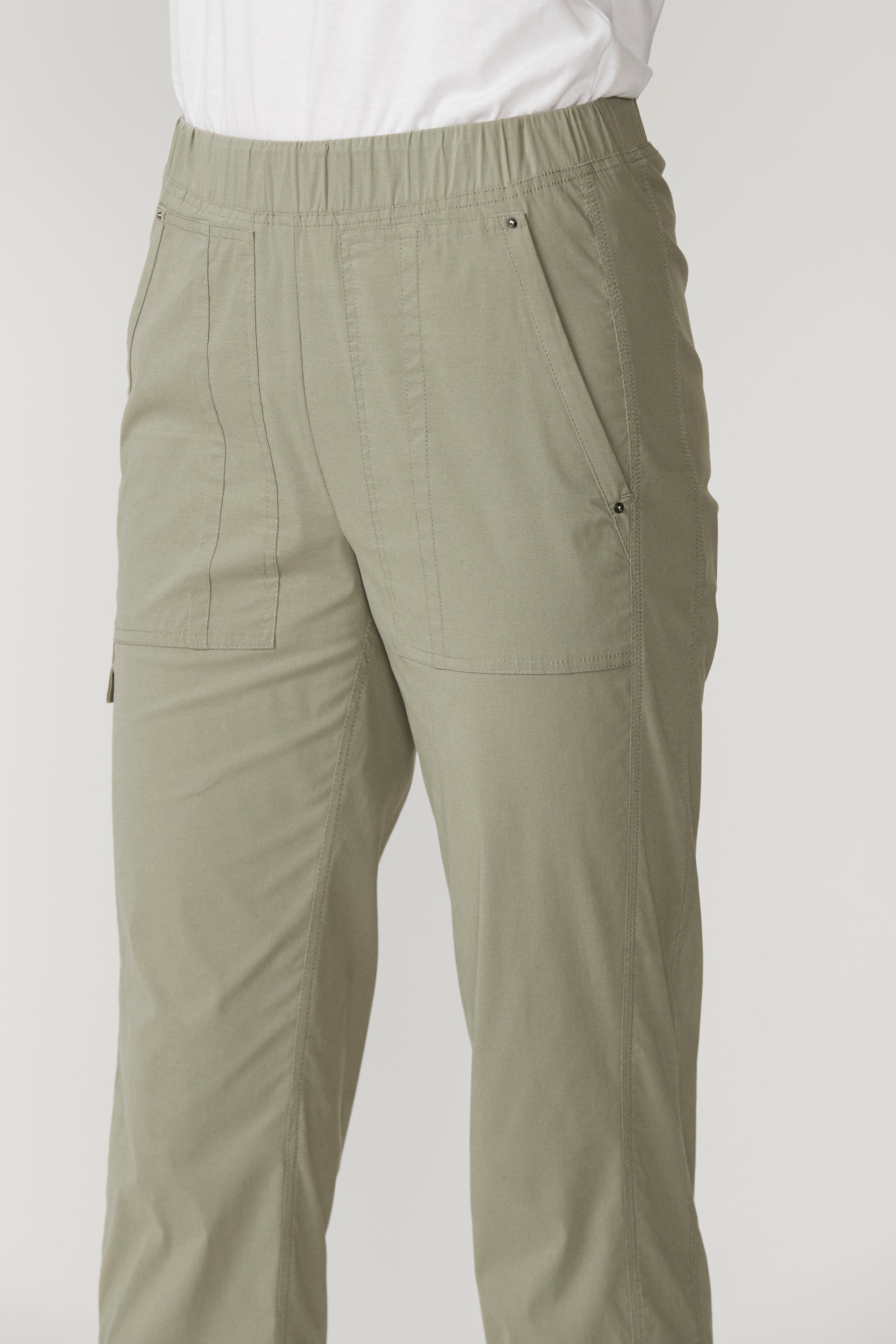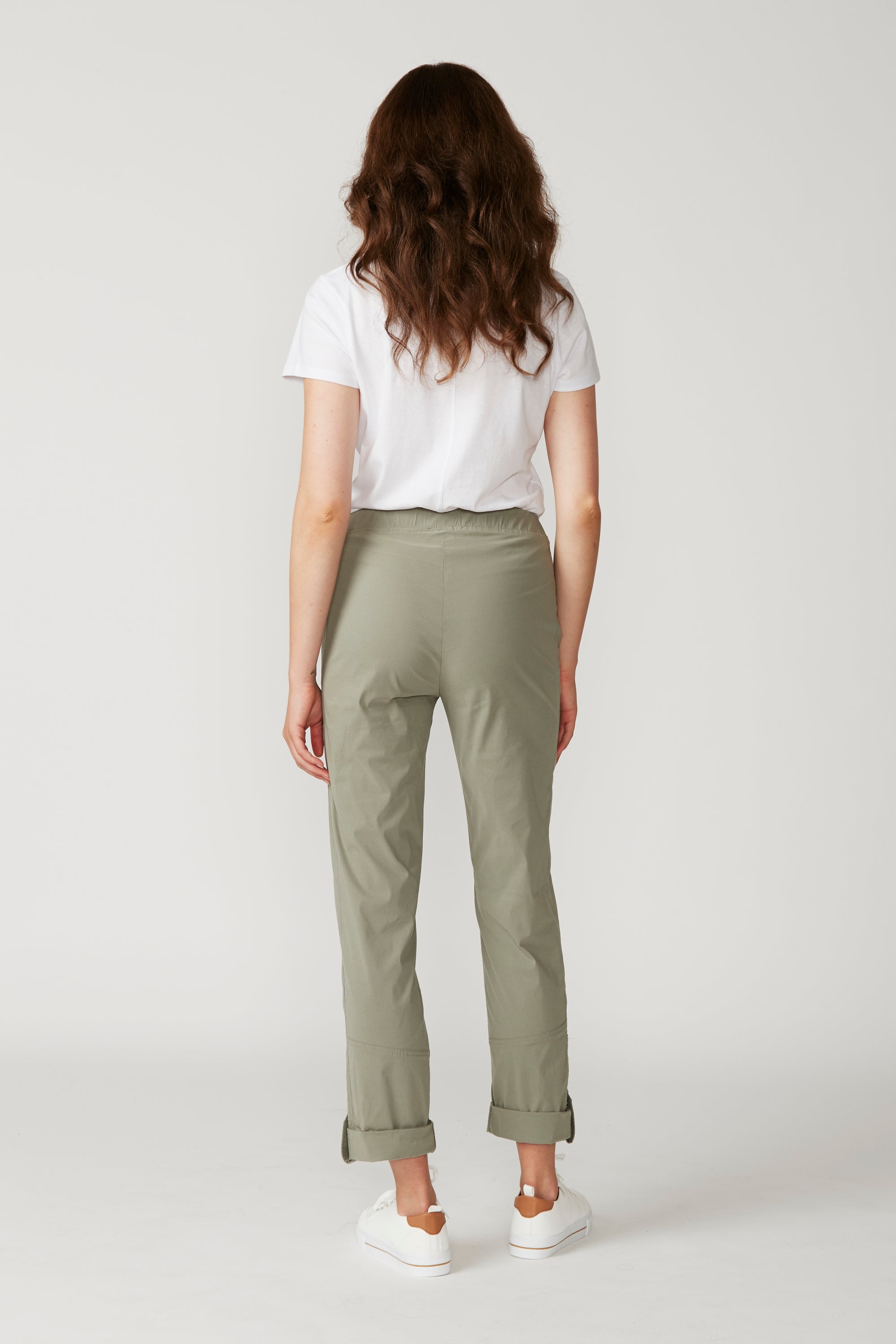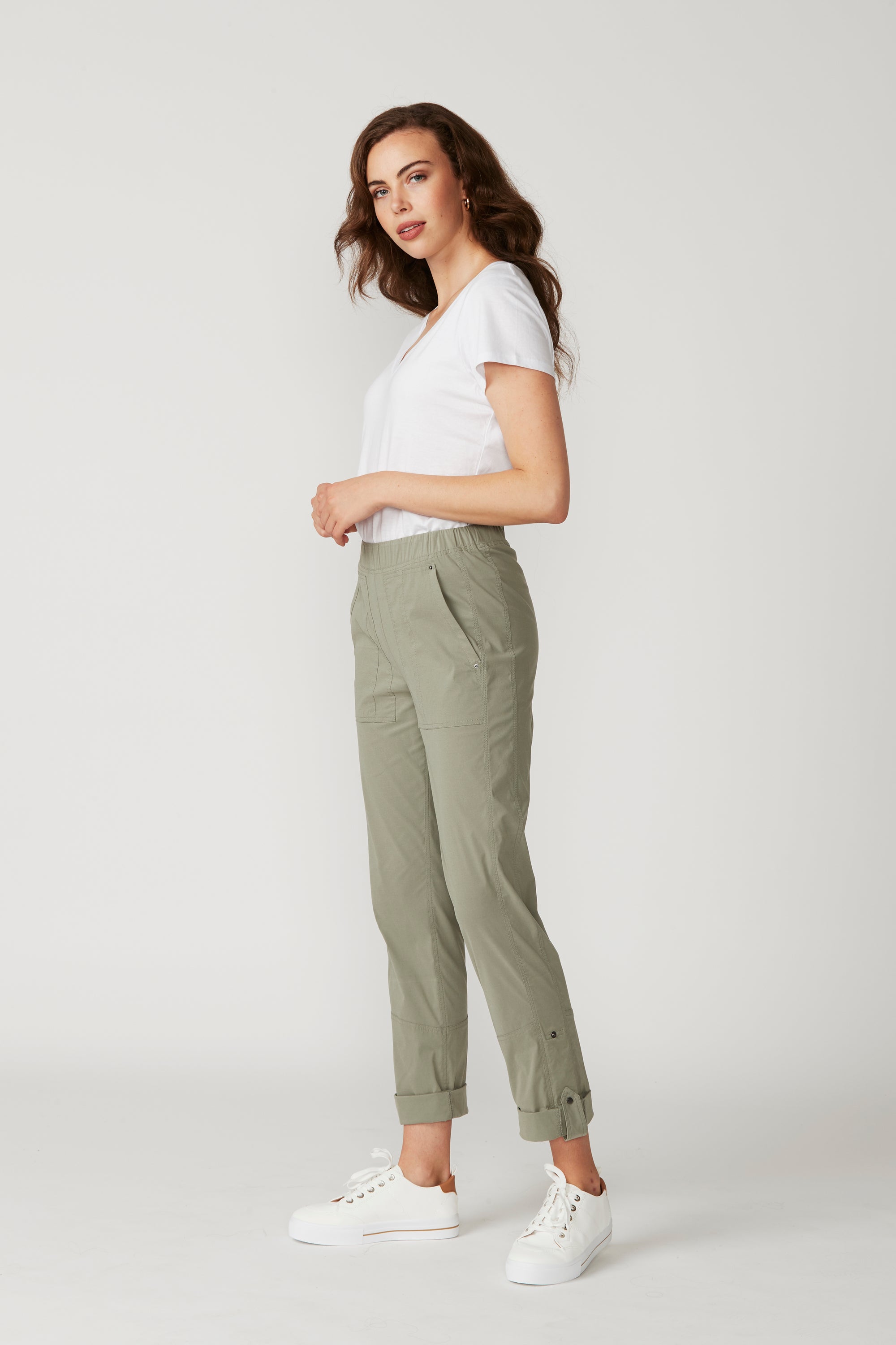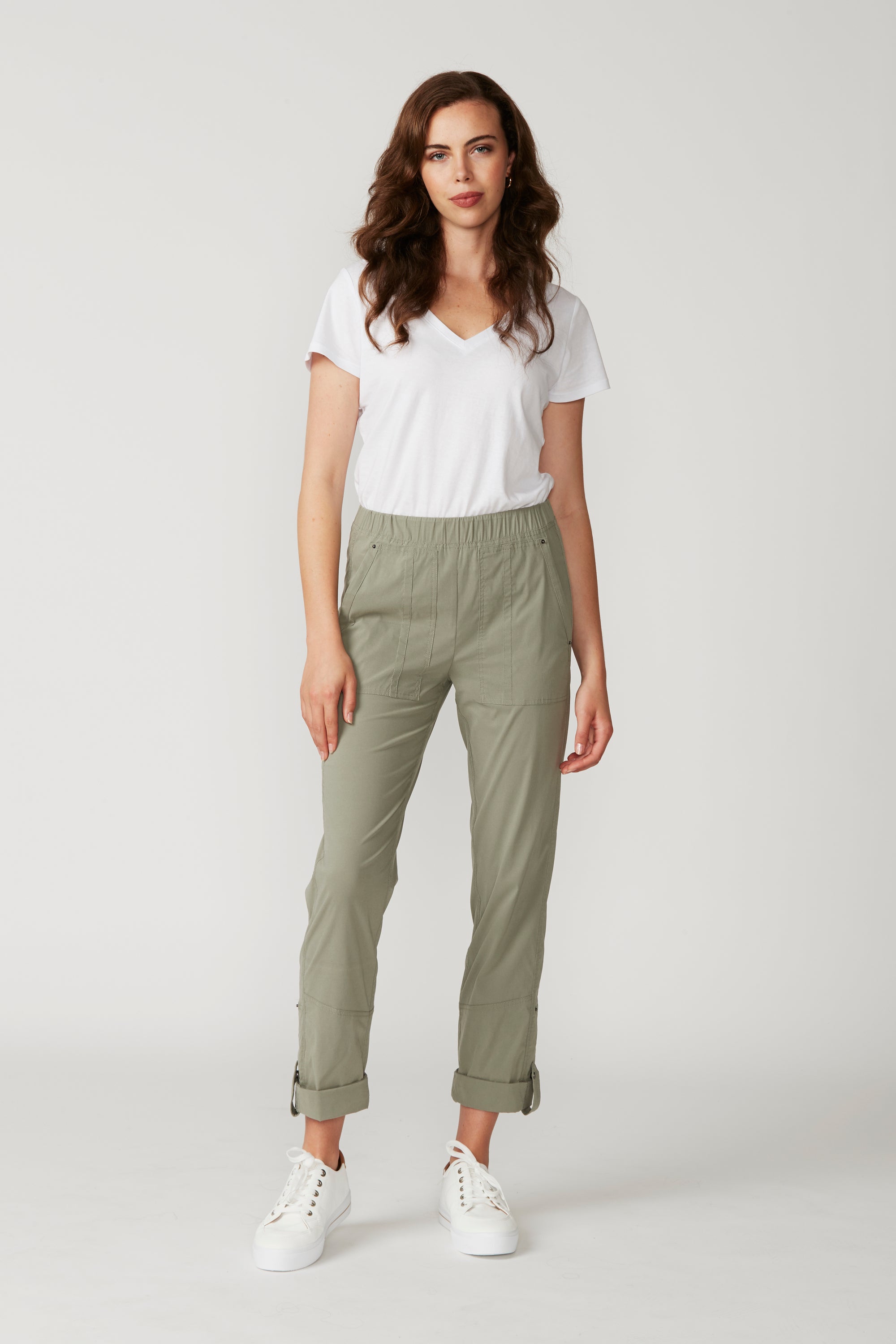 The LTL cargo pant – features elasticated waist, front pocket and relaxed leg with a functional hem tab option at the cuff, antique nickel hardware. Perfect lightweight cotton rich stretch pant for everyday.