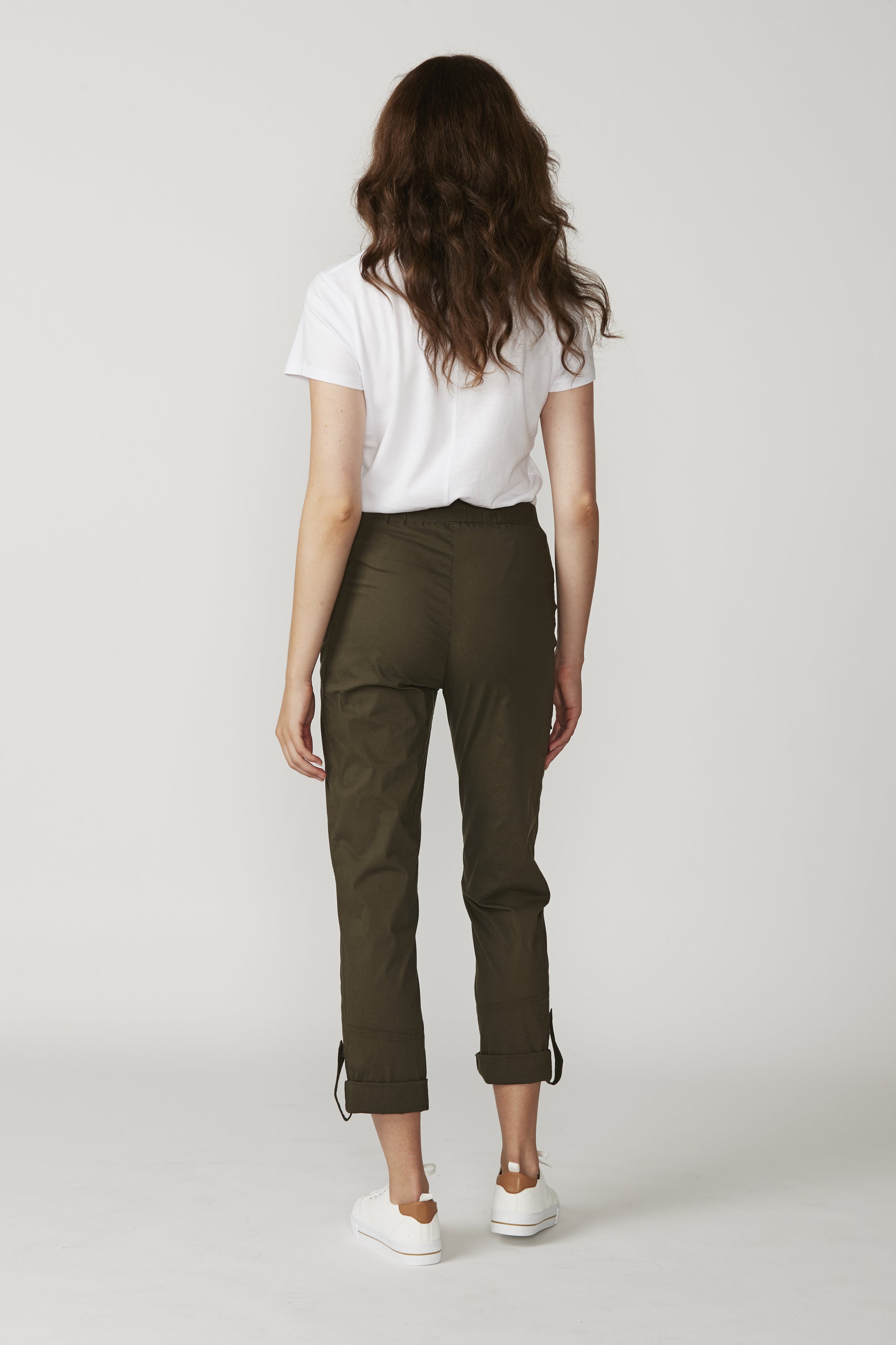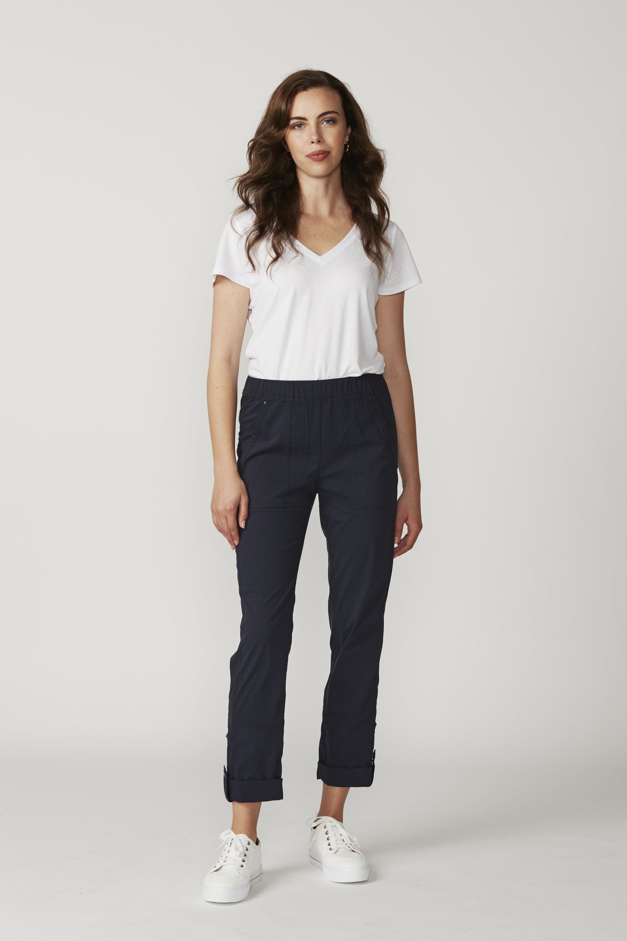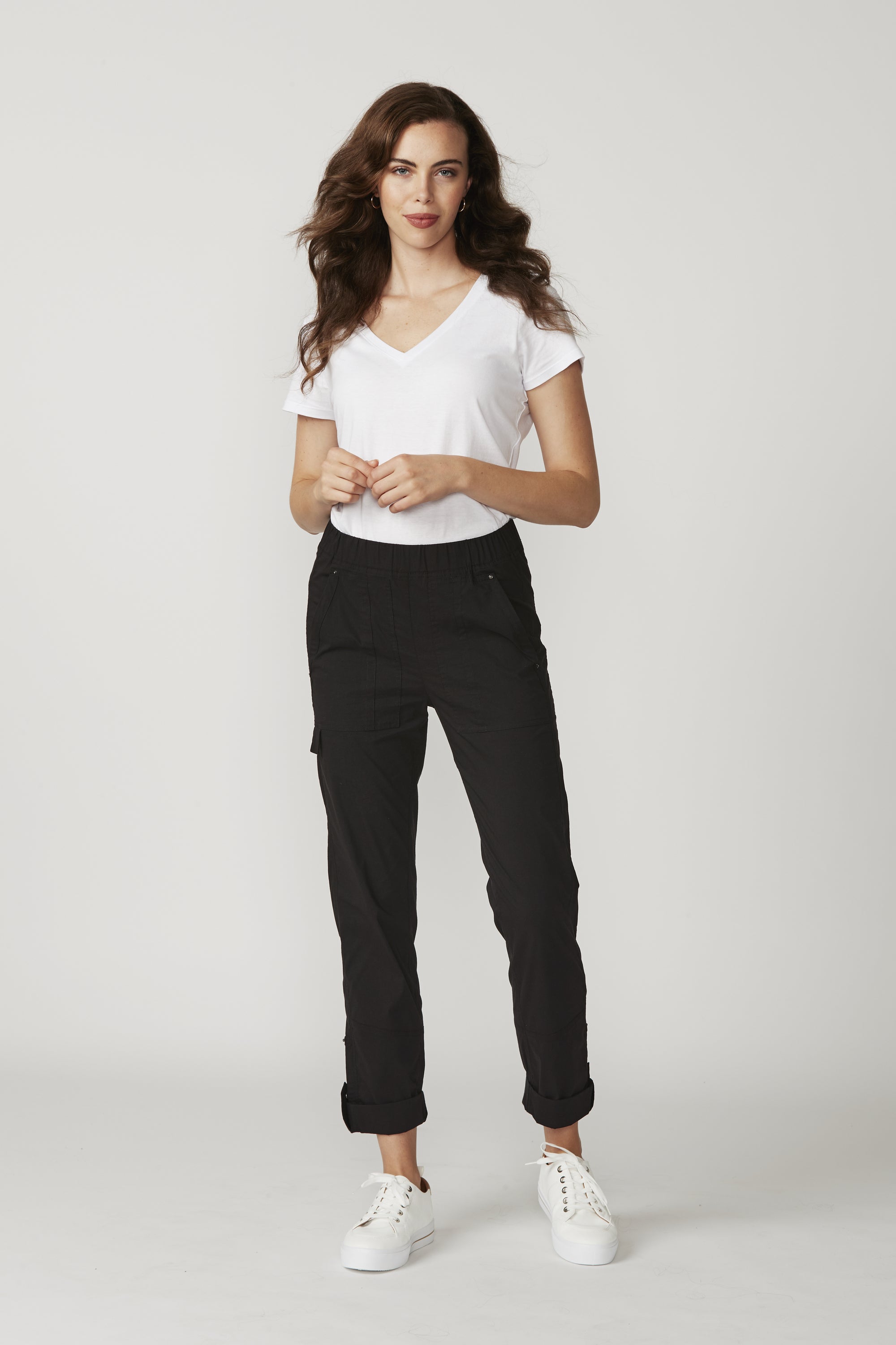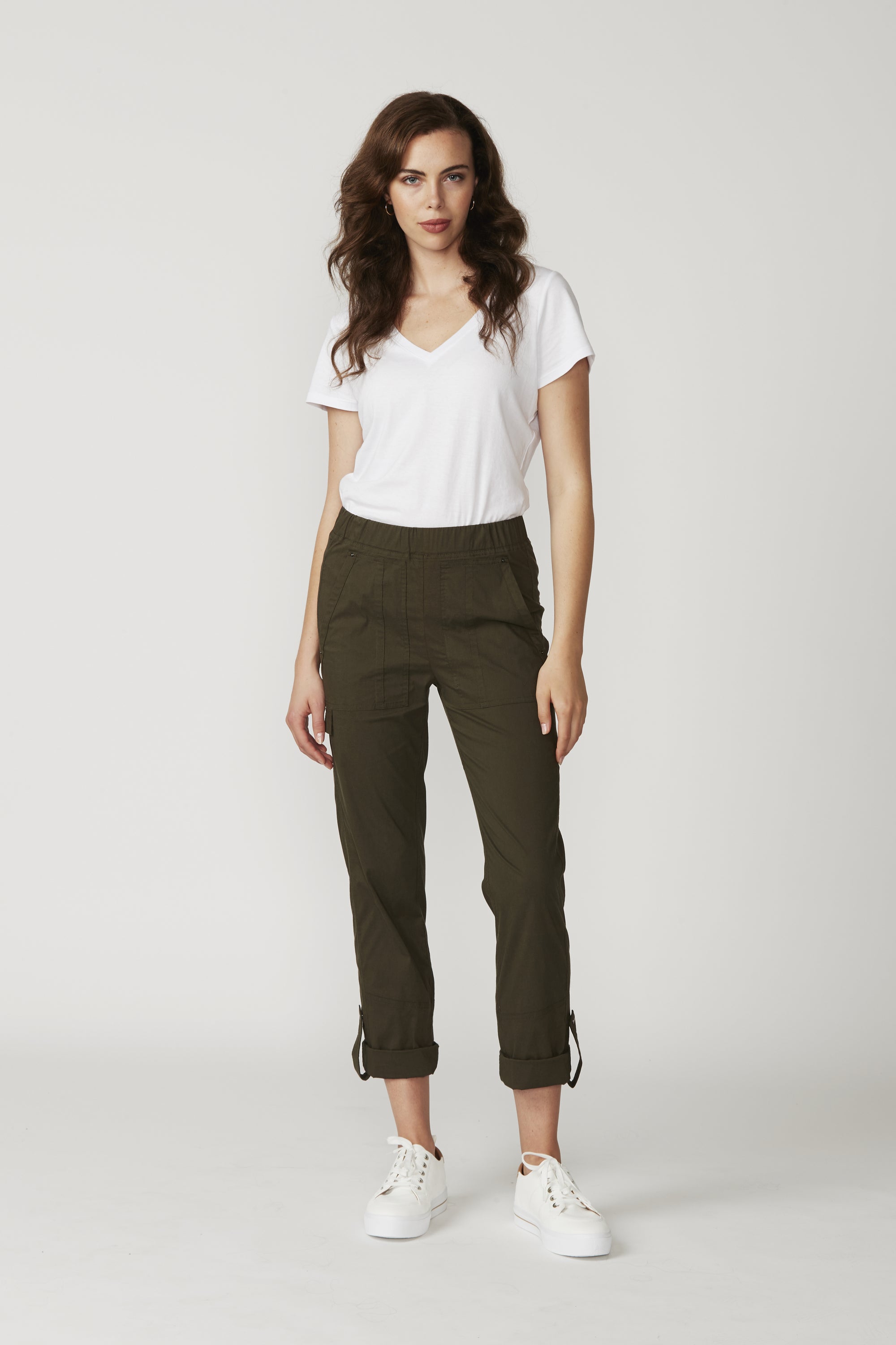 The LTL cargo pant – features elasticated waist, front pocket and relaxed leg with a functional hem tab option at the cuff, antique nickel hardware. Perfect lightweight cotton rich stretch pant for everyday.