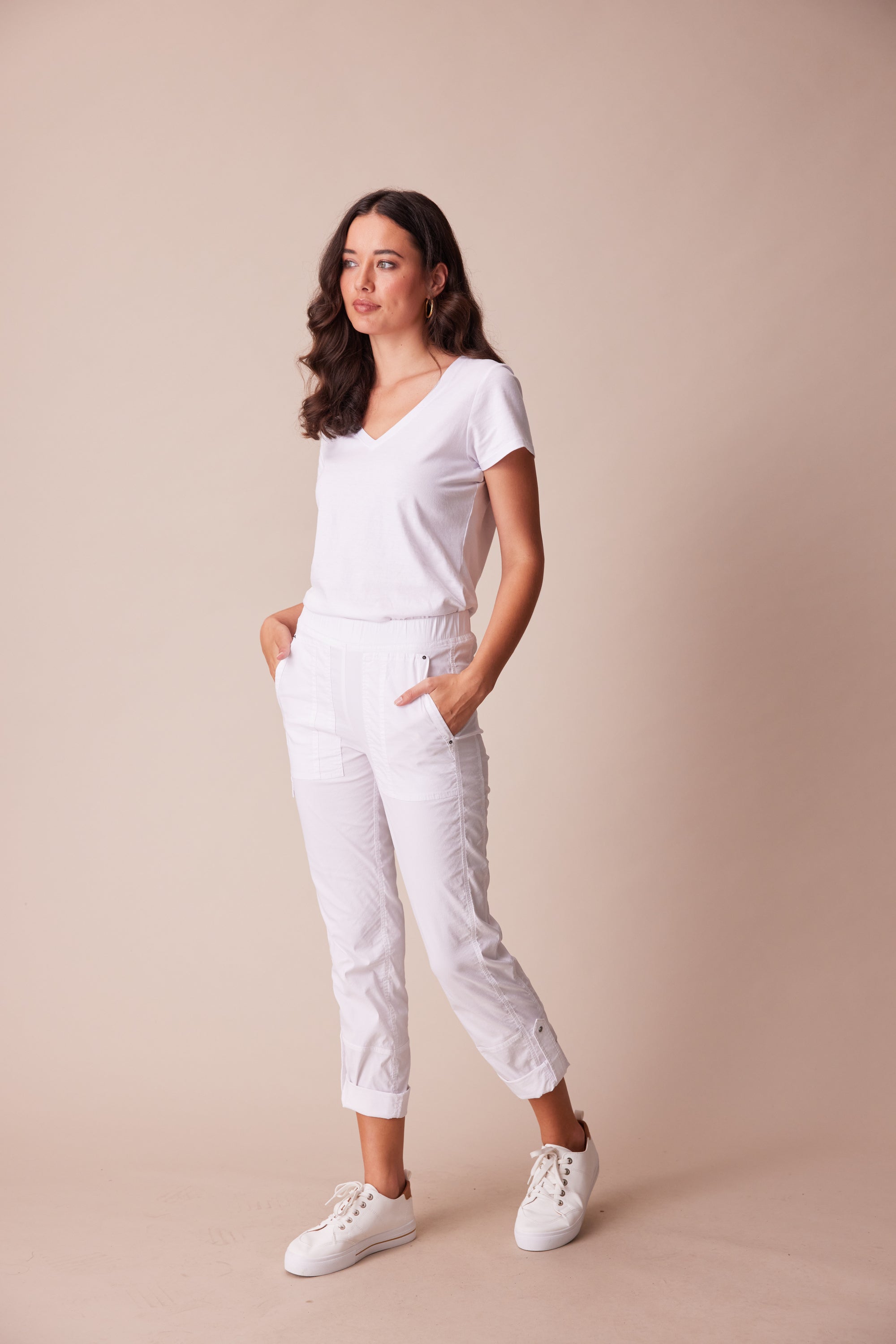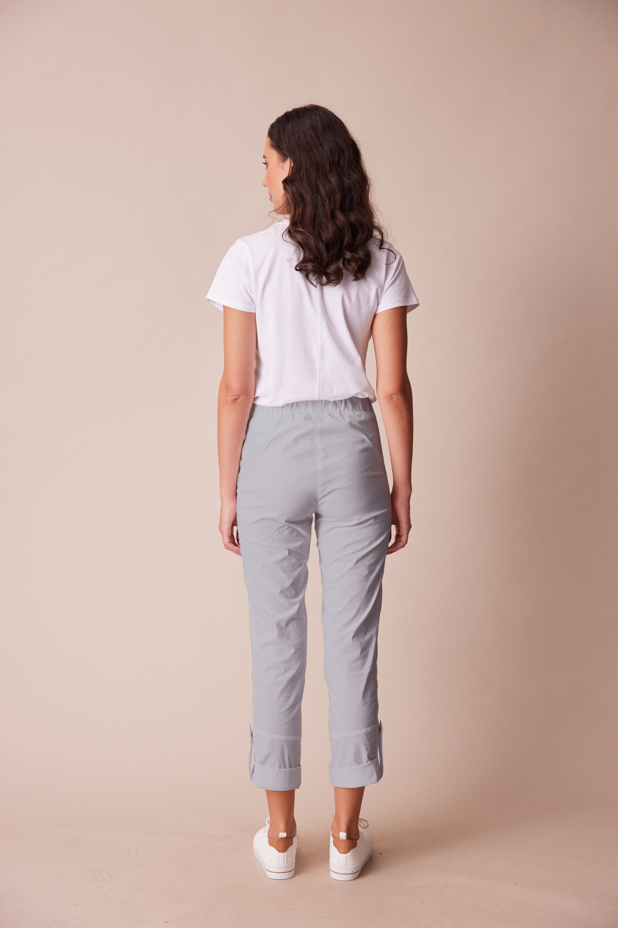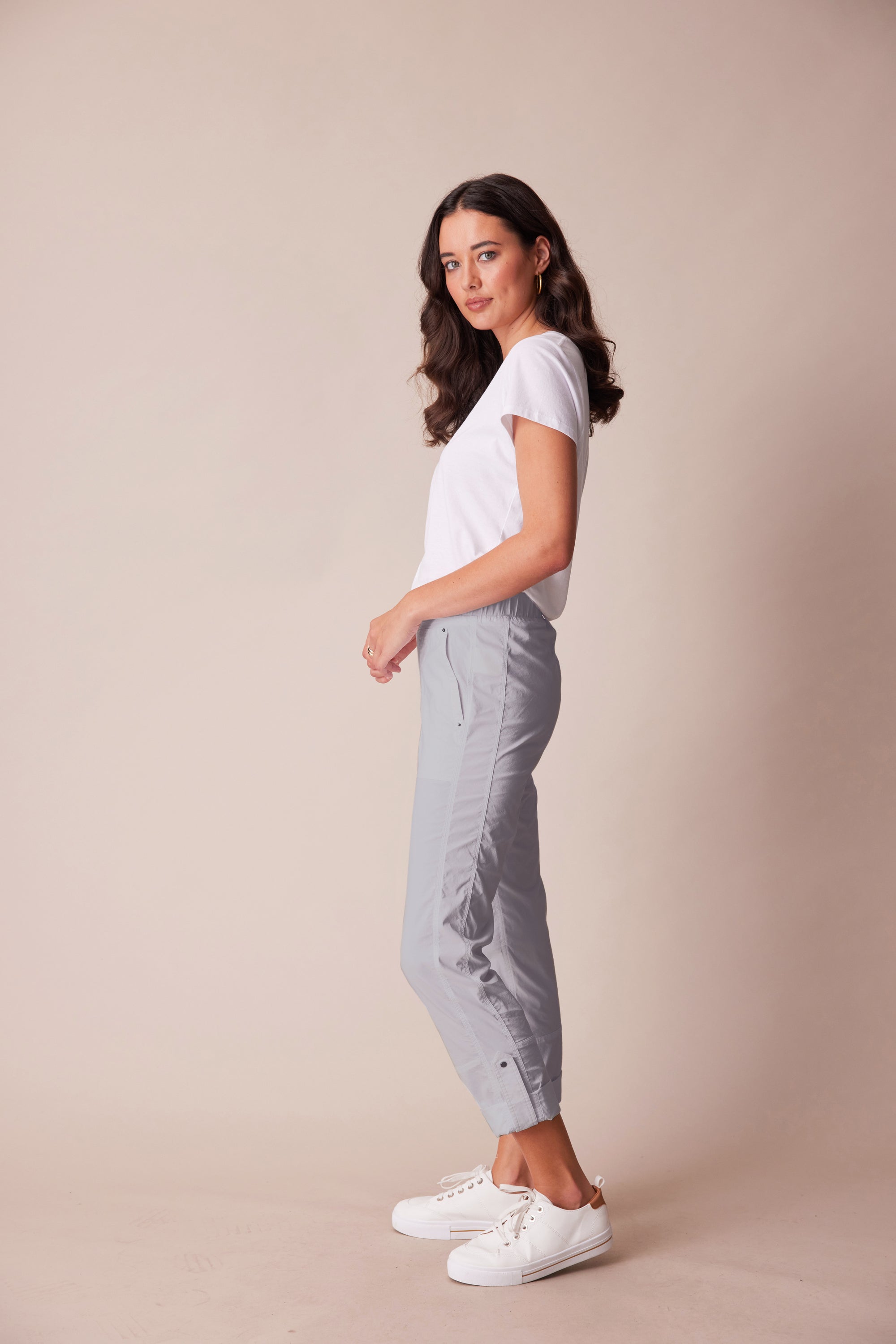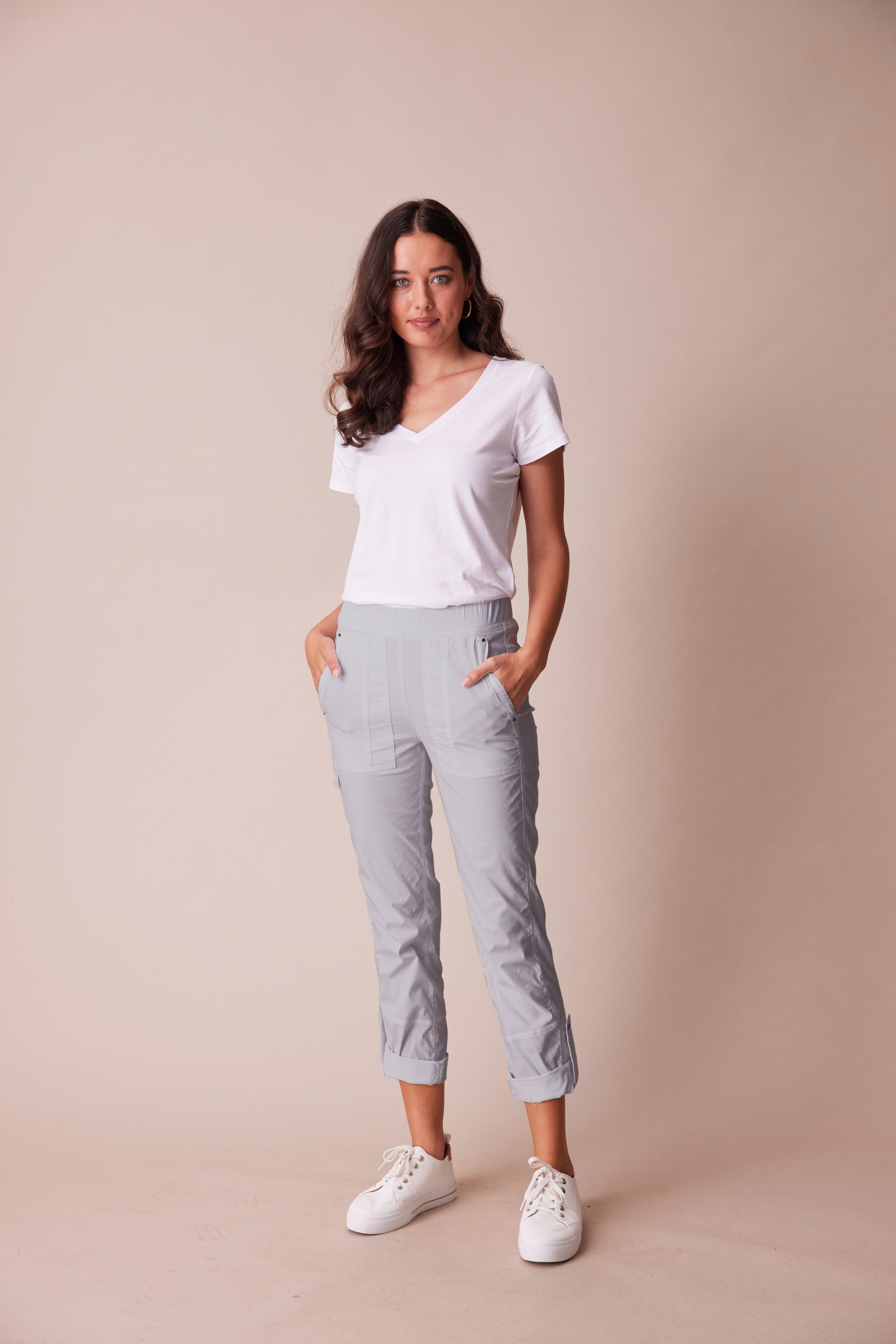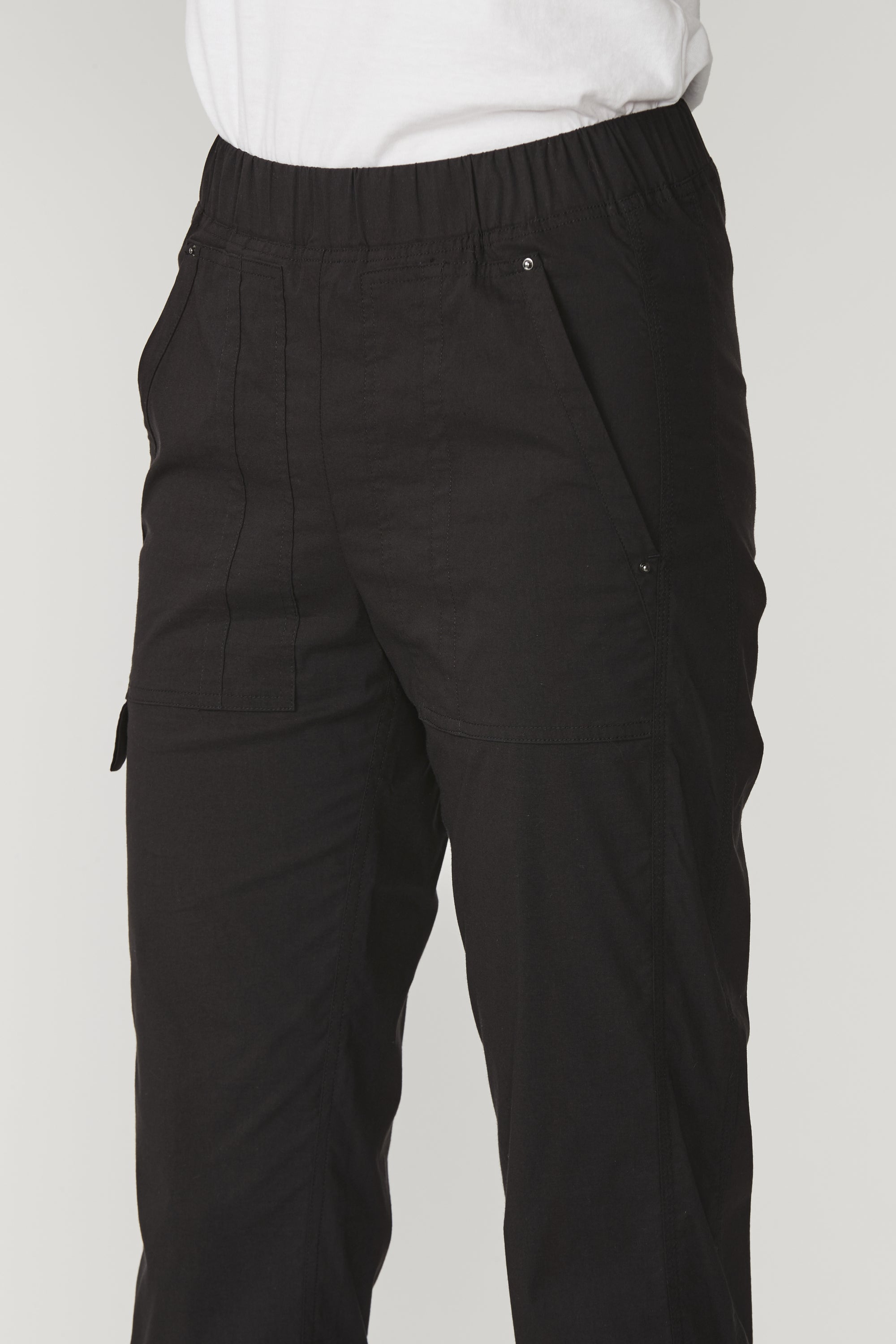 The LTL cargo pant – features elasticated waist, front pocket and relaxed leg with a functional hem tab option at the cuff, antique nickel hardware. Perfect lightweight cotton rich stretch pant for everyday.