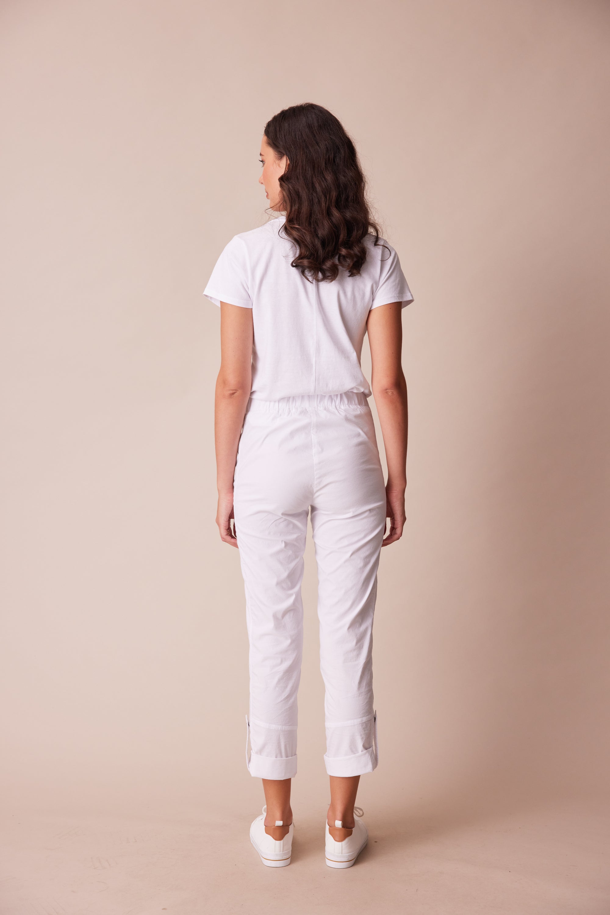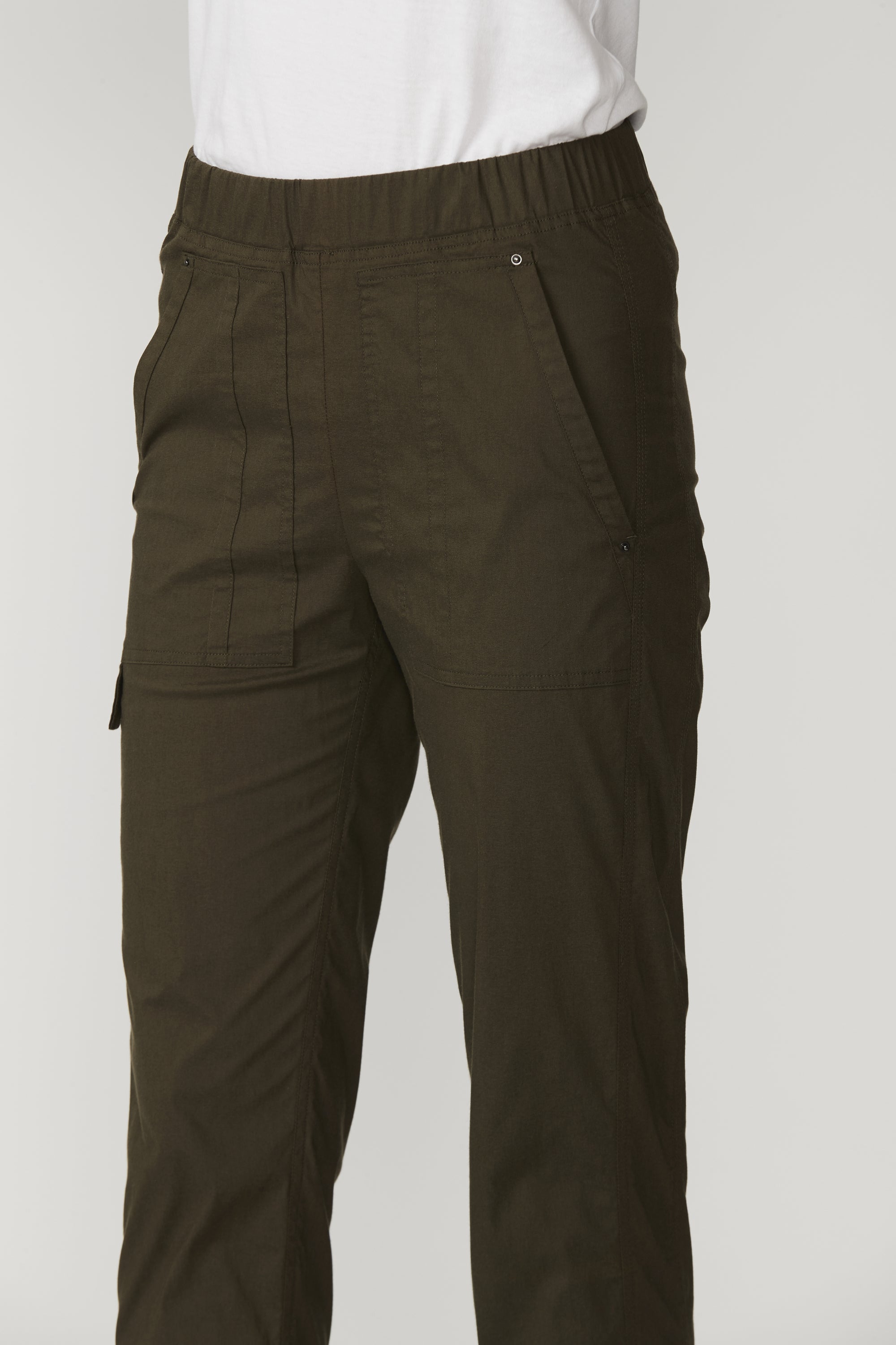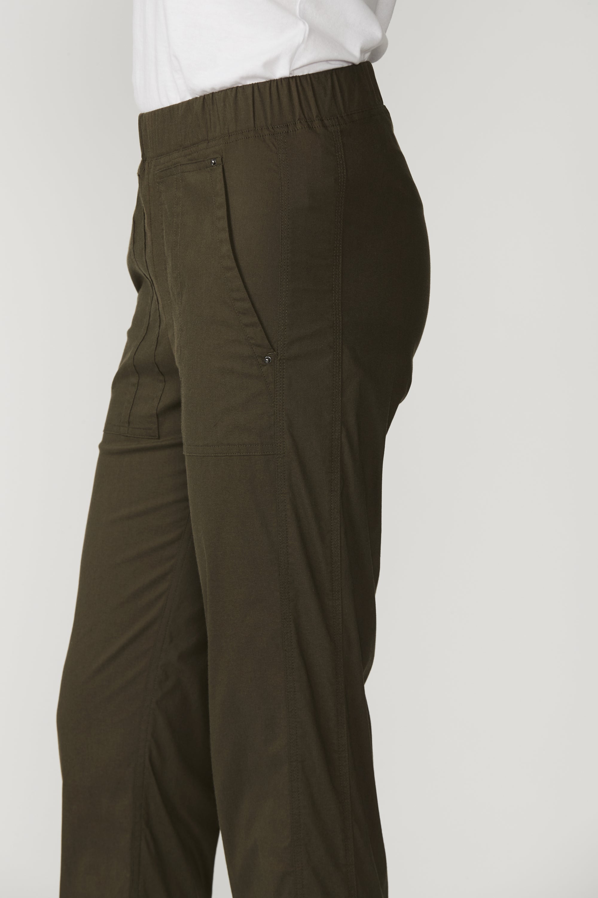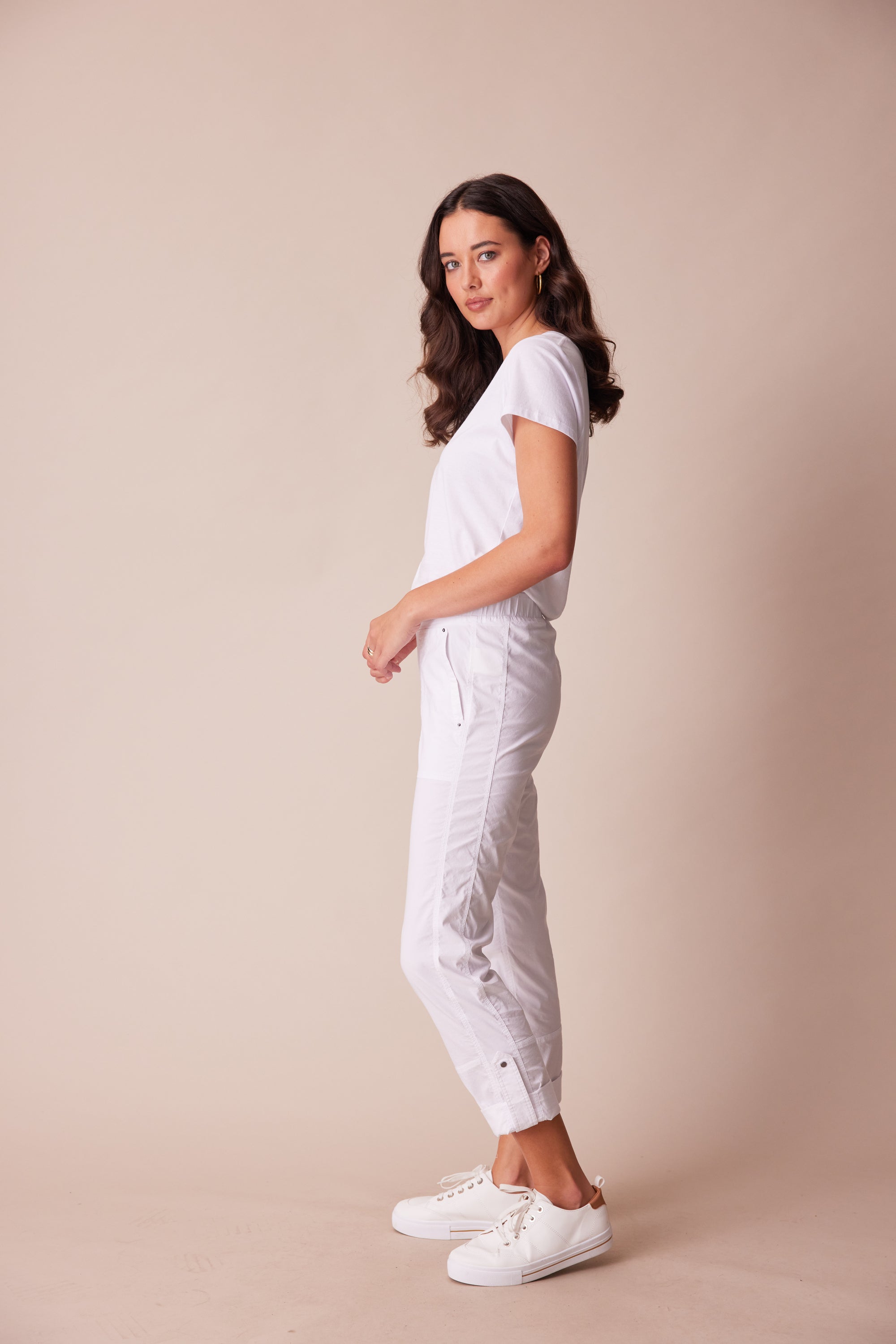 The LTL cargo pant – features elasticated waist, front pocket and relaxed leg with a functional hem tab option at the cuff, antique nickel hardware. Perfect lightweight cotton rich stretch pant for everyday.