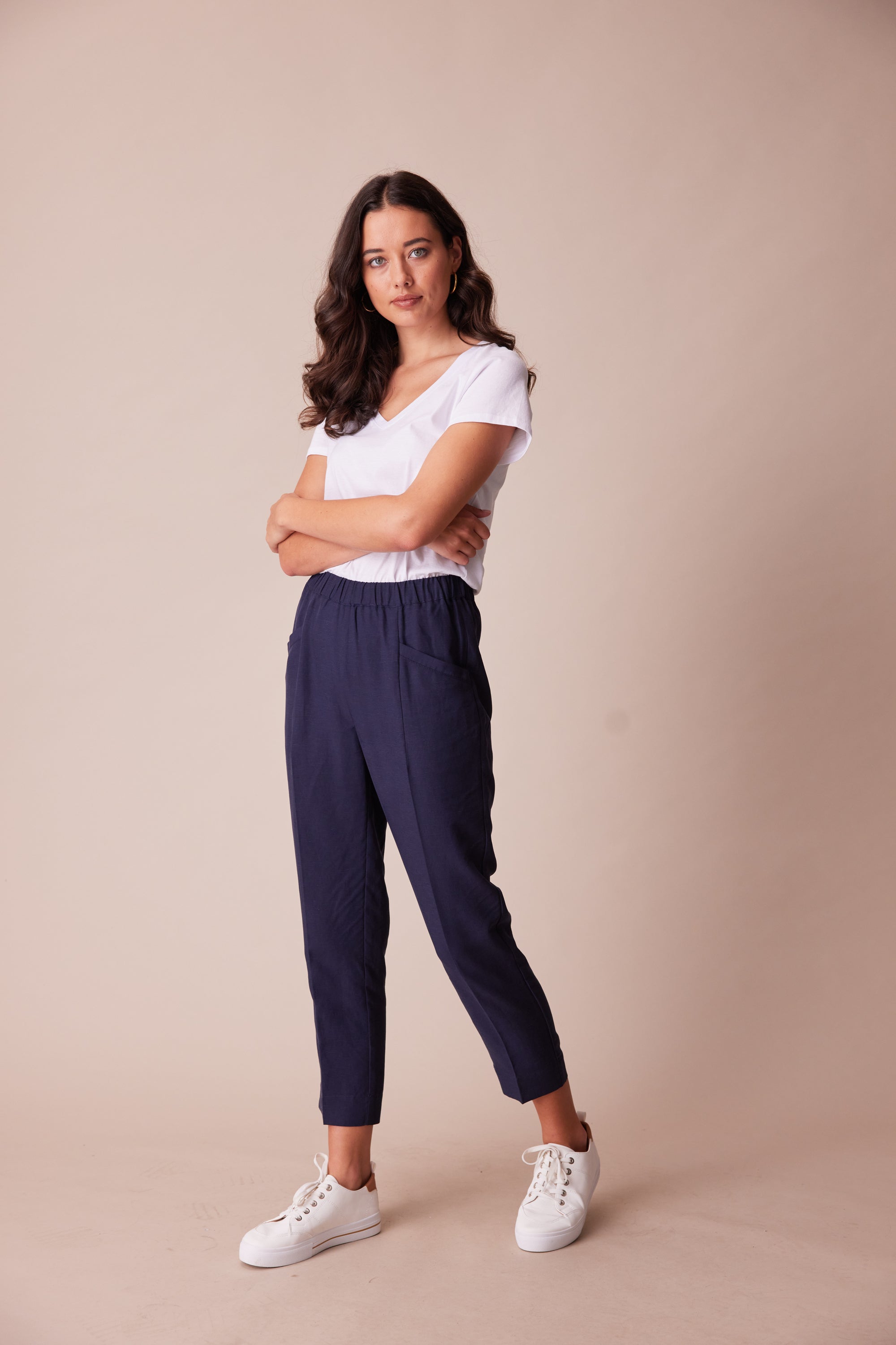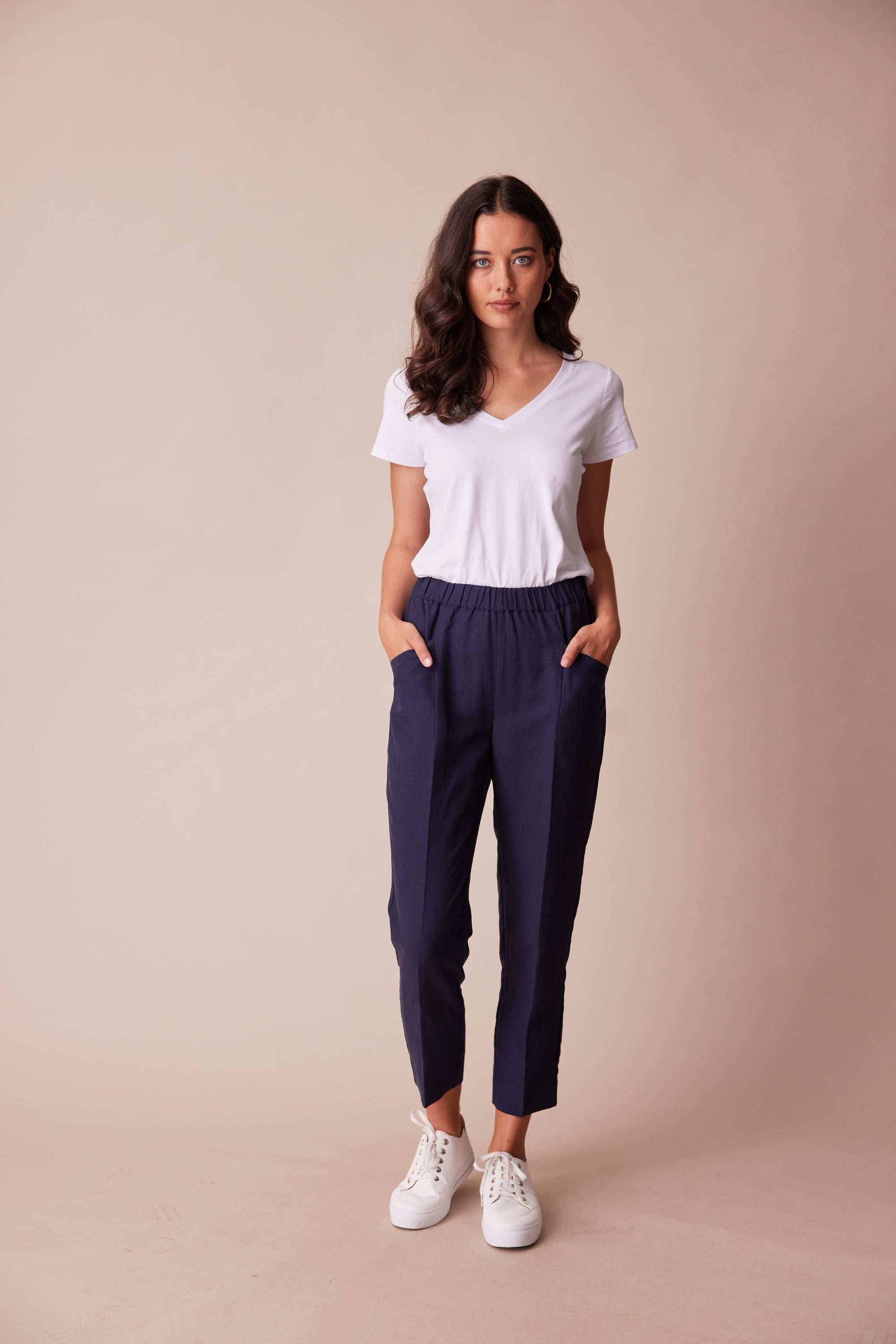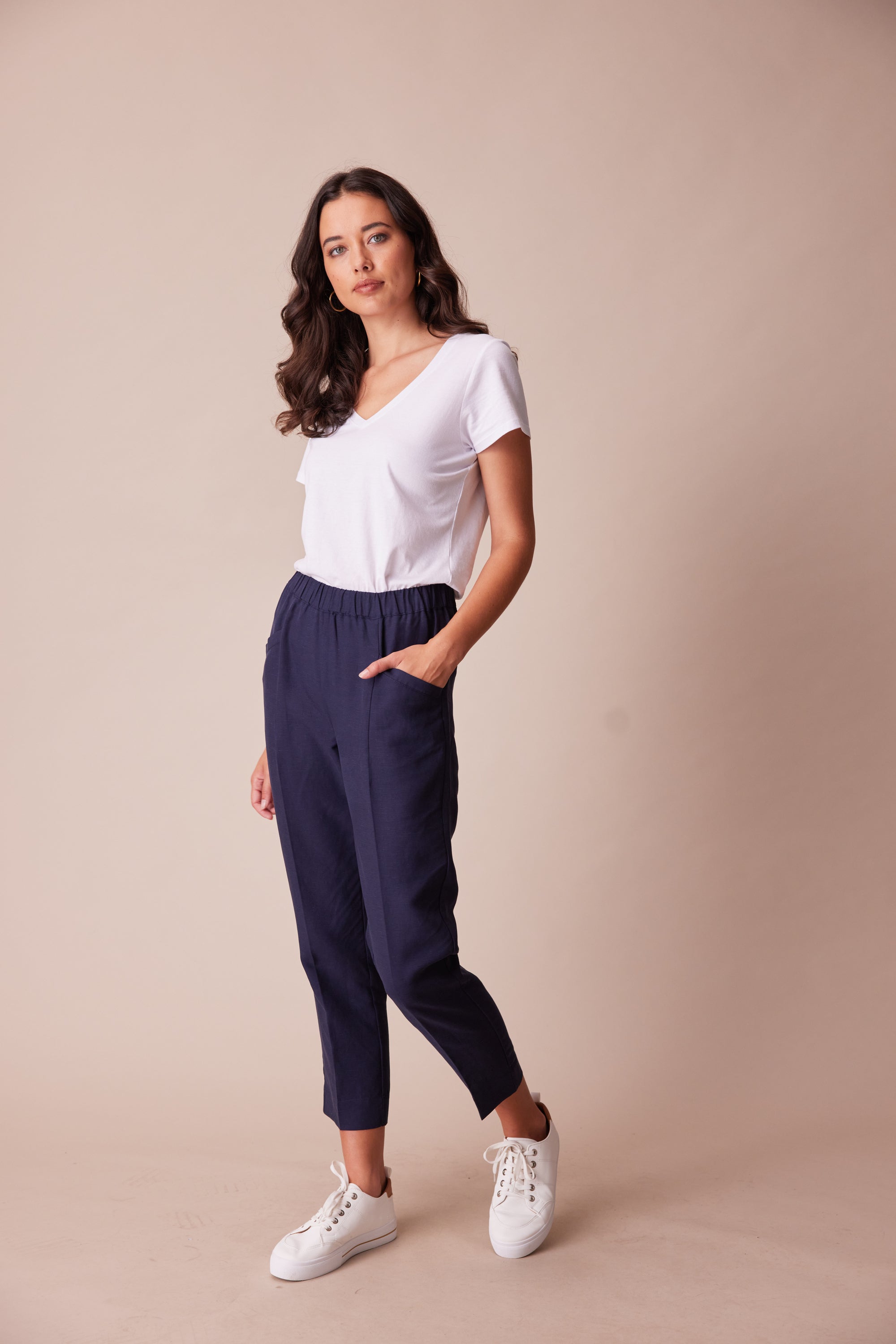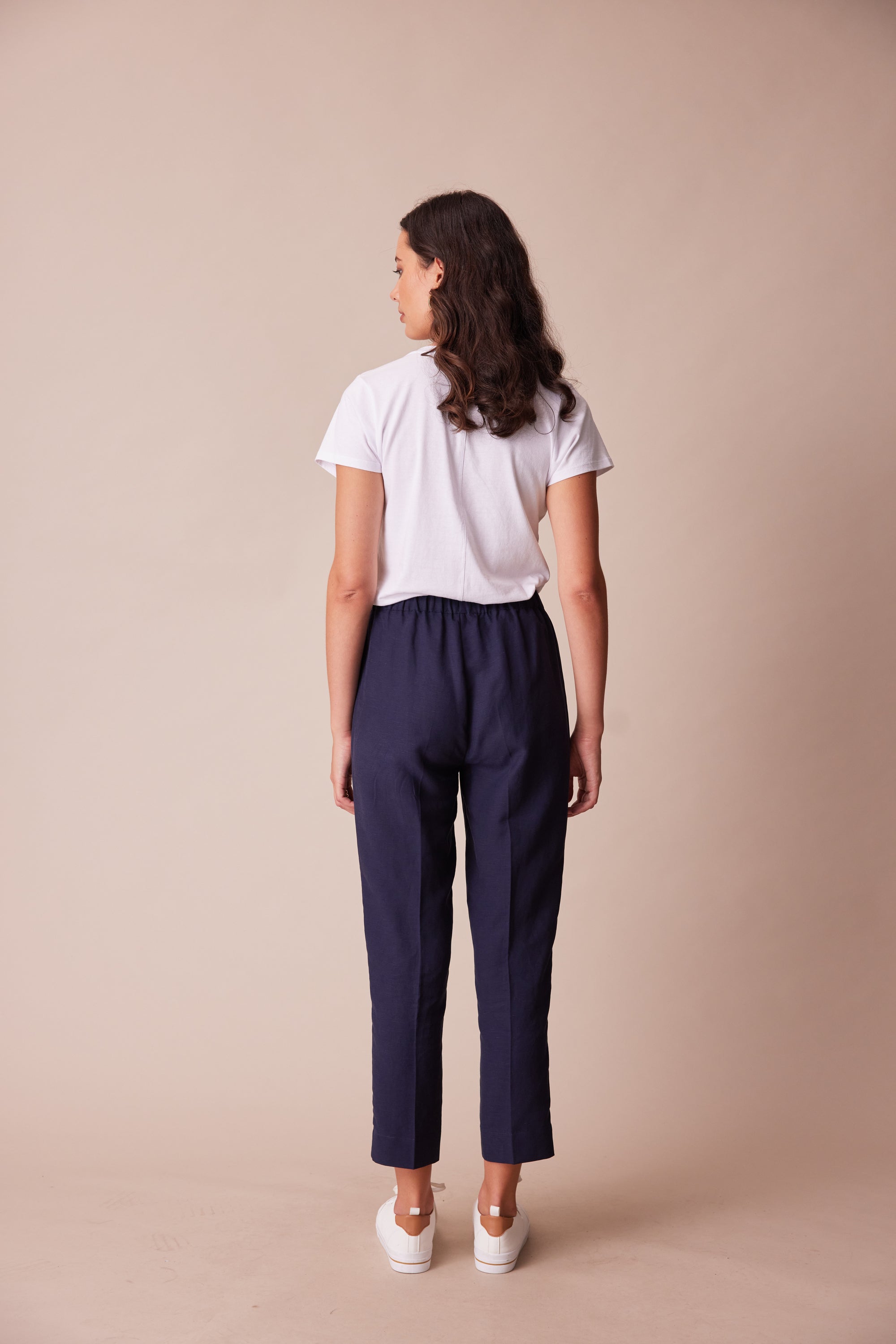A cropped straight leg pant with elasticated waistband. The unique welt pocket & dart design combined with the soft suiting fabric add character to this versatile pant. Wear as a suit with the Twin jacket, or simply pair it with one of our essential tees.