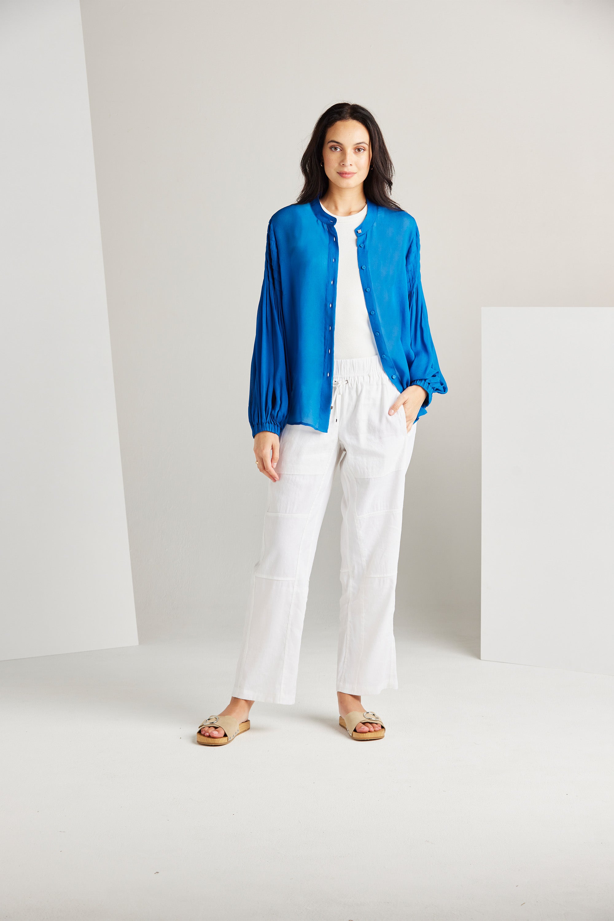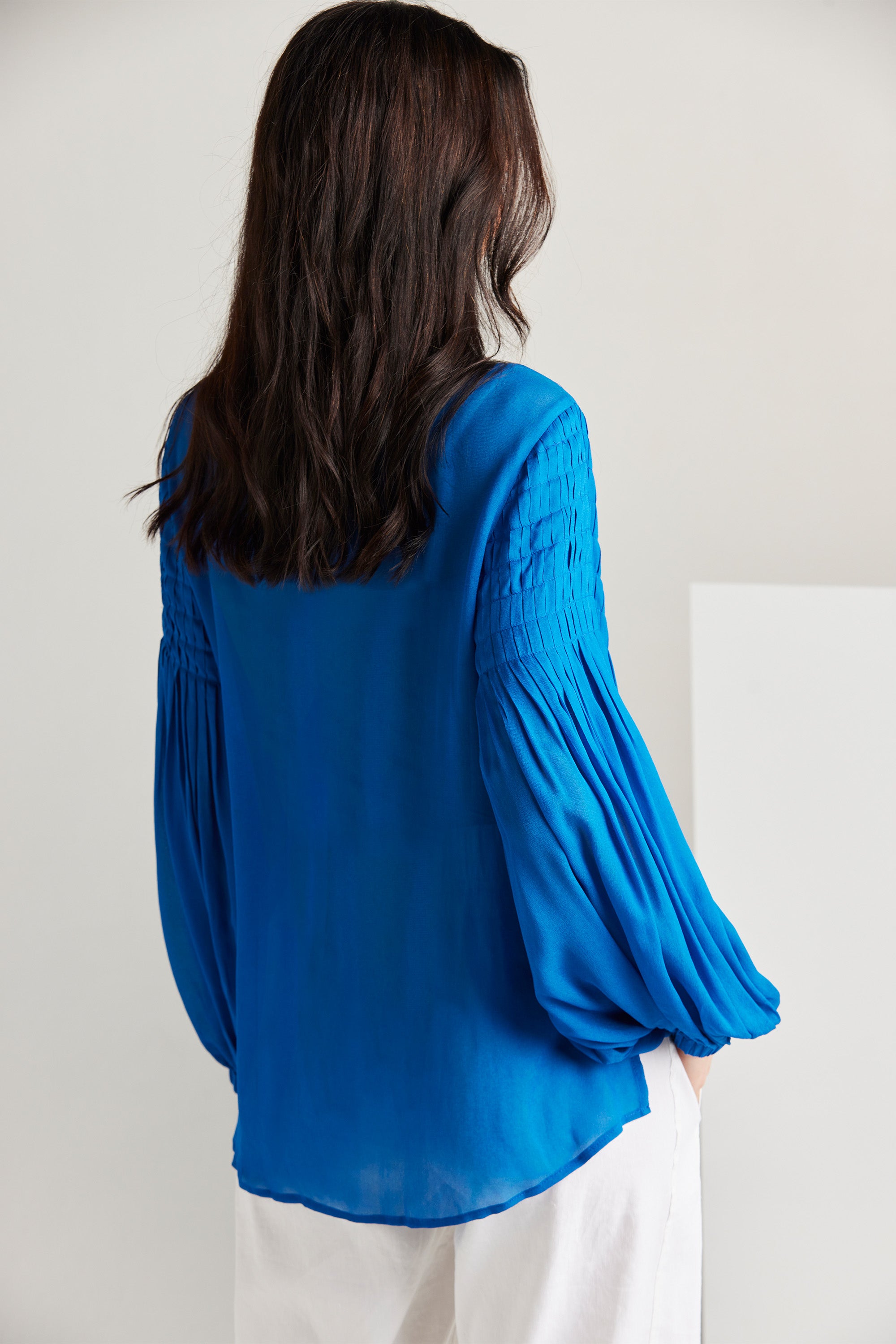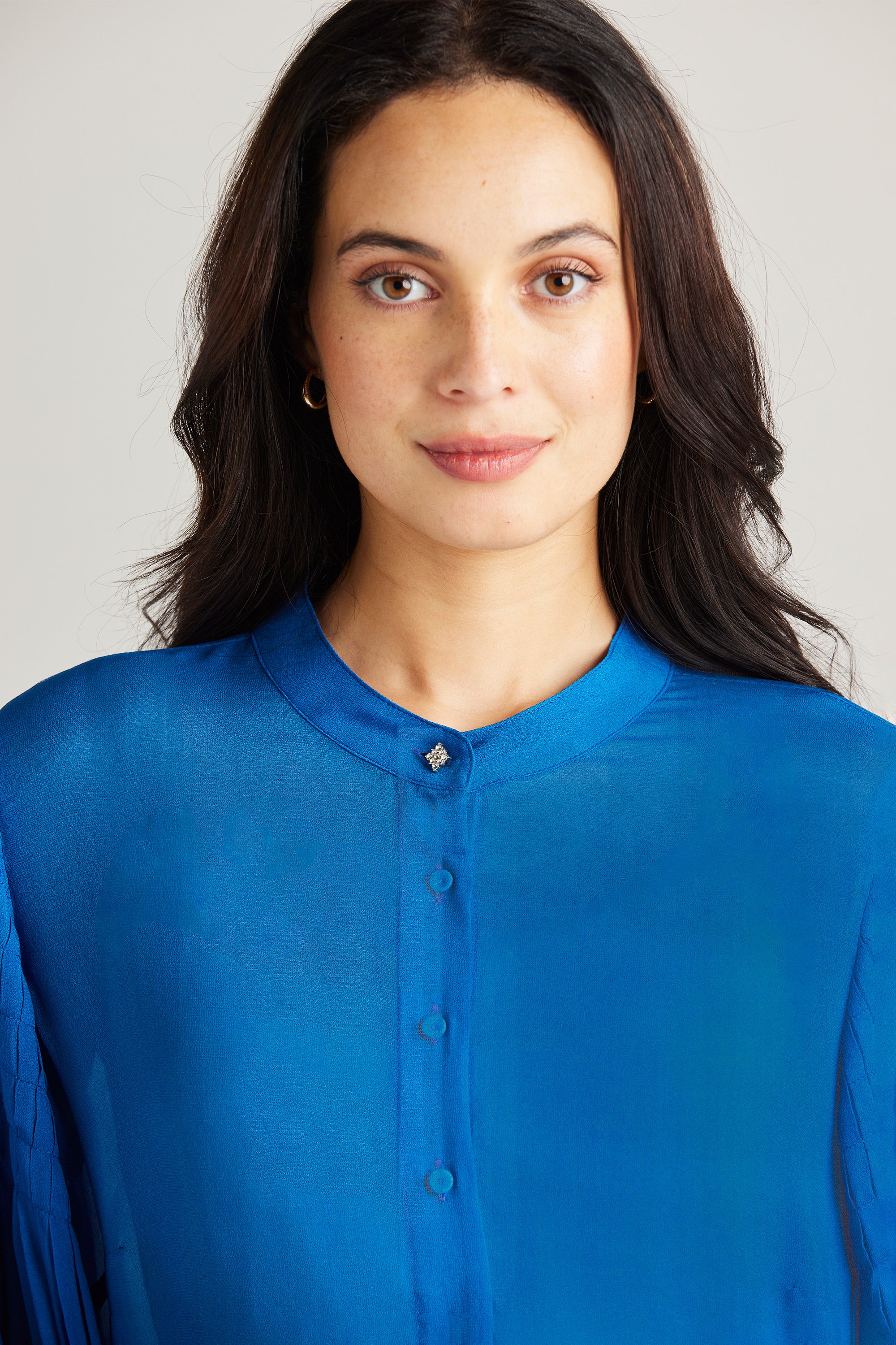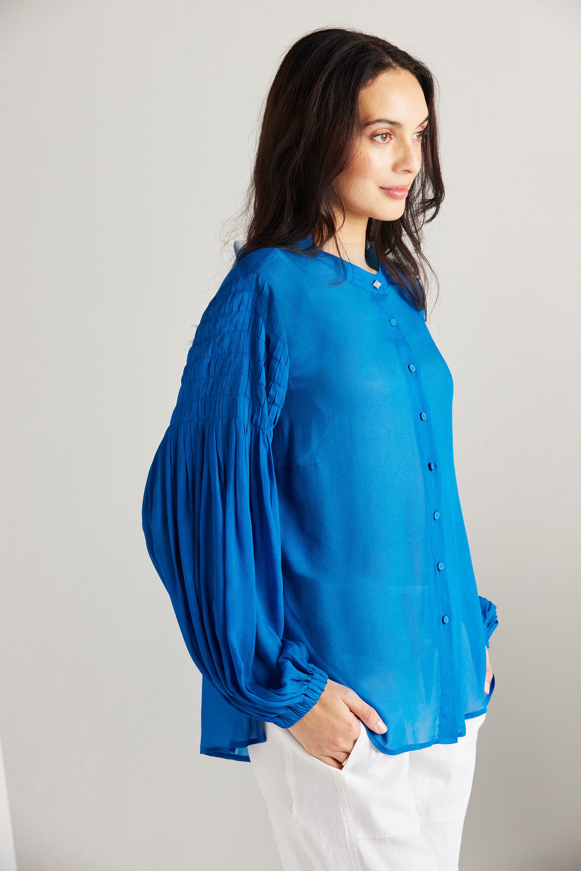The Art Shirt is a refined and charming style that's ideal for welcoming the new season. It boasts delicate pleat details on the sleeve, which create a voluminous and billowing effect. The collar stand is embellished with a graceful jewel button, adding to the shirt's overall sophistication.