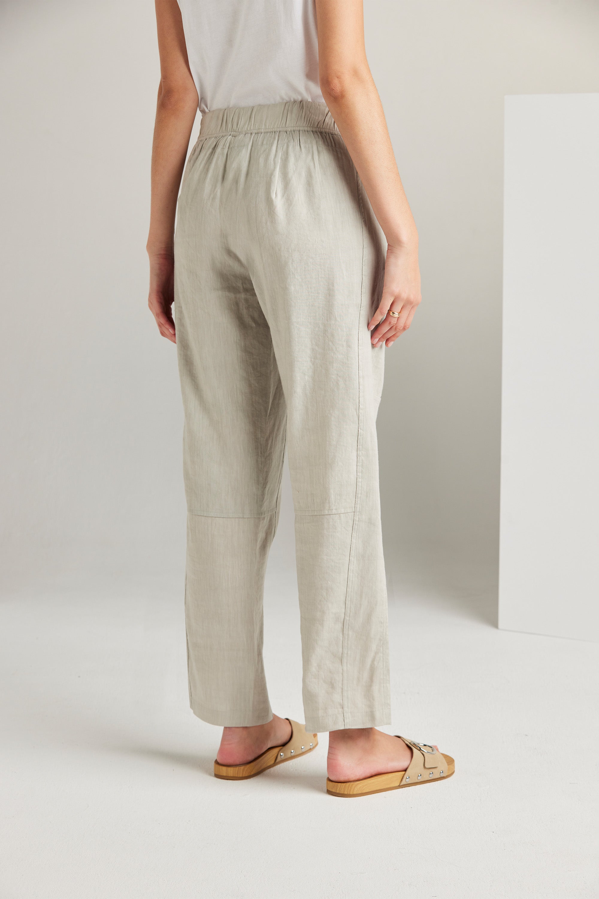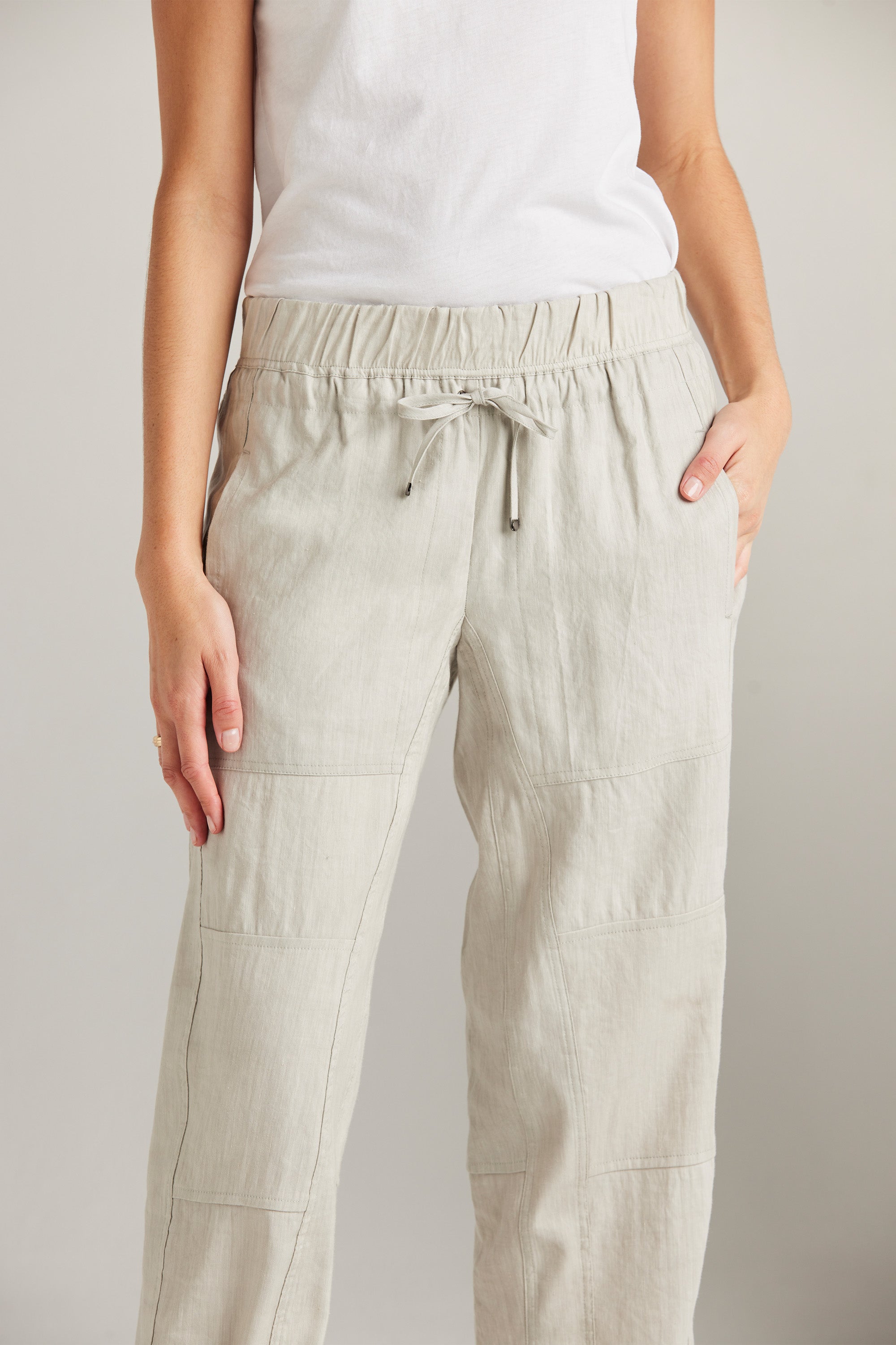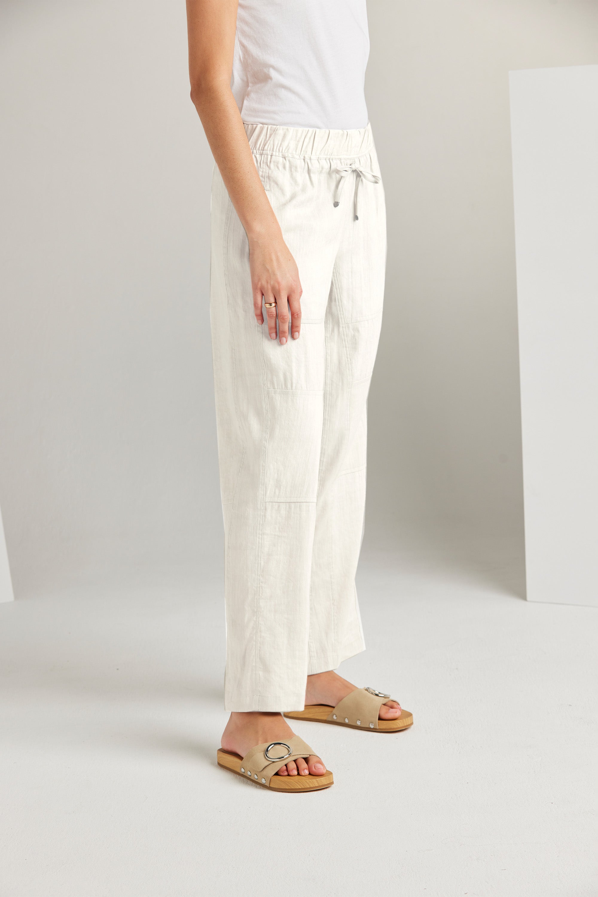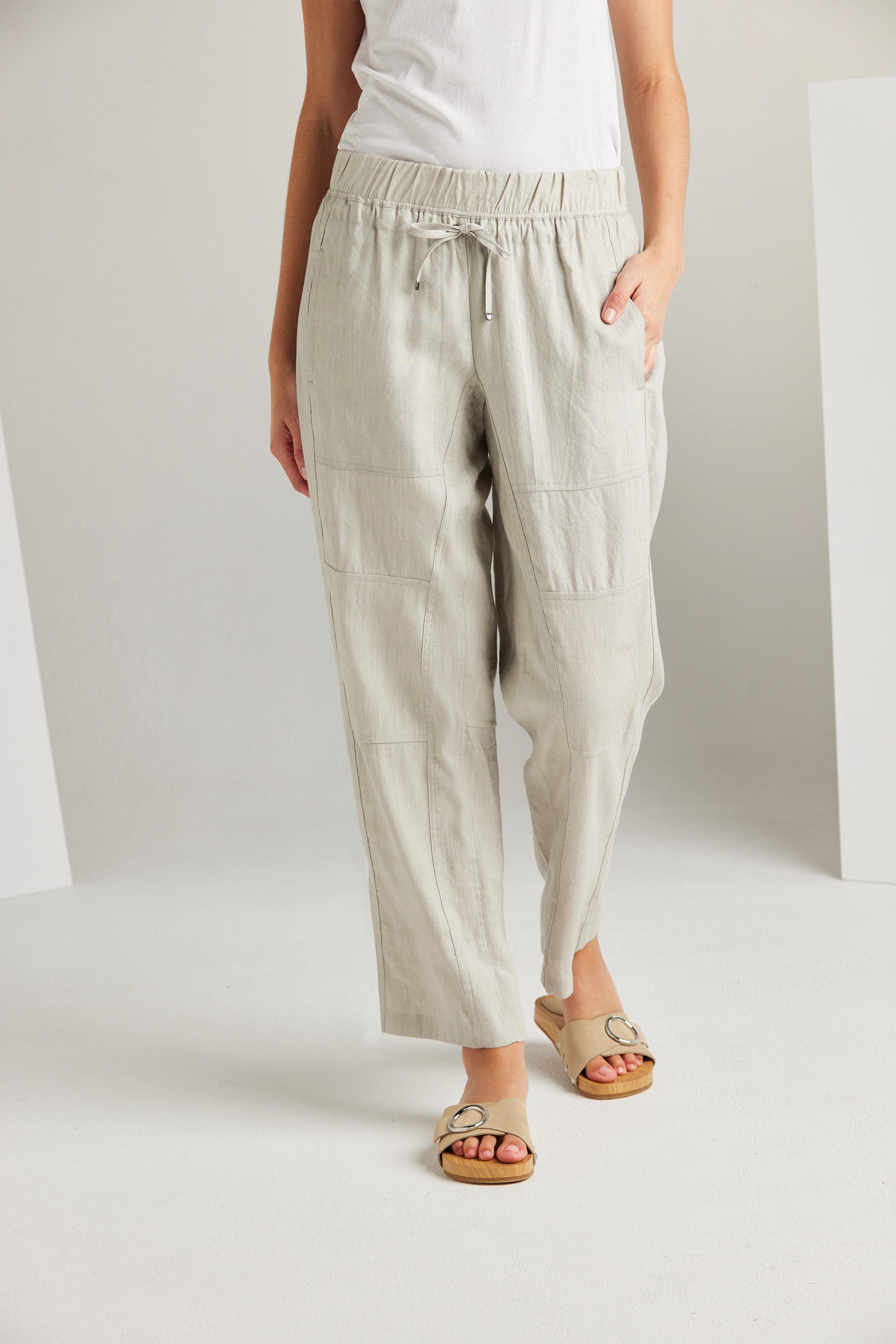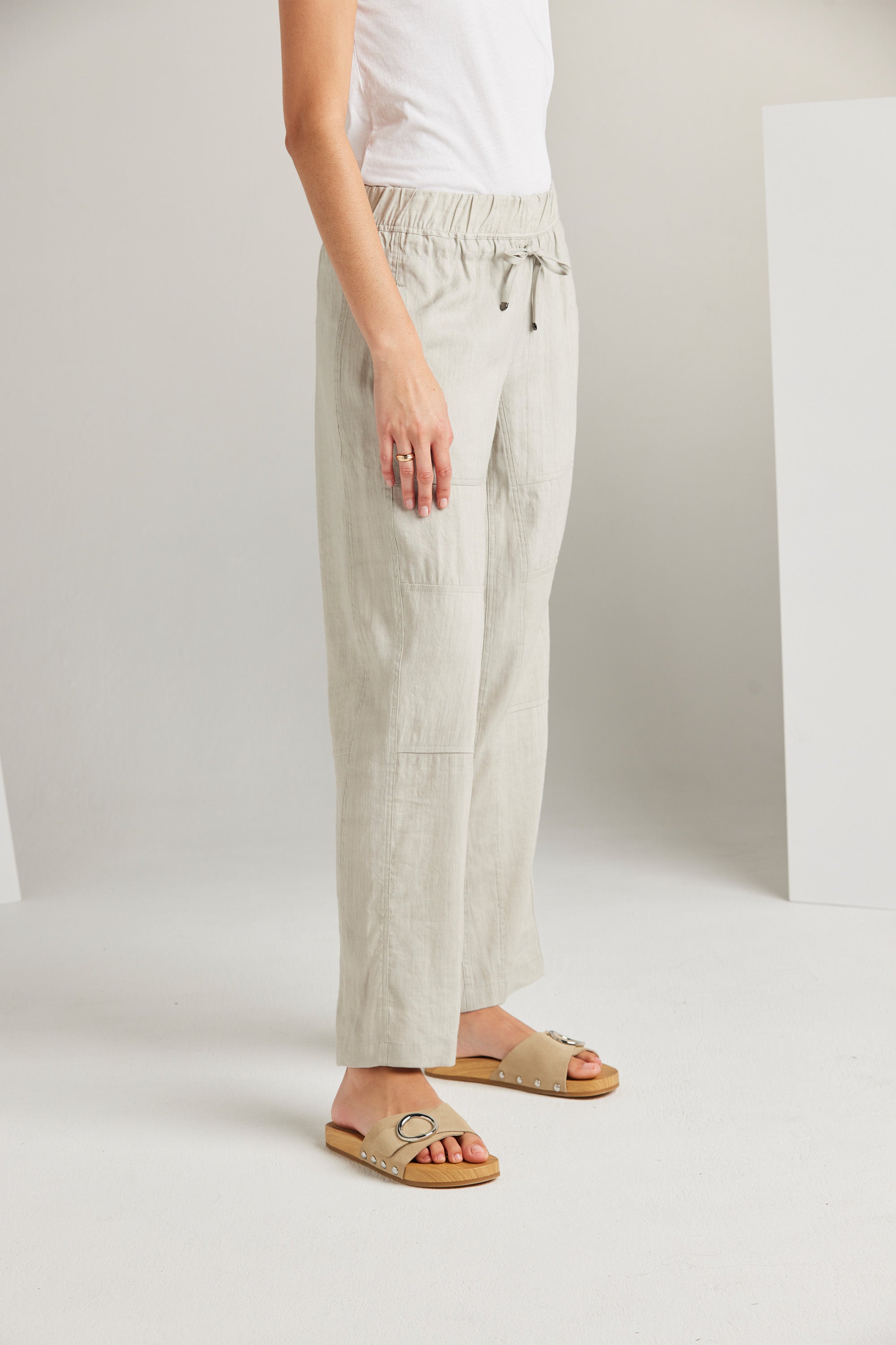 The Bridge Pant is a modern addition to our spring range. Relaxed and slightly cropped, these wide-leg pants feature an elasticated waistband and adjustable drawstring tie. The unique panelling design combined with the soft linen fabric adds to the versatility of this style. Pair it with one of our essential tees and accessories to achieve an effortlessly chic look.