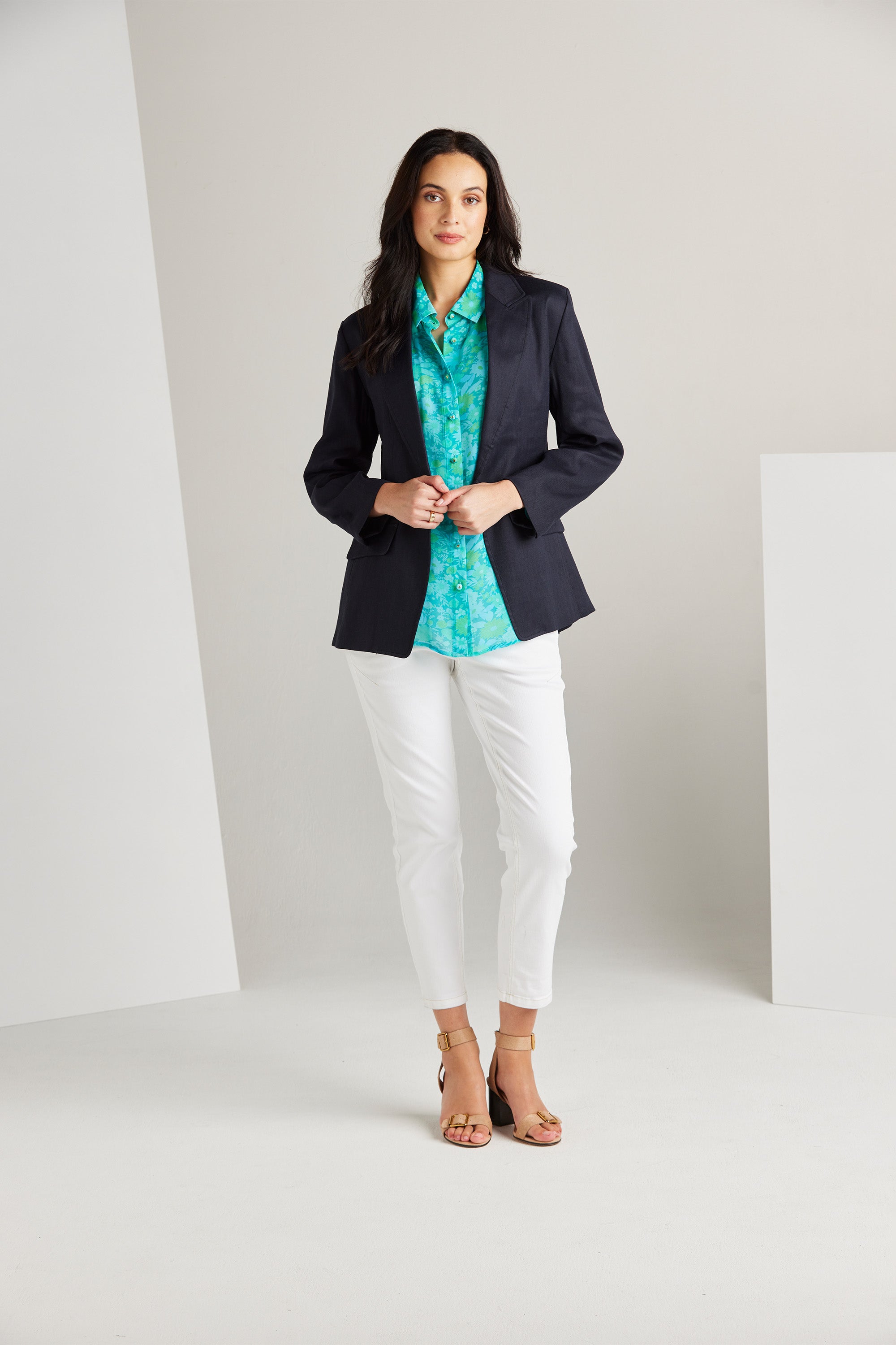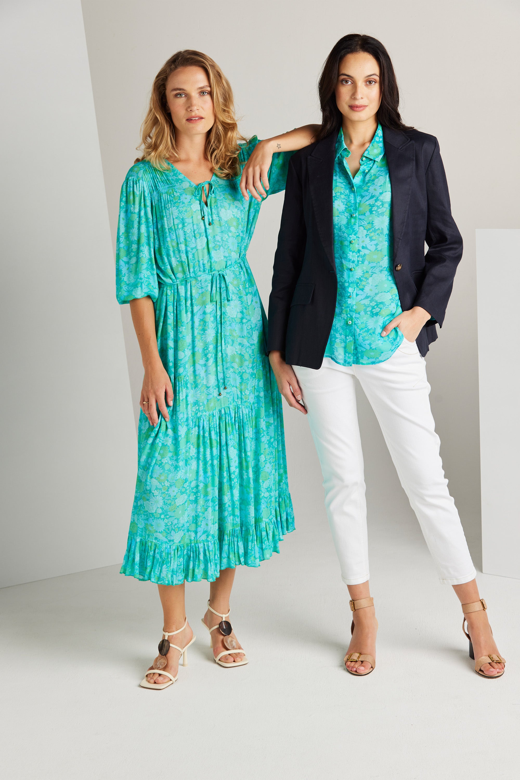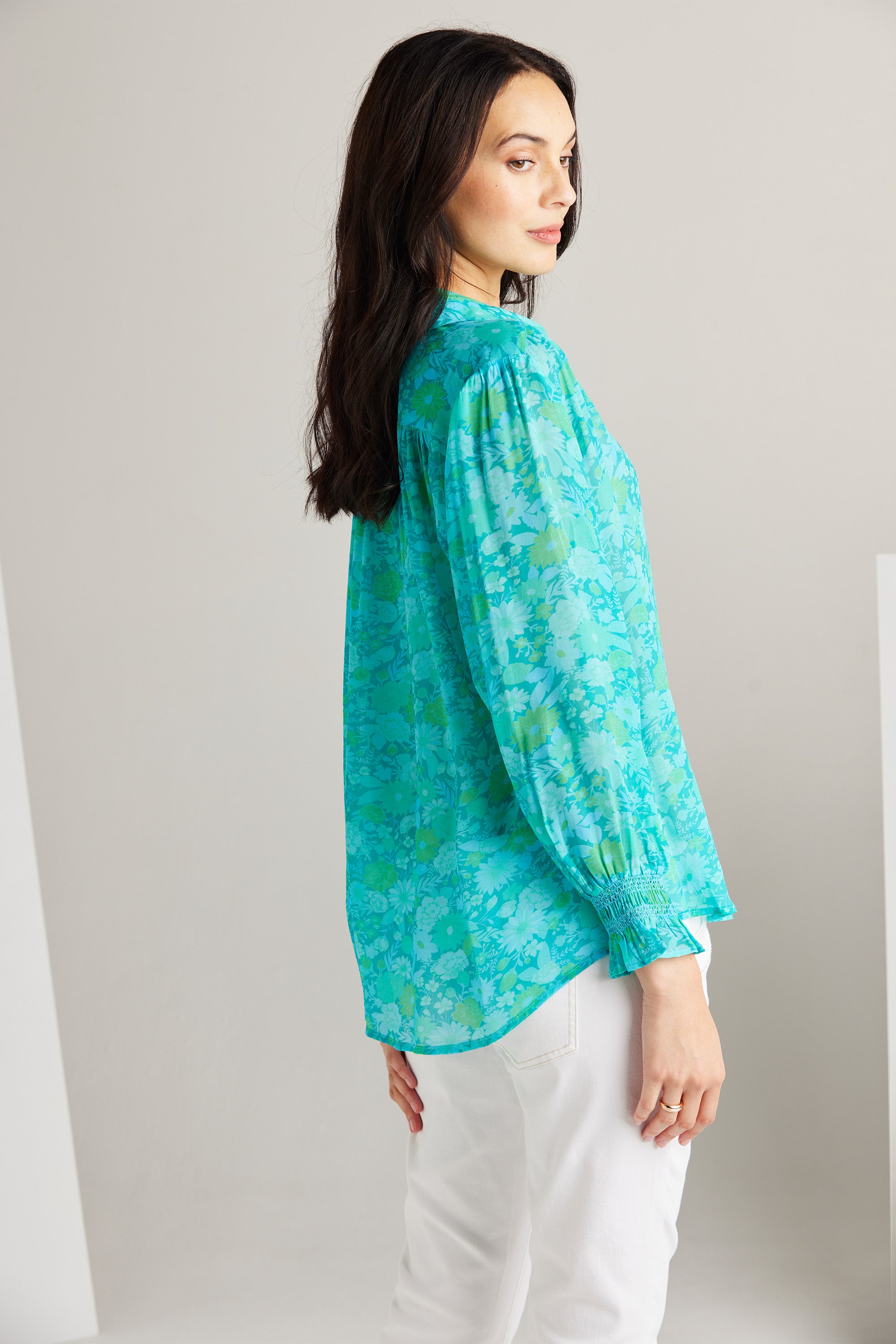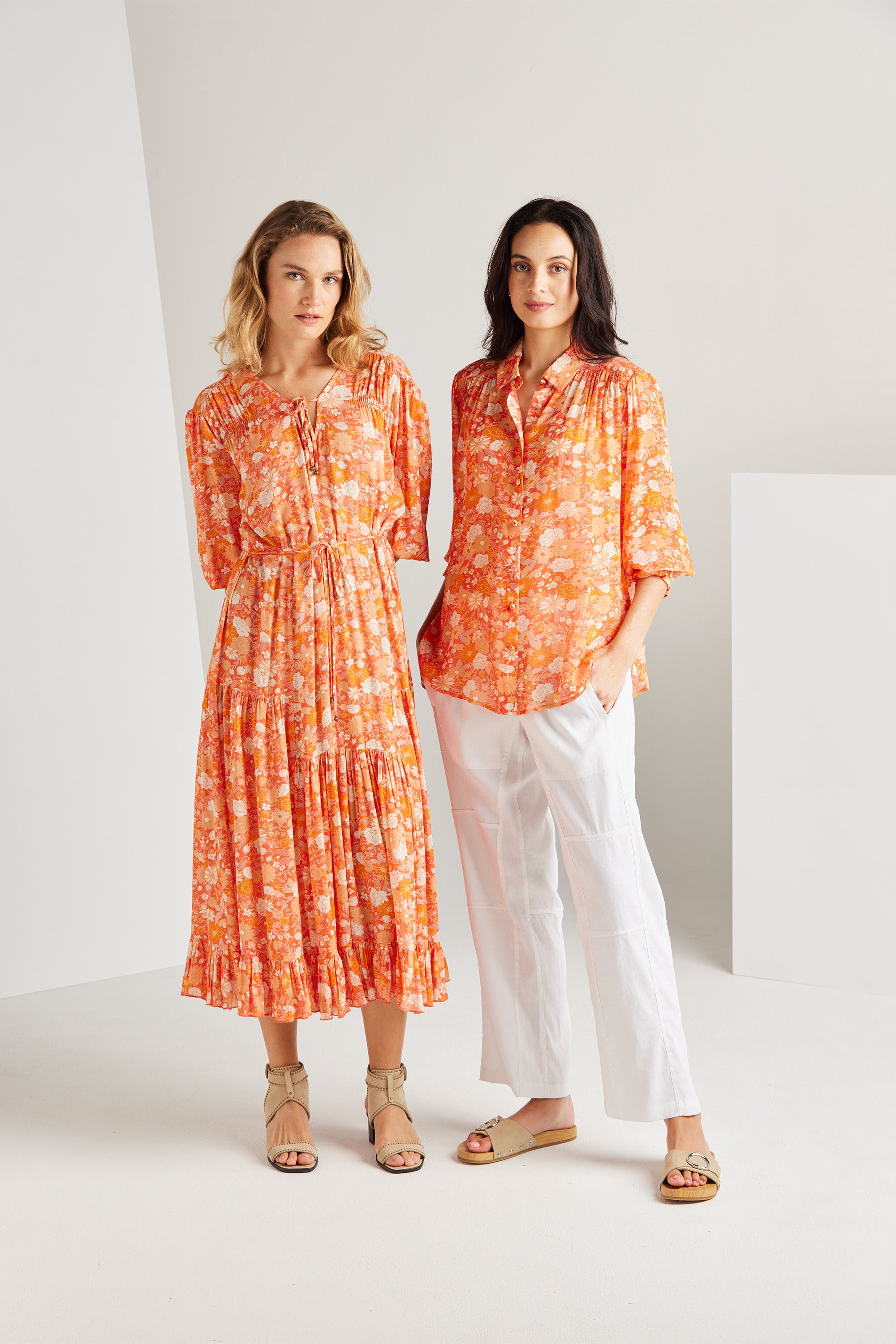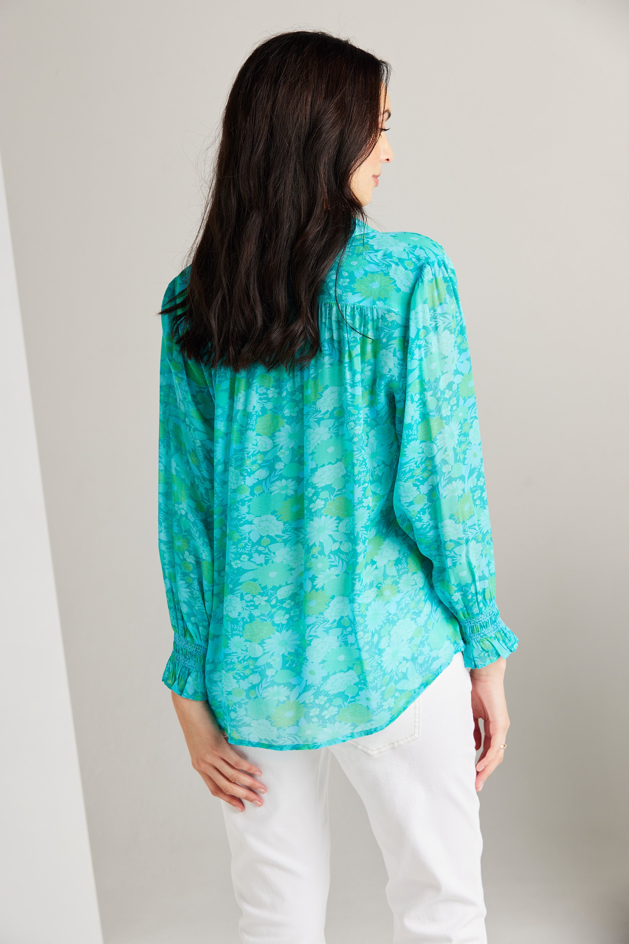 The Daisy print is a charming and detailed floral print that comes in two vibrant colour options: Tangerine and Aqua. This loose-fitting shirt features billowy sleeves and self-covered buttons adorned with metal butterfly accents, making it a sophisticated and versatile addition to your wardrobe. Wear it with tailored pants or denim and elevate your style this season.