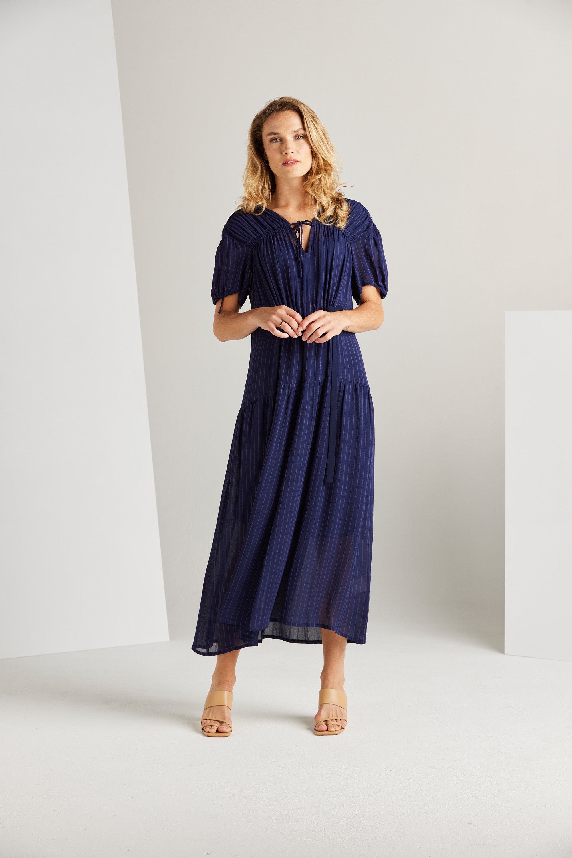 The Marlton Stripe Dress is a relaxed fit style, its silhouette is enhanced by delicate gathers that drape beautifully through the bodice. The adjustable tie detail at the front neckline and waist and the tiered skirt panels add a feminine flare to this flattering style, making it the perfect spring occasion dress.