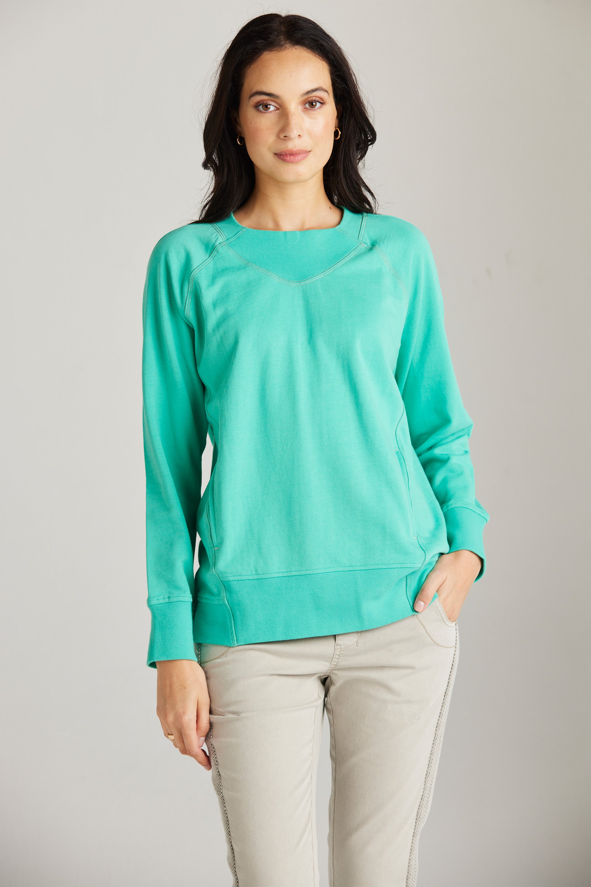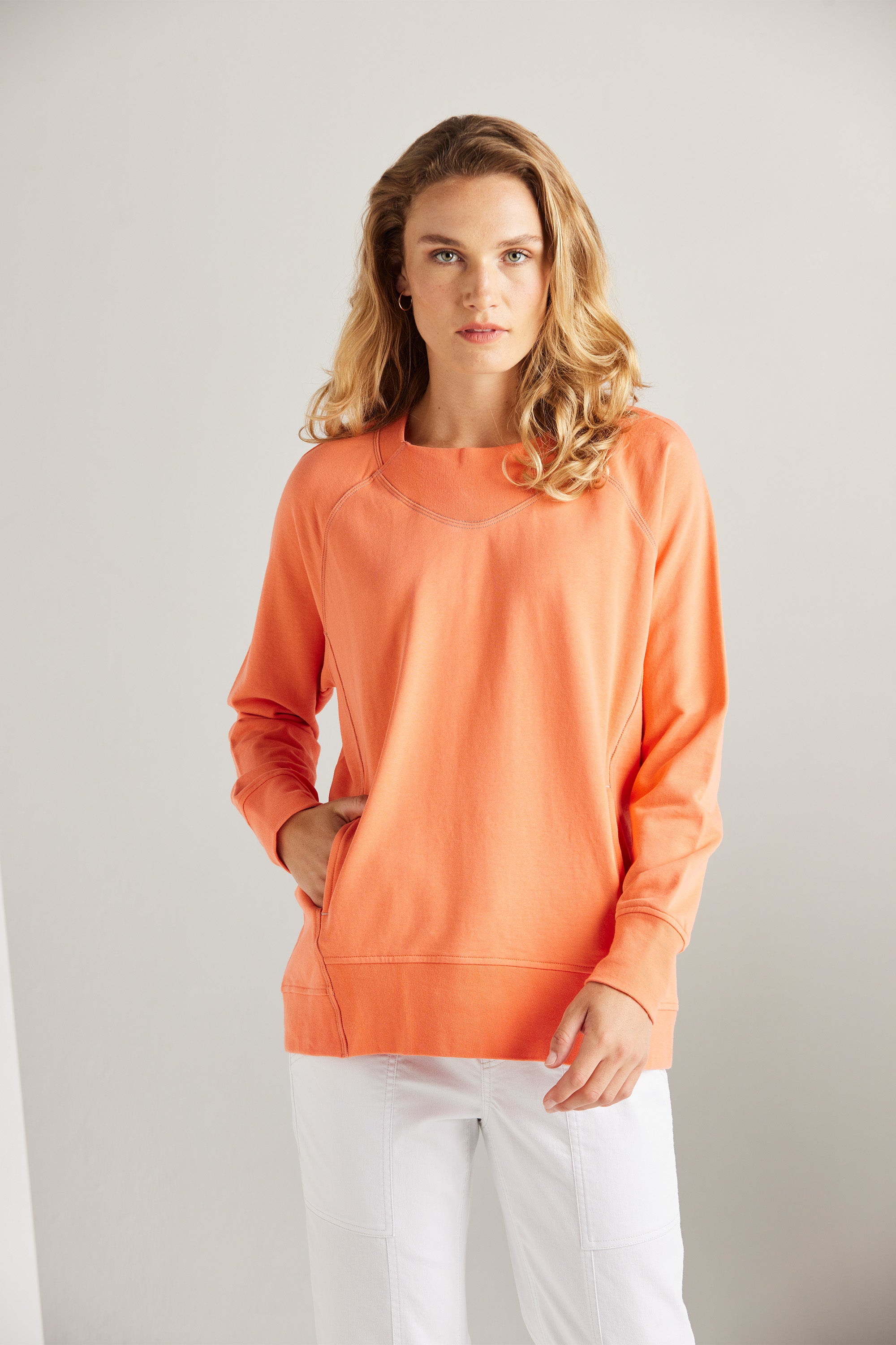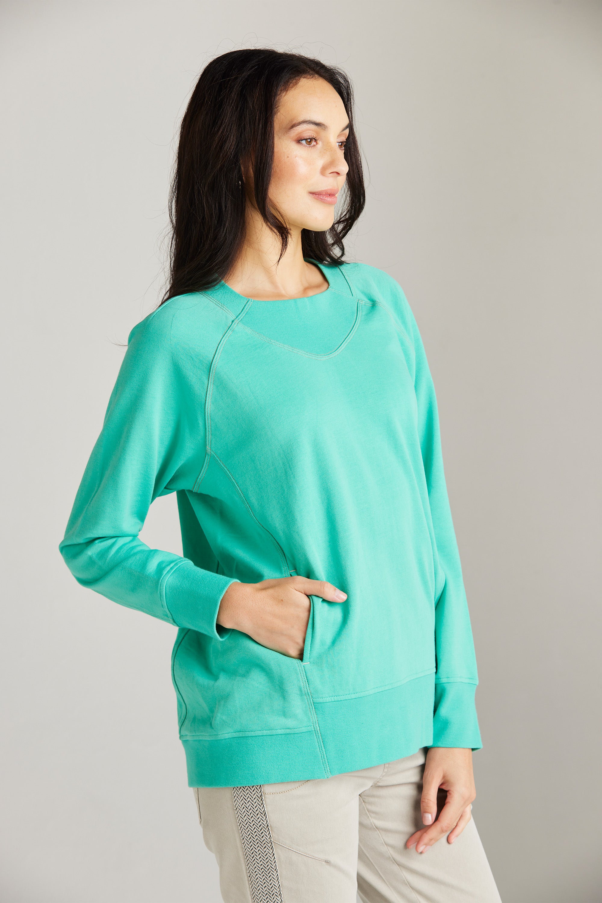 A modern raglan sleeve sweat top with rib neckband, cuff and hem band. In–seam pockets and triple needle contrast topstitching add a touch of personality. Pair with our boyfriend jeans and sneakers for an effortless off-duty look.