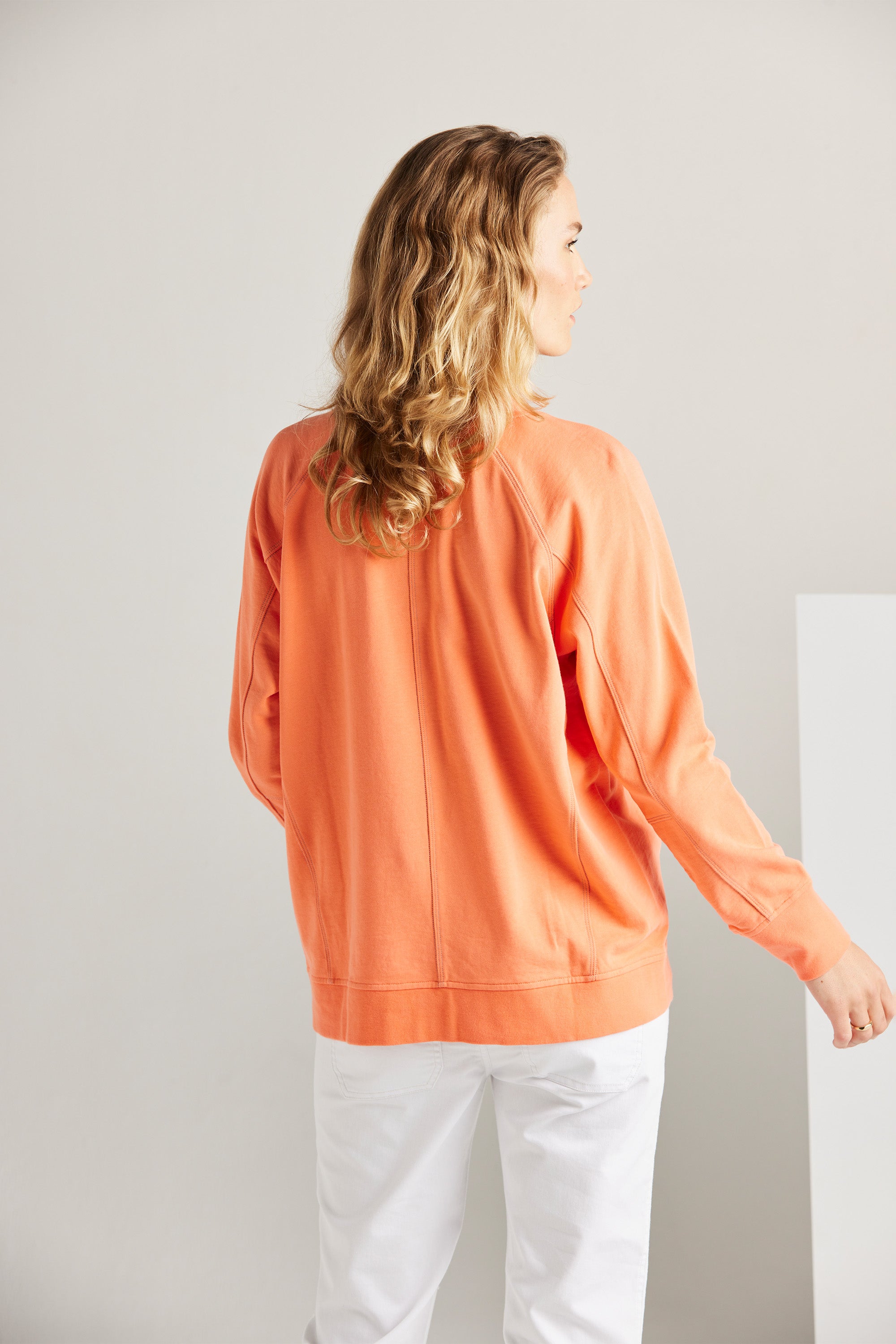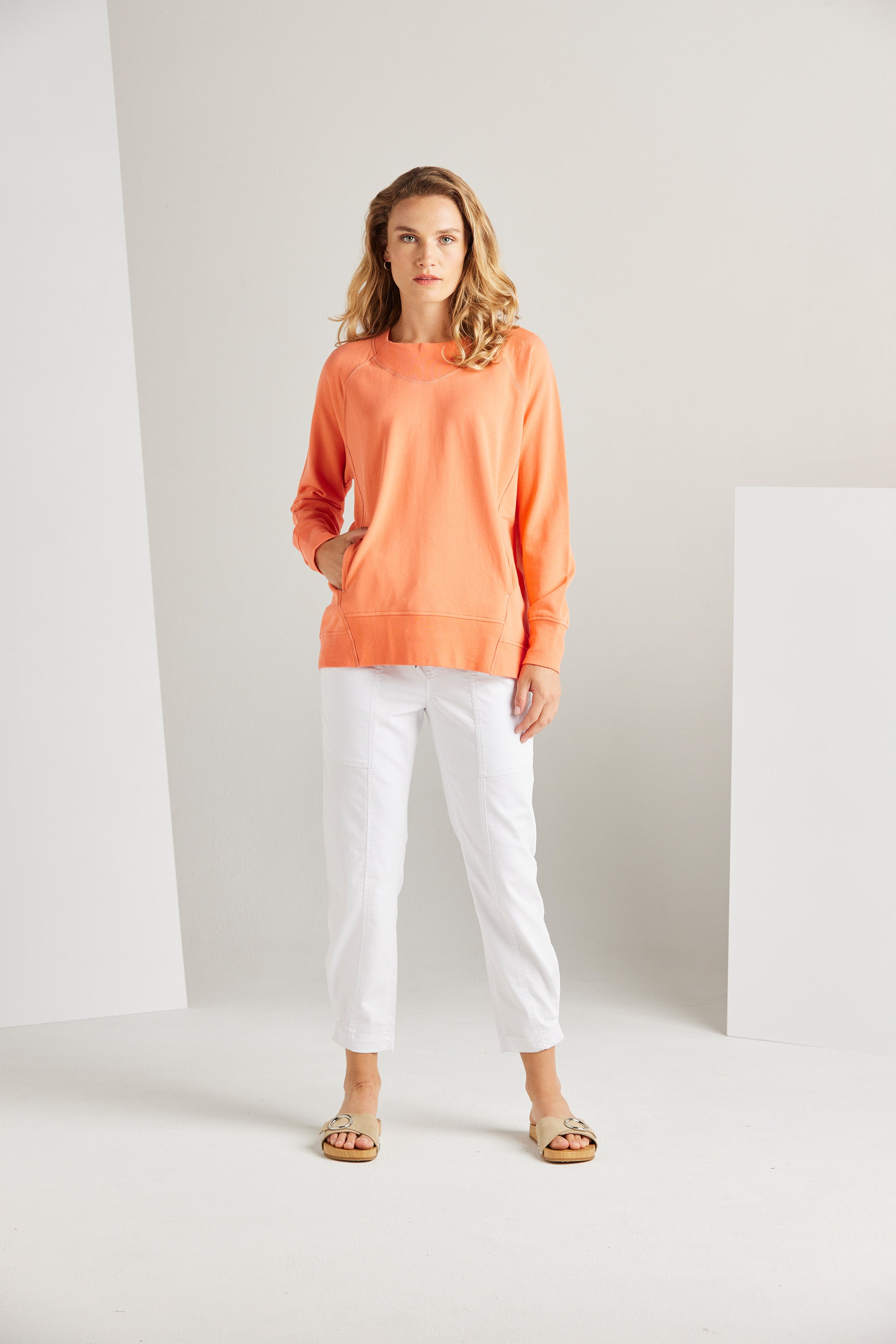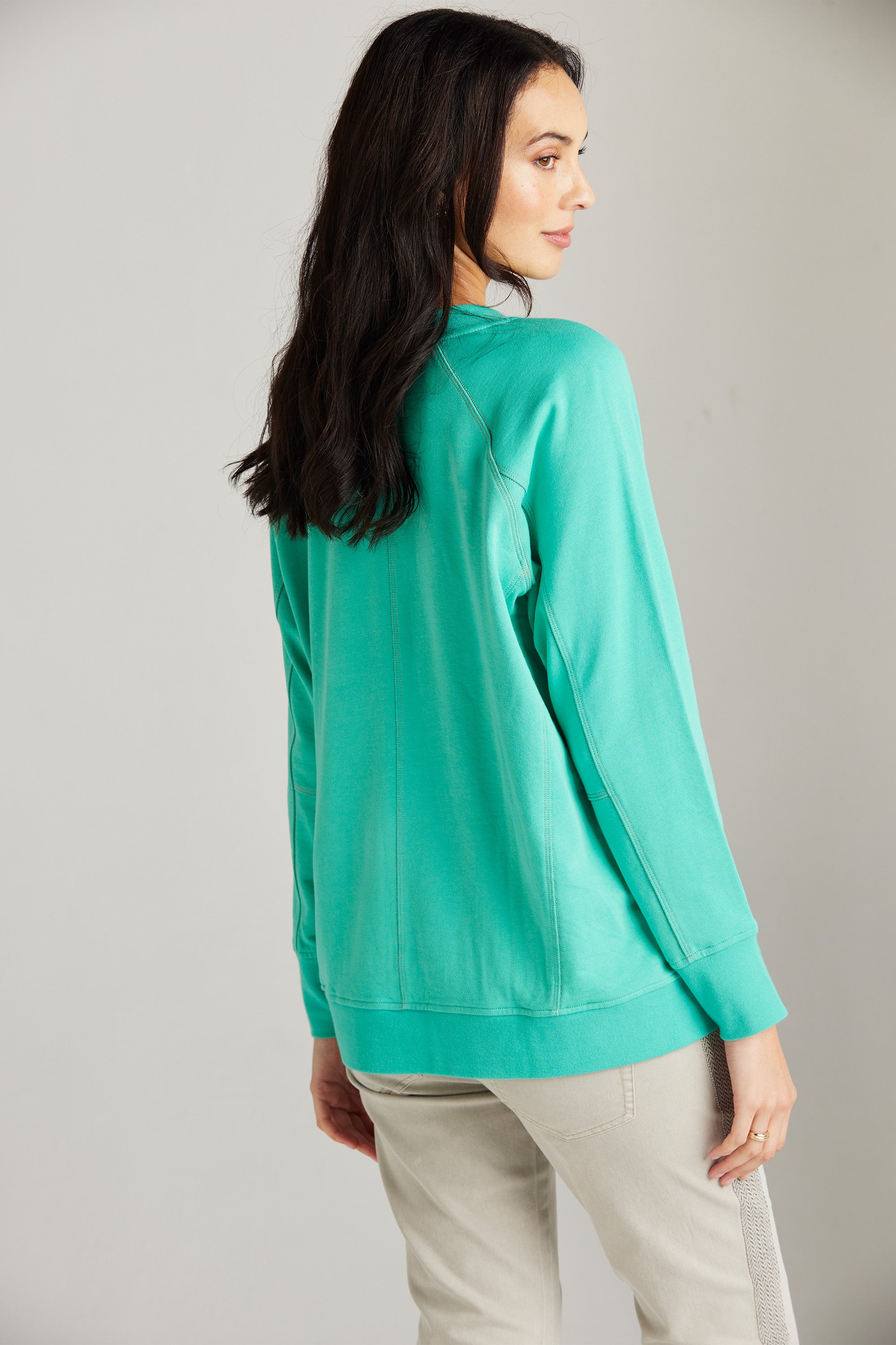 A modern raglan sleeve sweat top with rib neckband, cuff and hem band. In–seam pockets and triple needle contrast topstitching add a touch of personality. Pair with our boyfriend jeans and sneakers for an effortless off-duty look.